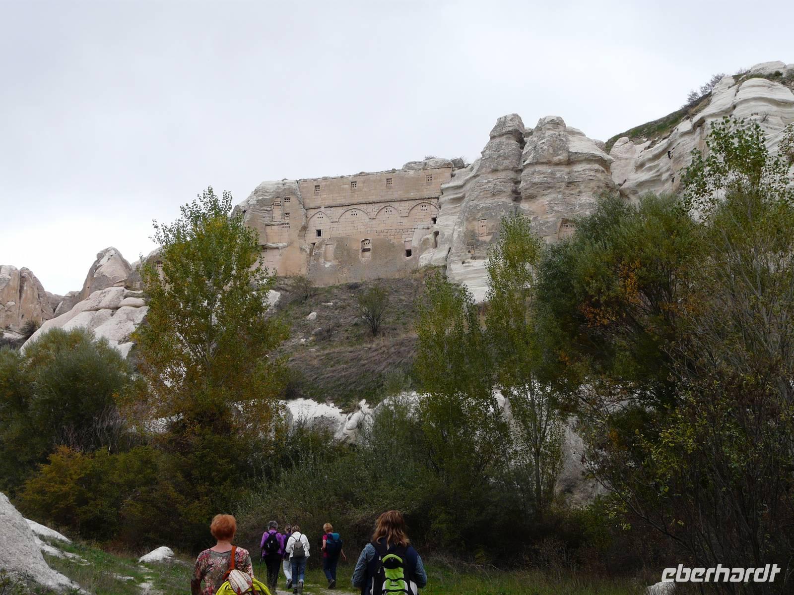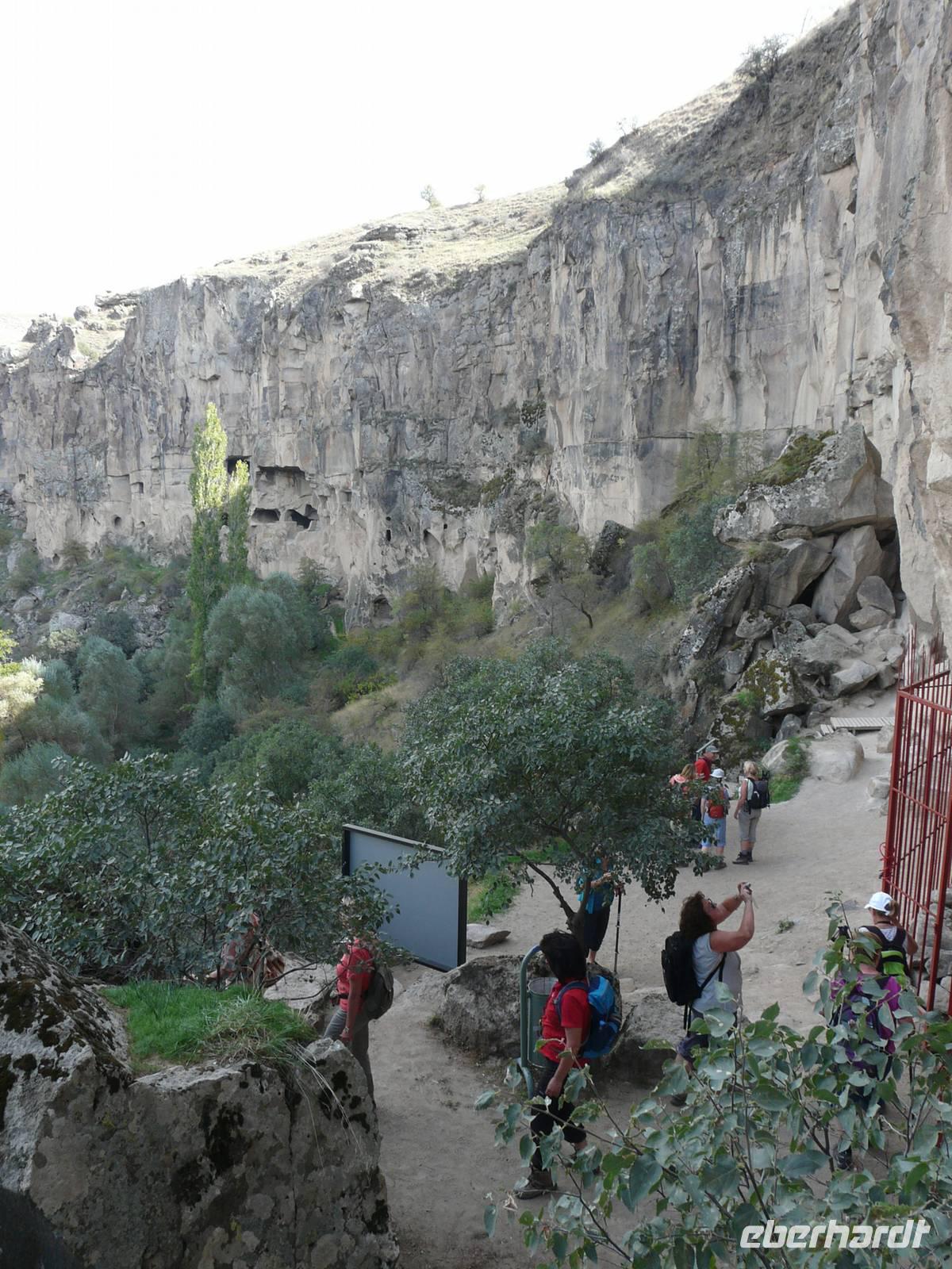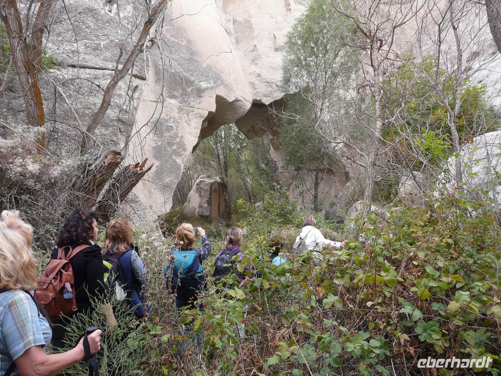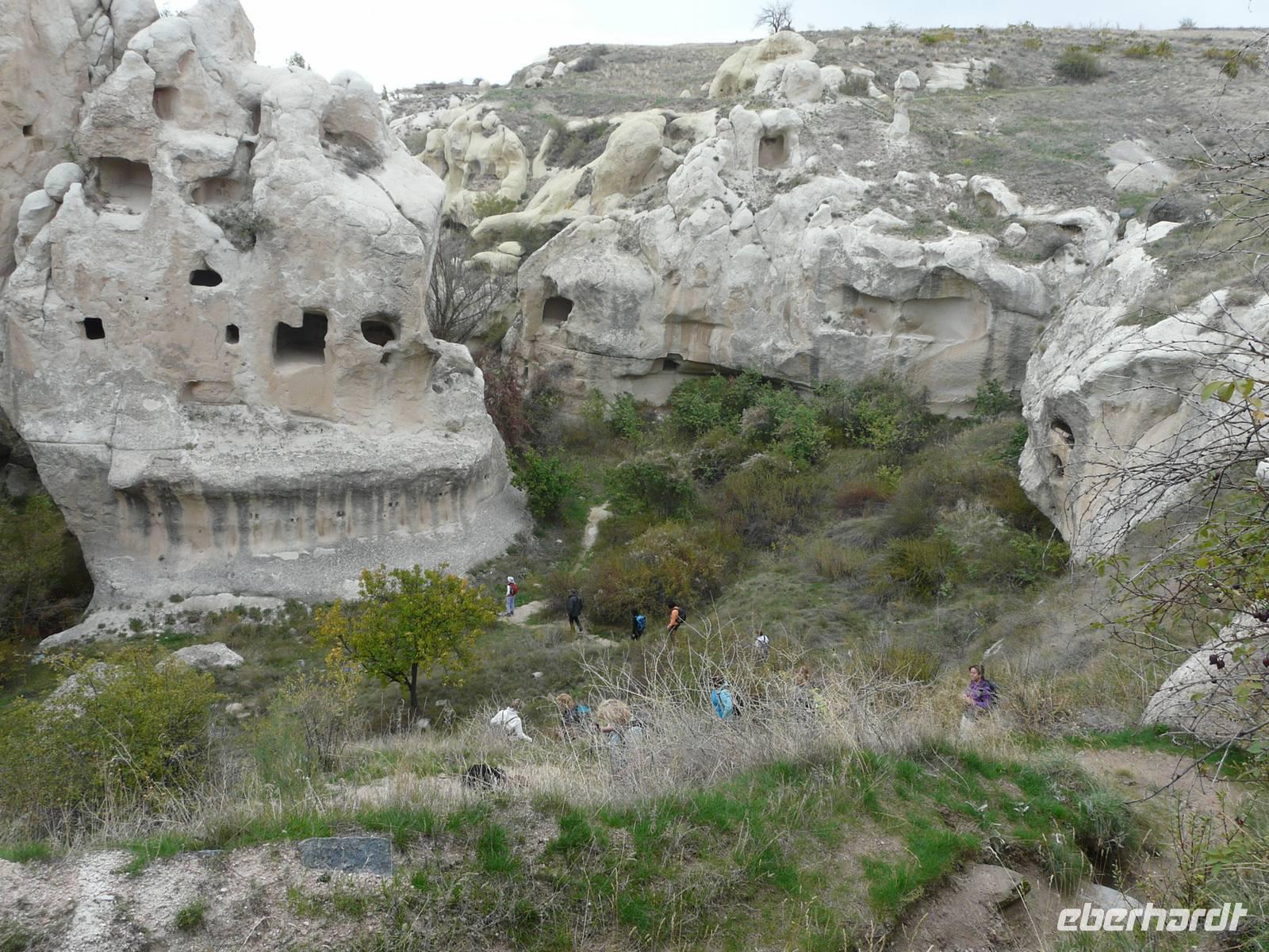 Nach einem Halt in einem ziemlich überfüllten Self-Service- Restaurant (mit trotzdem sehr guten Essen) fahren wir immer weiter gen Kappadokien, den Landschaft wird nun immer karger, hier und da sehen wir die Überreste von alten Karawansereien. Als der Bus in ein kleines Dorf einbiegt, wird es etwas holpriger und den Straße extrem eng, sodass die ersten Reihen schon mal die Luft anhalten. Doch nun haben wir auch den Startpunkt zu unserer ersten Wandertour erreicht. Bei strahlendem Sonnenschein überblicken wir zum ersten Mal so etwas wie Märchenland. Die kappadokischen Tuffsteingebilde liegen vor uns und wir beginnen mit unserem Abstieg in das Çat-Tal. Eine steile Treppe führt hinunter in den schmalen, ausgewaschenen Canyon und auf einmal ist die Welt um uns herum grün. Wir folgen Hasan auf dem schmalen Weg und queren mehrmals einen schmalen Bach. Links und rechts von uns ragen die Wände aus Tuffstein empor. Man kann überall kleine und große Höhlen, Taubenschläge und sogar die Überreste alter Höhlenwohnungen sehen, teilweise verziert mit Wandmalereien. Nach einigen Kilometern Laufweg kehren wir um und begeben uns so langsam auf den Weg ins Hotel. Angekommen und Ortahisar beziehen wir unsere ganz besonderen Zimmer im Höhlenhotel Dilek Kaya. Alle Zimmer liegen teilweise nach am Fels an oder sind im Tuffstein-Stil verziert. Eine mehr als passende Unterkunft für unsere nächsten Tage im zauberhaften Kappadokien.