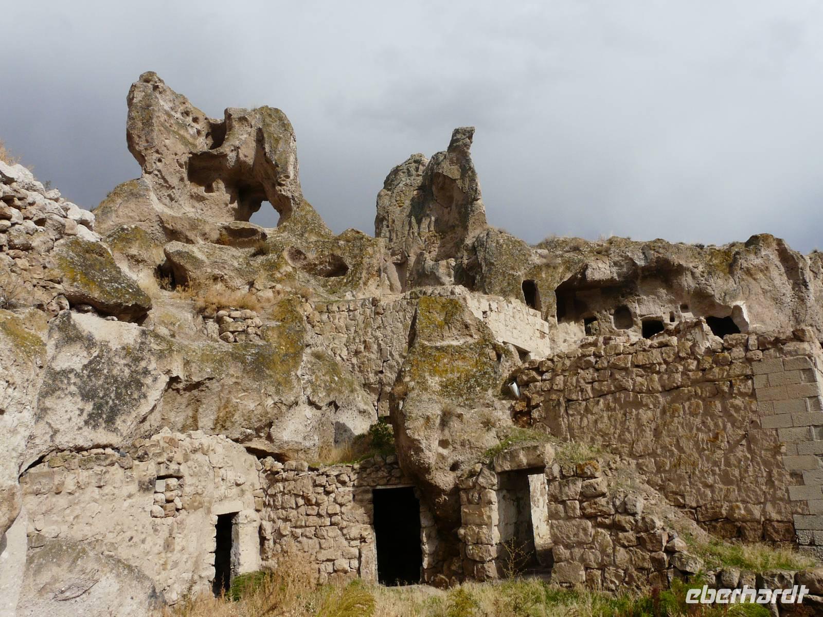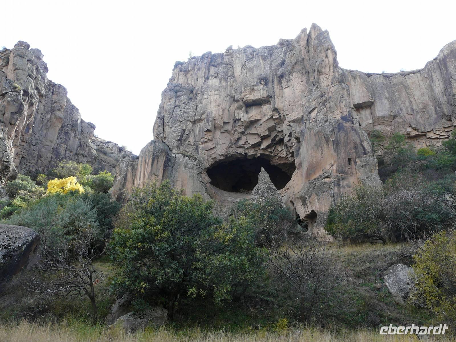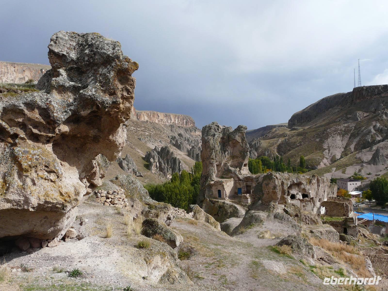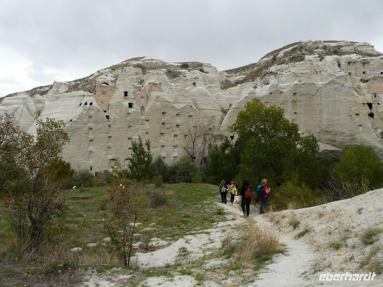 Nach einem Halt in einem ziemlich überfüllten Self-Service- Restaurant (mit trotzdem sehr guten Essen) fahren wir immer weiter gen Kappadokien, den Landschaft wird nun immer karger, hier und da sehen wir die Überreste von alten Karawansereien. Als der Bus in ein kleines Dorf einbiegt, wird es etwas holpriger und den Straße extrem eng, sodass die ersten Reihen schon mal die Luft anhalten. Doch nun haben wir auch den Startpunkt zu unserer ersten Wandertour erreicht. Bei strahlendem Sonnenschein überblicken wir zum ersten Mal so etwas wie Märchenland. Die kappadokischen Tuffsteingebilde liegen vor uns und wir beginnen mit unserem Abstieg in das Çat-Tal. Eine steile Treppe führt hinunter in den schmalen, ausgewaschenen Canyon und auf einmal ist die Welt um uns herum grün. Wir folgen Hasan auf dem schmalen Weg und queren mehrmals einen schmalen Bach. Links und rechts von uns ragen die Wände aus Tuffstein empor. Man kann überall kleine und große Höhlen, Taubenschläge und sogar die Überreste alter Höhlenwohnungen sehen, teilweise verziert mit Wandmalereien. Nach einigen Kilometern Laufweg kehren wir um und begeben uns so langsam auf den Weg ins Hotel. Angekommen und Ortahisar beziehen wir unsere ganz besonderen Zimmer im Höhlenhotel Dilek Kaya. Alle Zimmer liegen teilweise nach am Fels an oder sind im Tuffstein-Stil verziert. Eine mehr als passende Unterkunft für unsere nächsten Tage im zauberhaften Kappadokien.