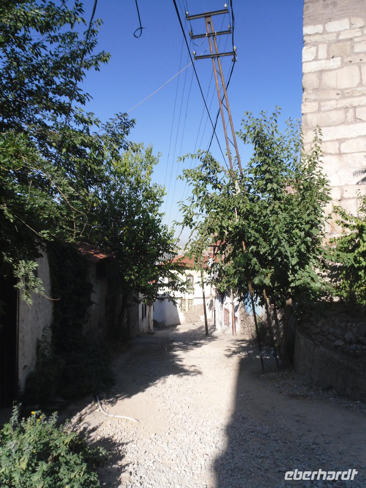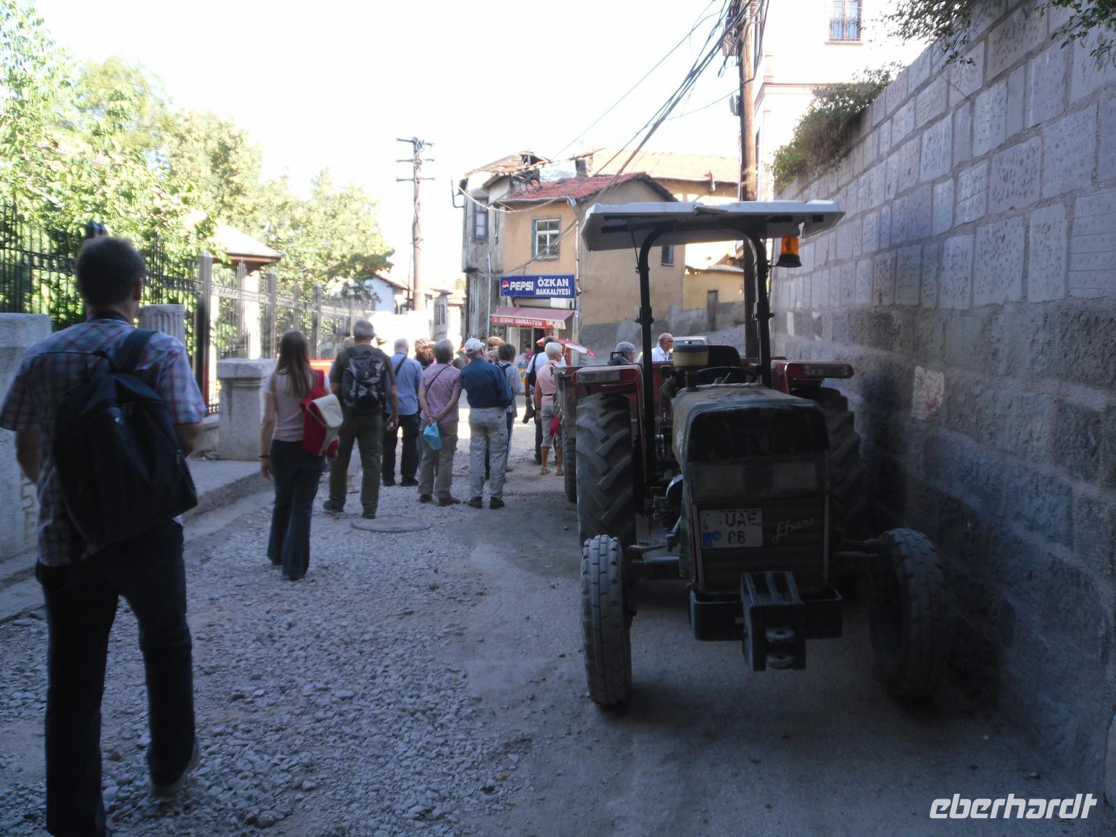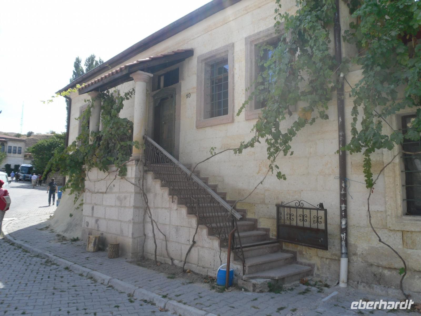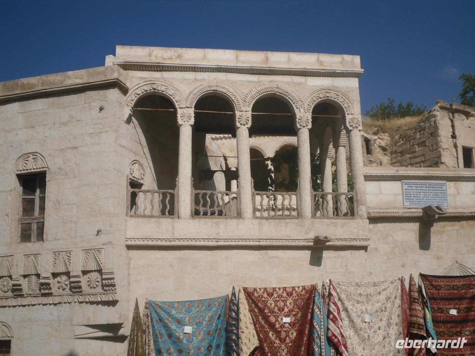 Nach einer kurzen Pause fuhren wir weiter nach Mustafapasa, dem ehemaligen Sinassos. Hier lud uns Hasan zum Tee ein und zeigte uns den kleinen Ort. Dieser war einst die Hauptstadt Kappadokiens. Hier lebten überwiegend Griechen, was an der malerischen Architektur der Häuser unschwer zu erkennen ist. Heute gibt es in Mustafapasa zahlreiche Universitäten und Schulen und wird hauptsächlich von Türken bewohnt.