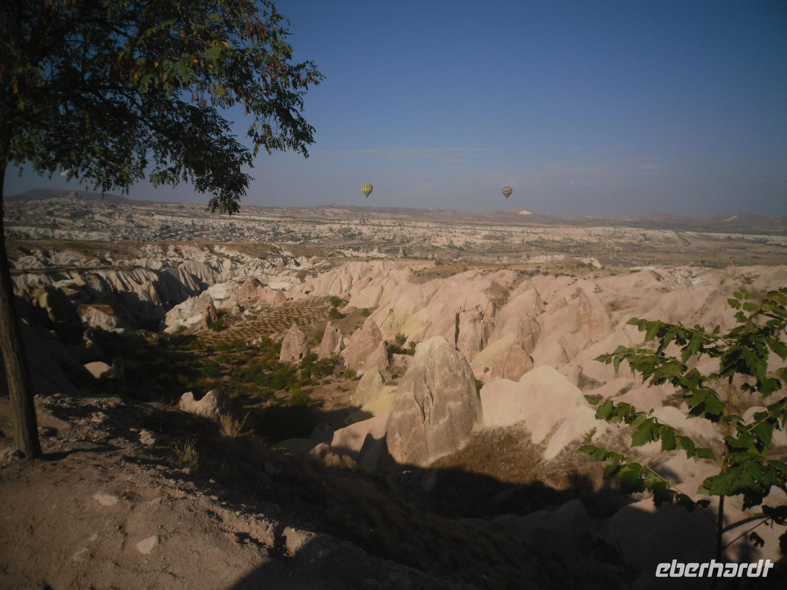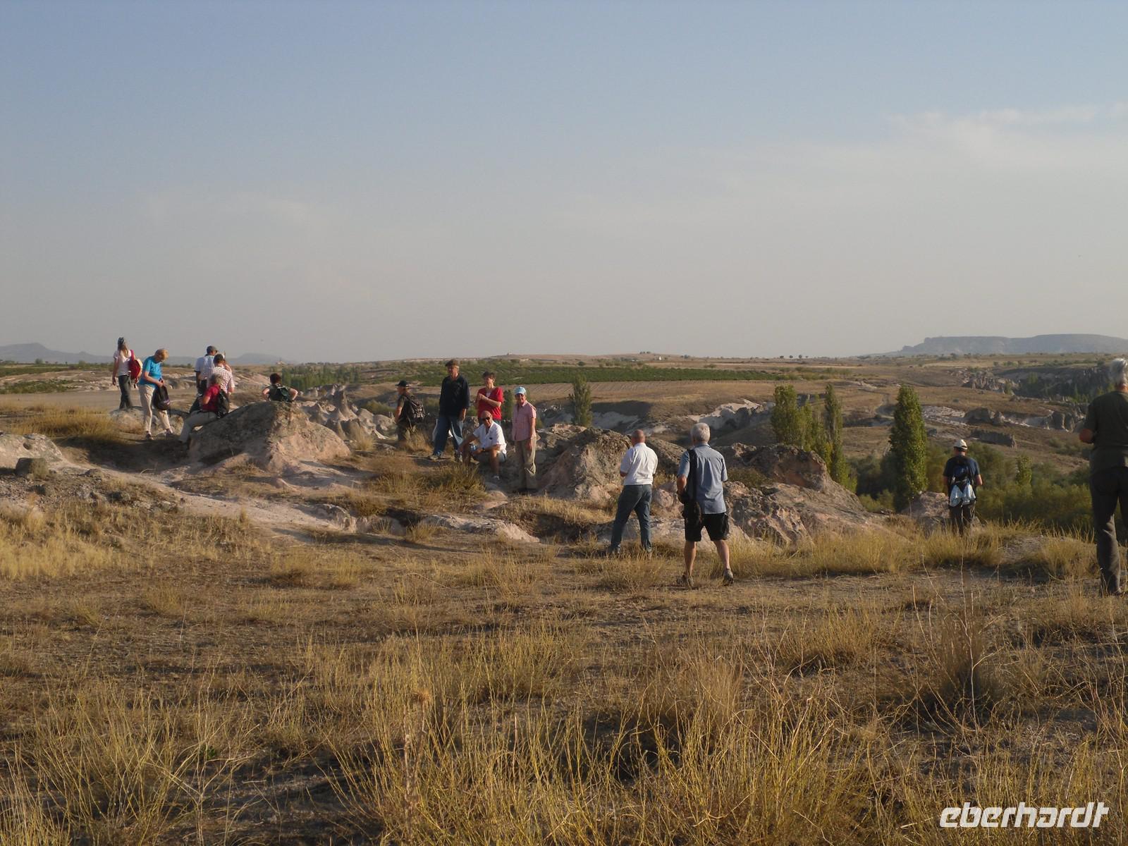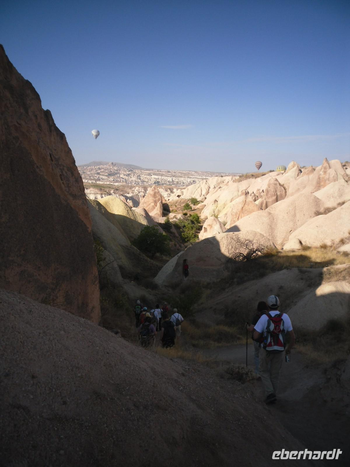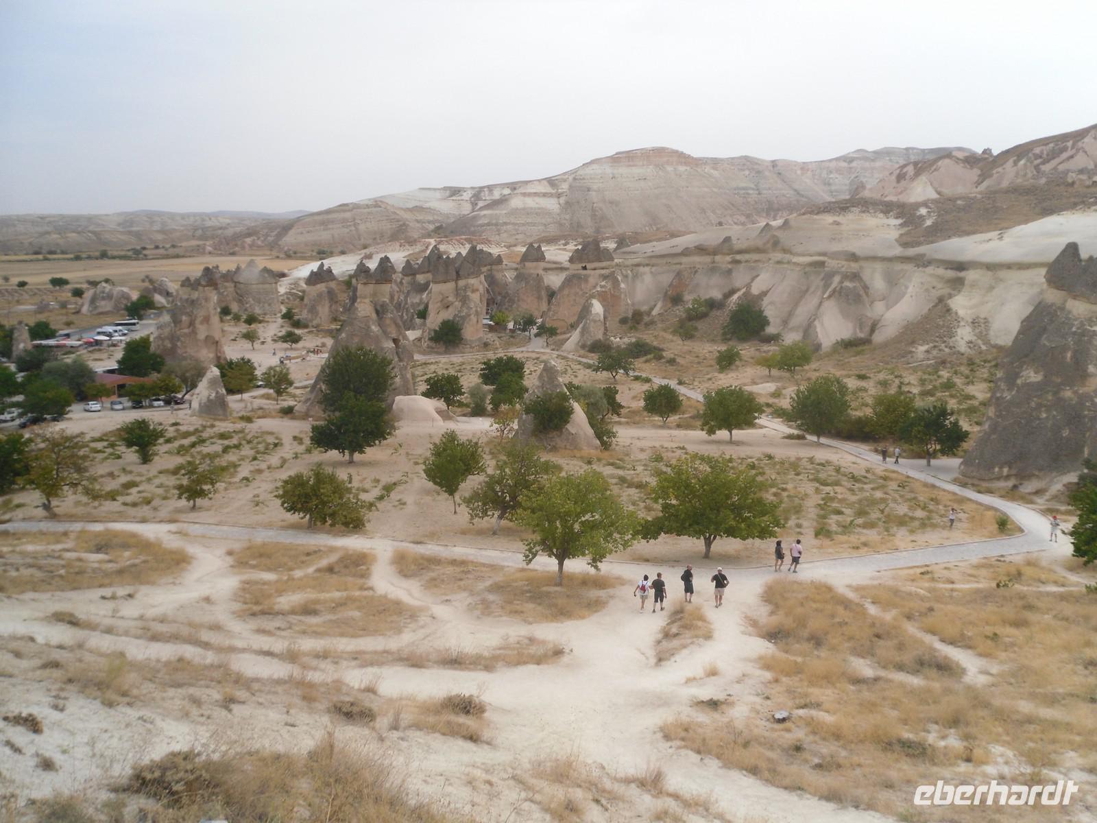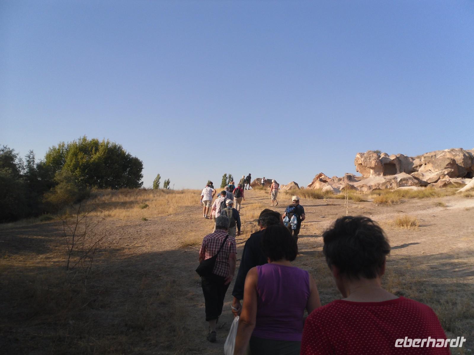 Einige wurden am frühen Morgen von dem Gesang des Muezzin geweckt. Nach dem reichhaltigen Frühstück fuhren wir mit unserem Bus Richtung Liebestal. Dort angekommen wanderten wir auf abenteuerliche Weise über Stock und Stein. Steile und verwachsene Wege verdarben uns die Stimmung nicht, denn nach jeder Hürde wurden wir von der Natur mit Obst belohnt, denn Weintrauben, Pflaumen- und Quittenbäume zierten den Wegesrand. Nach eine kurzen Teepause bei einer Einheimischen ging es zu Fuß weiter zum Bus. Mit diesem fuhren wir zum Aussichtspunkt im Pasabag-Tal. Nach einem kurzen Spaziergang fuhren wir weiter zu einem kleinen Restaurant, wo wir unter einem Wallnussbaum türkische Spezialitäten zum Mittag probieren konnten. Danach ging es weiter nach Uchisar zum Taubental. Dort angekommen sahen wir einige Bäume an denen Augen gegen den bösen Blick hingen. Dies ist ein alter Brauch aus vorchristlicher Zeit und steht im Zusammenhang mit der griechischen Mythologie. Wir wanderten durch das Tal über schmale Trampelpfade ins Göreme-Tal. Dort machten wir wieder eine Teepause bei einem Einheimischen Namens Hasan. Dieser versorgte und mit Erdnüssen und Tee und unterhielt uns mit einem kleinen Spiel, in dem wir Fragen beantworten mussten. Bei einer richtigen Antwort gab es ein kleines Geschenk. In Göreme angekommen hatten wir etwas Freizeit bis der Bus zum nächsten Aussichtspunkt fuhr. Dort angekommen wurde uns ein atemberaubender Blick über das Göreme-Tal geboten. Danach ging es zurück in unser Hotel.