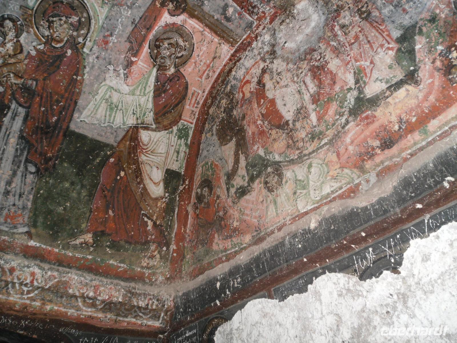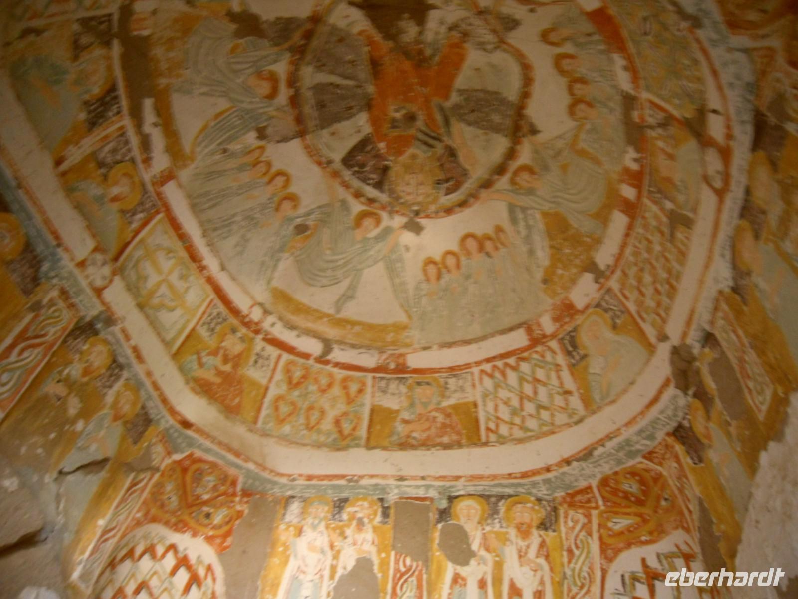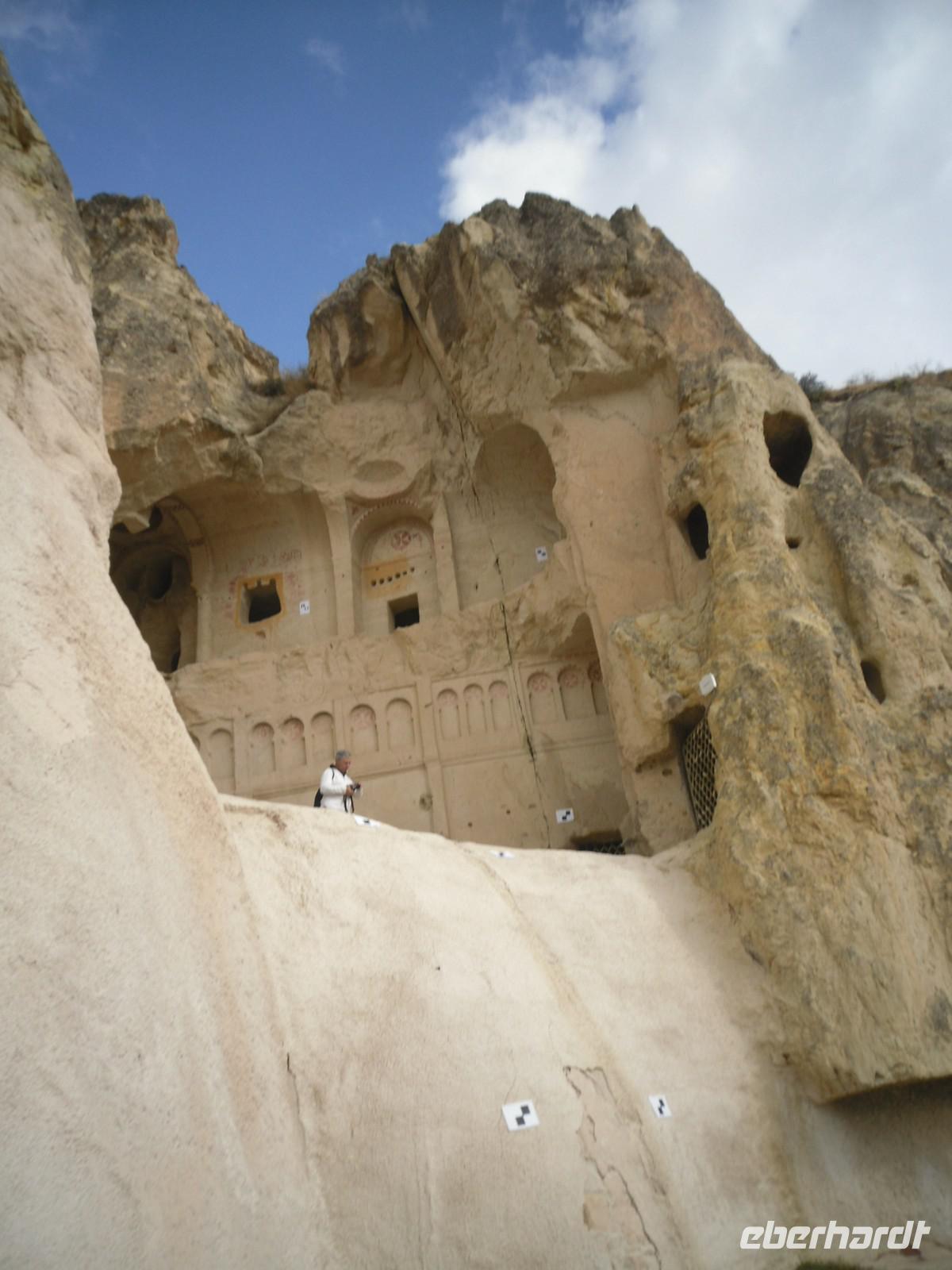 Malerische Hügel und Felsen, Weinreben und romantische Wanderwege schmücken das Landschaftsbild. Am Ende der Wanderung machten wir in einem kleinen Restaurant eine Teepause. Hier konnte man auch schöne Souvenirs und kappadokischen Wein kaufen. Anschließend fuhren wir zu einer Teppichknüpferei. Dort bestaunten wir das künstlerische Handwerk der Knüpferinnen. Der Besitzer führte uns zahlreiche Kunstwerke vor, während wir Kaffee, Tee, Wein, Raki und frisches Fladenbrot bekamen. Beeindruckt und gestärkt fuhren wir weiter nach Göreme zum Freilichtmuseum. Hier gibt es zahlreiche Kapellen und Kirchen, die wir bewunderten. Das Freichlichtmuseum gehört seit langer Zeit zum Weltkulturerbe der UNESCO. Hasan zeigte uns die Apfel-, und Barbarakirche und einen alten Speiseraum. Beeindruckt von diesen historischen Fragmenten.