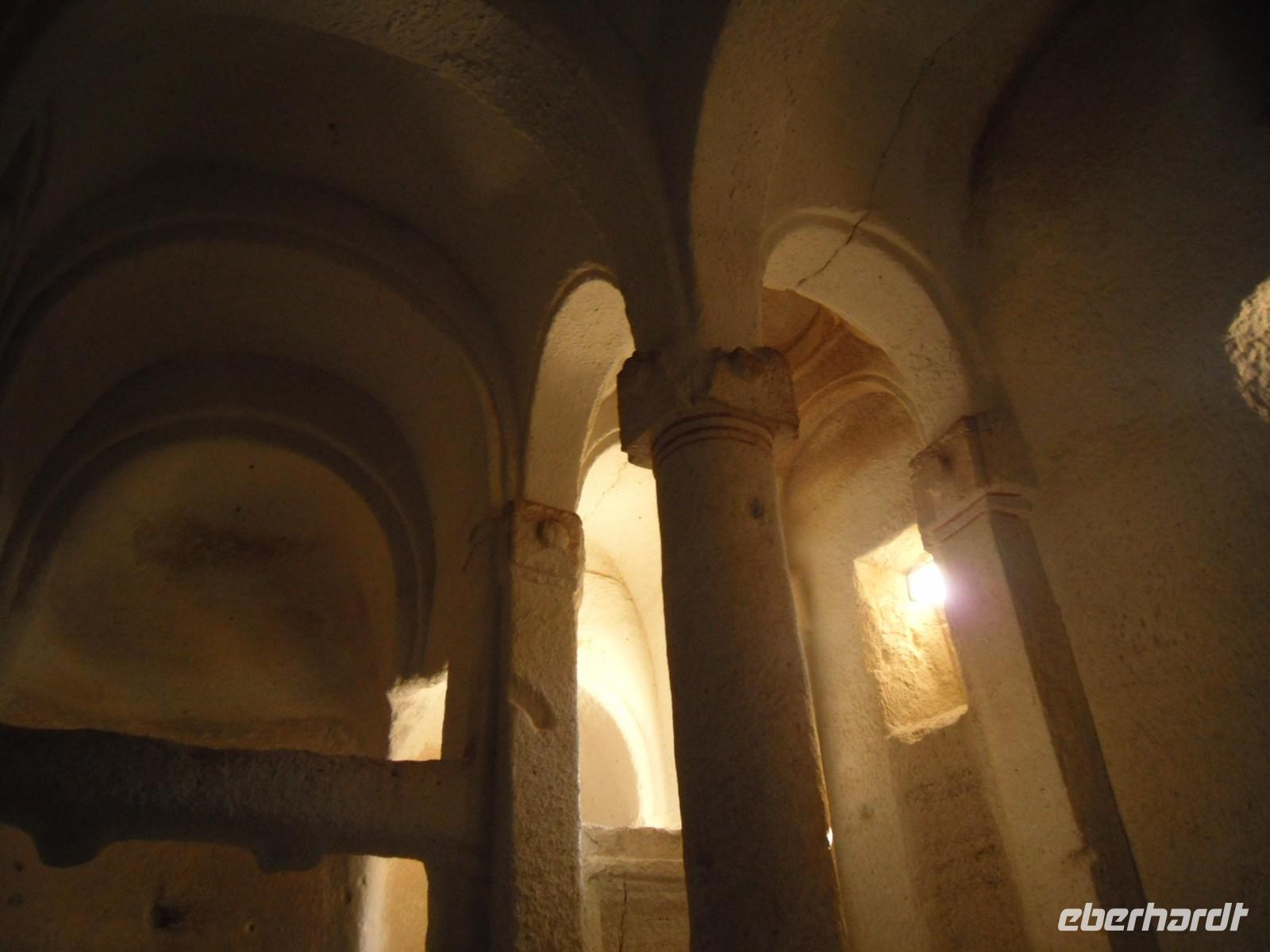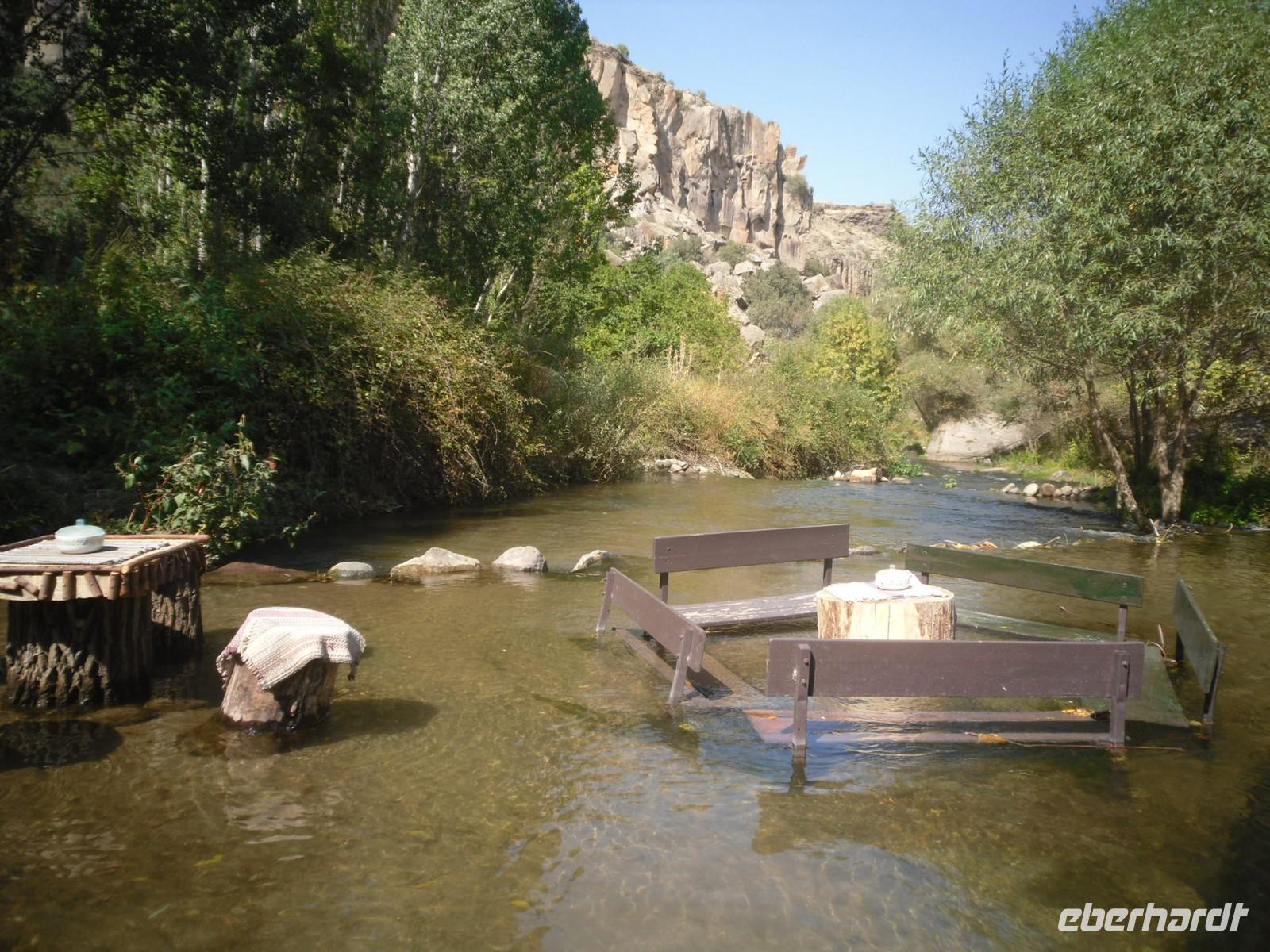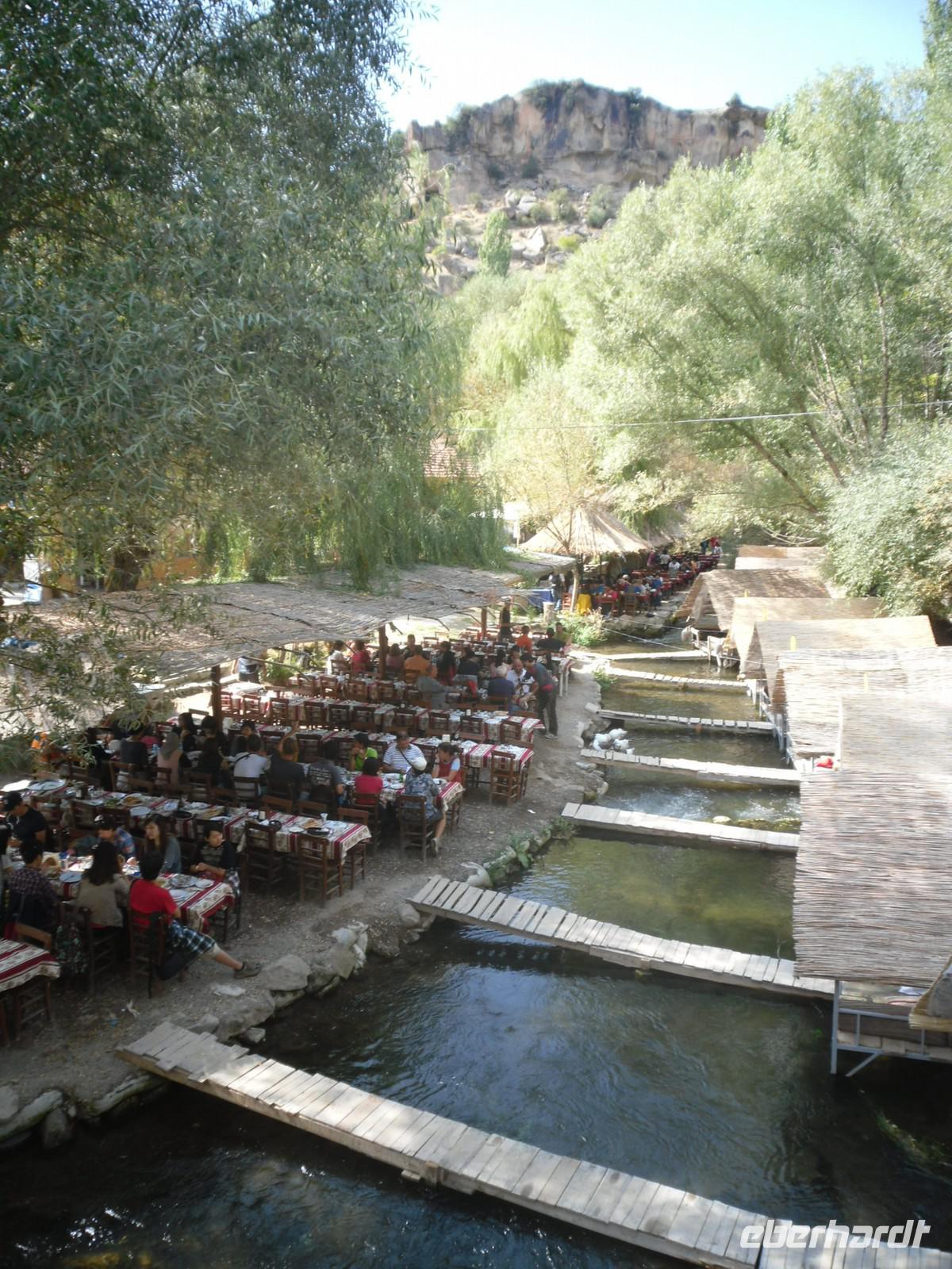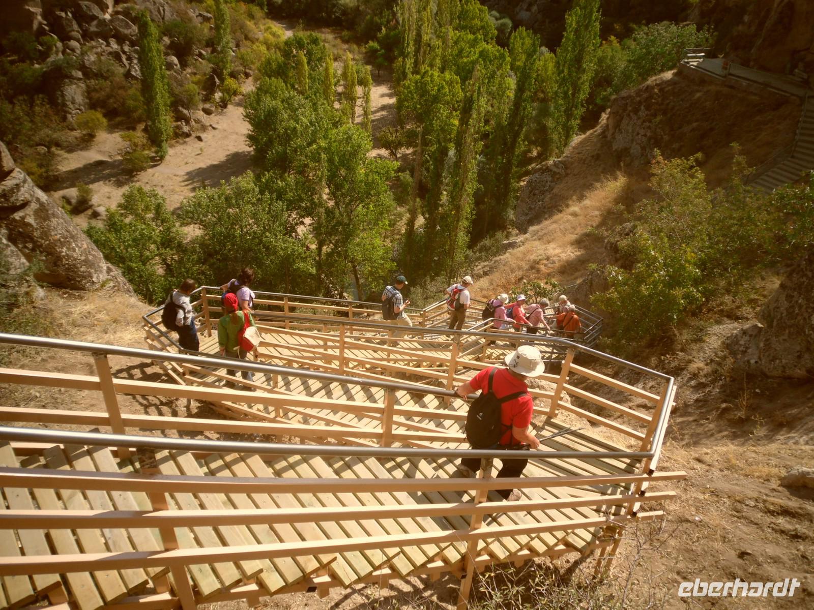 Anschließend ging es zurück in unser Hotel um zu frühstücken. Begeistert schilderten wir den anderen Gästen unsere Erlebnisse. Gut gestärkt fuhren wir dann zur Ihlara-Schlucht. Die 15 Kilometer lange und 150 Meter tiefe Schlucht gleicht einem Naturwunder und hat verblüffende Ähnlichkeit mit dem Grand Canyon. Wir besichtigten alte Kirchen und genossen die schöne Landschaft. Nach einer kurzen Teepause „im" Fluß gingen wir bis zum Ende der Schlucht wo wir unsere Mittagspause mit frischen türkischen Spezialitäten verbrachten. Danach spazierten wir noch durch den Ort, um daraufhin die Weiterreise zur unterirdischen Höhlenstadt Derinkuyu antreten zu können. Knapp 20000 Menschen sollen hier einst Zuflucht gefunden haben, aber ob es tatsächlich so vielen Menschen waren, kann heute niemand mehr genau sagen. Bis zu 25 Meter in die Tiefe stiegen wir durch enge, niedrige Gänge und Treppen. Alle waren von den Höhlen beeindruckt. Selbst eine Kirche gab es in der unterirdischen Stadt. Erschöpft von dem langen Tag ging es anschließend zurück in unser Hotel.