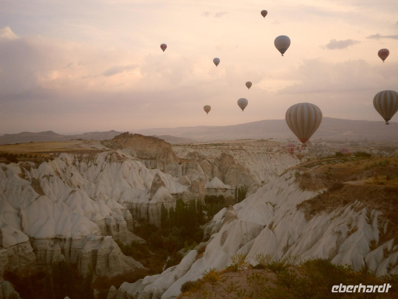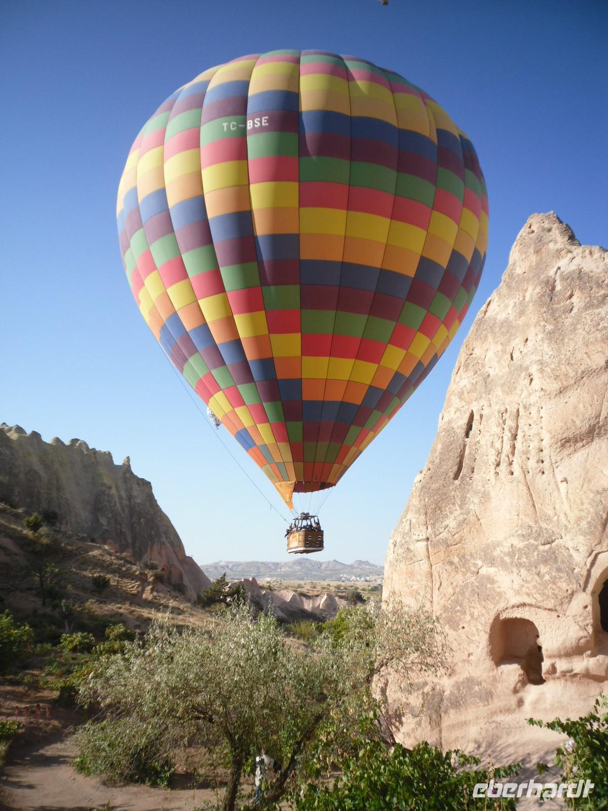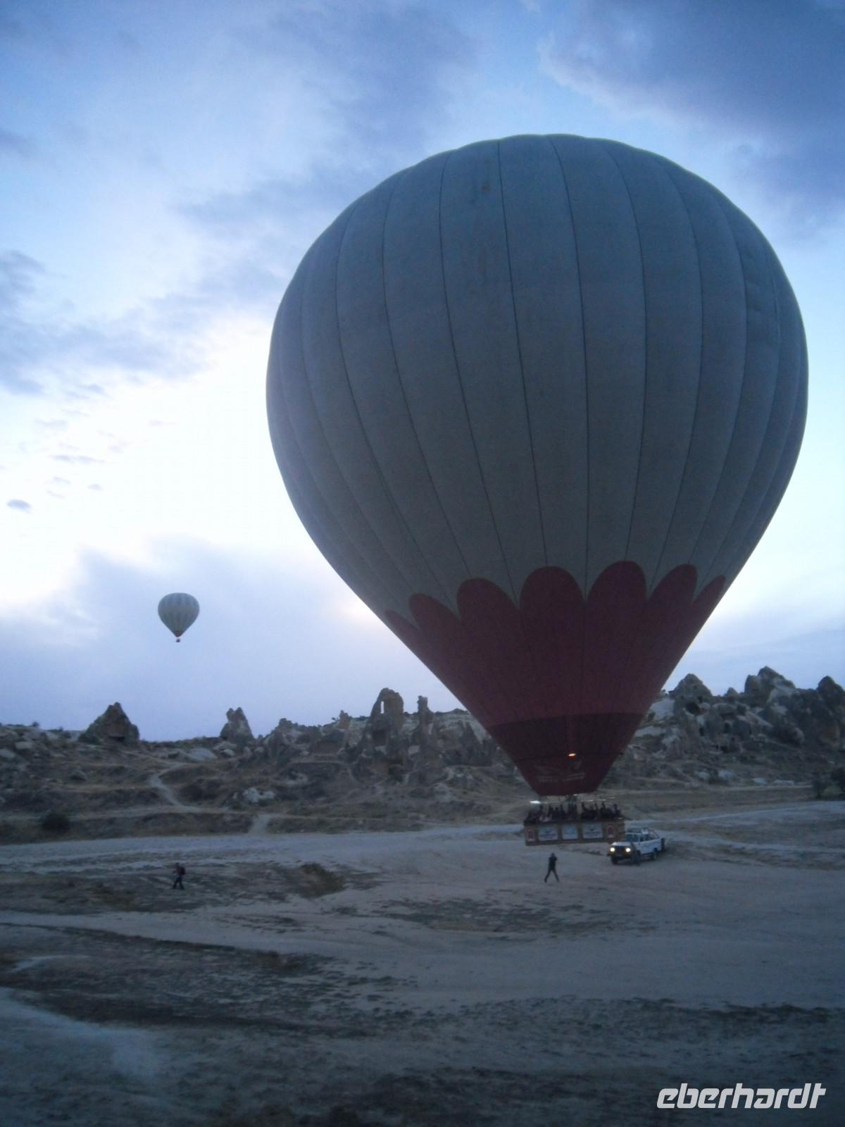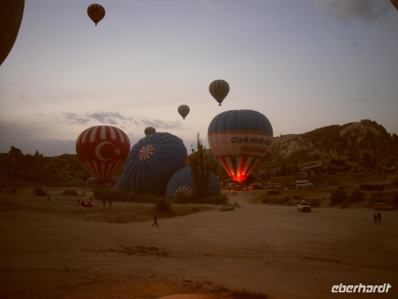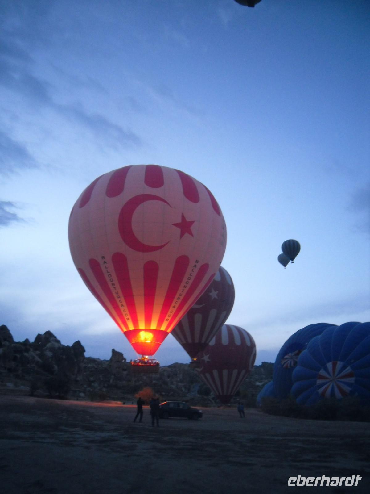 Heute Morgen war es endlich soweit. Für 12 Gäste und mich hieß es früh aufstehen, dann bereits um 5.20Uhr wurden wir zur heiß ersehnten Ballonfahrt abgeholt. Kurze Zeit später erreichten wir Göreme - den Ort wo unser kleines Abendteuer begann. Bevor es losging konnten wir uns mit Keksen, Kaffee und Tee stärken. Die ersten Ballons stiegen bereits auf. Und dann ging es auch für uns los und wir wurden zu unserem gigantischen Heißluftballon gebracht. Nach einer kurzen Sicherheitseinführung ging es dann schon hoch in die Luft. Erst überquerten wir das schöne Göreme und später das malerische Liebestal, durch welches wir bereits wanderten. Bis zu 1500 Meter stieg unser Pilot mit uns auf. Nach der Landung wurden wir für unseren Mut mit einer Urkunde und einem Glas Sekt belohnt.