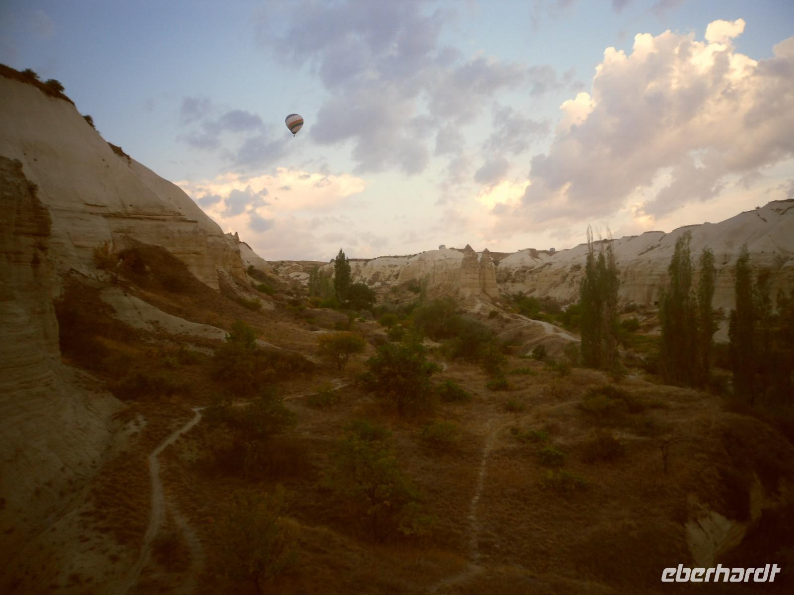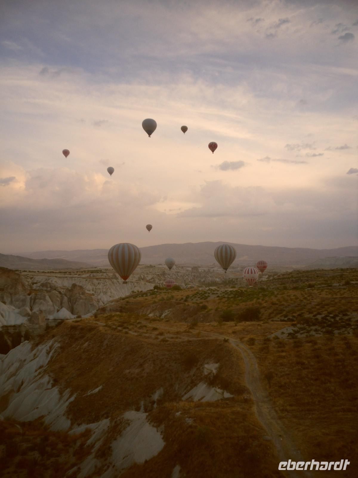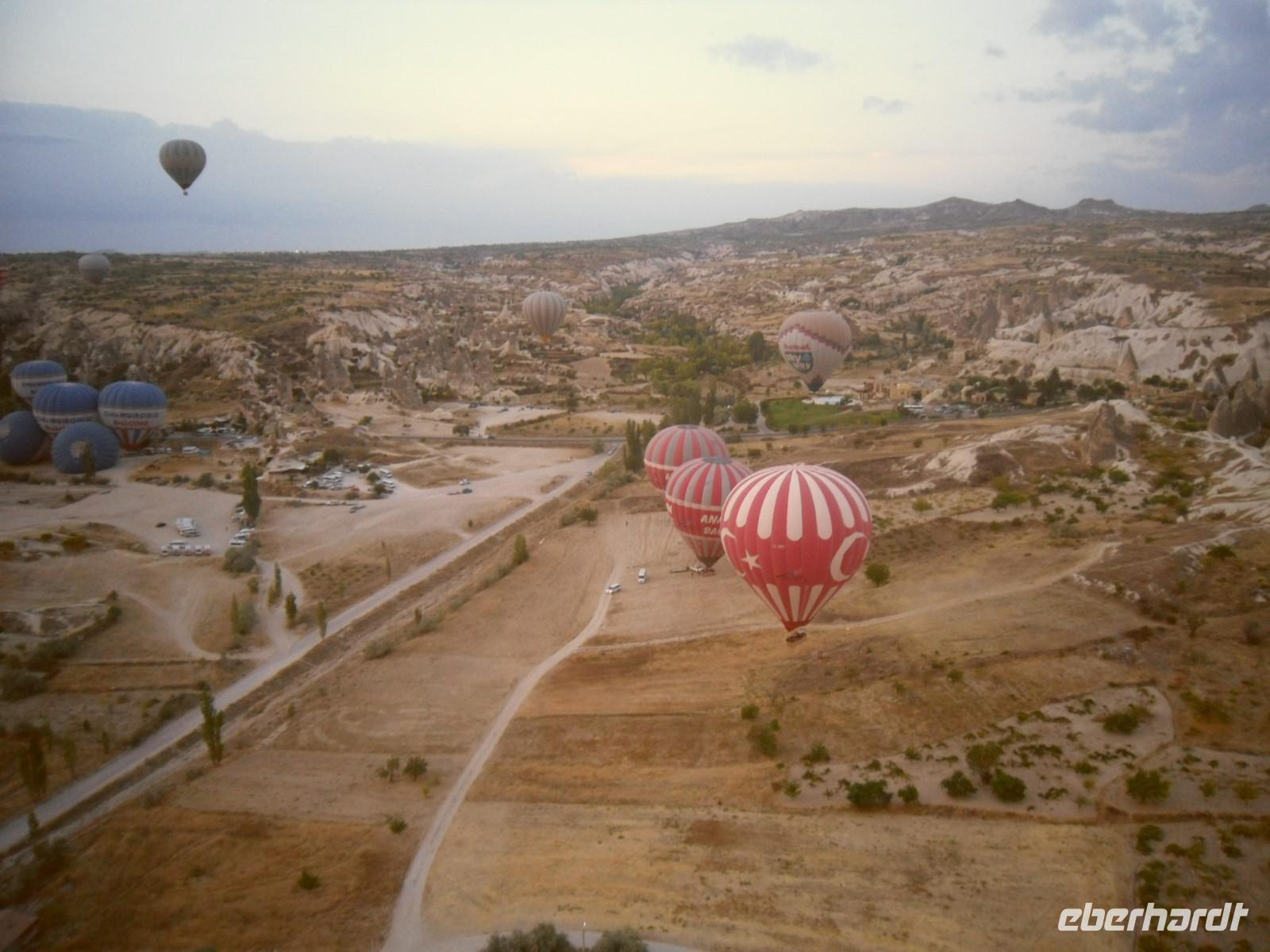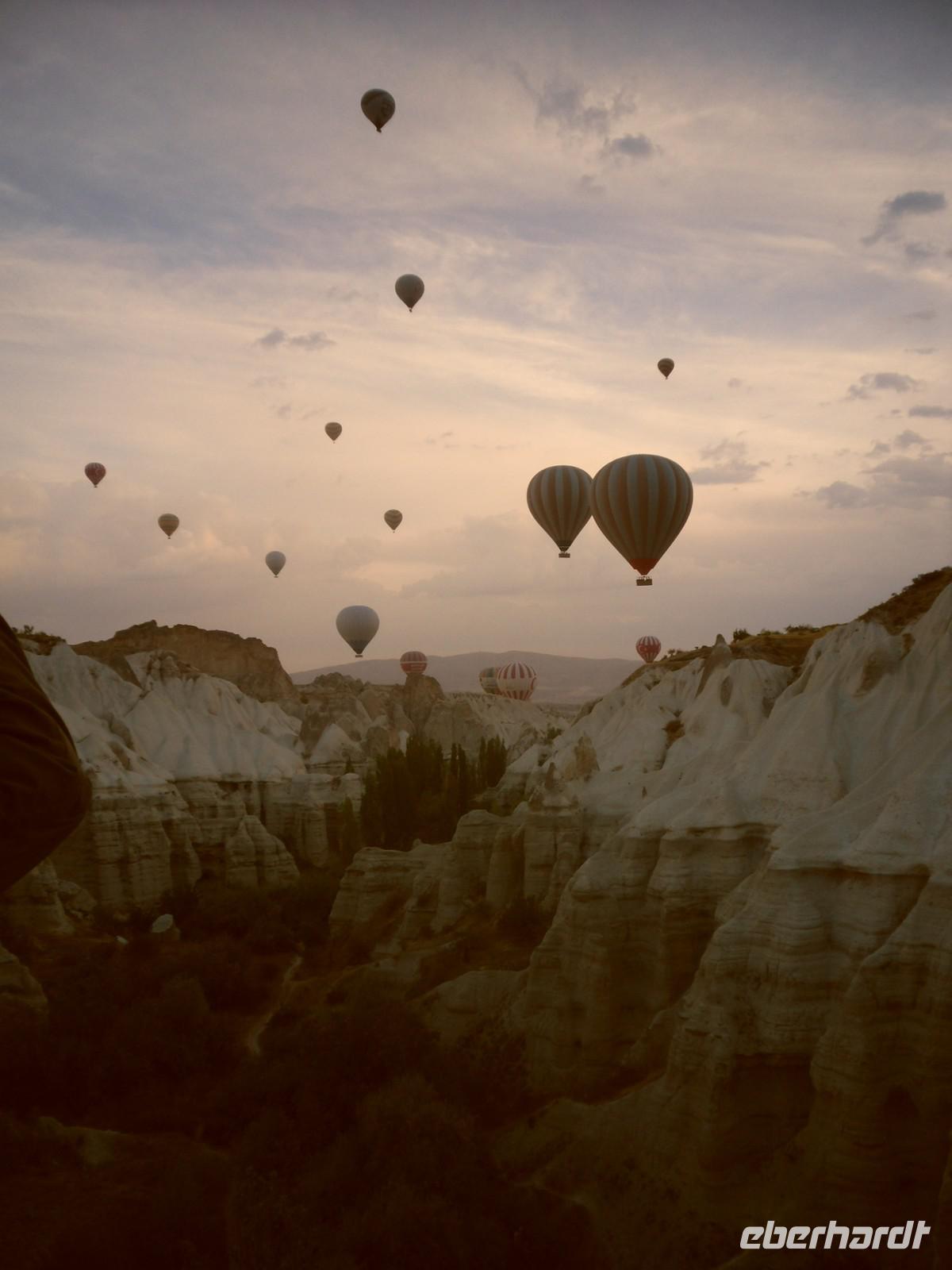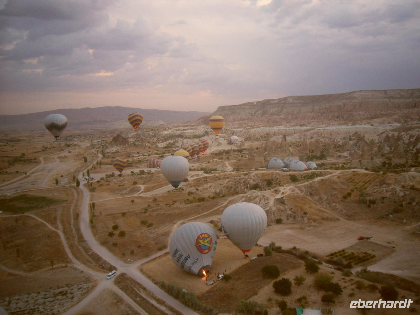 Heute Morgen war es endlich soweit. Für 12 Gäste und mich hieß es früh aufstehen, dann bereits um 5.20Uhr wurden wir zur heiß ersehnten Ballonfahrt abgeholt. Kurze Zeit später erreichten wir Göreme - den Ort wo unser kleines Abendteuer begann. Bevor es losging konnten wir uns mit Keksen, Kaffee und Tee stärken. Die ersten Ballons stiegen bereits auf. Und dann ging es auch für uns los und wir wurden zu unserem gigantischen Heißluftballon gebracht. Nach einer kurzen Sicherheitseinführung ging es dann schon hoch in die Luft. Erst überquerten wir das schöne Göreme und später das malerische Liebestal, durch welches wir bereits wanderten. Bis zu 1500 Meter stieg unser Pilot mit uns auf. Nach der Landung wurden wir für unseren Mut mit einer Urkunde und einem Glas Sekt belohnt.
