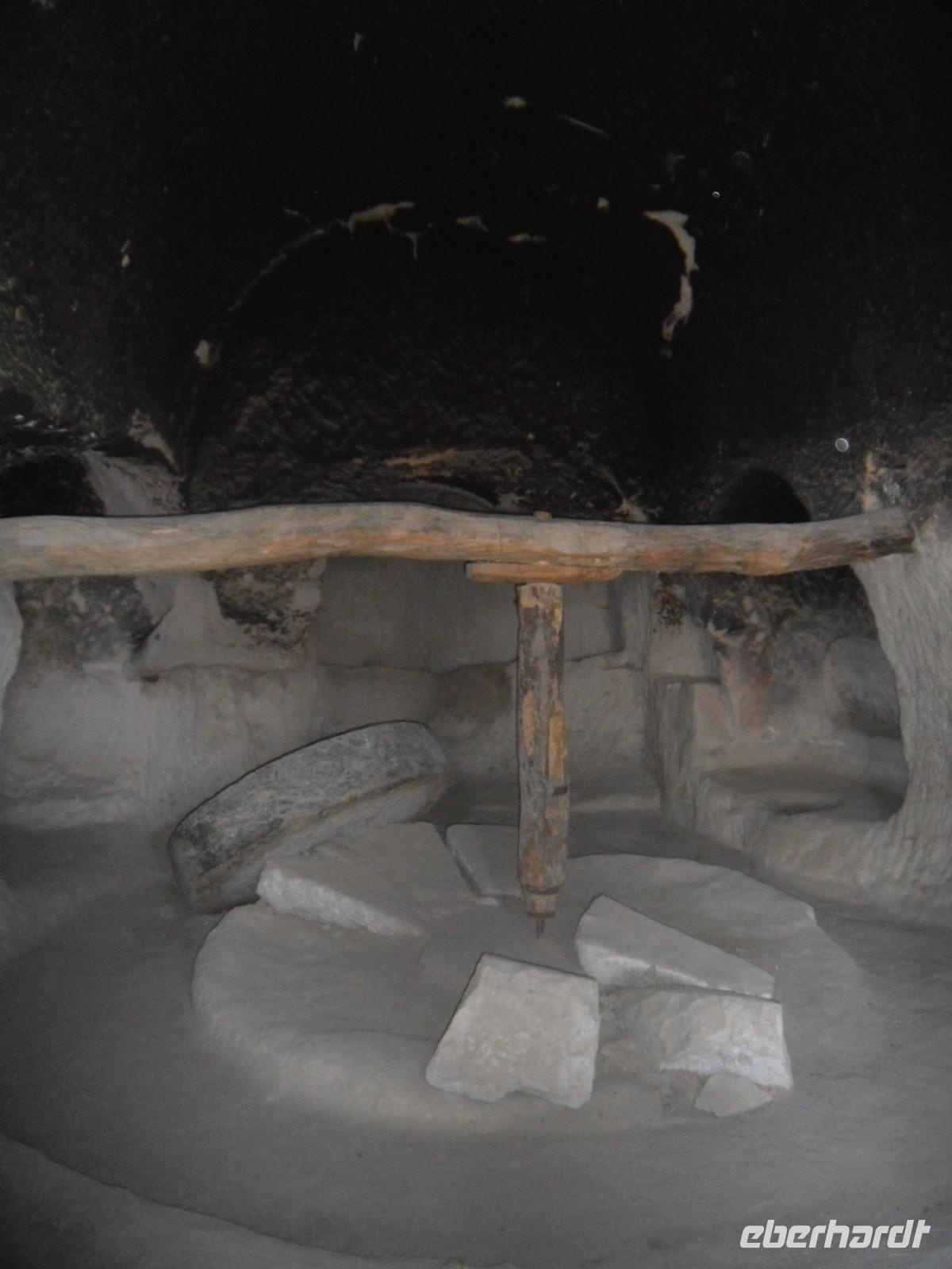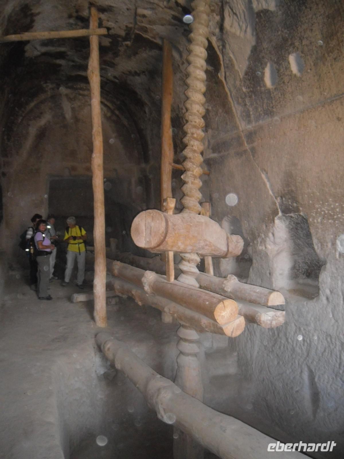 Gestärkt fuhren wir weiter in das 40 Kilometer entfernte Soganli-Tal. Trotz Sandsturm und Regen bewunderten wir verlassene Höhlenwohnungen und Höhlenkirchen mit wunderschönen und gut erhaltenen Malereien. Am Ende der kurzen Wanderung gingen wir durch eine verlassene Siedlung. Trotz Denkmalschutz sind deren Häuser sehr verfallen und verwachsen. Nun ging es auch schon zurück nach Ürgüp. Hier erwartete uns eine Weinverkostung im Weingut Turasan. Nach köstlichen Weinproben fuhren wir zum Hotel, wo jeder Zeit zum Ausruhen oder zum Erkunden des Ortes hatte.