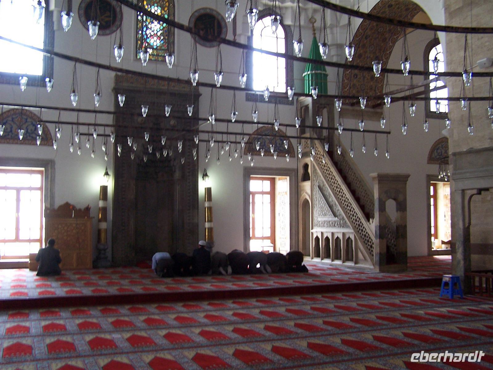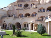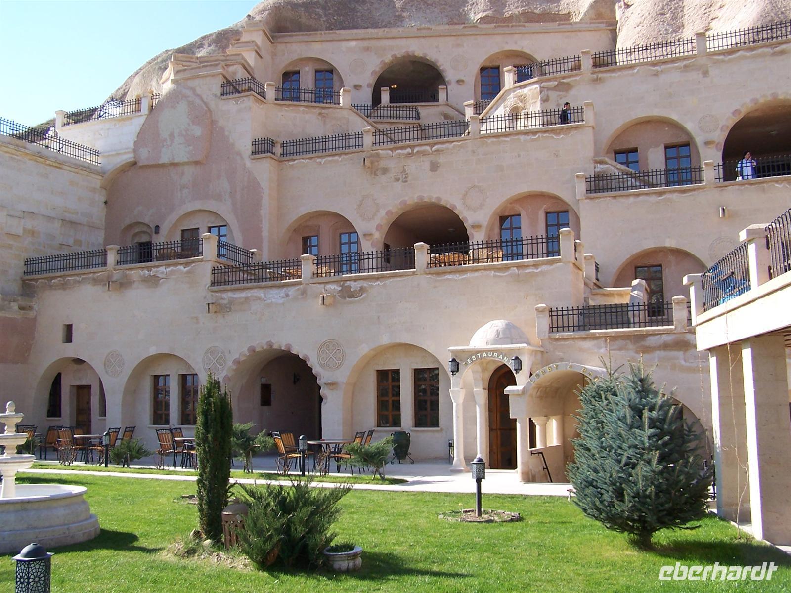 Am frühen Morgen starteten wir mit unserem Busfahrer Erdal zur Fahrt nach Kappadokien. Die ersten Stunden waren landschaftlich sehr abwechslungsreich, besonders die Fahrt entlang der Türkischen Riviera und über das Taurus-Gebirge. Gegen Mittag erreichten wir die Konya-Ebene und das Mevlana-Kloster in Konya. Mevlana war der Begründer der Sema, des Tanzes der Derwische. Von der Millionenmetropole Konya aus fuhren wir zur Karawanserei in Sultanhani, eine der am besten erhaltenen an der Seidenstraße. Über Aksaray und Nevsehir kamen wir gegen 18.00 Uhr in unserem Höhlenhotel Alfina in Ürgüp an. Beeindruckend wie die Zimmer terrassenförmig aus dem hellen Tuffgestein herausgearbeitet wurden.