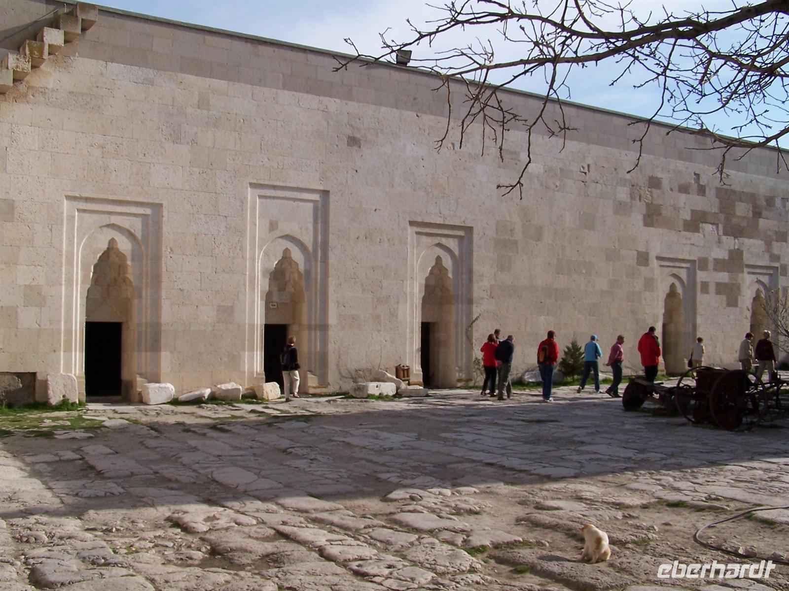 Geheimnisvoll sind die unterirdischen Städte Kappadokiens. Die größte unter ihnen, Derinkuyu, besichtigten wir am Vormittag. Bis zu sieben Stockwerke unter die Erde reichen die Lagerräume, Gänge und Wohnhöhlen. Wieder am Tageslicht fuhren wir nach einer kleinen Teepause nach Ihlara zu Füßen des mächtigen Hasan-Vulkans. Dort begann unser Abstieg in die Ihlara- Schlucht über eine steile Treppe . Entlang des Melendiz- Flusses wanderten wir durch das vegetationsreiche Ihlara Tal. Am Ende der Schlucht angekommen, wurde unser Durchhaltevermögen mit einem Picknick am Ufer des Flusses belohnt.