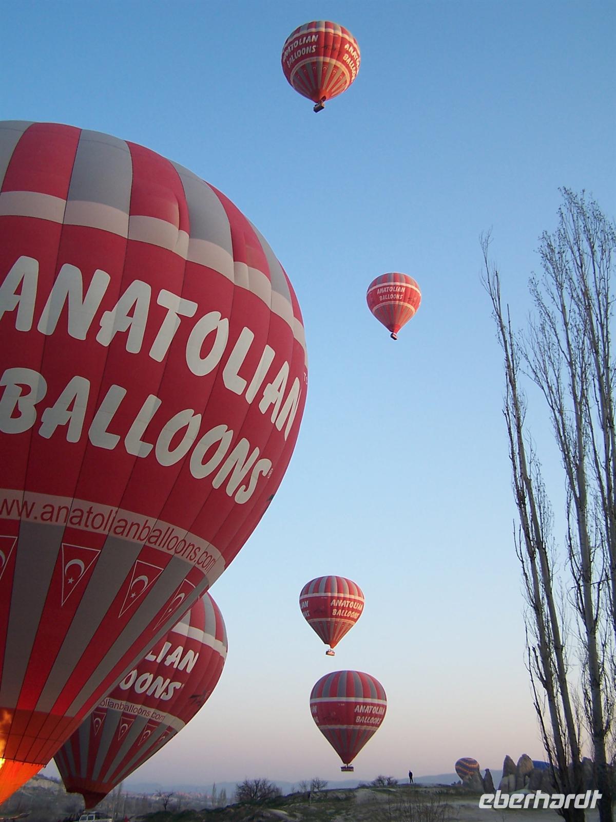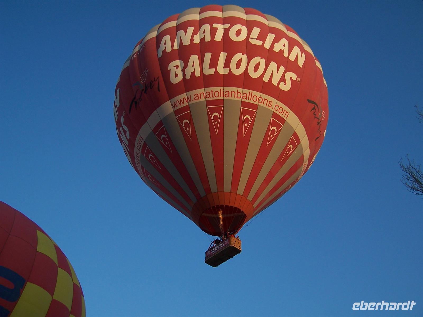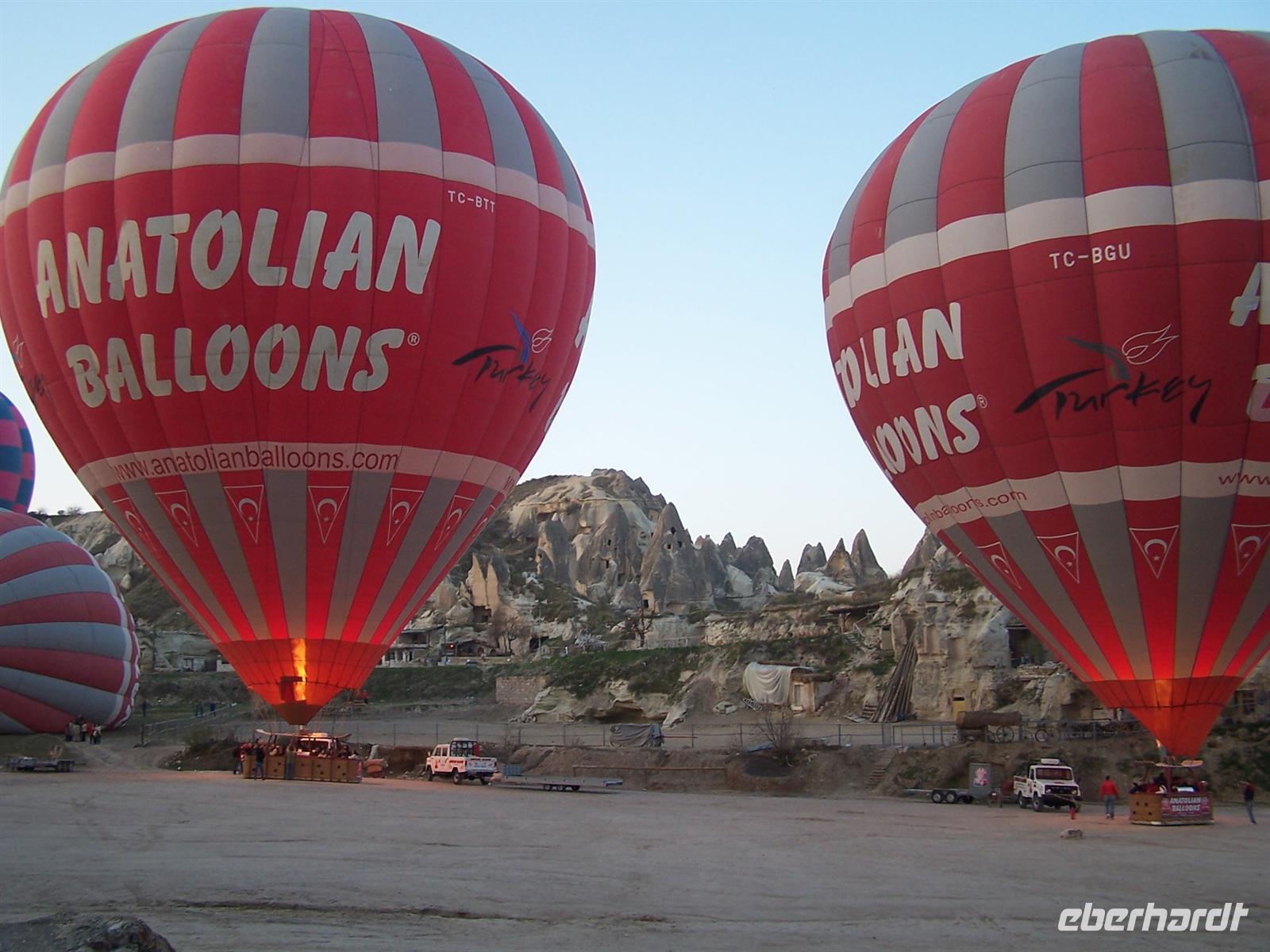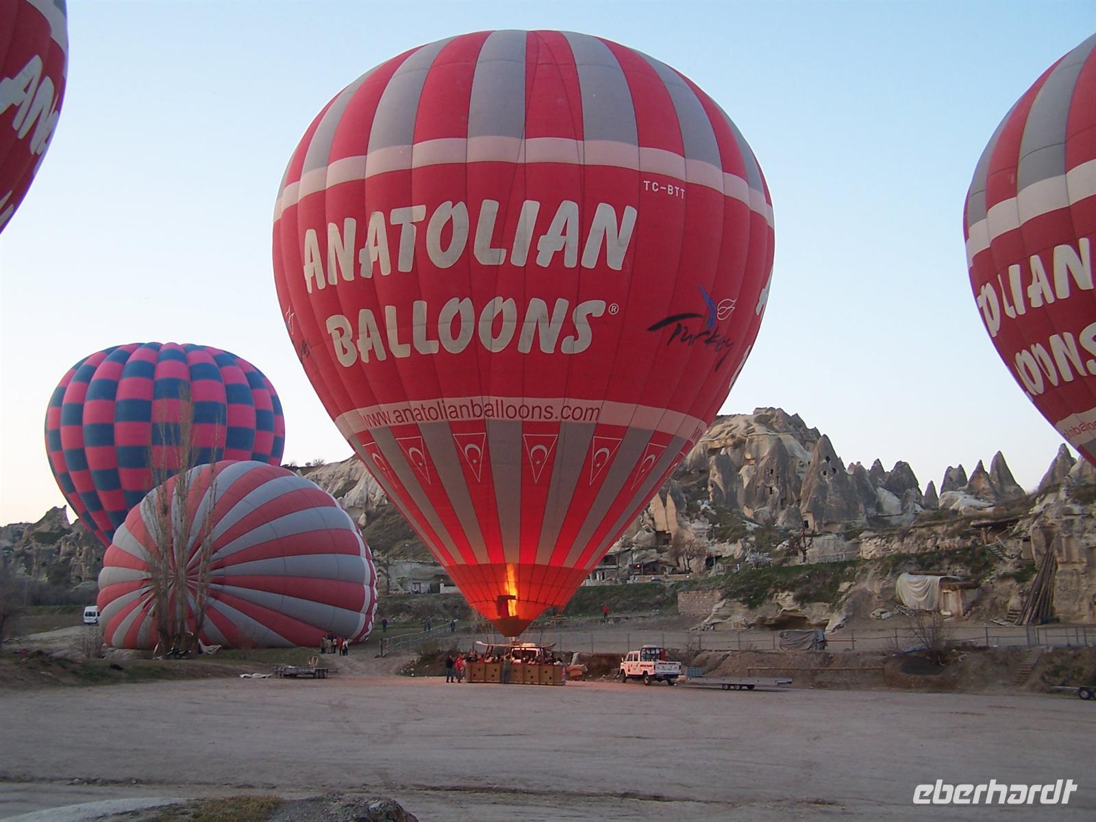 Gegen 05.30 Uhr wurden wir mit einem Kleinbus zur Ballonfahrt vom Hotel abgeholt. Als wir auf dem Startfeld ankamen, war es noch dunkel. Schon dem Auslegen und dem Aufblasen der Ballons zuzusehen war ein Erlebnis. Der Höhepunkt war das fast zeitgleiche Abheben der ca. 30 riesigen Ballons und das farbenfrohe Bild am Himmel, währenddessen die Sonne langsam aufstieg. Anschließend fuhren wir zum Frühstück ins Hotel.