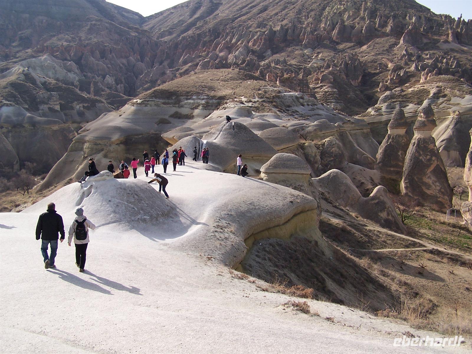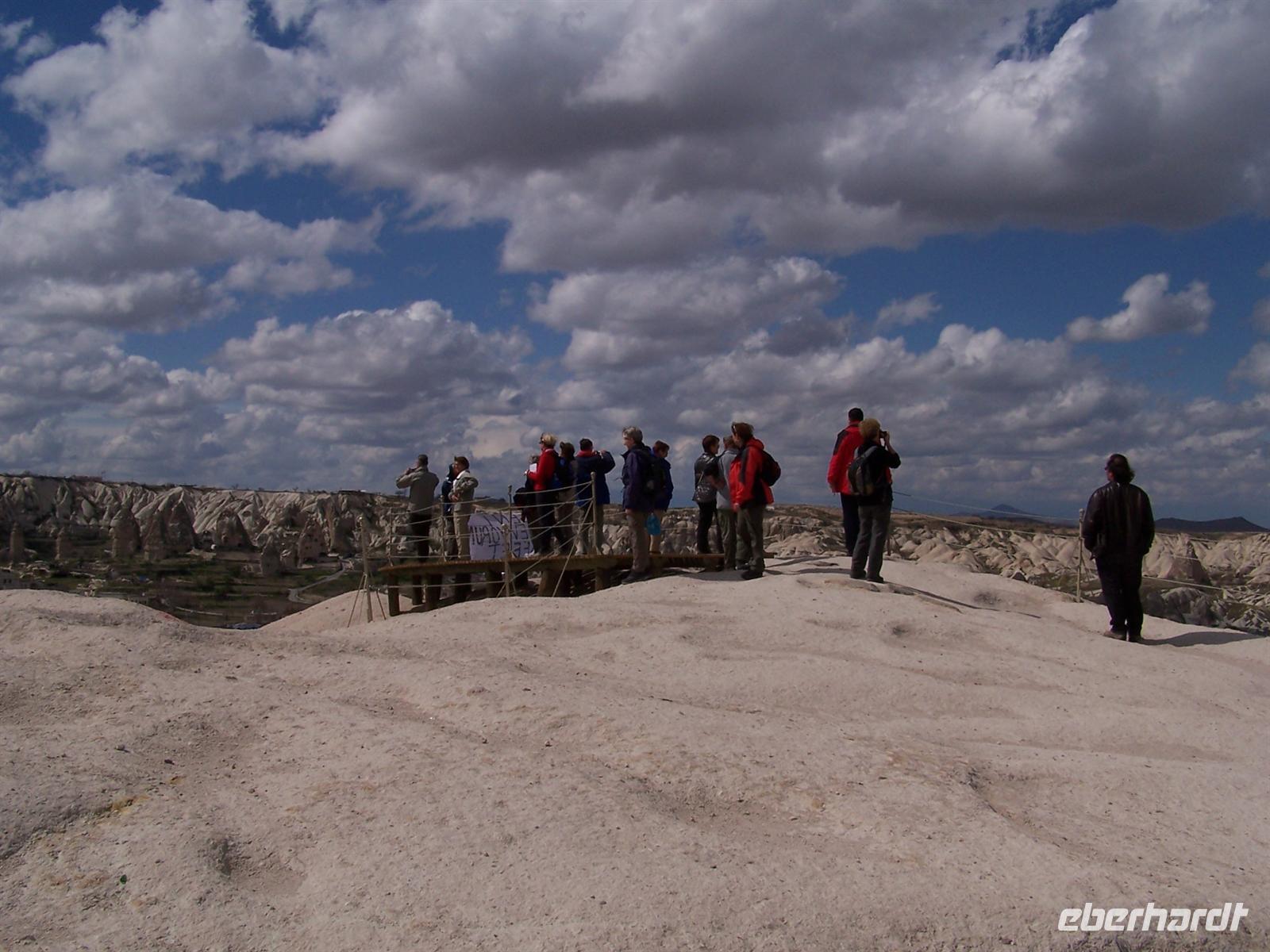Bei bedecktem Himmel fuhren wir nach Uchisar, dem Ausgangspunkt für eine Wanderung durch das Taubental. Dieses beeindruckt durch seine vielen Ausblicke auf die Felsenburg von Uchisar und den sich ständig wechselnden Farbkombinationen. Es ist ein Genuss, an den Wohntürmen und bizarren Felsformationen entlang zu wandern. Unser Mittagessen nahmen wir in Göreme, der wohl schönsten Stadt in dieser Märchenlandschaft ,in einem typisch türkischen Restaurant ein. Nach der Mittagspause und einem Spaziergang auf den Aussichtsberg von Göreme, fuhren wir zum Bagli Dere, um mit unserer Wanderung durch dieses schöne Tal zu beginnen. Leider waren die Wanderwege in keinem sehr gepflegten Zustand, aber die Landschaft sowie eine besonders schöne Formation von Feenkaminen entschädigten das. Am Abend bestand die Möglichkeit, eine sehr meditative und mystische Derwisch-Veranstaltung zu besuchen, welche von unseren Wanderfreunden sehr differenziert bewertet wurde.