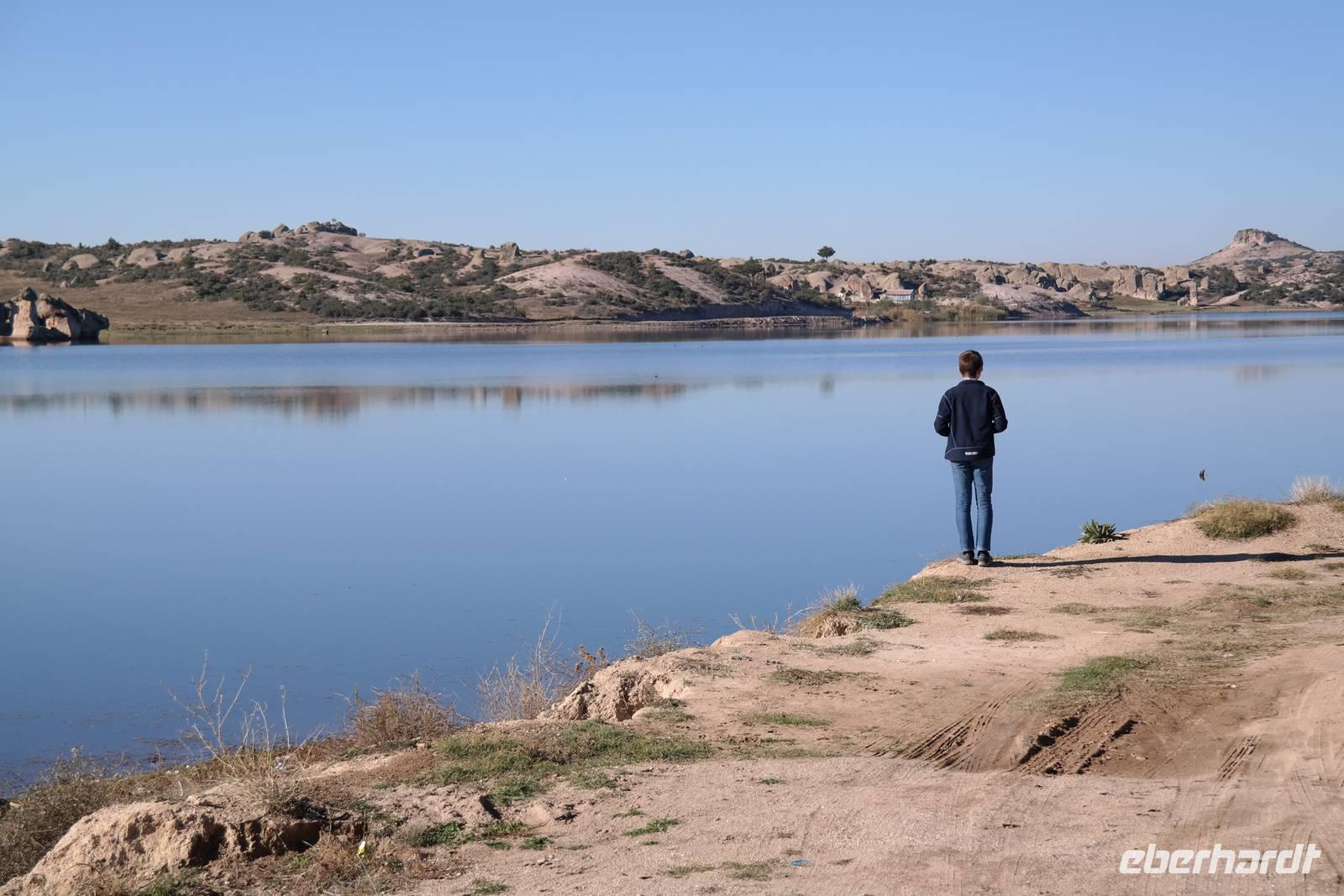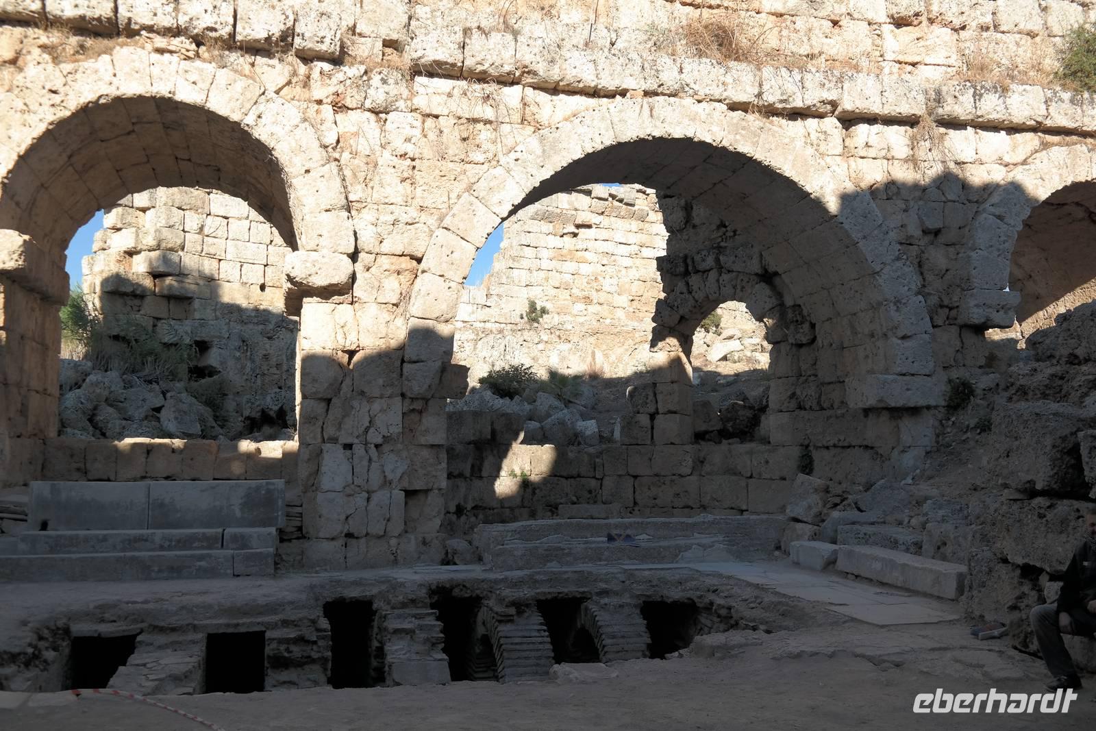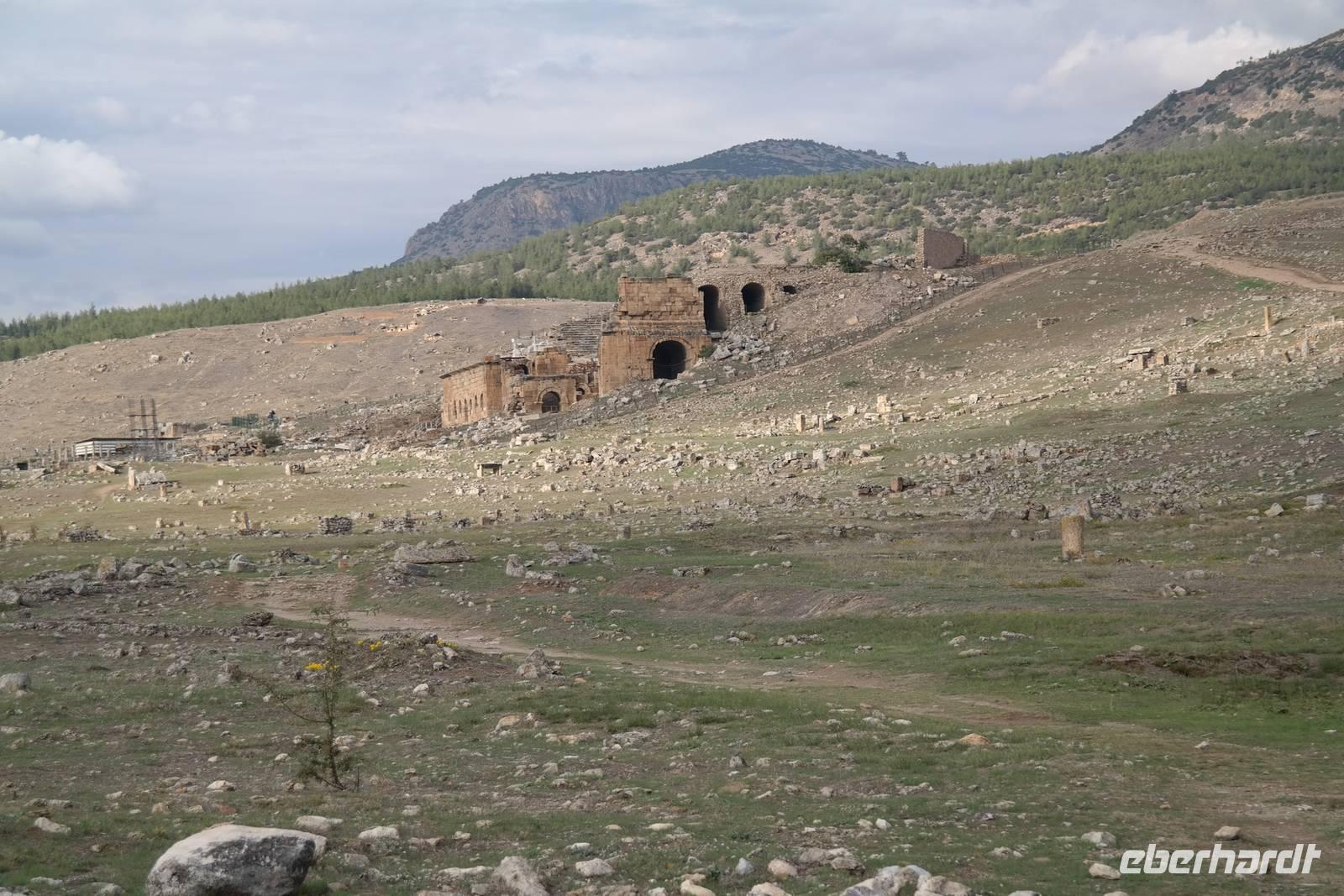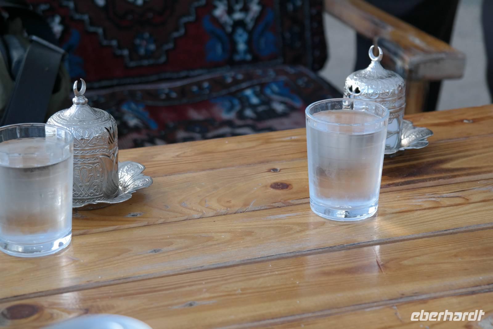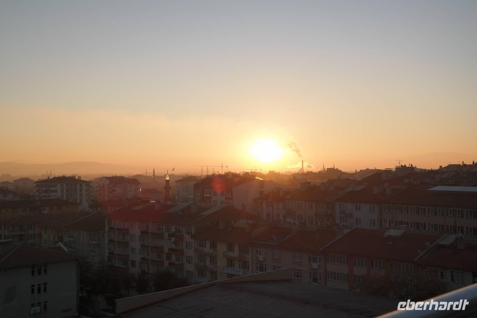 Früh am Morgen starteten wir heute zu unserer eigentlichen Rundreise. Zuerst versammelten wir uns im Restaurant des Hotels, wo wir ein stärkendes Frühstück zu uns nahmen. Bei strahlendem Sonnenschein und viel Wind stiegen wir dann gegen 8.00 Uhr in den praktischen kleinen Bus und fuhren los in Richtung Perge. Dort angekommen durchquerten wir zuerst die altrömische Arena und verbrachten dann einen Teil des Vormittags zwischen den weißen Säulen und Marmorblöcken der gewaltigen Ausgrabungsstätte, die frei zugänglich waren. Während der Busfahrten lieferte uns Ismael immer wieder umfassende Informationen zu Geschichte, Traditionen und regionalen Eigenheiten unseres jeweiligen Aufenthaltsortes. Wir machten Halt an einem kleinen Obststand auf dem Land, wo es frische Bananen, Mandarinen und Granatäpfel zu kaufen gab, deren Geschmack sich mit unserer Supermarktware nicht vergleichen ließ! Zum Mittag gab es für die meisten von uns Pide oder Kebab, typische türkische Gerichte. Bei der Durchquerung der anatolischen Hochebene konnten wir die Temperaturunterschiede zur südlichen Küste hautnah kennenlernen, denn es war selbst verglichen mit Deutschland trotz Sonne ziemlich frisch. Am Abend erreichten wir unser Thermal-Hotel mitten im Stadtzentrum von Afyon, wo es trotz Wochenende überall geöffnete Geschäfte mit Wurst-, Käse- oder Zuckerspezialitäten gab. Dort bezogen wir unsere Zimmer und es bestand die Möglichkeit den Thermalbereich des Hotels zu nutzen. Das Abendessen stand hoch oben, über den Dächern von Afyon für uns bereit.