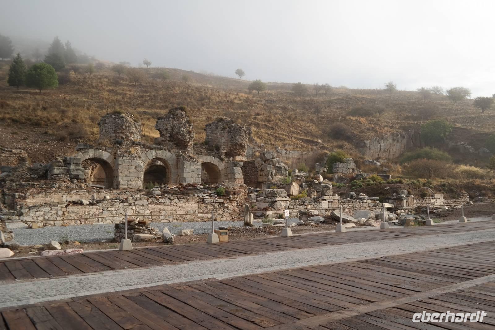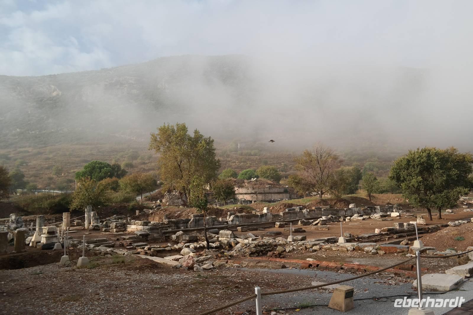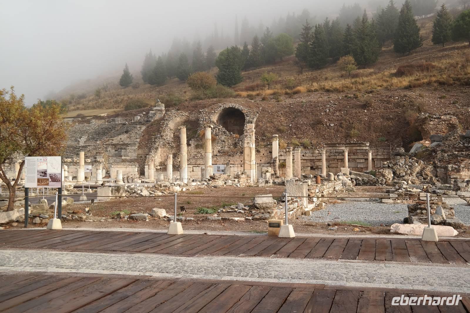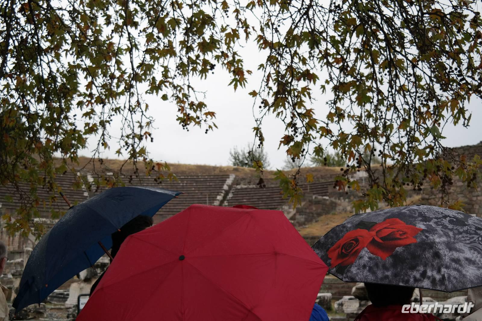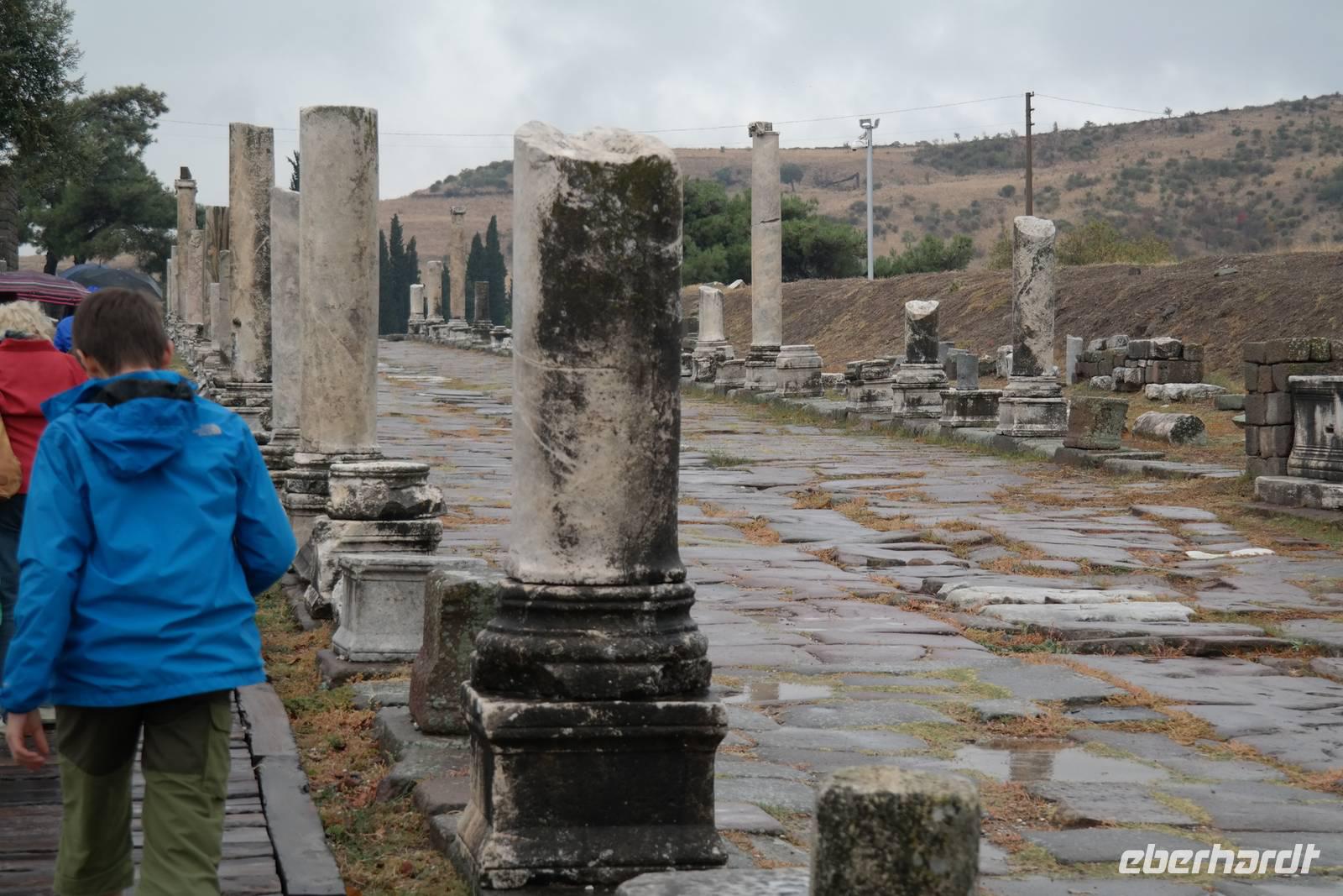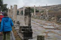Wo wurde eigentlich das Pergament erfunden? Natürlich in Pergamon! Mit einer hochmodernen Seilbahn erreichten wir die antike Stadt mitten am Berggipfel und bewunderten die Jahrtausende alte Baukunst. Leider regnete es an diesem Tag und wir konnten die wunderbare Aussicht nur mäßig genießen. Nur beim Anblick des extrem steilen Theaters direkt am Berghang wurde uns ein wenig schwindelig. Auch die Heilstadt Asklepion gleich unterhalb von Pergamon beeindruckte uns mit imposanten Säulen und detailliert behauenen Kapitellen. Wir erfuhren, wie schon in der Antike Kranke durch homöopathisch anmutende Verfahren kuriert wurden und wirksame Medikamente und Heilmethoden hier entwickelt und angewendet wurden. Niemals ist in Asklepion jemand gestorben! (Natürlich sind auch Patienten gestorben, doch wenn dies offensichtlich wurde, dann brachte man sie aus der Stadt, um den Tod nicht einzulassen - eigentlich clever!) Nach einem Tag in solch majestätischem Umfeld erreichten wir am Abend Kusadasi, wo wir eincheckten, um am kommenden Tag gleich wieder unsere Reise fortzusetzen.