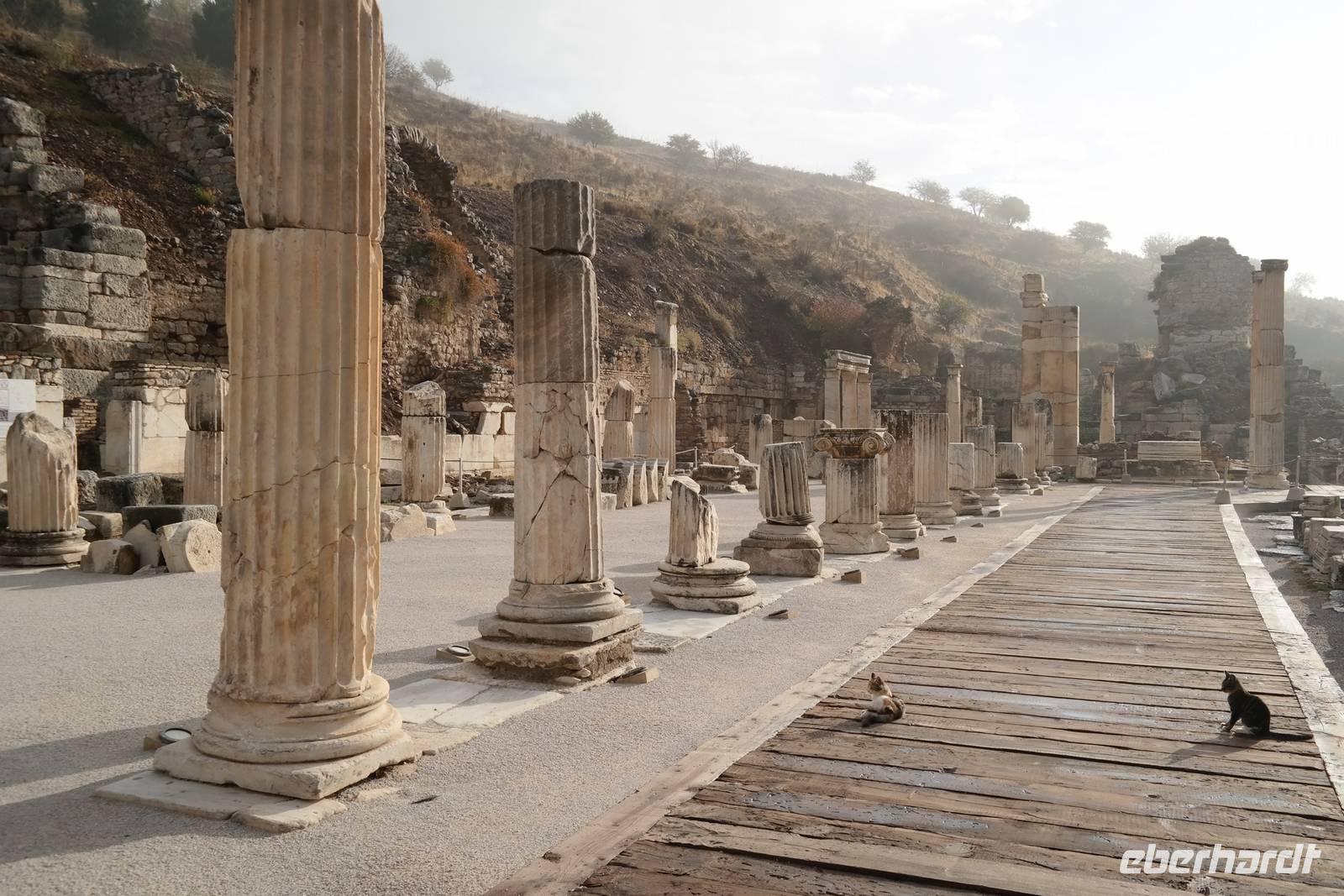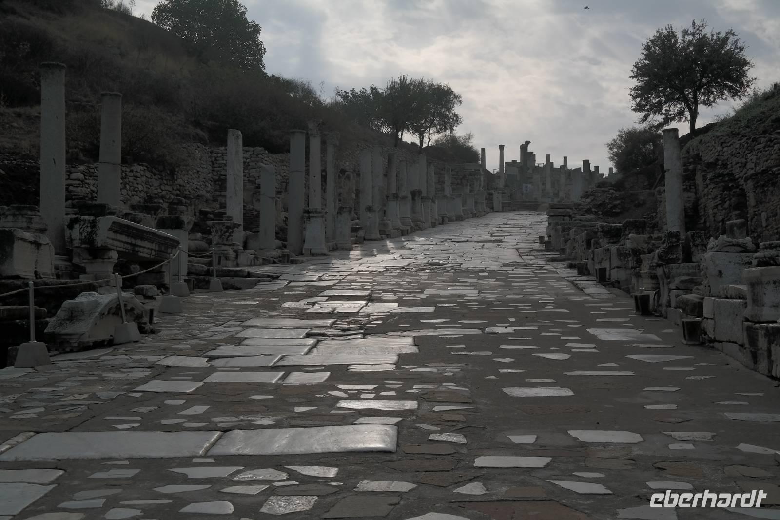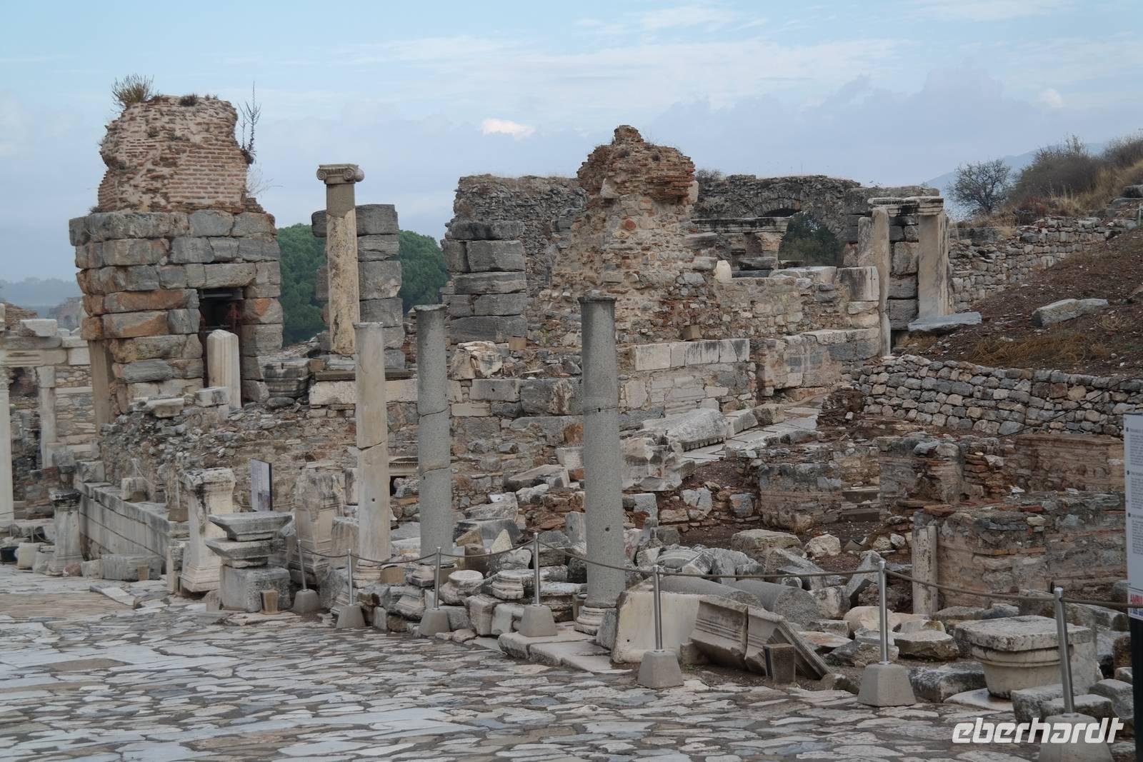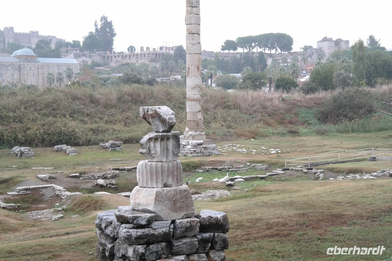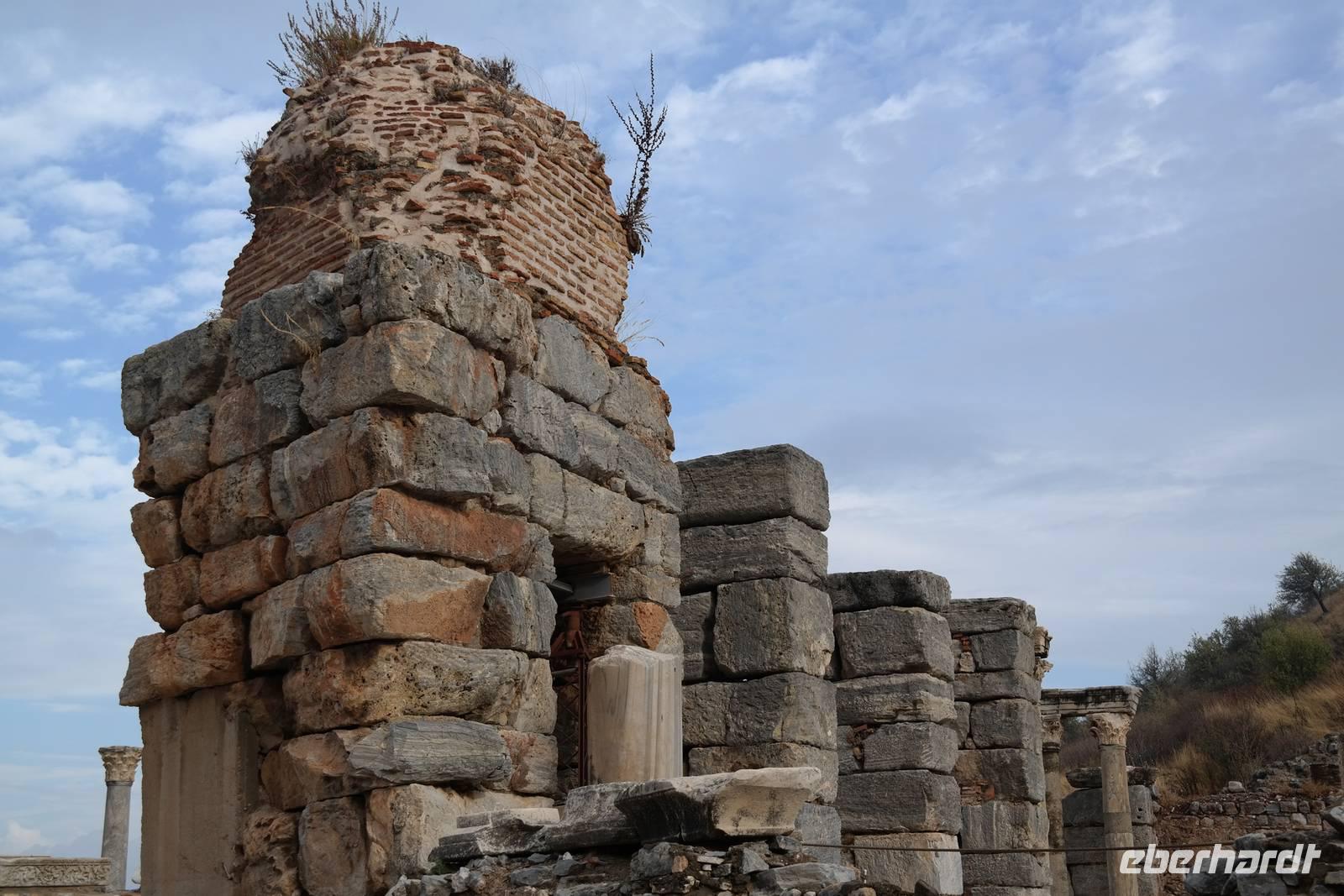 Wo wurde eigentlich das Pergament erfunden? Natürlich in Pergamon! Mit einer hochmodernen Seilbahn erreichten wir die antike Stadt mitten am Berggipfel und bewunderten die Jahrtausende alte Baukunst. Leider regnete es an diesem Tag und wir konnten die wunderbare Aussicht nur mäßig genießen. Nur beim Anblick des extrem steilen Theaters direkt am Berghang wurde uns ein wenig schwindelig. Auch die Heilstadt Asklepion gleich unterhalb von Pergamon beeindruckte uns mit imposanten Säulen und detailliert behauenen Kapitellen. Wir erfuhren, wie schon in der Antike Kranke durch homöopathisch anmutende Verfahren kuriert wurden und wirksame Medikamente und Heilmethoden hier entwickelt und angewendet wurden. Niemals ist in Asklepion jemand gestorben! (Natürlich sind auch Patienten gestorben, doch wenn dies offensichtlich wurde, dann brachte man sie aus der Stadt, um den Tod nicht einzulassen - eigentlich clever!) Nach einem Tag in solch majestätischem Umfeld erreichten wir am Abend Kusadasi, wo wir eincheckten, um am kommenden Tag gleich wieder unsere Reise fortzusetzen.