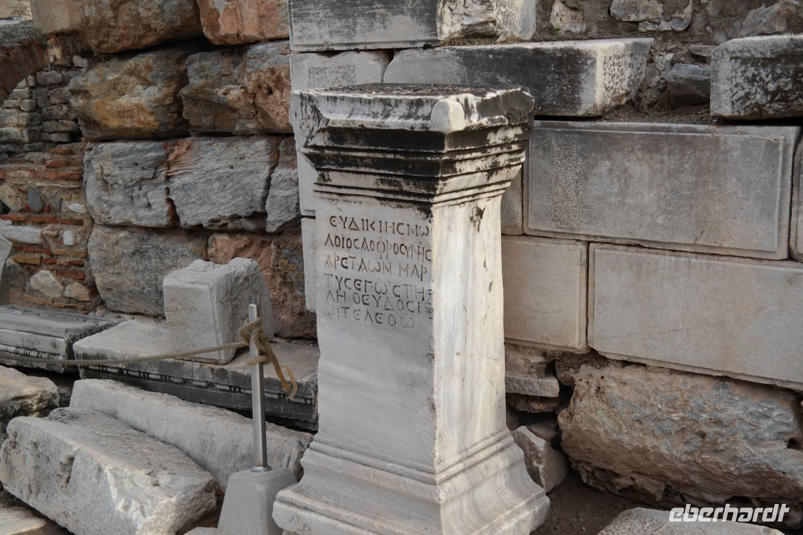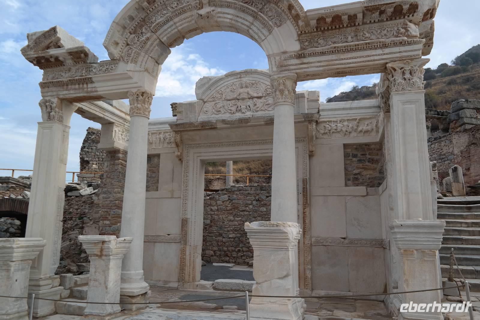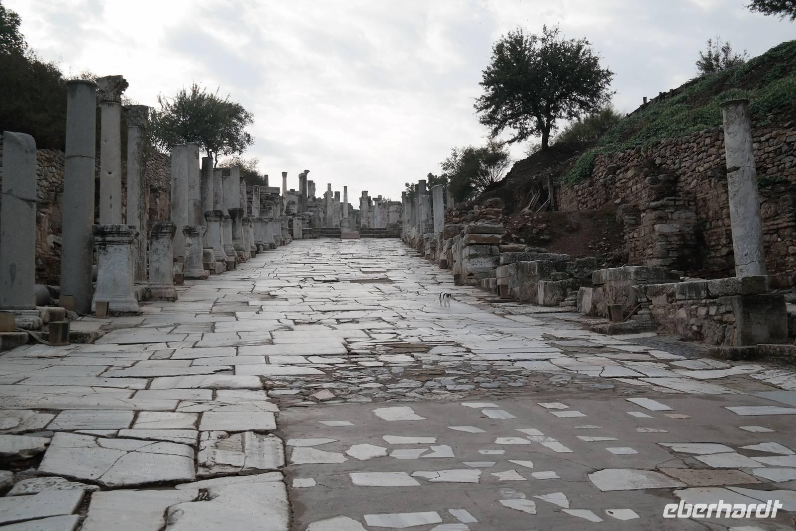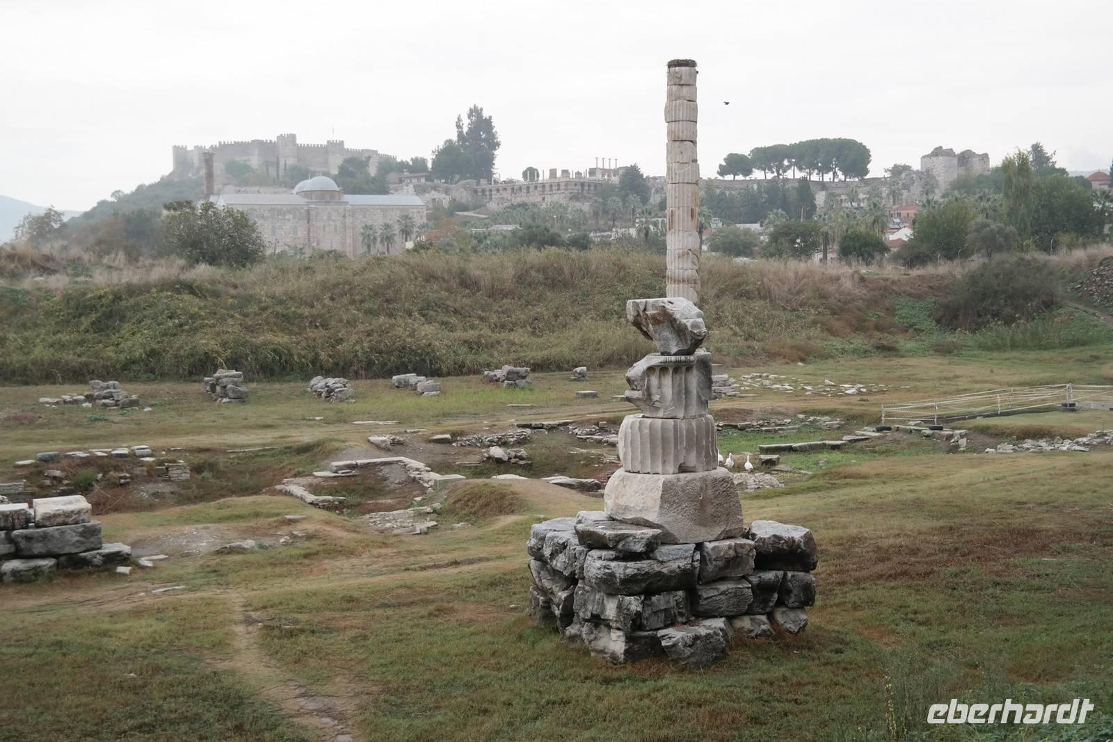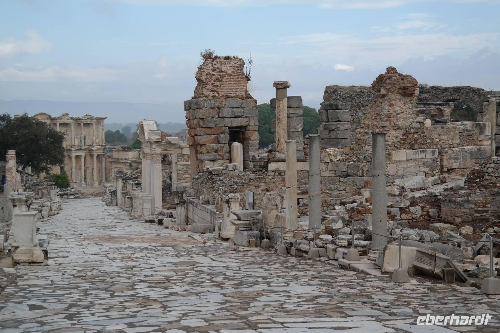 Wo wurde eigentlich das Pergament erfunden? Natürlich in Pergamon! Mit einer hochmodernen Seilbahn erreichten wir die antike Stadt mitten am Berggipfel und bewunderten die Jahrtausende alte Baukunst. Leider regnete es an diesem Tag und wir konnten die wunderbare Aussicht nur mäßig genießen. Nur beim Anblick des extrem steilen Theaters direkt am Berghang wurde uns ein wenig schwindelig. Auch die Heilstadt Asklepion gleich unterhalb von Pergamon beeindruckte uns mit imposanten Säulen und detailliert behauenen Kapitellen. Wir erfuhren, wie schon in der Antike Kranke durch homöopathisch anmutende Verfahren kuriert wurden und wirksame Medikamente und Heilmethoden hier entwickelt und angewendet wurden. Niemals ist in Asklepion jemand gestorben! (Natürlich sind auch Patienten gestorben, doch wenn dies offensichtlich wurde, dann brachte man sie aus der Stadt, um den Tod nicht einzulassen - eigentlich clever!) Nach einem Tag in solch majestätischem Umfeld erreichten wir am Abend Kusadasi, wo wir eincheckten, um am kommenden Tag gleich wieder unsere Reise fortzusetzen.