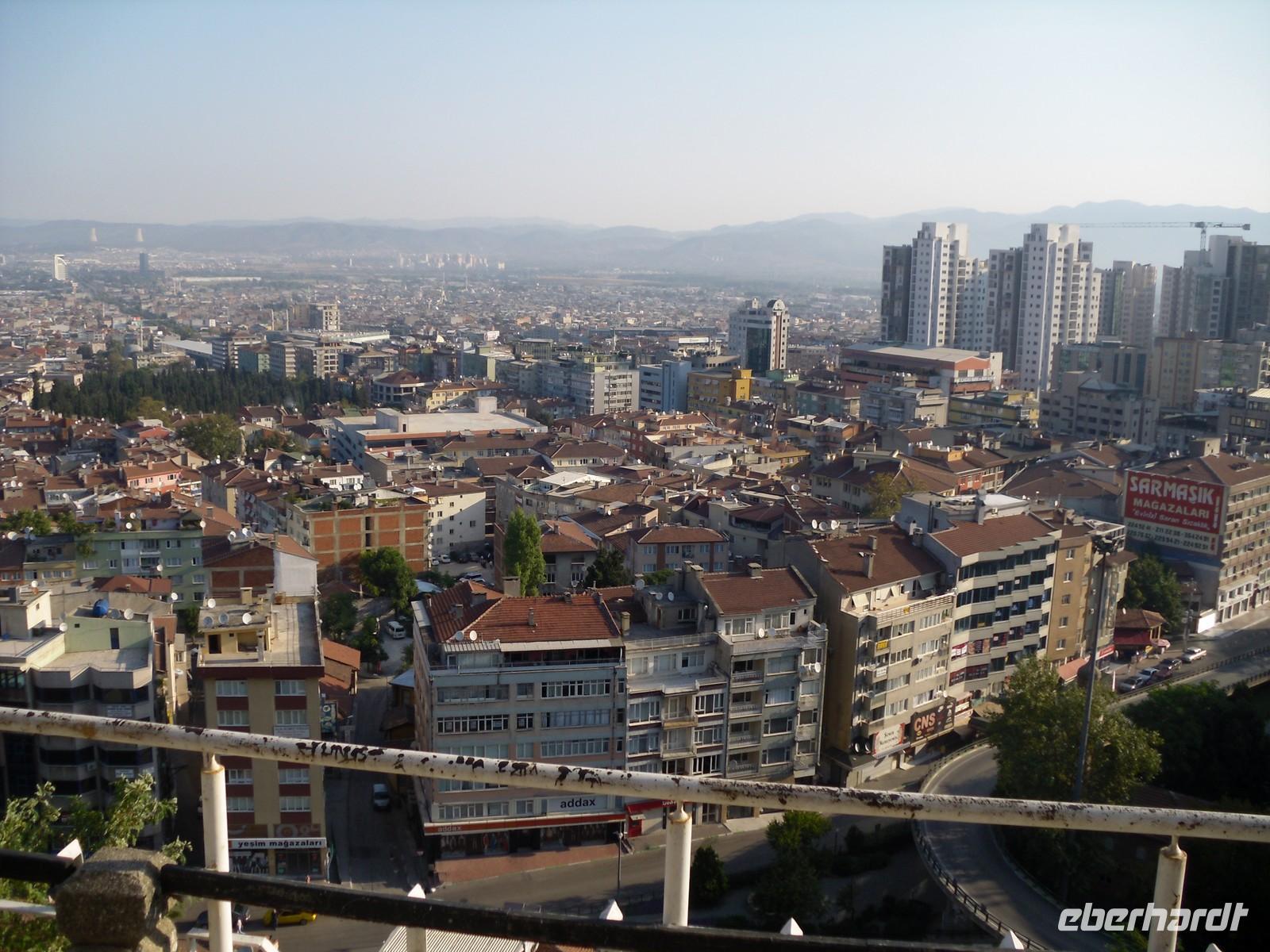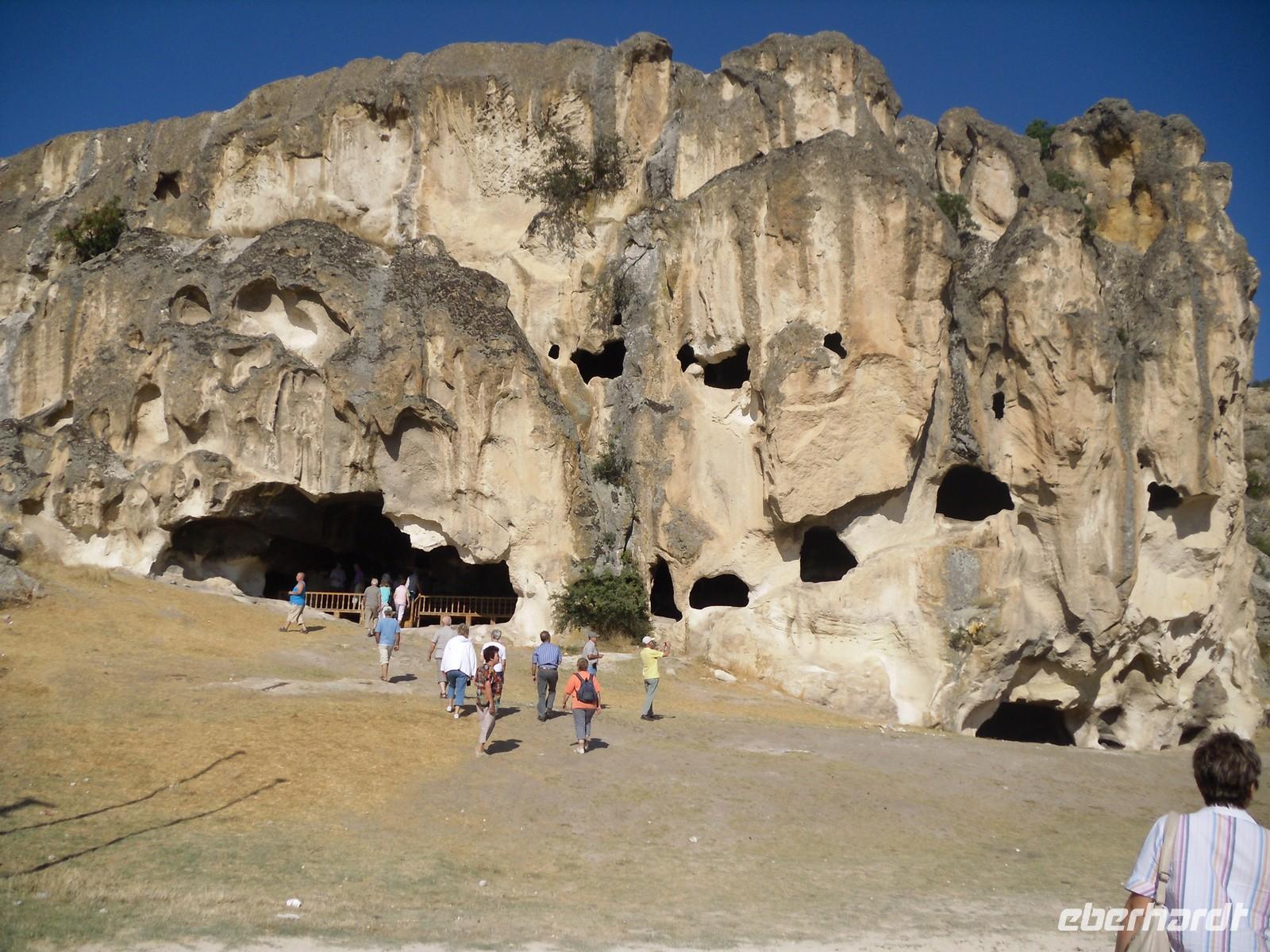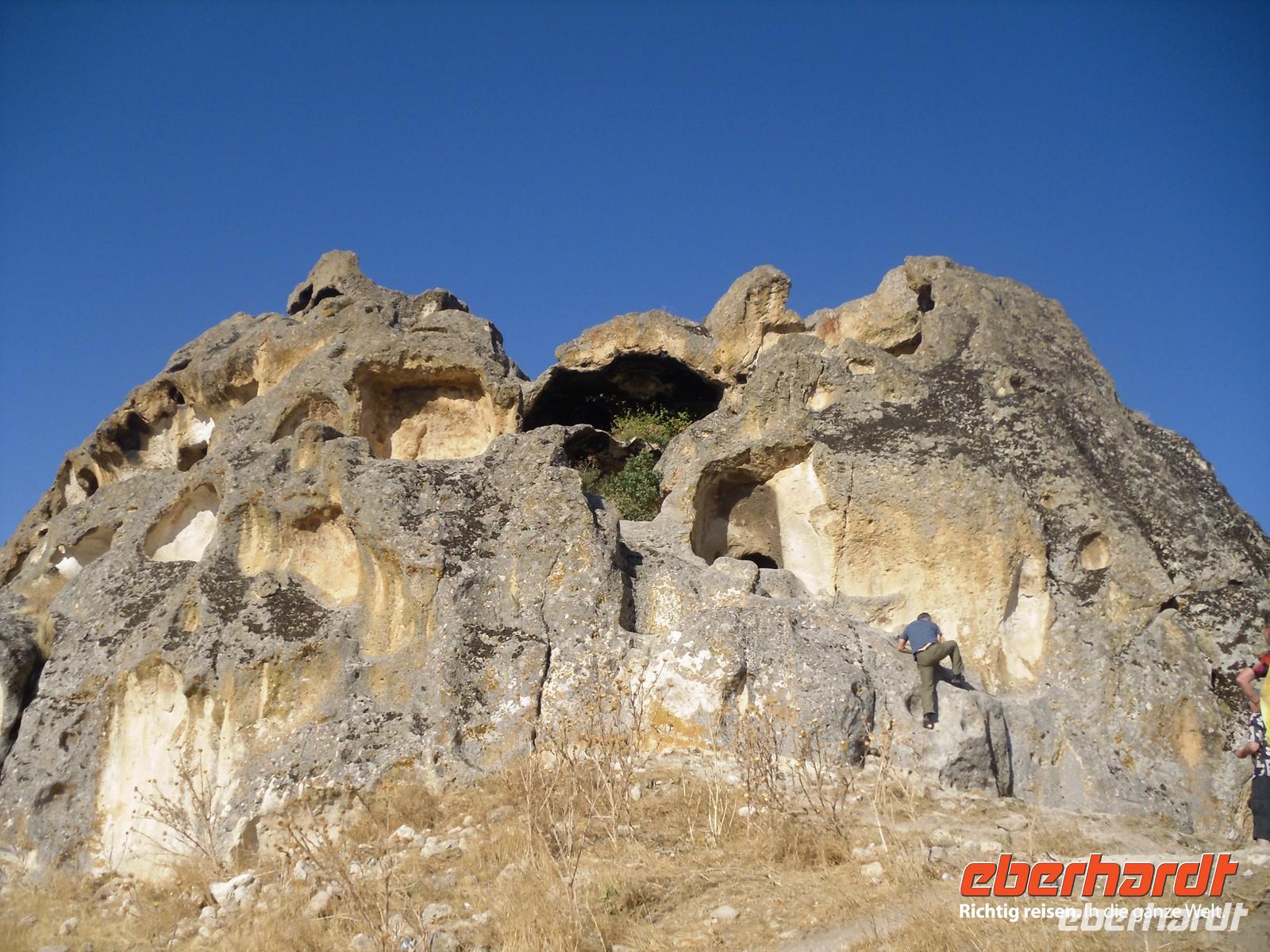 Im Phrygertal angekommen, versprach Kenan uns einen Kaffee für die Gäste die zuerst das Löwenrelief finden würden. Leider wurde nicht der Löwe erkannt, sondern an seiner Stelle ein Pferd. ;) Den Kaffee gab es dennoch für alle und während Süleyman versuchte den Bus wieder zum Laufen zu bringen, suchten wir uns ein schattiges Plätzchen um nicht direkt in der Mittagssonne zu stehen. Nachdem das Busproblem behoben war fuhren wir durch unscheinbare Dörfer zu den Grabkammern Aslantas. Nach einer kurzen Besichtigung fuhren wir weiter zu unserem nächsten Programmpunkt - Seyitgazi. Hoch auf dem Hügel von Seyitgazi thronen das Derwisch-Kloster und die Moschee. Leider sind noch viele Stellen der sehr sehenswerten Anlage im Bau, sodass wir uns nur die Moschee anschauen konnten und den Rest erahnen mussten. Weiter ging unsere Fahrt nach Bursa, wo wir heute im „Kervansaray" übernachten sollten. Doch bevor wir den Abend ausklingen ließen, ging Kenan mit uns in die Große Moschee und besuchte mit uns den Seidenmarkt.
