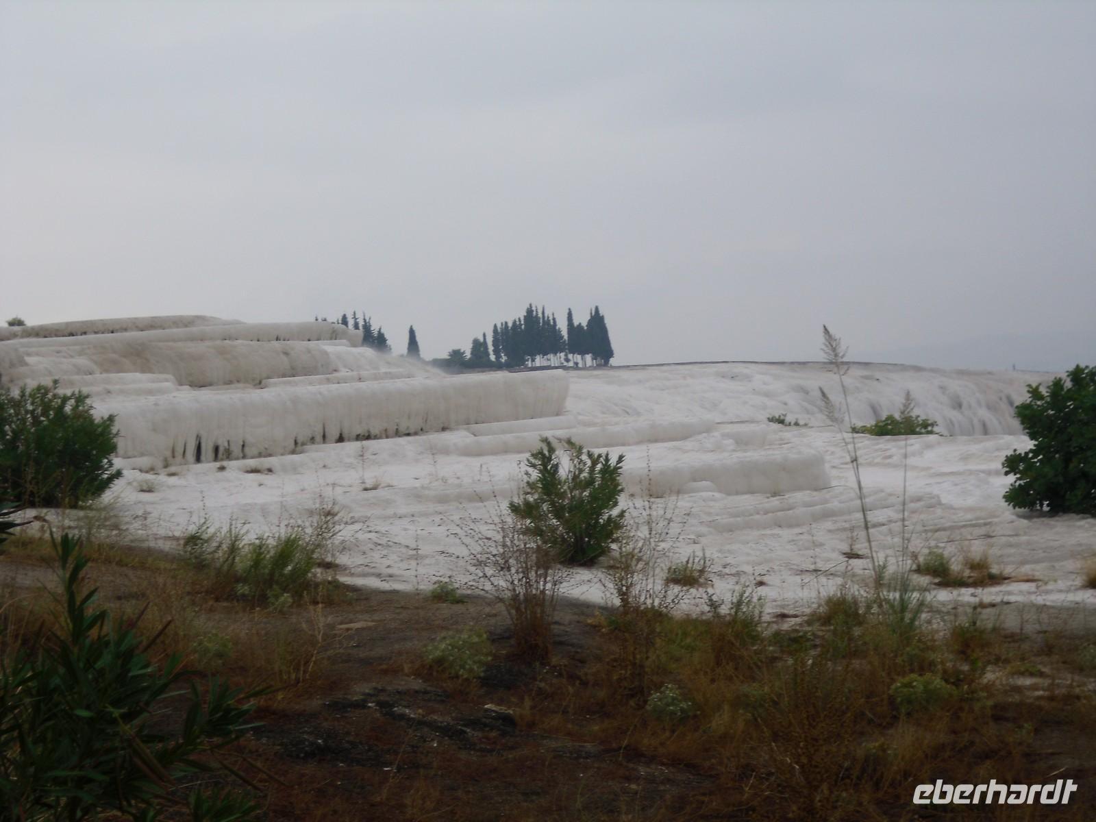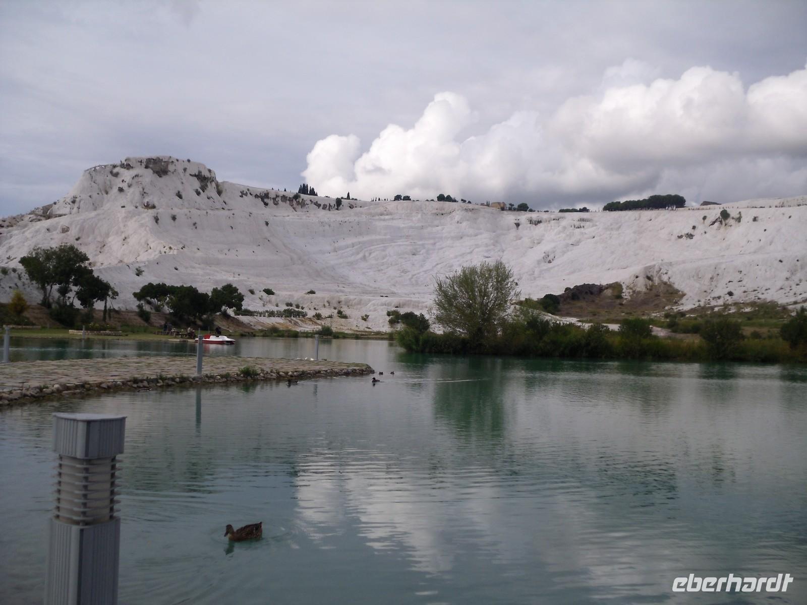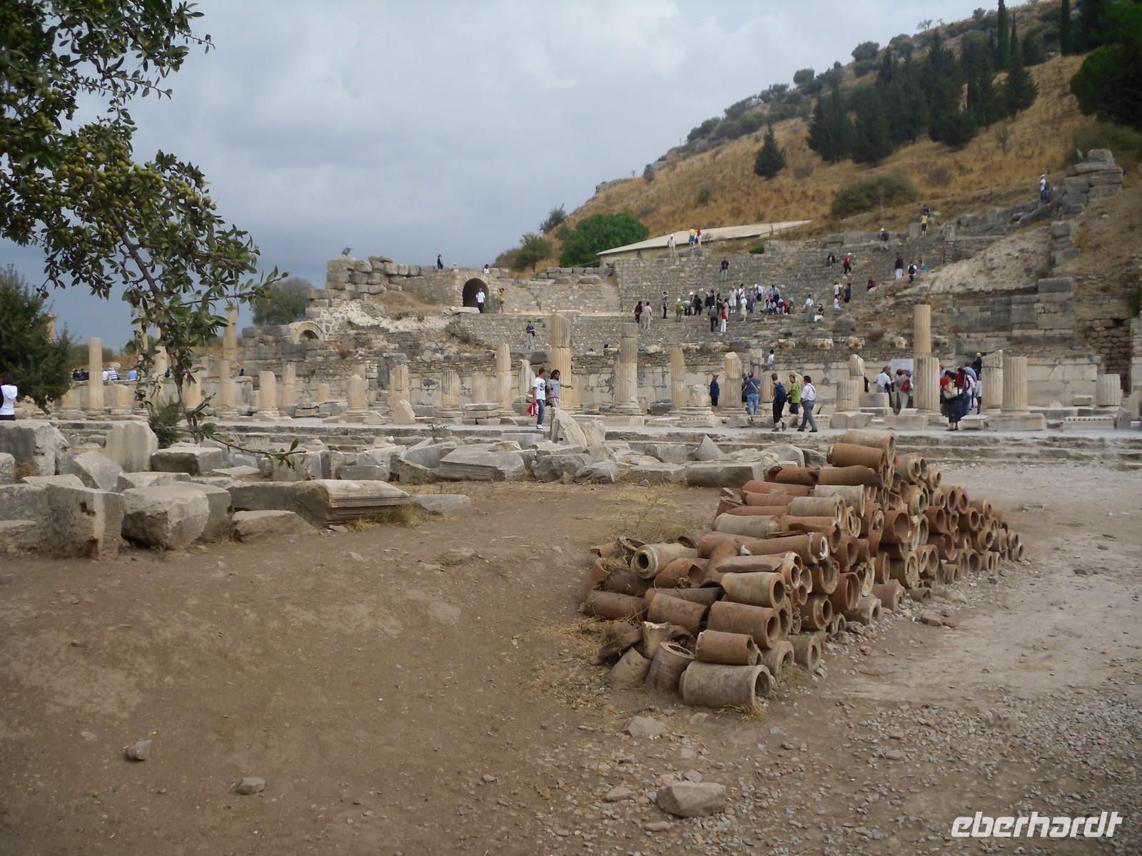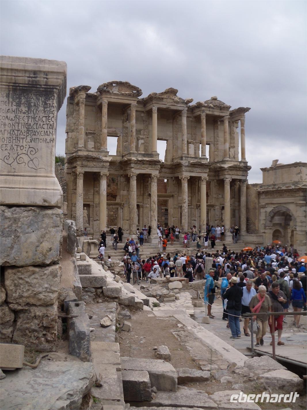 Der Blick zum Himmel versprach uns heute nichts Gutes. In Ephesus angekommen donnerte es schon, dennoch setzten wir unseren fort und hofften, dass wir nicht nass werden würden. Mit rund 200.000 Einwohnern ist Ephesus die Metropole des Römischen Reiches. Dies lässt sich auch noch heute erahnen, denn die weit ausgebauten Wege und das riesige Amphitheater lassen darauf schließen, dass hier das Stadtgewimmel tobte. Bevor wir am Hotel ankamen, machten wir einen kurzen Fotostopp in Pamukkale.
