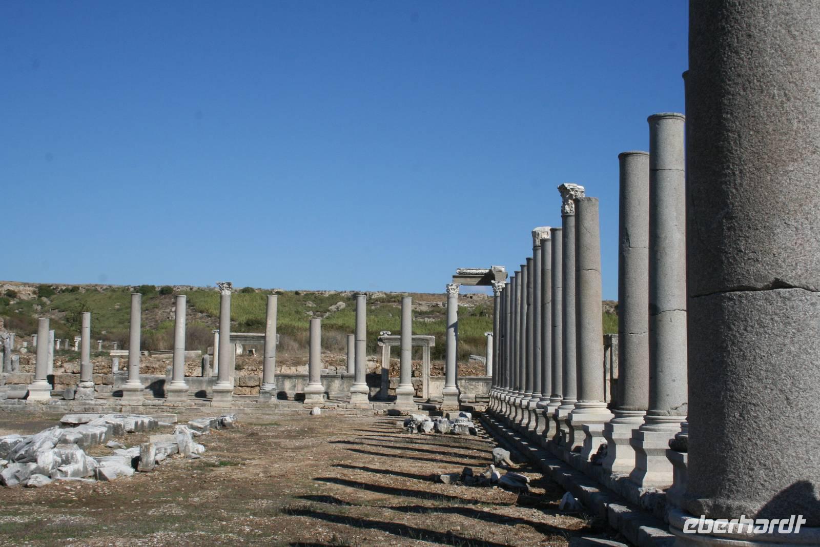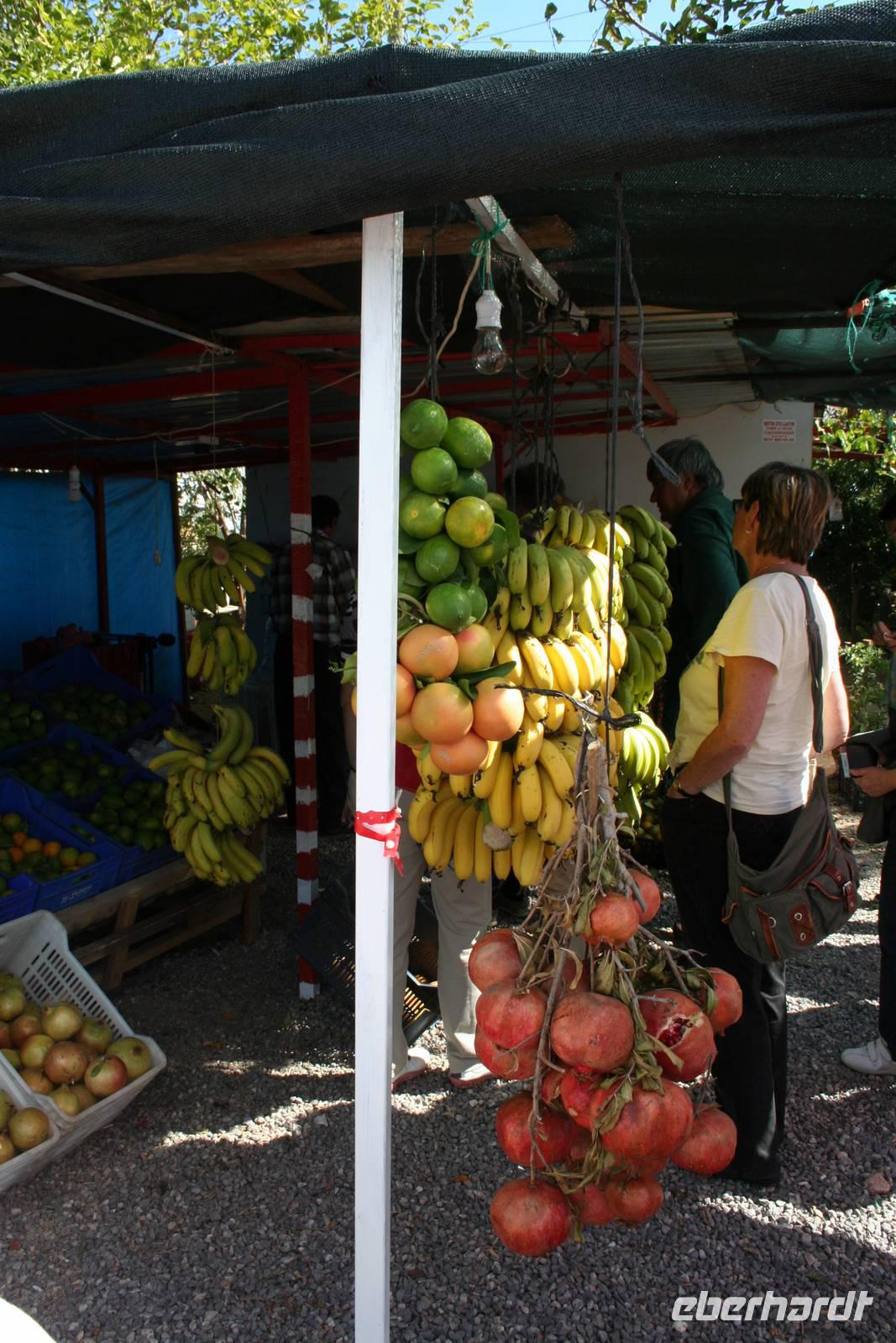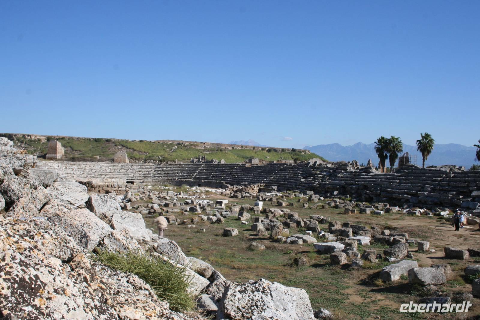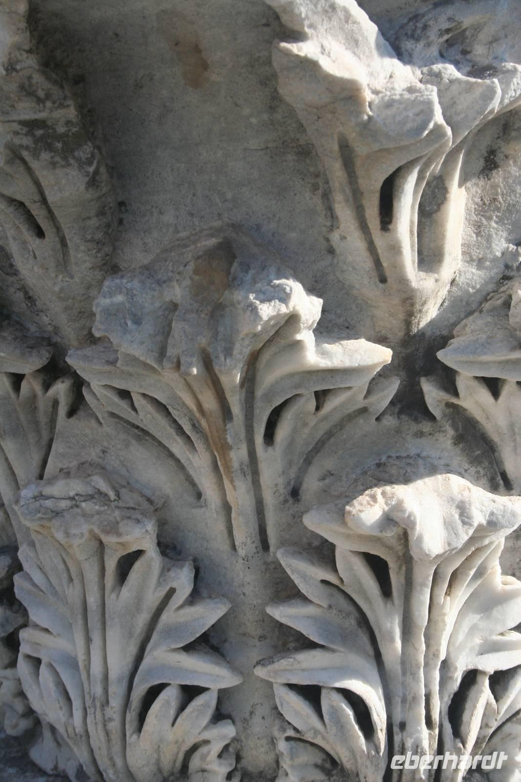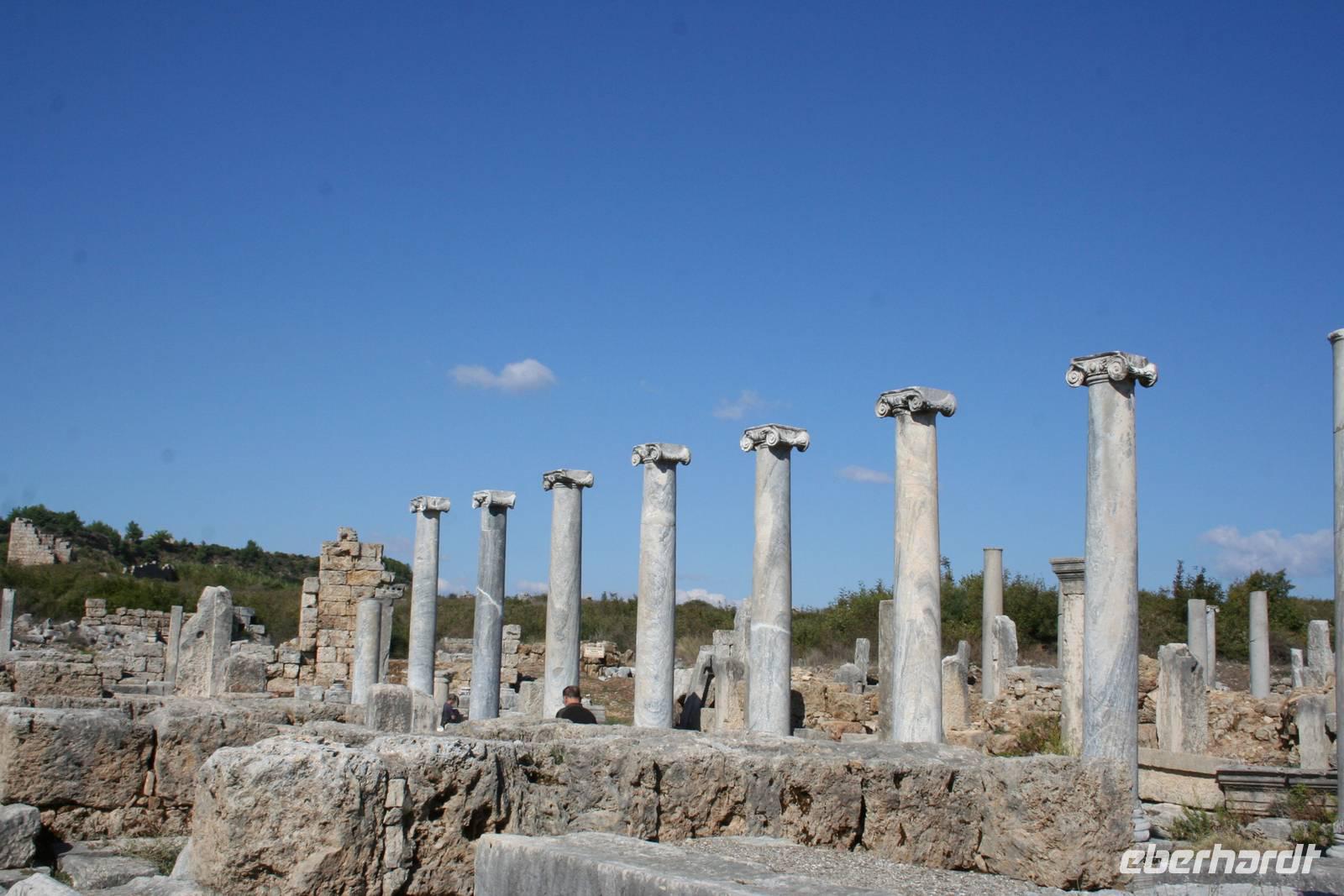 Gemütlich starteten wir heute zu unserer eigentlichen Rundreise. Zuerst versammelten wir uns im Panoramarestaurant des Hotels, wo Serdar uns genau beschrieb, was uns Tag für Tag auf unserer Rundreise durch sein Heimatland erwarten würde. Bei strahlendem Sonnenschein stiegen wir dann gegen 9.00 Uhr in den praktischen kleinen Bus und erkundeten kurz darauf das Zentrum von Antalya, wo wir auch unser Geld in türkische Lira tauschen konnten. Nach etwas Freizeit in der Sonne brachen wir schließlich auf zu unserer ersten antiken Stadtbesichtigung - nach Perge. Dort angekommen durchquerten wir zuerst die altrömische Arena und verbrachten dann einen Teil des Vormittags zwischen den weißen Säulen und Marmorblöcken der gewaltigen Ausgrabungsstätte, die frei zugänglich waren. Während der Busfahrten lieferte uns Serdar immer wieder umfassende Informationen zu Geschichte, Traditionen und regionalen Eigenheiten unseres jeweiligen Aufenthaltsortes. Wir machten Halt an einem kleinen Obststand auf dem Land, wo es frische Bananen, Mandarinen und Granatäpfel zu kaufen gab, deren Geschmack sich mit unserer Supermarktware nicht vergleichen ließ! Zum Mittag gab es für die meisten von uns Pide oder Kebab, typische türkische Gerichte. Bei der Durchquerung der anatolischen Hochebene konnten wir die Temperaturunterschiede zur südlichen Küste hautnah kennenlernen, denn es war selbst verglichen mit Deutschland trotz Sonne ziemlich frisch. Am Abend erreichten wir unser Hotel mitten im Stadtzentrum von Afyon, wo es trotz Wochenende überall geöffnete Geschäfte mit Wurst-, Käse- oder Zuckerspezialitäten gab. Eine fröhliche Hochzeitsfeier im Hotel gab uns einen Einblick in die nationale Heiratskultur und wir gingen gut gesättigt und neugierig auf den nächsten Tag ins Bett.