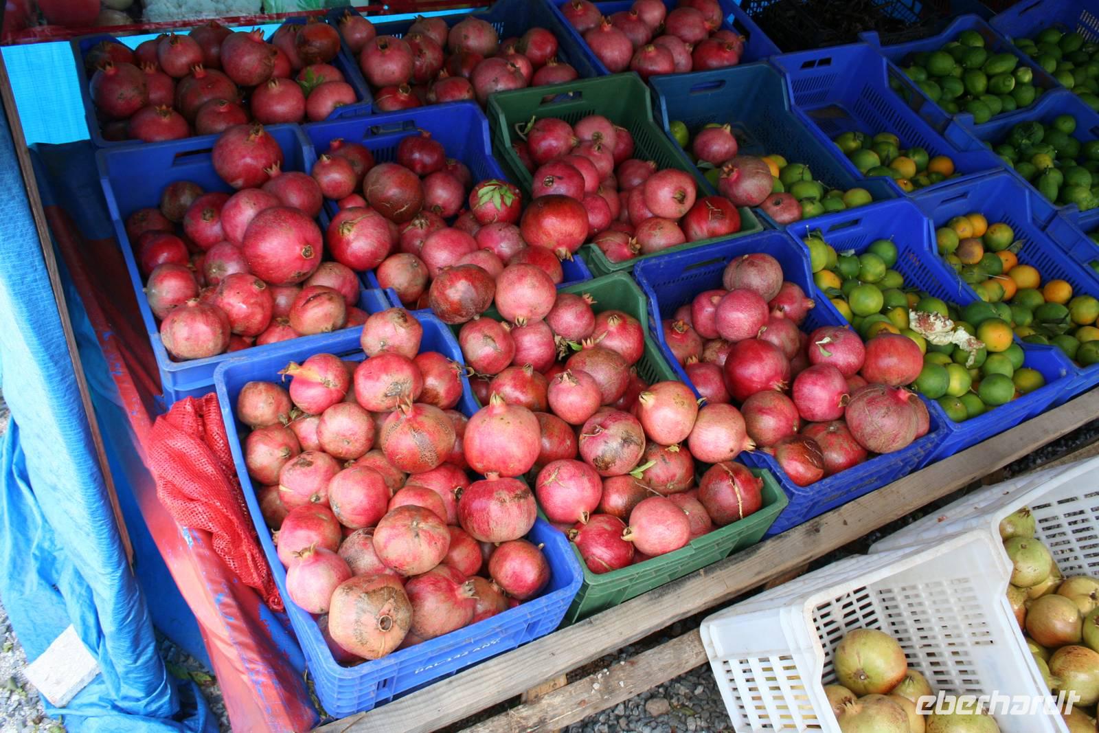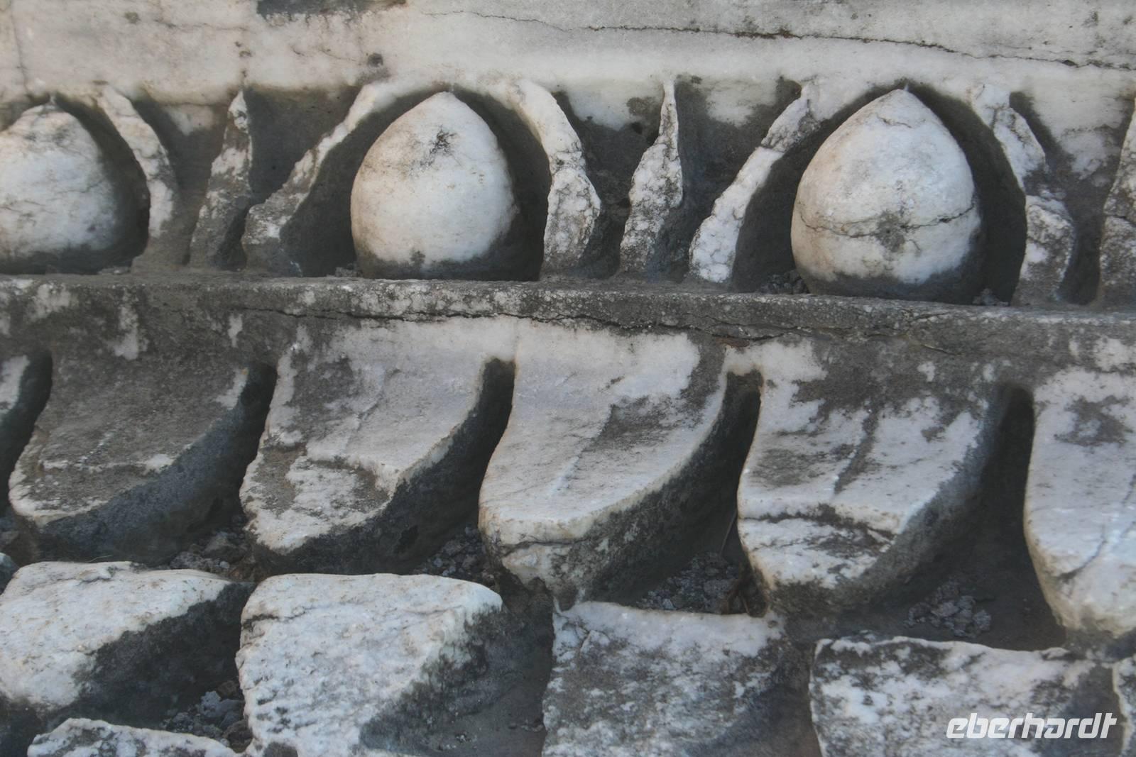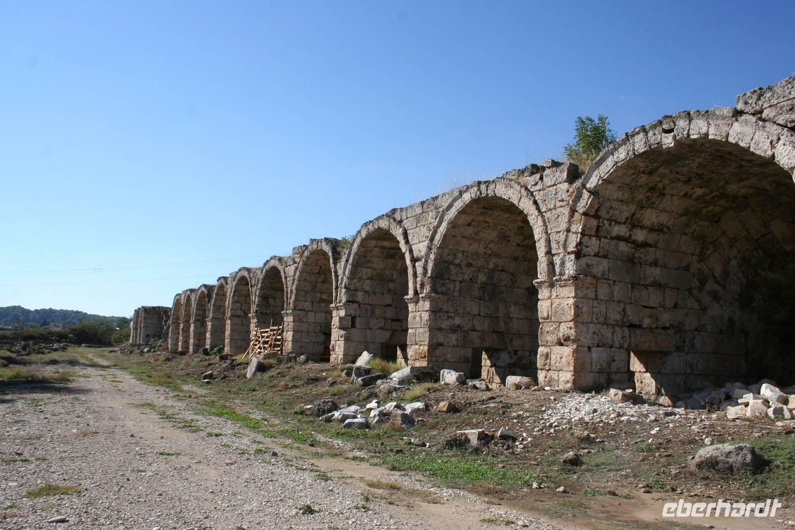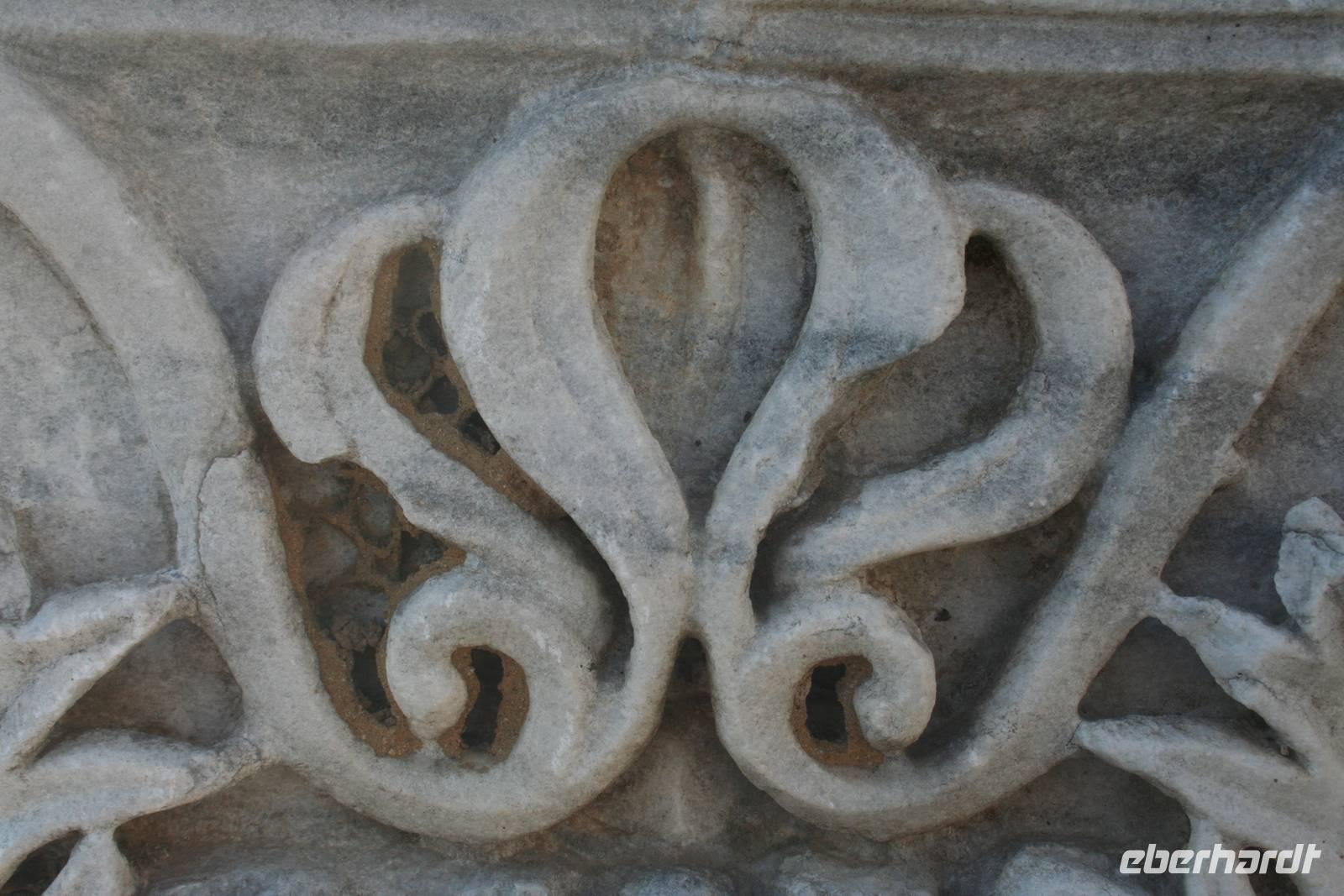 Gemütlich starteten wir heute zu unserer eigentlichen Rundreise. Zuerst versammelten wir uns im Panoramarestaurant des Hotels, wo Serdar uns genau beschrieb, was uns Tag für Tag auf unserer Rundreise durch sein Heimatland erwarten würde. Bei strahlendem Sonnenschein stiegen wir dann gegen 9.00 Uhr in den praktischen kleinen Bus und erkundeten kurz darauf das Zentrum von Antalya, wo wir auch unser Geld in türkische Lira tauschen konnten. Nach etwas Freizeit in der Sonne brachen wir schließlich auf zu unserer ersten antiken Stadtbesichtigung - nach Perge. Dort angekommen durchquerten wir zuerst die altrömische Arena und verbrachten dann einen Teil des Vormittags zwischen den weißen Säulen und Marmorblöcken der gewaltigen Ausgrabungsstätte, die frei zugänglich waren. Während der Busfahrten lieferte uns Serdar immer wieder umfassende Informationen zu Geschichte, Traditionen und regionalen Eigenheiten unseres jeweiligen Aufenthaltsortes. Wir machten Halt an einem kleinen Obststand auf dem Land, wo es frische Bananen, Mandarinen und Granatäpfel zu kaufen gab, deren Geschmack sich mit unserer Supermarktware nicht vergleichen ließ! Zum Mittag gab es für die meisten von uns Pide oder Kebab, typische türkische Gerichte. Bei der Durchquerung der anatolischen Hochebene konnten wir die Temperaturunterschiede zur südlichen Küste hautnah kennenlernen, denn es war selbst verglichen mit Deutschland trotz Sonne ziemlich frisch. Am Abend erreichten wir unser Hotel mitten im Stadtzentrum von Afyon, wo es trotz Wochenende überall geöffnete Geschäfte mit Wurst-, Käse- oder Zuckerspezialitäten gab. Eine fröhliche Hochzeitsfeier im Hotel gab uns einen Einblick in die nationale Heiratskultur und wir gingen gut gesättigt und neugierig auf den nächsten Tag ins Bett.