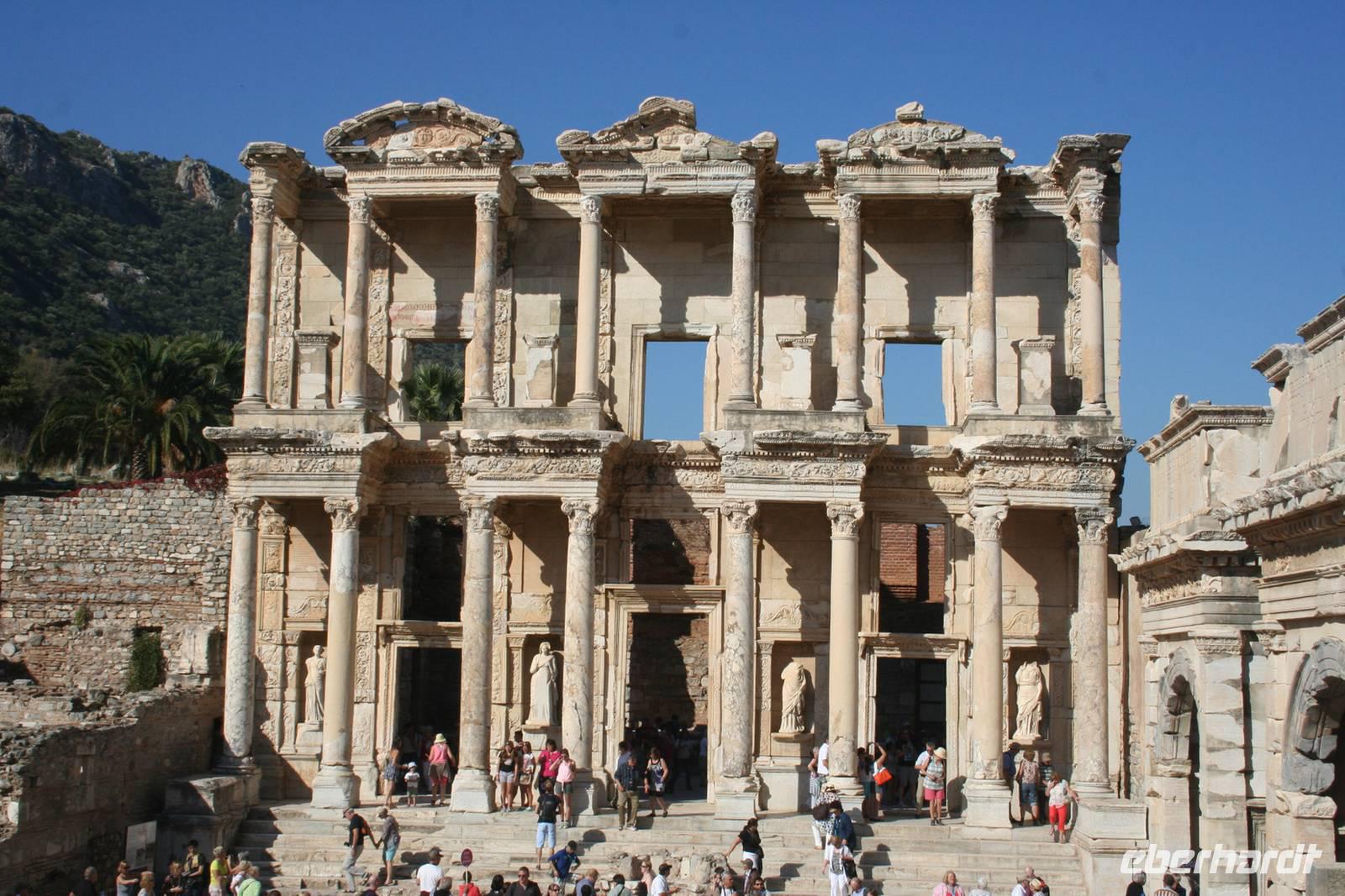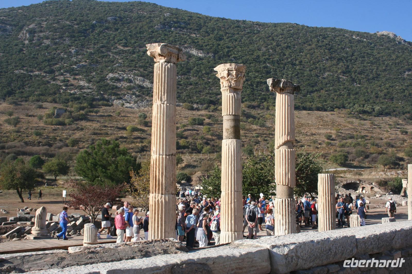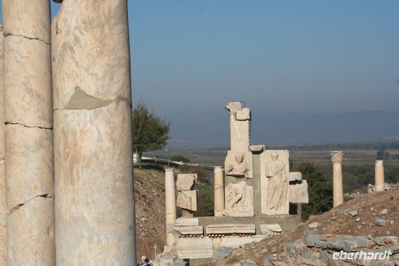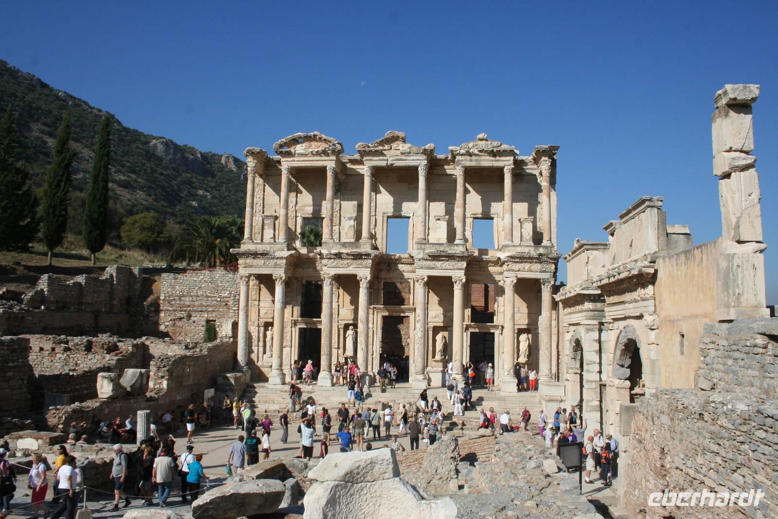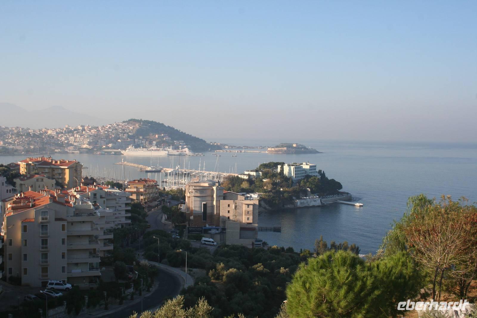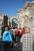 Wo wurde eigentlich das Pergament erfunden? Natürlich in Pergamon! Mit einer hochmodernen Seilbahn erreichten wir die antike Stadt mitten am Berggipfel und bewunderten die Jahrtausende alte Baukunst. Bei wieder einmal grandiosem Weter schauten wir hinab auf die umliegenden Täler und schossen tolle Fotos. Nur beim Anblich des extrem steilen Theaters direkt am Berghang wurde uns ein wenig schwindelig. Auch die Heilstadt Asklepion gleich unterhalb von Pergamon beeindruckte uns mit imposanten Säulen und detailliert behauenen Kapitellen. Wir erfuhren, wie schon in der Antike Kranke durch homöopathisch anmutende Verfahren kuriert wurden und wirksame Medikamente und Heilmethoden hier entwickelt und angewendet wurden. Niemals ist in Asklepion jemand gestorben! (Natürlich sind auch Patienten gestorben, doch wenn dies offensichtlich wurde, dann brachte man sie aus der Stadt, um den Tod nicht einzulassen - eigentlich clever!) Nach einem Tag in solch majestätischem Umfeld erreichten wir am Abend Kusadasi, wo wir eincheckten, um am kommenden Tag gleich wieder unsere Reise fortzusetze.