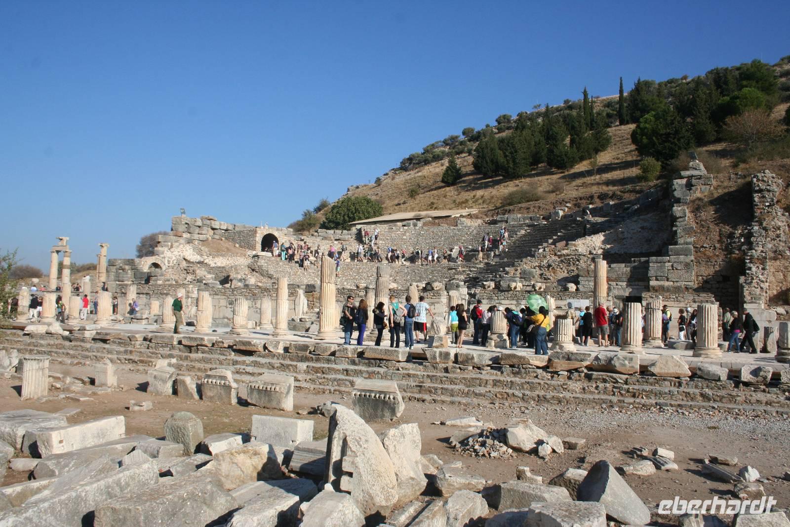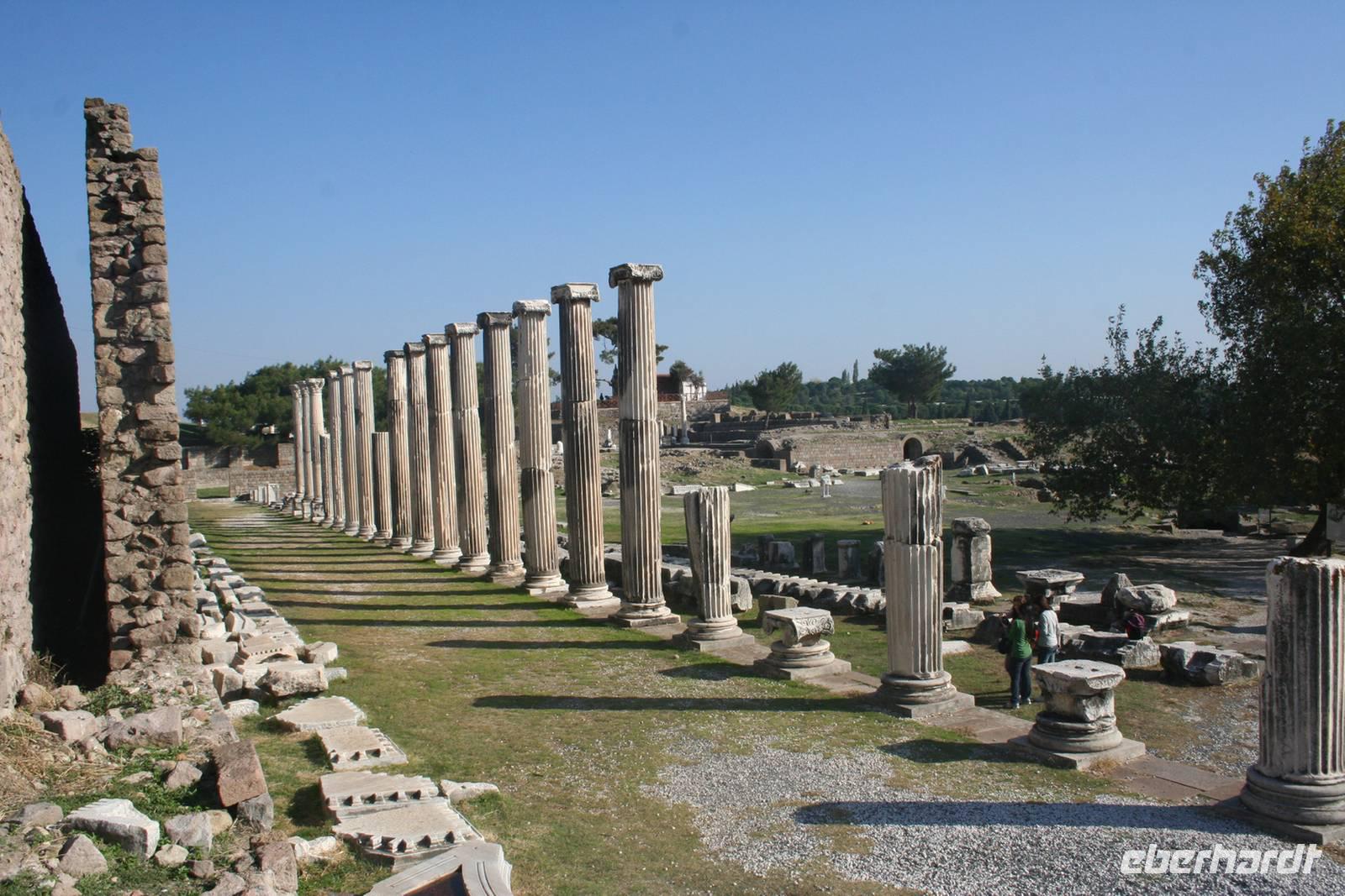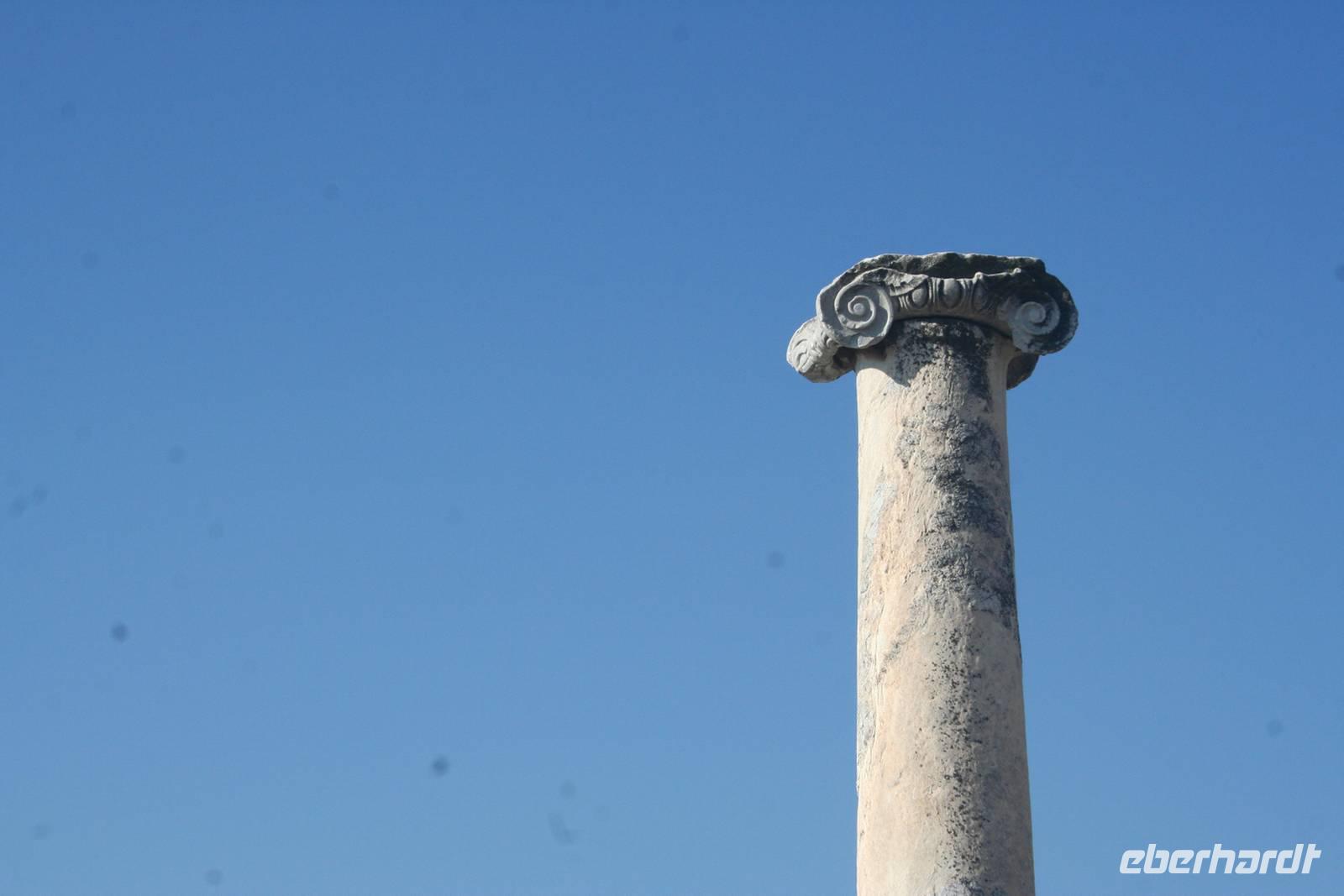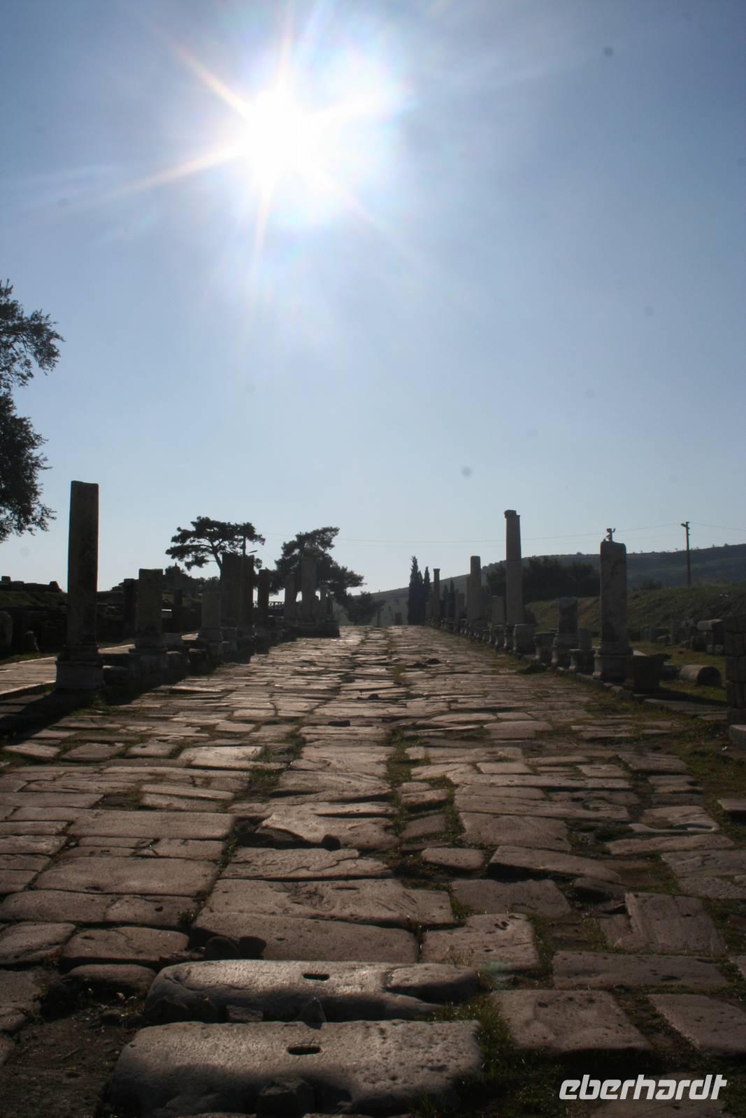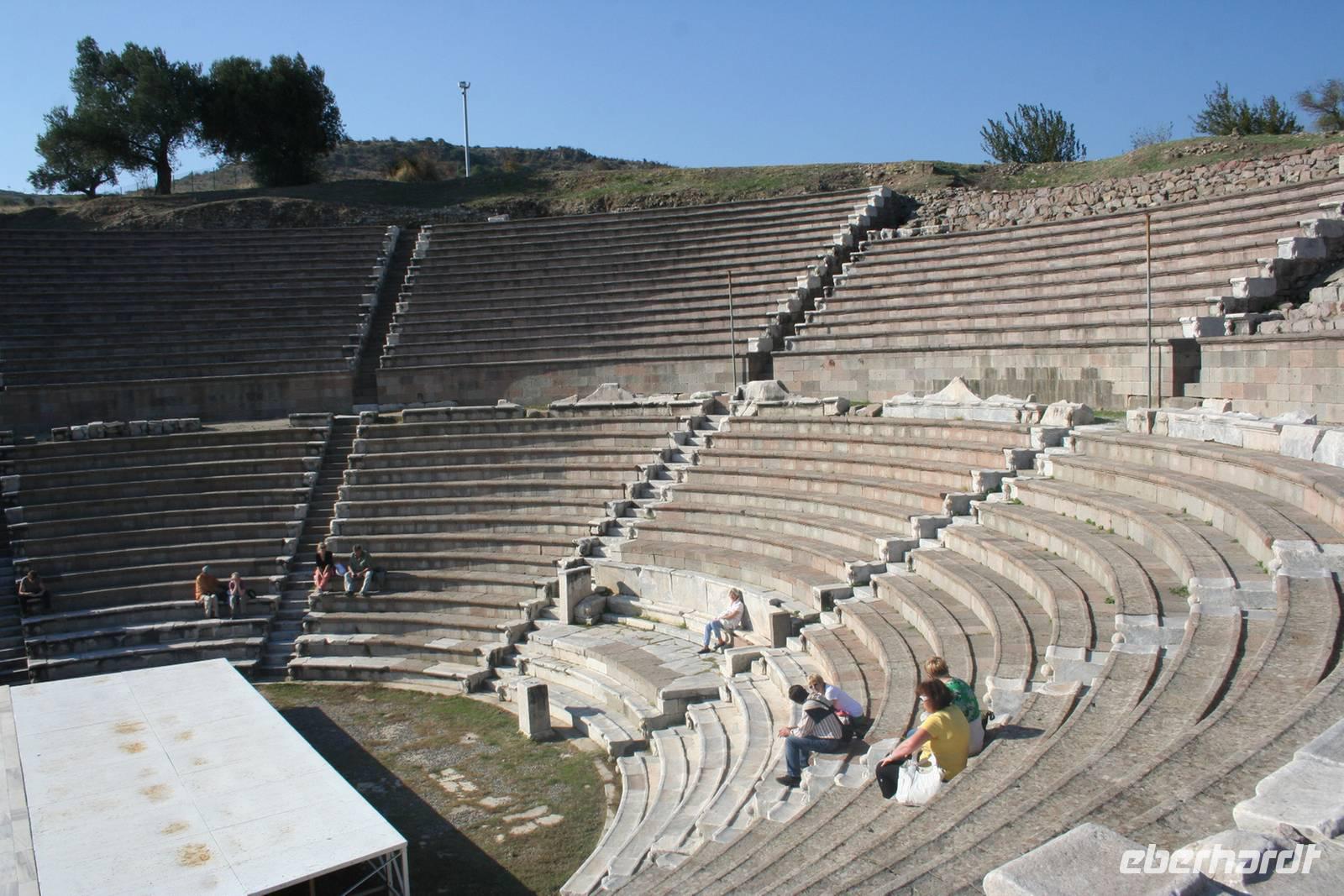 Wo wurde eigentlich das Pergament erfunden? Natürlich in Pergamon! Mit einer hochmodernen Seilbahn erreichten wir die antike Stadt mitten am Berggipfel und bewunderten die Jahrtausende alte Baukunst. Bei wieder einmal grandiosem Weter schauten wir hinab auf die umliegenden Täler und schossen tolle Fotos. Nur beim Anblich des extrem steilen Theaters direkt am Berghang wurde uns ein wenig schwindelig. Auch die Heilstadt Asklepion gleich unterhalb von Pergamon beeindruckte uns mit imposanten Säulen und detailliert behauenen Kapitellen. Wir erfuhren, wie schon in der Antike Kranke durch homöopathisch anmutende Verfahren kuriert wurden und wirksame Medikamente und Heilmethoden hier entwickelt und angewendet wurden. Niemals ist in Asklepion jemand gestorben! (Natürlich sind auch Patienten gestorben, doch wenn dies offensichtlich wurde, dann brachte man sie aus der Stadt, um den Tod nicht einzulassen - eigentlich clever!) Nach einem Tag in solch majestätischem Umfeld erreichten wir am Abend Kusadasi, wo wir eincheckten, um am kommenden Tag gleich wieder unsere Reise fortzusetze.