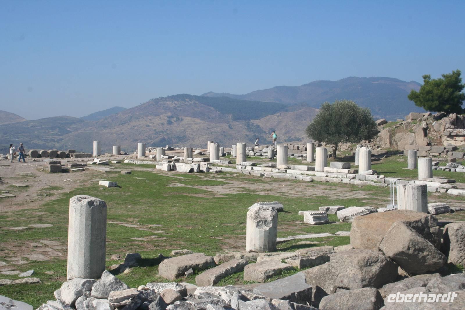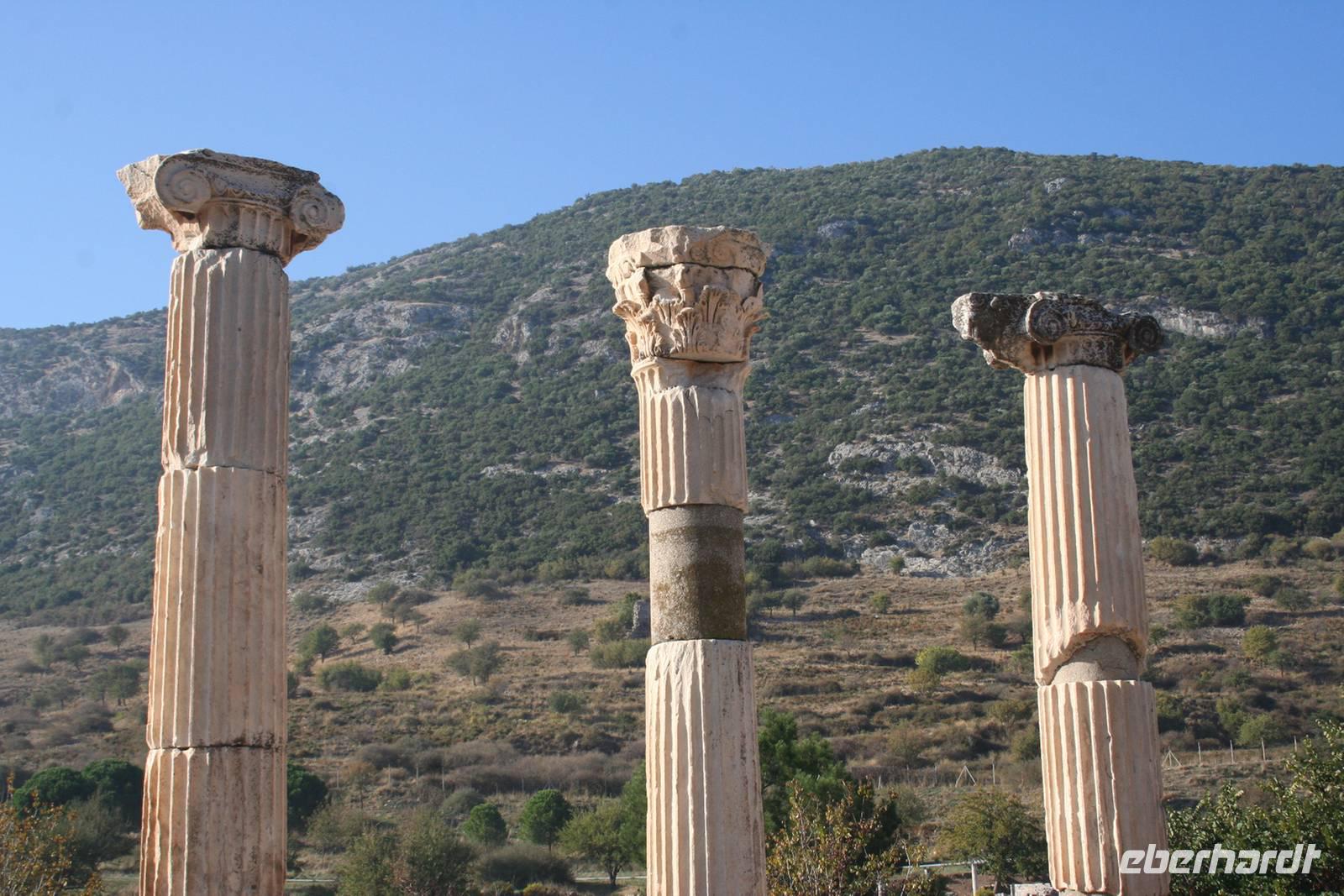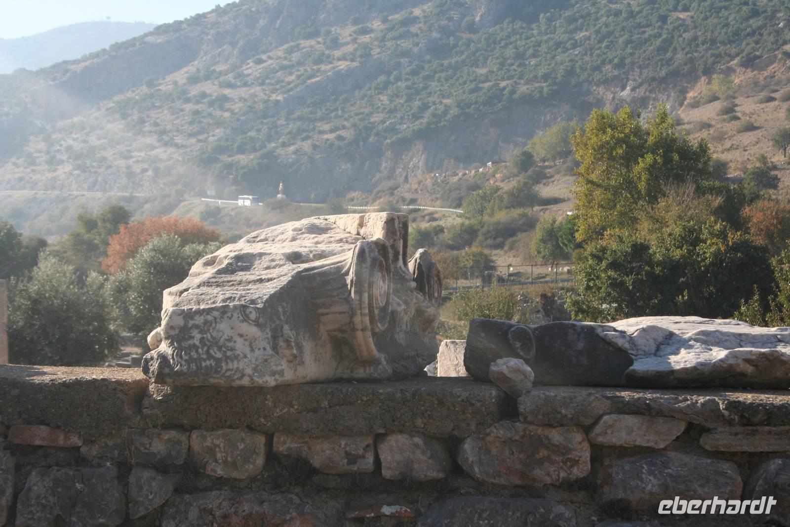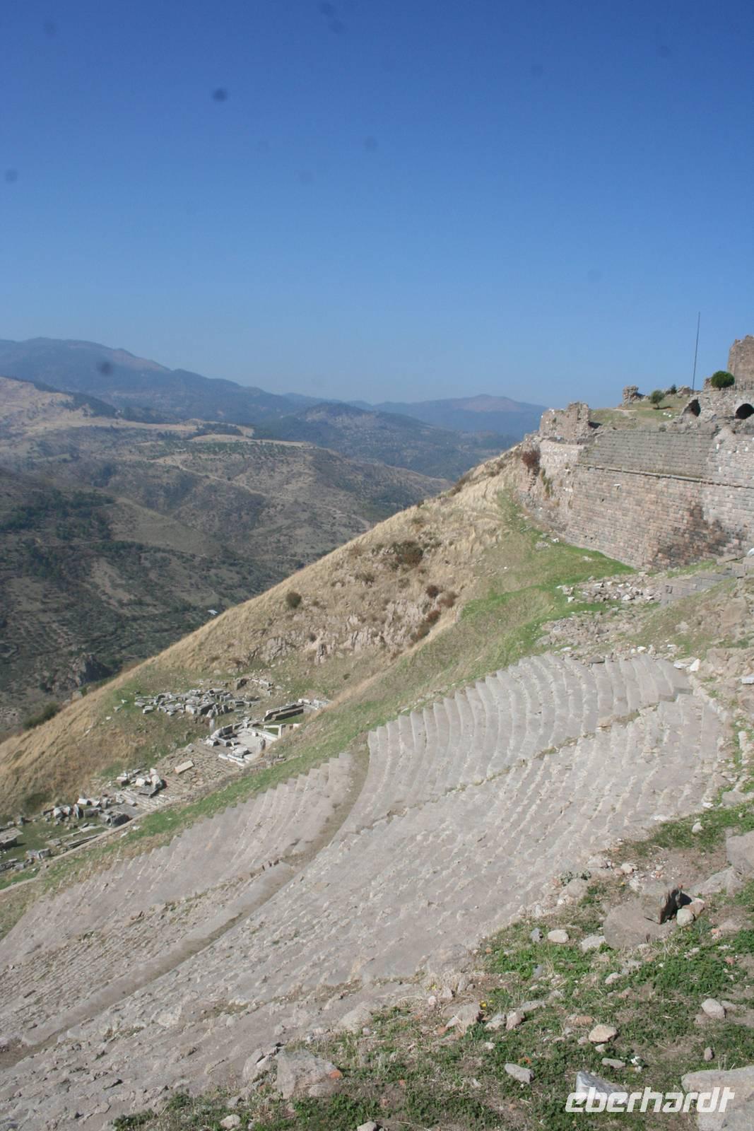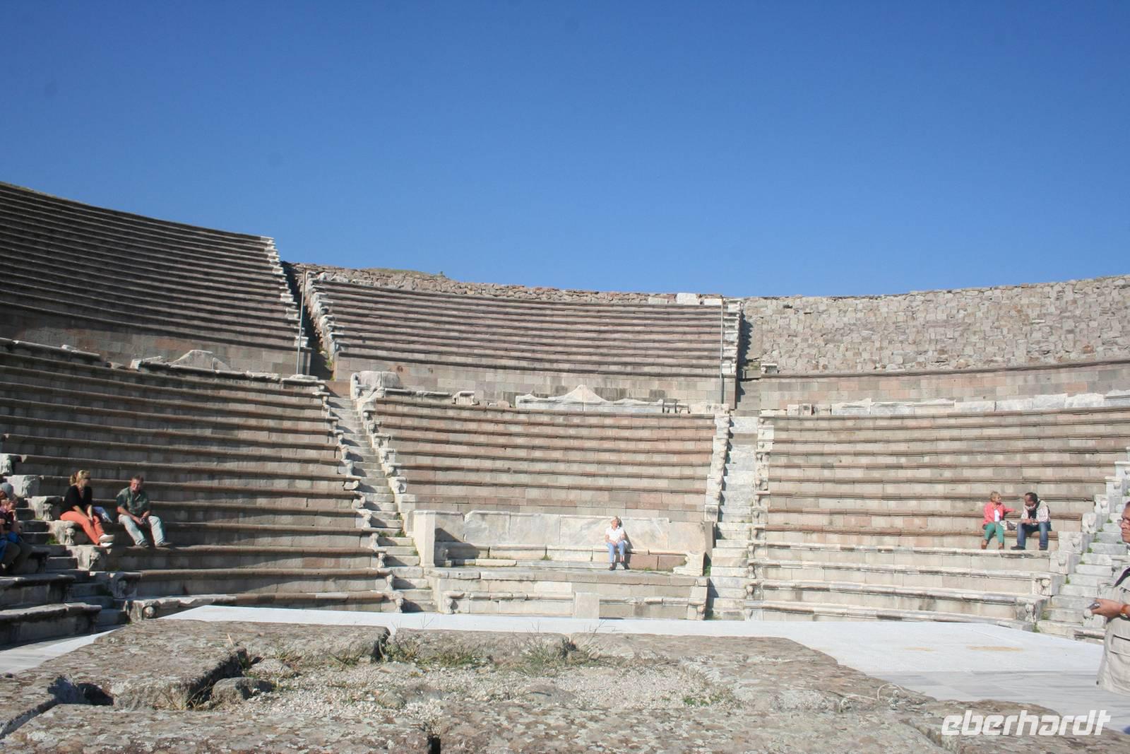 Wo wurde eigentlich das Pergament erfunden? Natürlich in Pergamon! Mit einer hochmodernen Seilbahn erreichten wir die antike Stadt mitten am Berggipfel und bewunderten die Jahrtausende alte Baukunst. Bei wieder einmal grandiosem Weter schauten wir hinab auf die umliegenden Täler und schossen tolle Fotos. Nur beim Anblich des extrem steilen Theaters direkt am Berghang wurde uns ein wenig schwindelig. Auch die Heilstadt Asklepion gleich unterhalb von Pergamon beeindruckte uns mit imposanten Säulen und detailliert behauenen Kapitellen. Wir erfuhren, wie schon in der Antike Kranke durch homöopathisch anmutende Verfahren kuriert wurden und wirksame Medikamente und Heilmethoden hier entwickelt und angewendet wurden. Niemals ist in Asklepion jemand gestorben! (Natürlich sind auch Patienten gestorben, doch wenn dies offensichtlich wurde, dann brachte man sie aus der Stadt, um den Tod nicht einzulassen - eigentlich clever!) Nach einem Tag in solch majestätischem Umfeld erreichten wir am Abend Kusadasi, wo wir eincheckten, um am kommenden Tag gleich wieder unsere Reise fortzusetze.