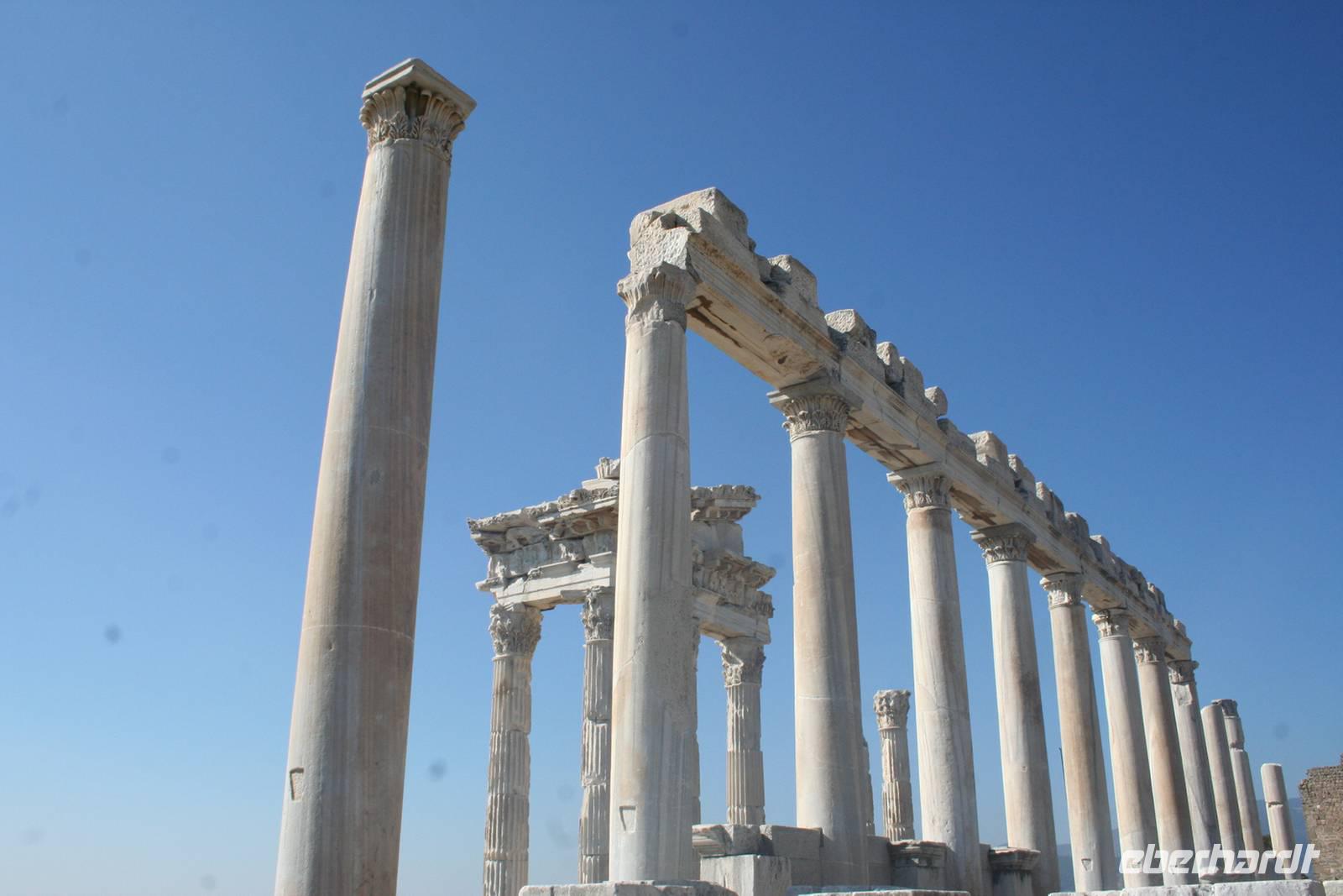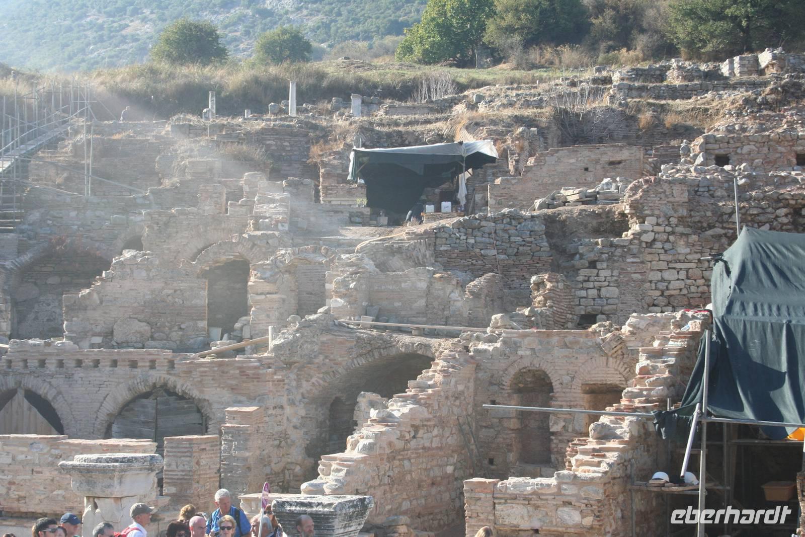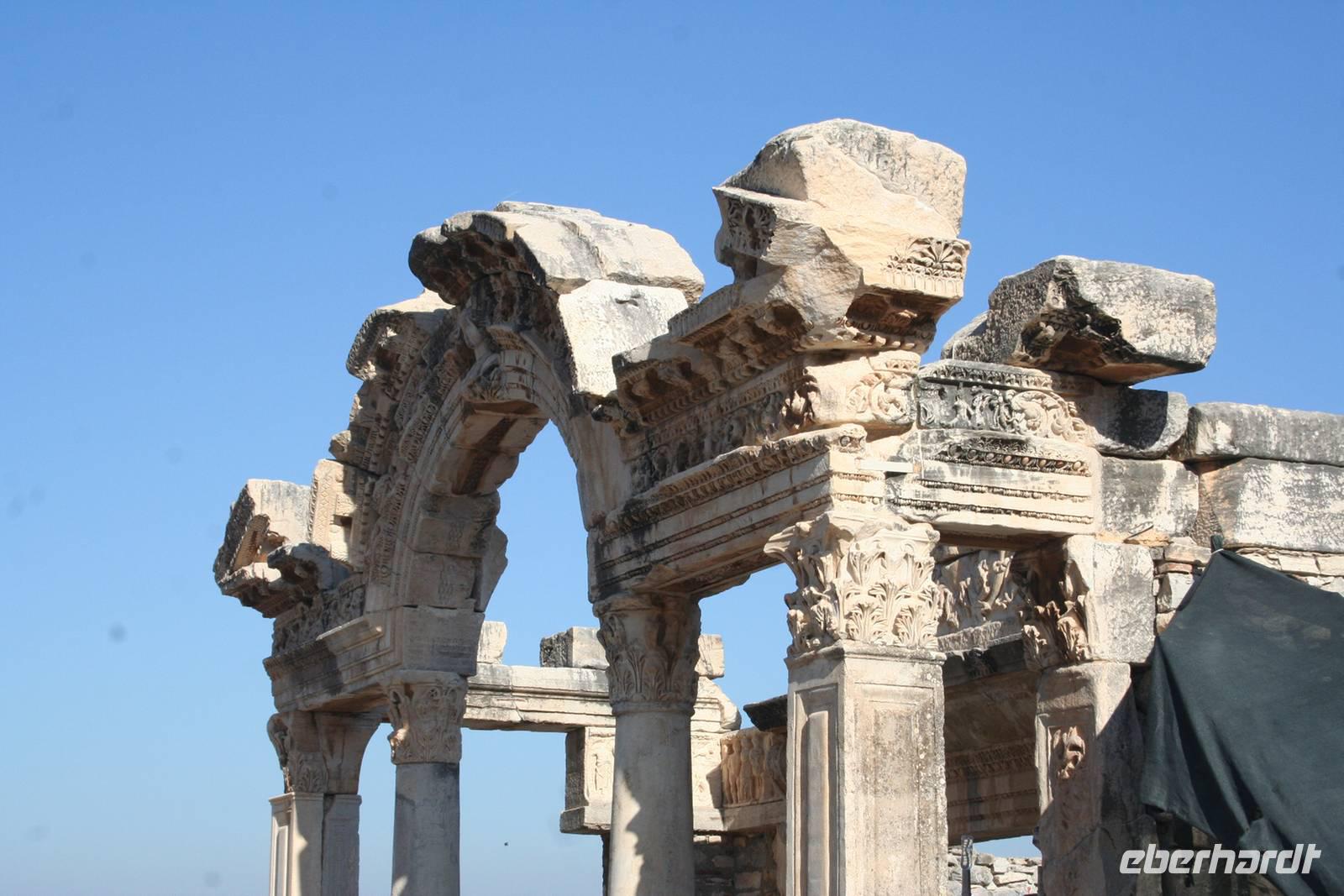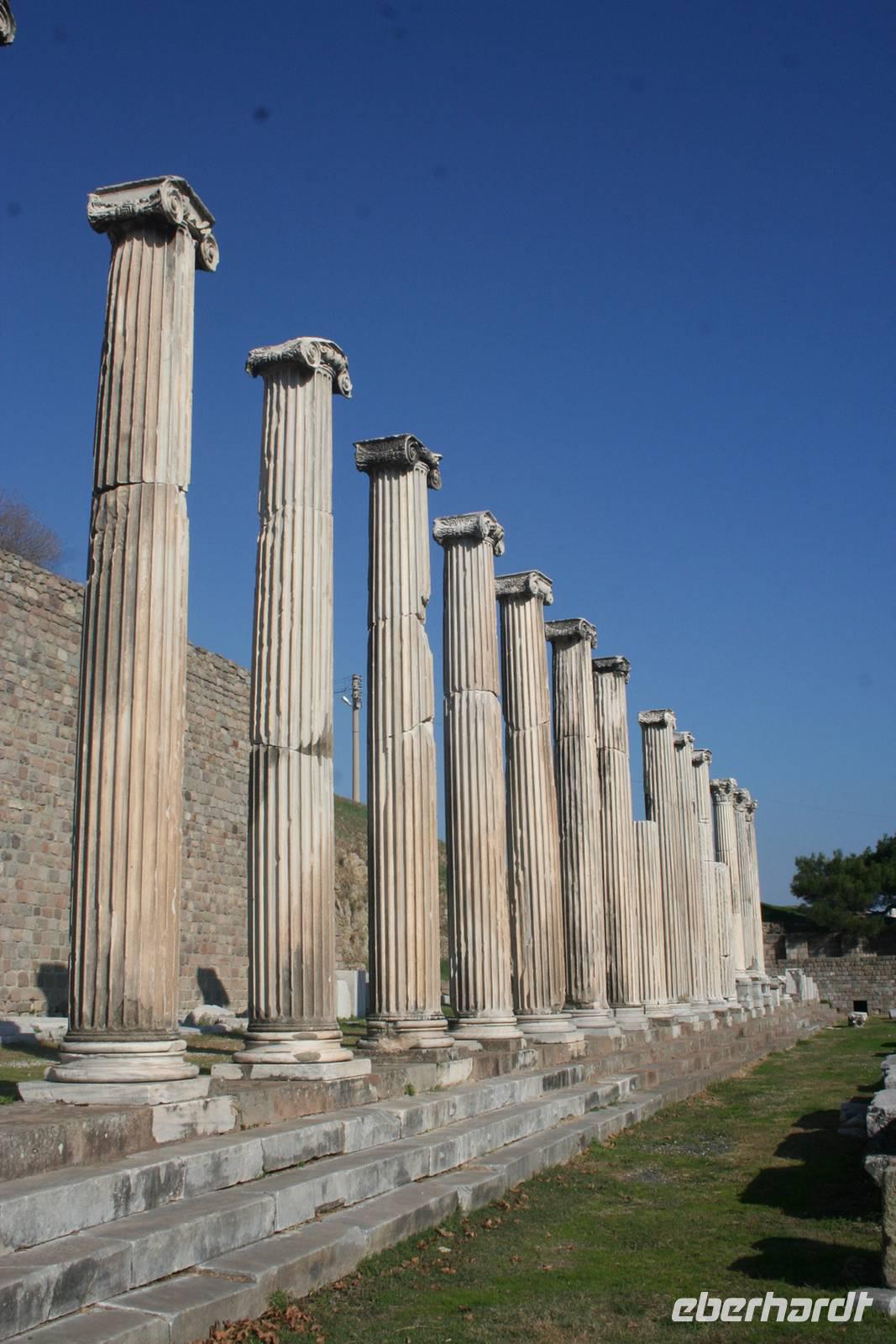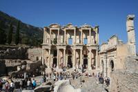 Wo wurde eigentlich das Pergament erfunden? Natürlich in Pergamon! Mit einer hochmodernen Seilbahn erreichten wir die antike Stadt mitten am Berggipfel und bewunderten die Jahrtausende alte Baukunst. Bei wieder einmal grandiosem Weter schauten wir hinab auf die umliegenden Täler und schossen tolle Fotos. Nur beim Anblich des extrem steilen Theaters direkt am Berghang wurde uns ein wenig schwindelig. Auch die Heilstadt Asklepion gleich unterhalb von Pergamon beeindruckte uns mit imposanten Säulen und detailliert behauenen Kapitellen. Wir erfuhren, wie schon in der Antike Kranke durch homöopathisch anmutende Verfahren kuriert wurden und wirksame Medikamente und Heilmethoden hier entwickelt und angewendet wurden. Niemals ist in Asklepion jemand gestorben! (Natürlich sind auch Patienten gestorben, doch wenn dies offensichtlich wurde, dann brachte man sie aus der Stadt, um den Tod nicht einzulassen - eigentlich clever!) Nach einem Tag in solch majestätischem Umfeld erreichten wir am Abend Kusadasi, wo wir eincheckten, um am kommenden Tag gleich wieder unsere Reise fortzusetze.
