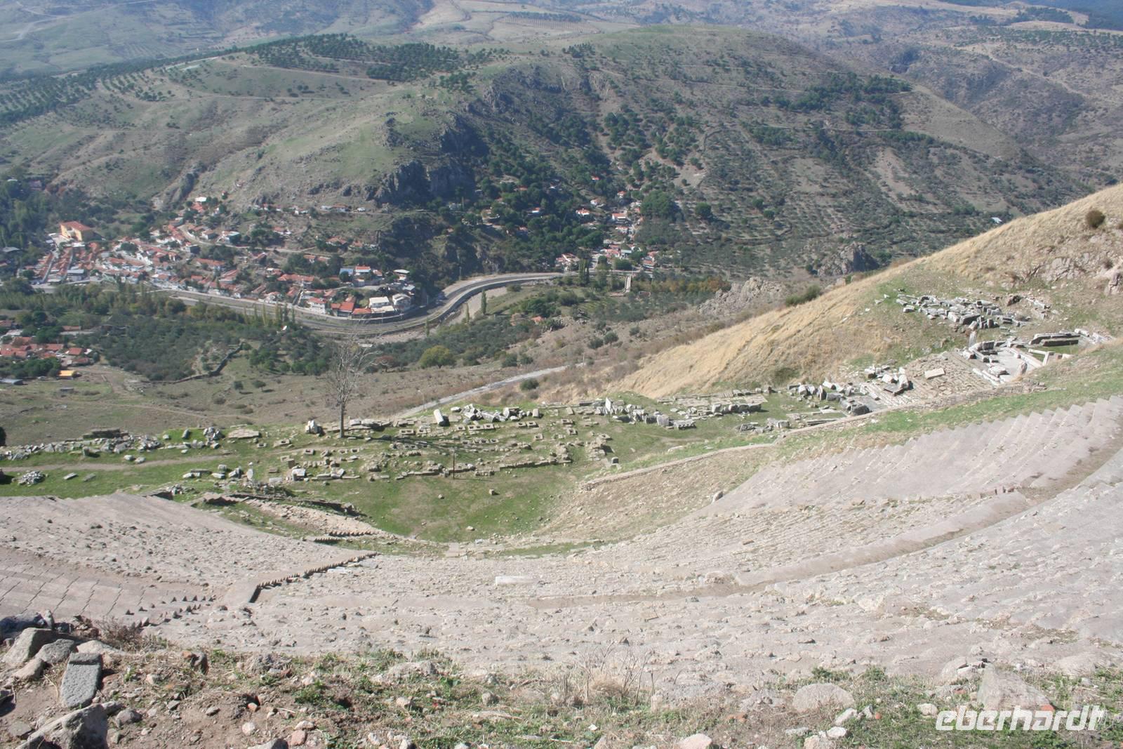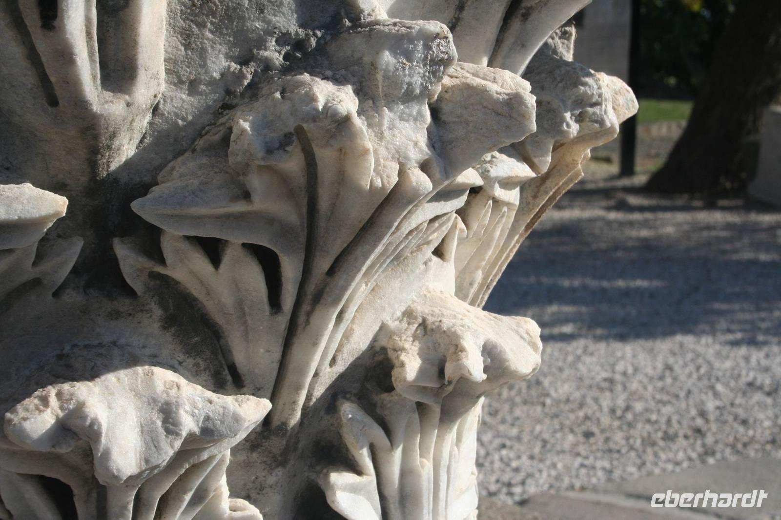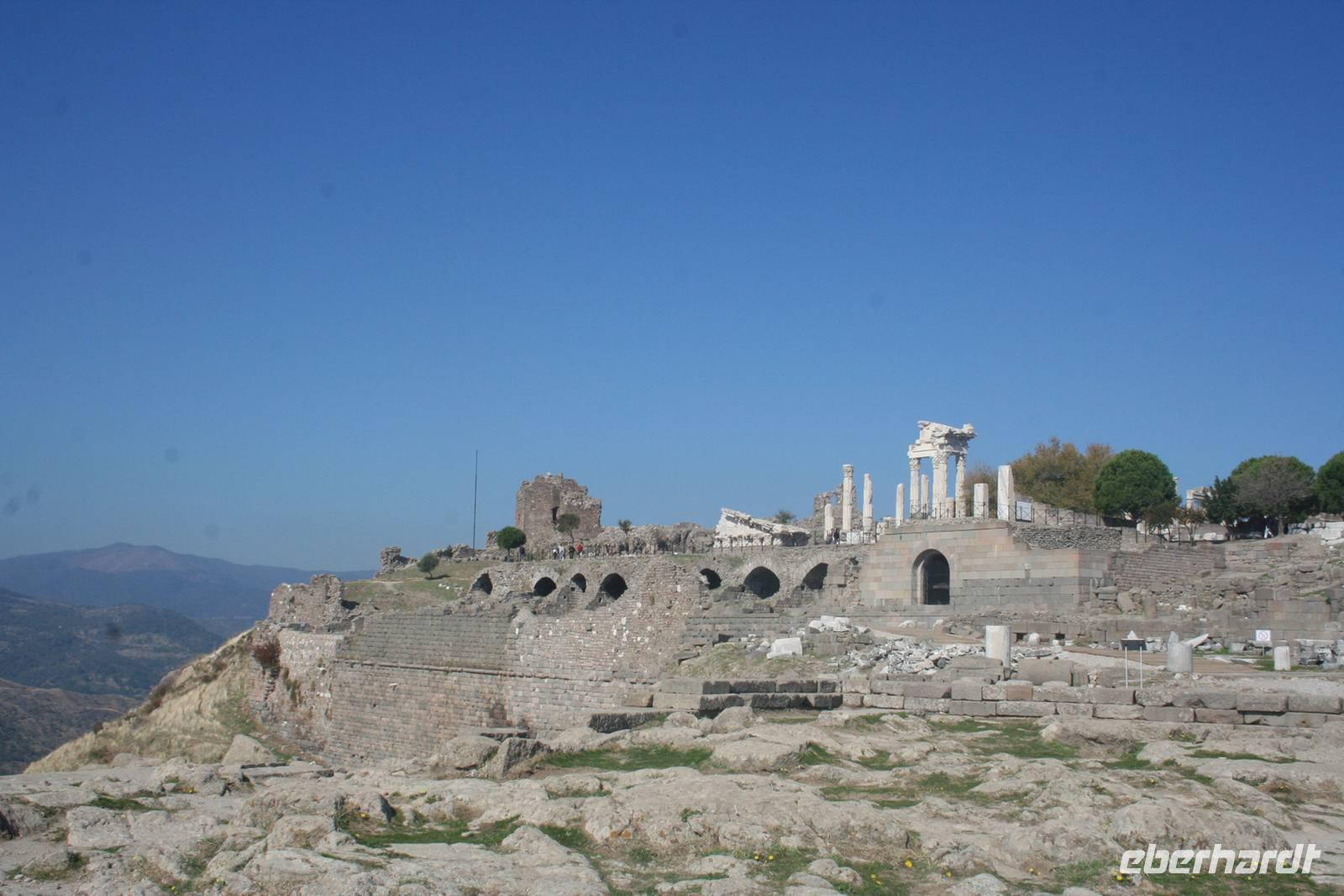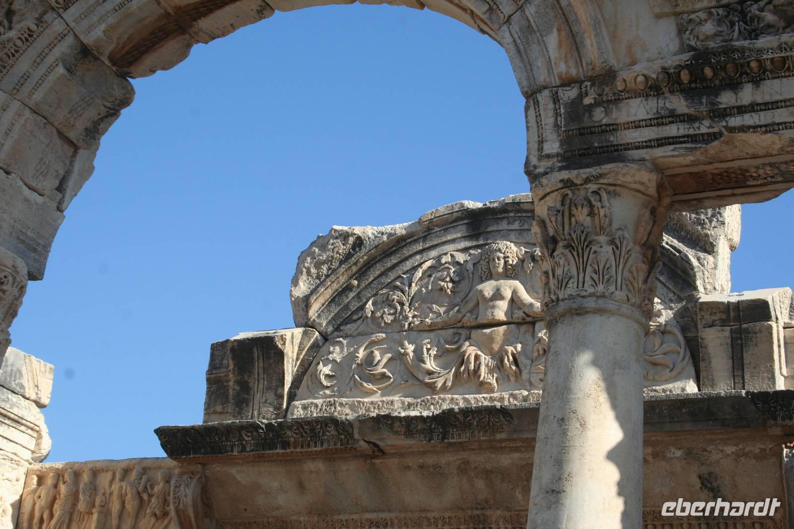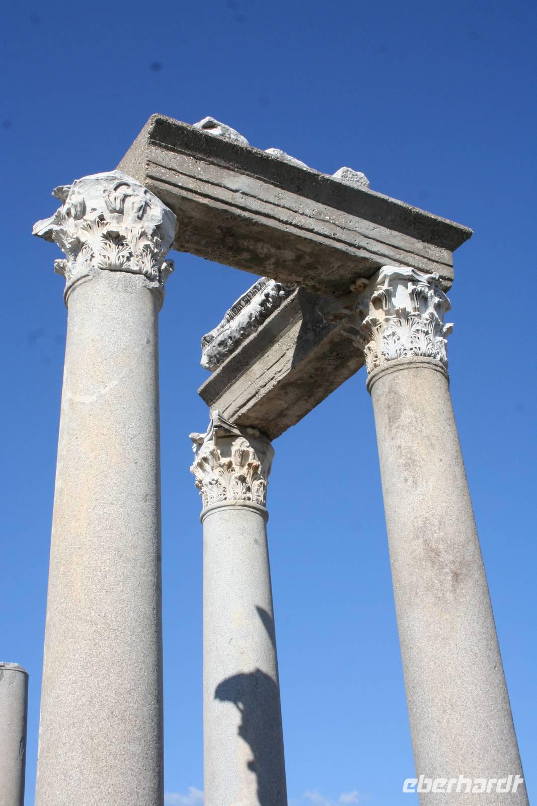 Wo wurde eigentlich das Pergament erfunden? Natürlich in Pergamon! Mit einer hochmodernen Seilbahn erreichten wir die antike Stadt mitten am Berggipfel und bewunderten die Jahrtausende alte Baukunst. Bei wieder einmal grandiosem Weter schauten wir hinab auf die umliegenden Täler und schossen tolle Fotos. Nur beim Anblich des extrem steilen Theaters direkt am Berghang wurde uns ein wenig schwindelig. Auch die Heilstadt Asklepion gleich unterhalb von Pergamon beeindruckte uns mit imposanten Säulen und detailliert behauenen Kapitellen. Wir erfuhren, wie schon in der Antike Kranke durch homöopathisch anmutende Verfahren kuriert wurden und wirksame Medikamente und Heilmethoden hier entwickelt und angewendet wurden. Niemals ist in Asklepion jemand gestorben! (Natürlich sind auch Patienten gestorben, doch wenn dies offensichtlich wurde, dann brachte man sie aus der Stadt, um den Tod nicht einzulassen - eigentlich clever!) Nach einem Tag in solch majestätischem Umfeld erreichten wir am Abend Kusadasi, wo wir eincheckten, um am kommenden Tag gleich wieder unsere Reise fortzusetze.