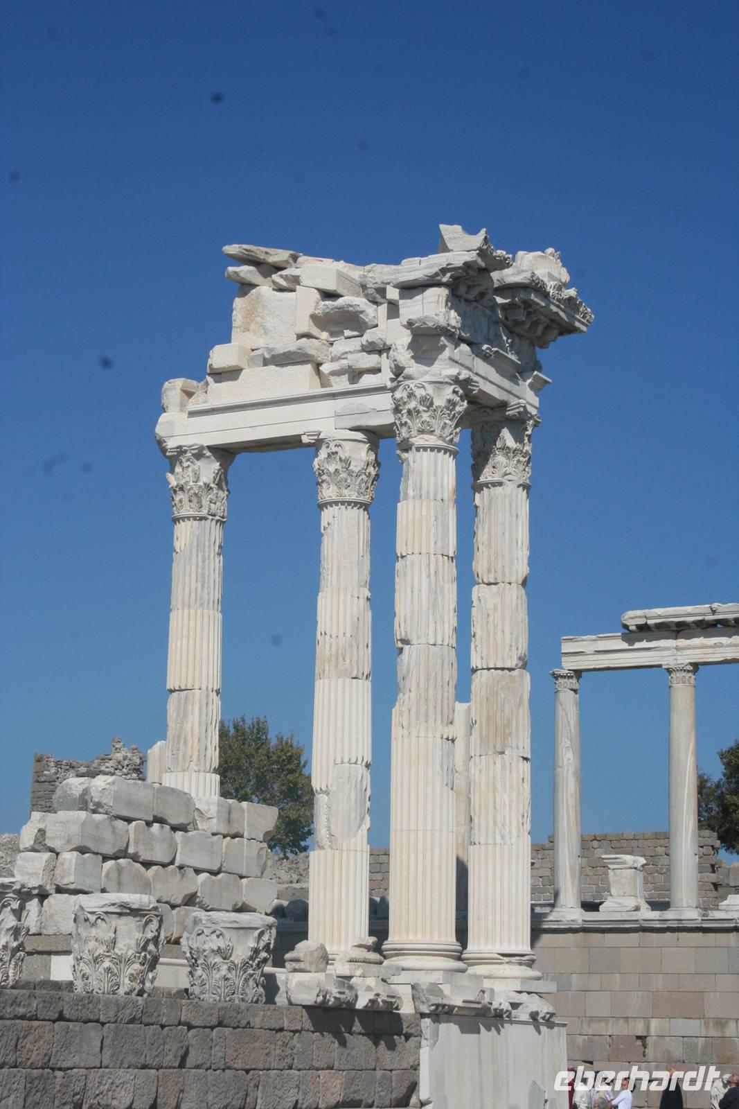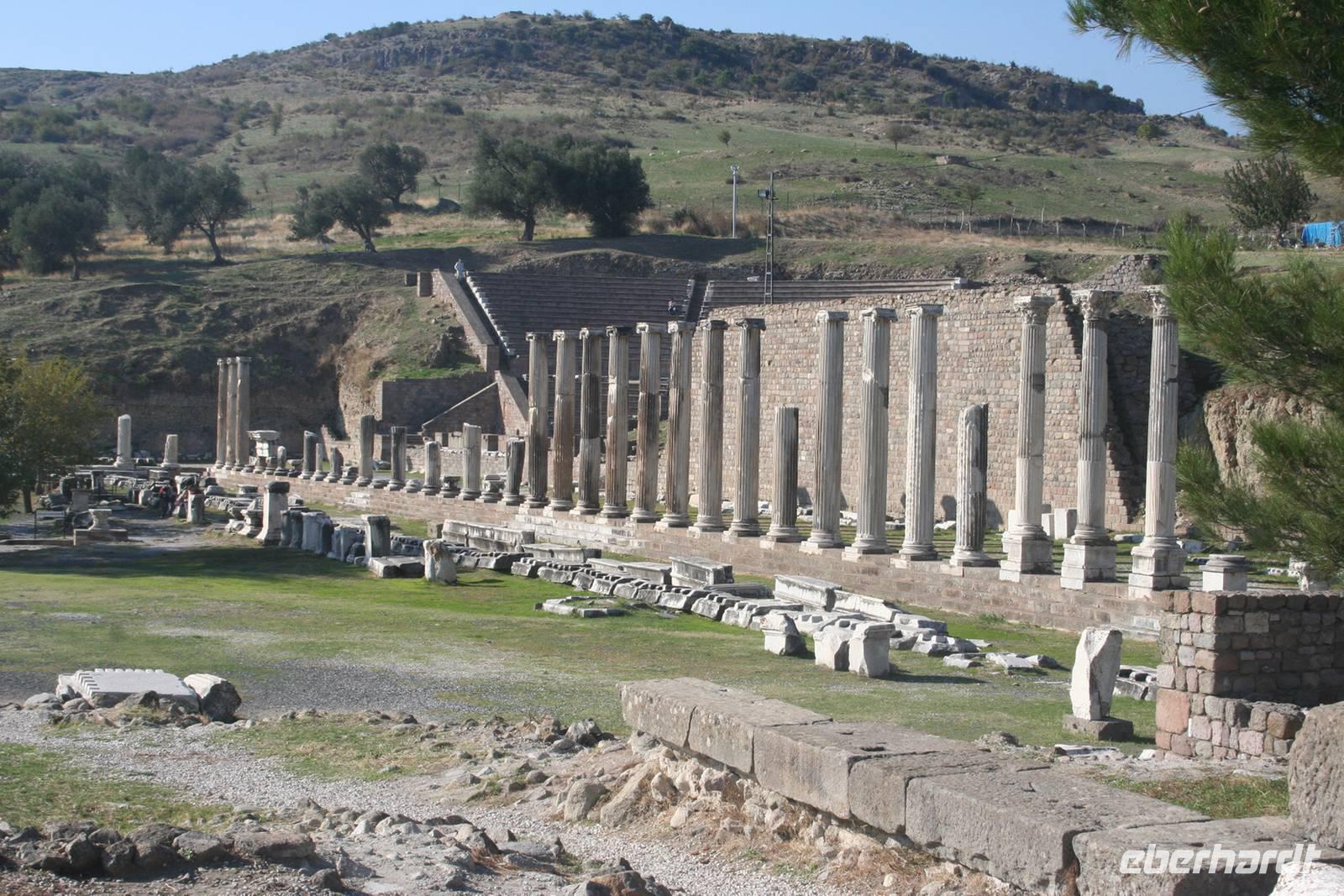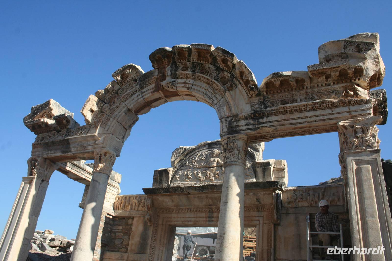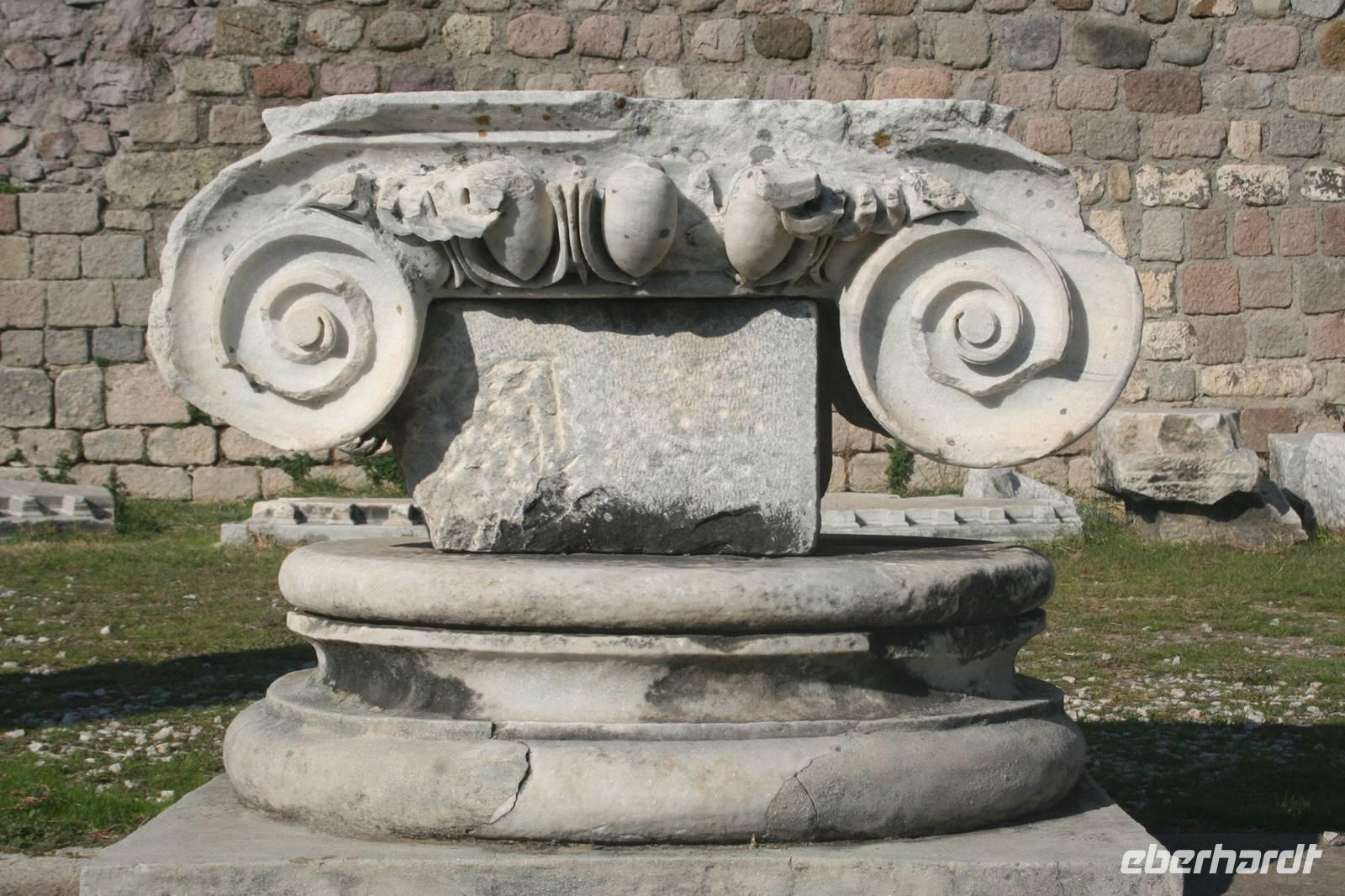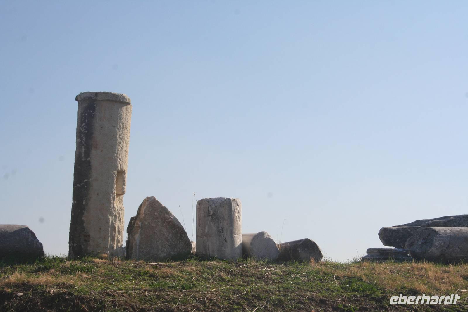 Wo wurde eigentlich das Pergament erfunden? Natürlich in Pergamon! Mit einer hochmodernen Seilbahn erreichten wir die antike Stadt mitten am Berggipfel und bewunderten die Jahrtausende alte Baukunst. Bei wieder einmal grandiosem Weter schauten wir hinab auf die umliegenden Täler und schossen tolle Fotos. Nur beim Anblich des extrem steilen Theaters direkt am Berghang wurde uns ein wenig schwindelig. Auch die Heilstadt Asklepion gleich unterhalb von Pergamon beeindruckte uns mit imposanten Säulen und detailliert behauenen Kapitellen. Wir erfuhren, wie schon in der Antike Kranke durch homöopathisch anmutende Verfahren kuriert wurden und wirksame Medikamente und Heilmethoden hier entwickelt und angewendet wurden. Niemals ist in Asklepion jemand gestorben! (Natürlich sind auch Patienten gestorben, doch wenn dies offensichtlich wurde, dann brachte man sie aus der Stadt, um den Tod nicht einzulassen - eigentlich clever!) Nach einem Tag in solch majestätischem Umfeld erreichten wir am Abend Kusadasi, wo wir eincheckten, um am kommenden Tag gleich wieder unsere Reise fortzusetze.