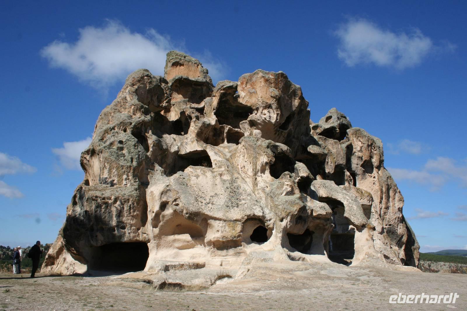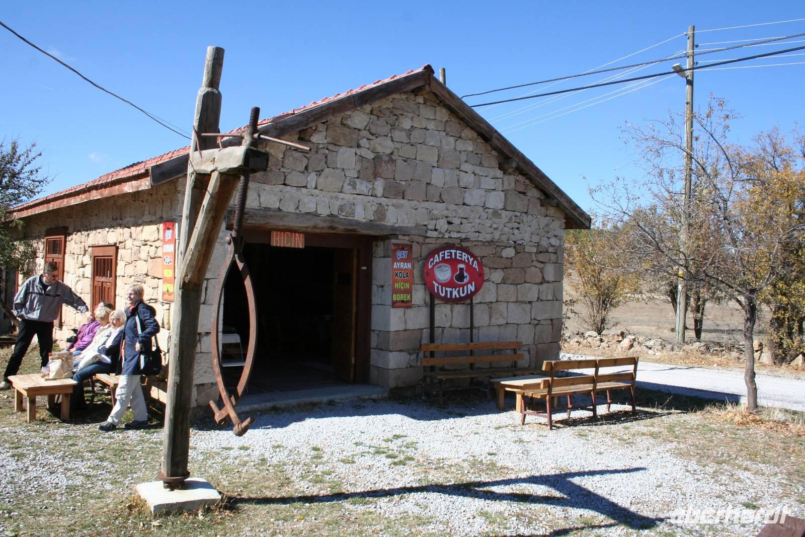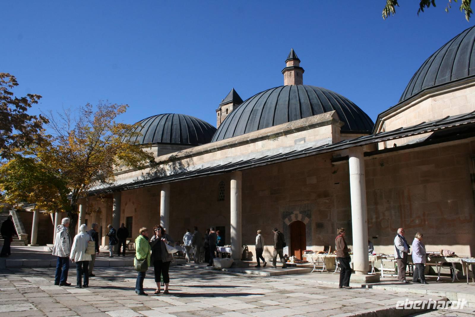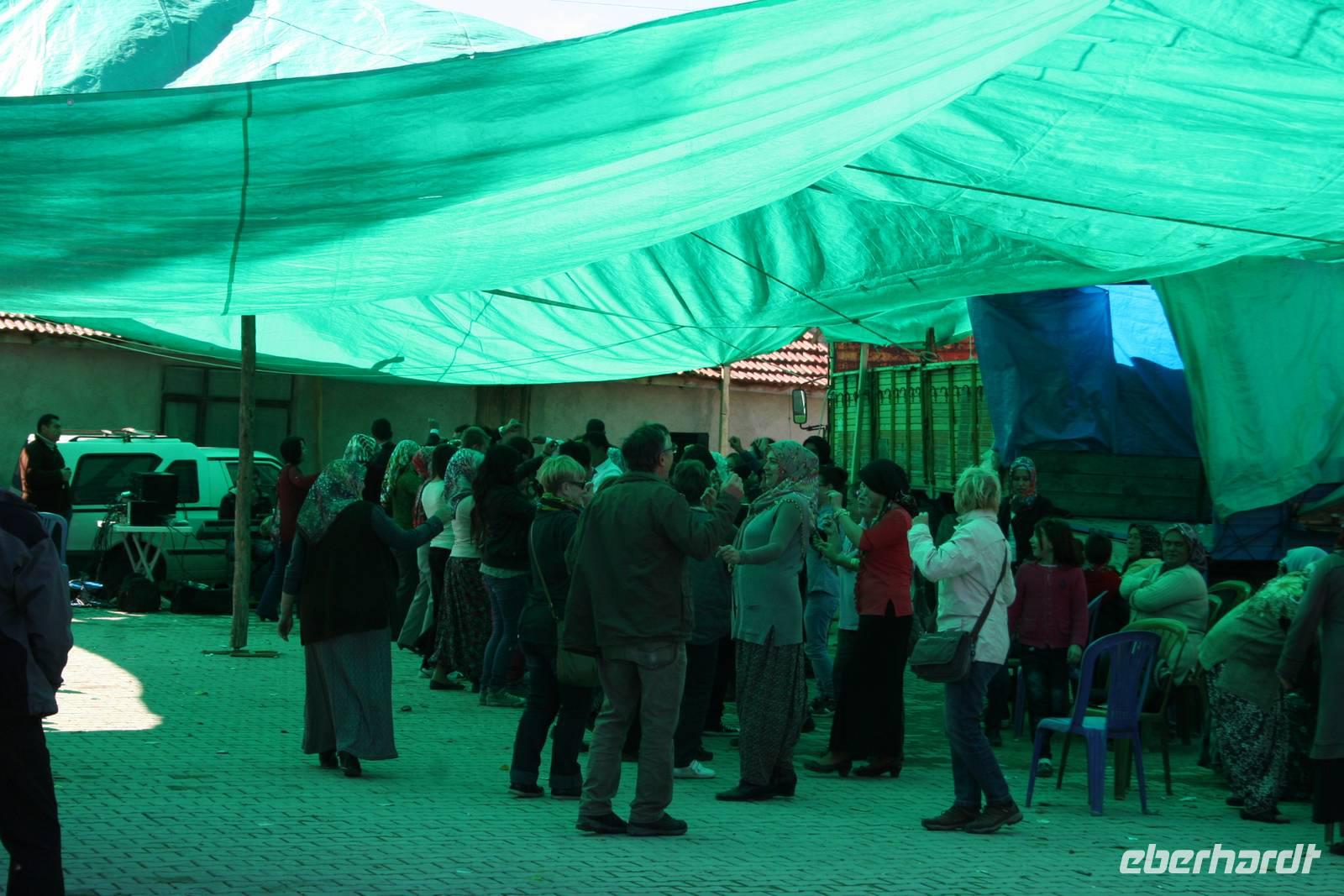 Nach dem Frühstück ging die Reise weiter und mitten durch das Phrygertal. Ein ortskundiger Führer aus einem Nachbarort war eigens für uns vom dortigen Bürgermeister geschickt worden, um uns zu einer ehemaligen Karawanserei zu lotsen, die wir in Ruhe besichtigten. Wir konnten nachvollziehen, wie früher Reisende mit ihren Kamelen Unterkunft fanden und sich von ihrer anstrengenden Arbeit hier erholten. Wir fuhren durch eine imposante Landschaft mit beeindruckenden Tuffsteinformationen, die an Kappadokien erinnerten bis zum Kibele-Felsen, auch Löwenstein genannt, auf dessen Oberfläche immernoch klar die zwei Löwenreliefs erkennbar sind. Diese zwei treuen Tiere begleiteten die Schutzgöttin laut Überlieferung auf ihren Wegen. Wir fuhren weiter durch das Phrygertal und erreichten den Löwenfelsen, der erst nach genauem Hinschauen als solcher erkennbar ist, da er leider auf der Seite liegt. In den umliegenden Felsen konnten wir Löcher erkennen, die Fenster und Eingänge der dort liegenden Höhlenwohnungen und -gräber darstellten. Schließlich erreichten wir Midasstadt und bestaunten das gewaltige Monument und die nahegelegene kleine Zisterne. Wir trugen uns dankend in das Gästebuch des Ortsvorstehers ein, der uns in seine Bibliothek eingeladen hatte und gingen zu Fuß zu einem charmanten Dorfrestaurant, wo wir Börek (Kartoffelfladen) mit Käse und Oliven serviert bekamen. Wie überall begrüßte uns auch hier ein zahmer freilaufender Hund. Diese Tiere gehören entweder zu einem Haushalt oder werden von den Gemeinden mit Futter und medizinischer Betreuung versorgt, so dass wir uns keine Sorgen um die vielen streunenden Vierbeiner machen brauchten. Gestärkt wollten wir den Ort gerade verlassen, als wir auf der Straße eine ausgelassene Hochzeitsgesellschaft beim Feiern und Tanzen sahen. Serdar ließ und kurzentschlossen aussteigen und sofort wurden wir zum Mitfeiern herangewunken und gastfreundlich mit kleinen bestickten Handtüchern beschenkt. Das war eine ganz besondere kleine Reiseüberraschung, die allen sicher in Erinnerung bleiben wird. Später in Seyitgazi besuchten wir die dortige Alevitenmoschee und das danebengelegene Kloster. Danach verkosteten wir hausgemachten türkischen Honig mit Sahnefüllung, den Serdar für uns aus Afyon mitgebracht hatte. Denn Afyon ist berühmt für die beste ahne des Landes.