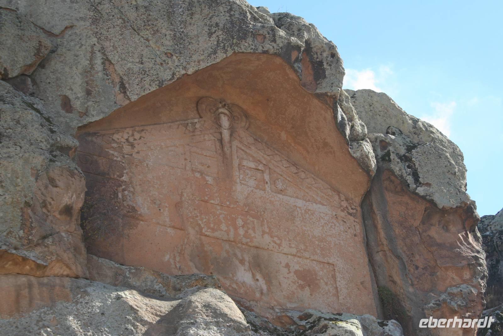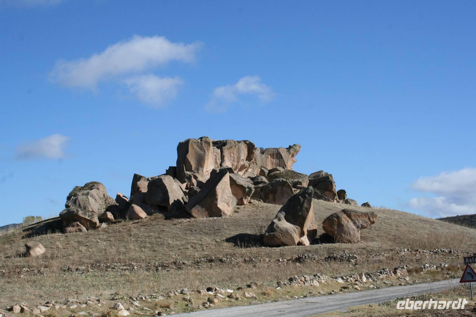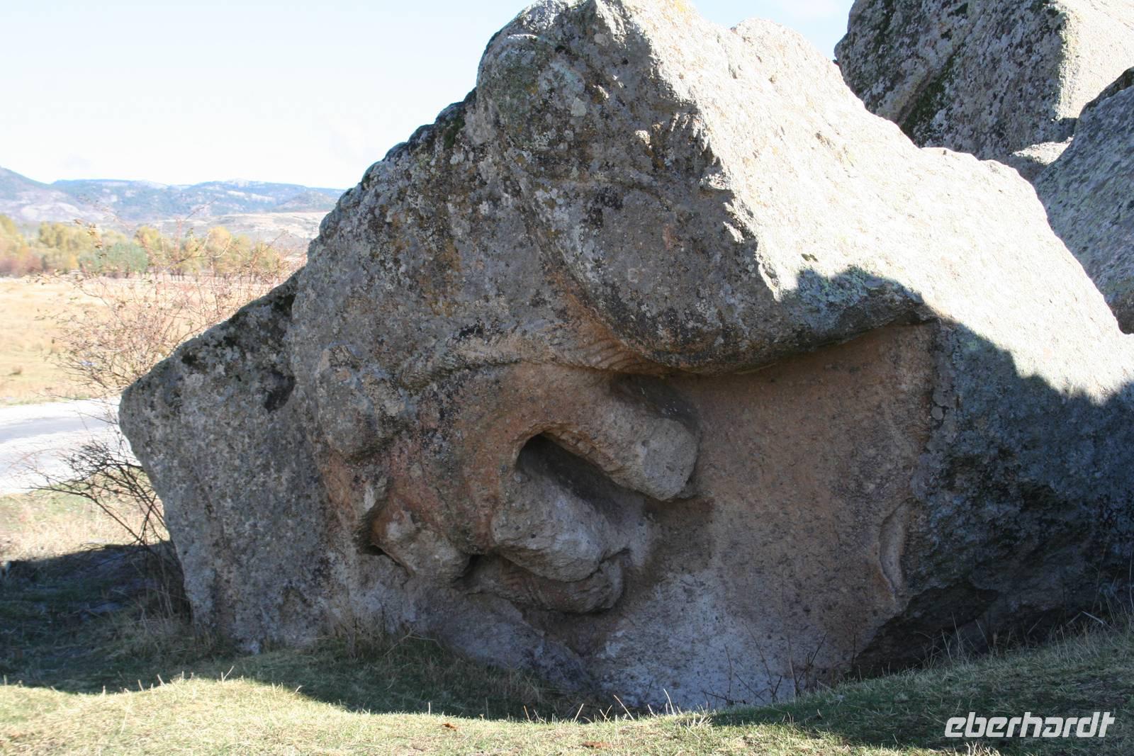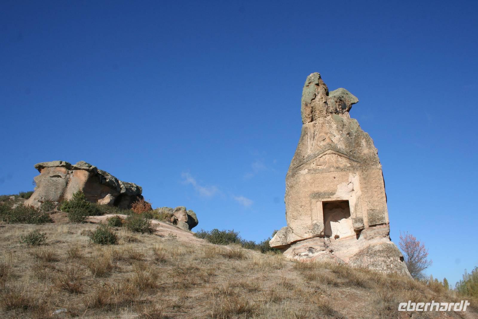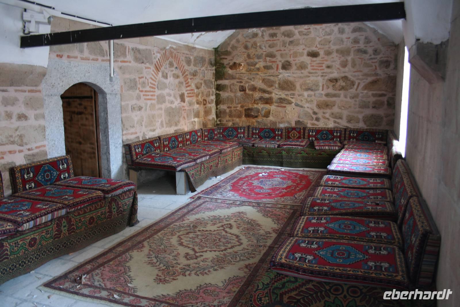 Nach dem Frühstück ging die Reise weiter und mitten durch das Phrygertal. Ein ortskundiger Führer aus einem Nachbarort war eigens für uns vom dortigen Bürgermeister geschickt worden, um uns zu einer ehemaligen Karawanserei zu lotsen, die wir in Ruhe besichtigten. Wir konnten nachvollziehen, wie früher Reisende mit ihren Kamelen Unterkunft fanden und sich von ihrer anstrengenden Arbeit hier erholten. Wir fuhren durch eine imposante Landschaft mit beeindruckenden Tuffsteinformationen, die an Kappadokien erinnerten bis zum Kibele-Felsen, auch Löwenstein genannt, auf dessen Oberfläche immernoch klar die zwei Löwenreliefs erkennbar sind. Diese zwei treuen Tiere begleiteten die Schutzgöttin laut Überlieferung auf ihren Wegen. Wir fuhren weiter durch das Phrygertal und erreichten den Löwenfelsen, der erst nach genauem Hinschauen als solcher erkennbar ist, da er leider auf der Seite liegt. In den umliegenden Felsen konnten wir Löcher erkennen, die Fenster und Eingänge der dort liegenden Höhlenwohnungen und -gräber darstellten. Schließlich erreichten wir Midasstadt und bestaunten das gewaltige Monument und die nahegelegene kleine Zisterne. Wir trugen uns dankend in das Gästebuch des Ortsvorstehers ein, der uns in seine Bibliothek eingeladen hatte und gingen zu Fuß zu einem charmanten Dorfrestaurant, wo wir Börek (Kartoffelfladen) mit Käse und Oliven serviert bekamen. Wie überall begrüßte uns auch hier ein zahmer freilaufender Hund. Diese Tiere gehören entweder zu einem Haushalt oder werden von den Gemeinden mit Futter und medizinischer Betreuung versorgt, so dass wir uns keine Sorgen um die vielen streunenden Vierbeiner machen brauchten. Gestärkt wollten wir den Ort gerade verlassen, als wir auf der Straße eine ausgelassene Hochzeitsgesellschaft beim Feiern und Tanzen sahen. Serdar ließ und kurzentschlossen aussteigen und sofort wurden wir zum Mitfeiern herangewunken und gastfreundlich mit kleinen bestickten Handtüchern beschenkt. Das war eine ganz besondere kleine Reiseüberraschung, die allen sicher in Erinnerung bleiben wird. Später in Seyitgazi besuchten wir die dortige Alevitenmoschee und das danebengelegene Kloster. Danach verkosteten wir hausgemachten türkischen Honig mit Sahnefüllung, den Serdar für uns aus Afyon mitgebracht hatte. Denn Afyon ist berühmt für die beste ahne des Landes.