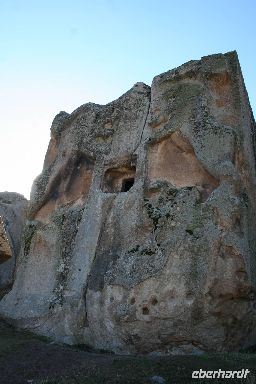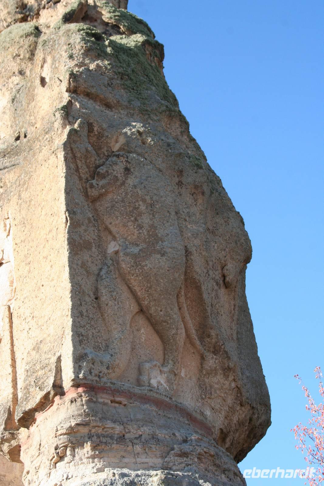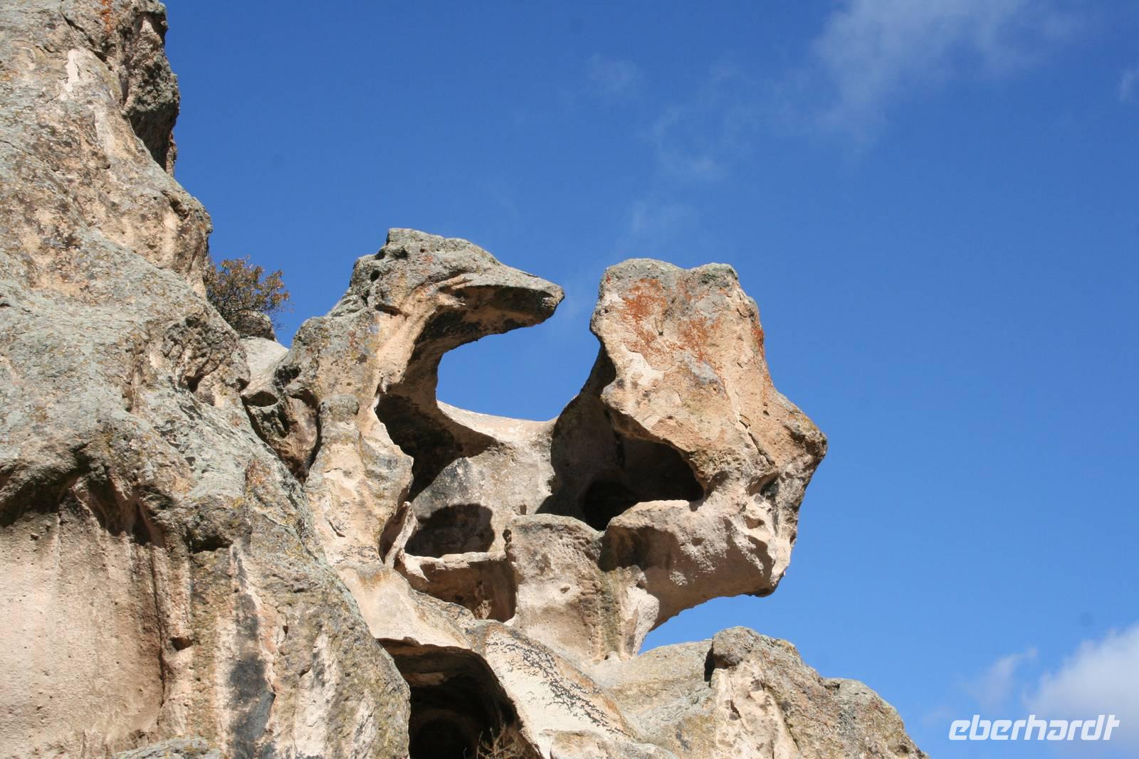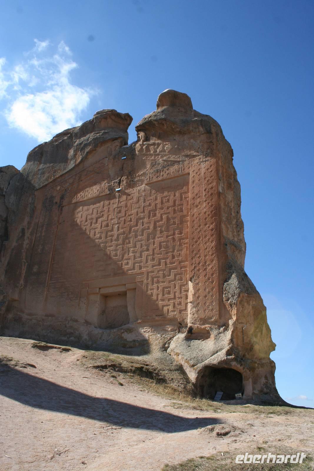 Nach dem Frühstück ging die Reise weiter und mitten durch das Phrygertal. Ein ortskundiger Führer aus einem Nachbarort war eigens für uns vom dortigen Bürgermeister geschickt worden, um uns zu einer ehemaligen Karawanserei zu lotsen, die wir in Ruhe besichtigten. Wir konnten nachvollziehen, wie früher Reisende mit ihren Kamelen Unterkunft fanden und sich von ihrer anstrengenden Arbeit hier erholten. Wir fuhren durch eine imposante Landschaft mit beeindruckenden Tuffsteinformationen, die an Kappadokien erinnerten bis zum Kibele-Felsen, auch Löwenstein genannt, auf dessen Oberfläche immernoch klar die zwei Löwenreliefs erkennbar sind. Diese zwei treuen Tiere begleiteten die Schutzgöttin laut Überlieferung auf ihren Wegen. Wir fuhren weiter durch das Phrygertal und erreichten den Löwenfelsen, der erst nach genauem Hinschauen als solcher erkennbar ist, da er leider auf der Seite liegt. In den umliegenden Felsen konnten wir Löcher erkennen, die Fenster und Eingänge der dort liegenden Höhlenwohnungen und -gräber darstellten. Schließlich erreichten wir Midasstadt und bestaunten das gewaltige Monument und die nahegelegene kleine Zisterne. Wir trugen uns dankend in das Gästebuch des Ortsvorstehers ein, der uns in seine Bibliothek eingeladen hatte und gingen zu Fuß zu einem charmanten Dorfrestaurant, wo wir Börek (Kartoffelfladen) mit Käse und Oliven serviert bekamen. Wie überall begrüßte uns auch hier ein zahmer freilaufender Hund. Diese Tiere gehören entweder zu einem Haushalt oder werden von den Gemeinden mit Futter und medizinischer Betreuung versorgt, so dass wir uns keine Sorgen um die vielen streunenden Vierbeiner machen brauchten. Gestärkt wollten wir den Ort gerade verlassen, als wir auf der Straße eine ausgelassene Hochzeitsgesellschaft beim Feiern und Tanzen sahen. Serdar ließ und kurzentschlossen aussteigen und sofort wurden wir zum Mitfeiern herangewunken und gastfreundlich mit kleinen bestickten Handtüchern beschenkt. Das war eine ganz besondere kleine Reiseüberraschung, die allen sicher in Erinnerung bleiben wird. Später in Seyitgazi besuchten wir die dortige Alevitenmoschee und das danebengelegene Kloster. Danach verkosteten wir hausgemachten türkischen Honig mit Sahnefüllung, den Serdar für uns aus Afyon mitgebracht hatte. Denn Afyon ist berühmt für die beste ahne des Landes.
