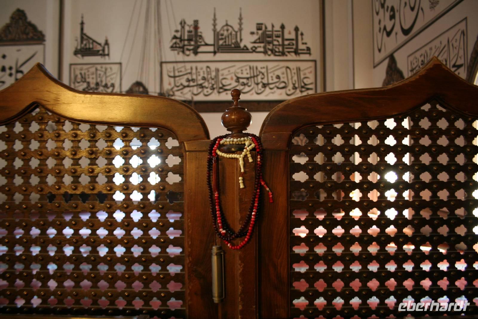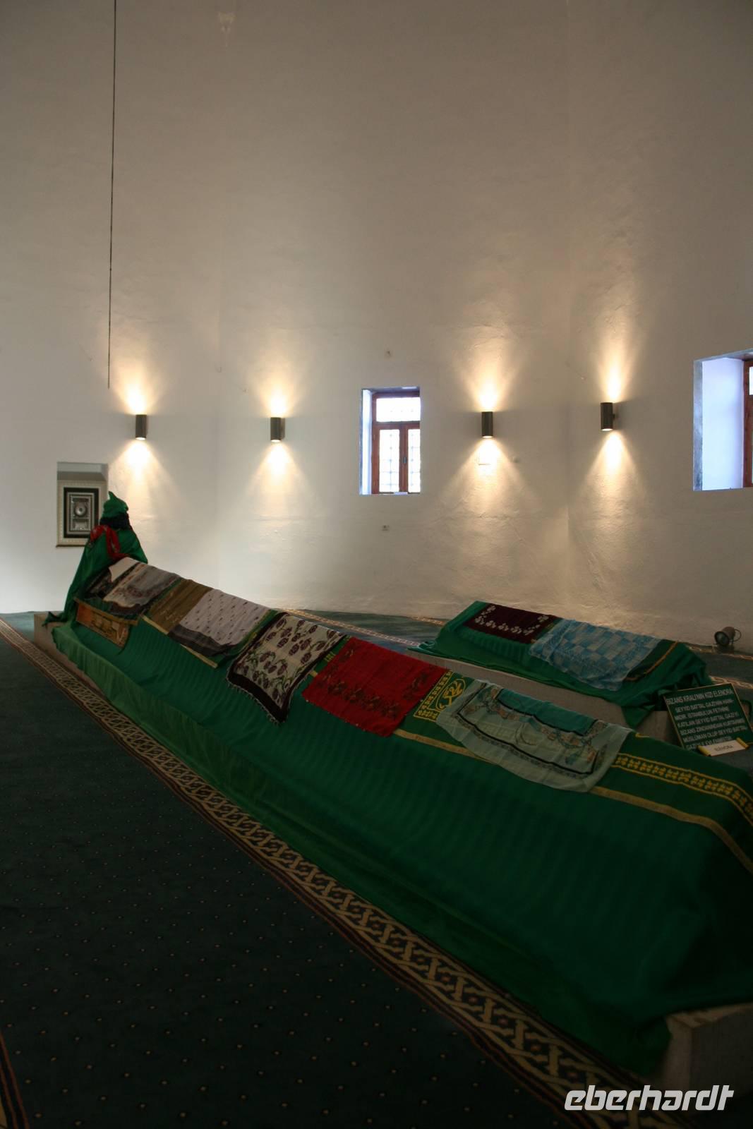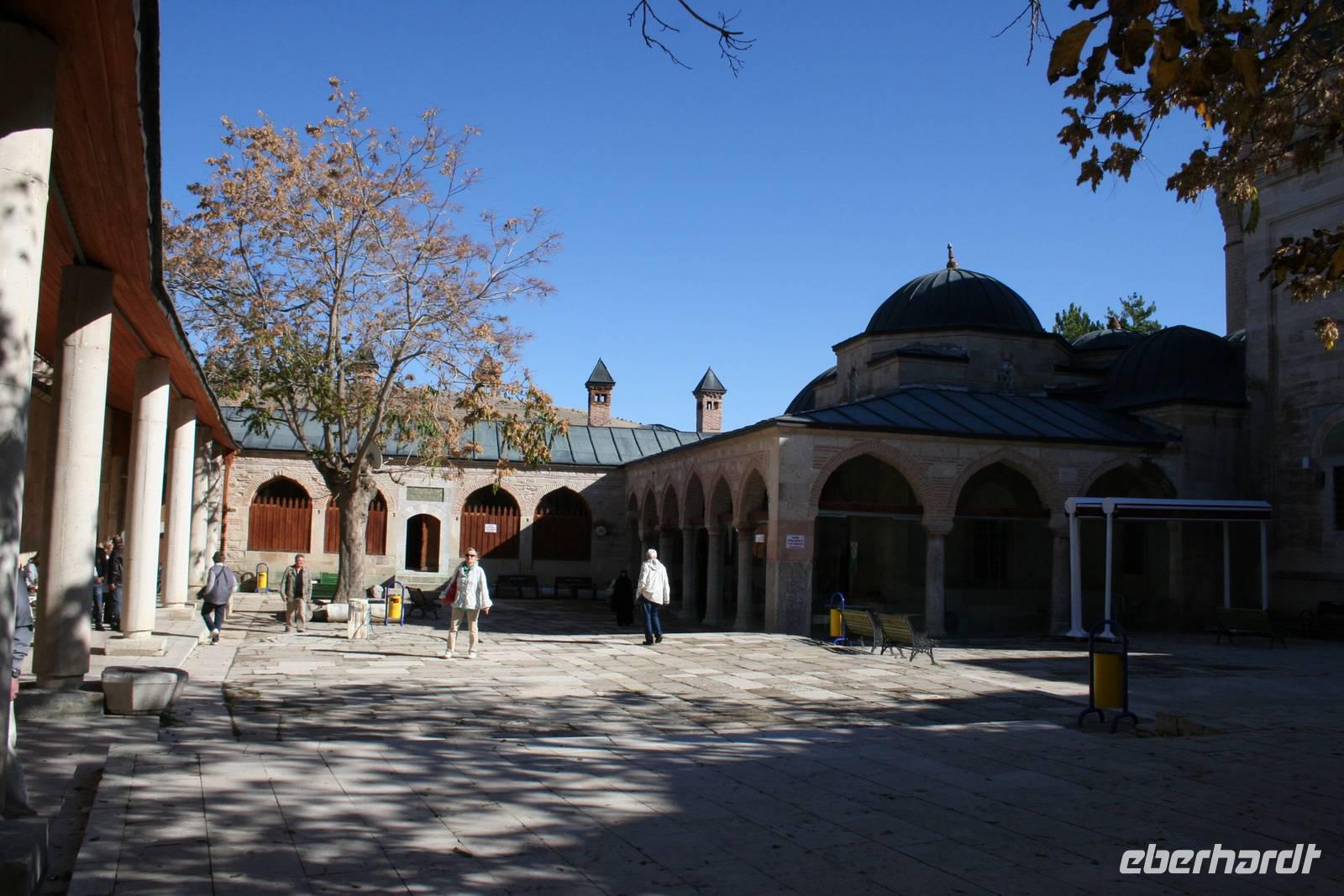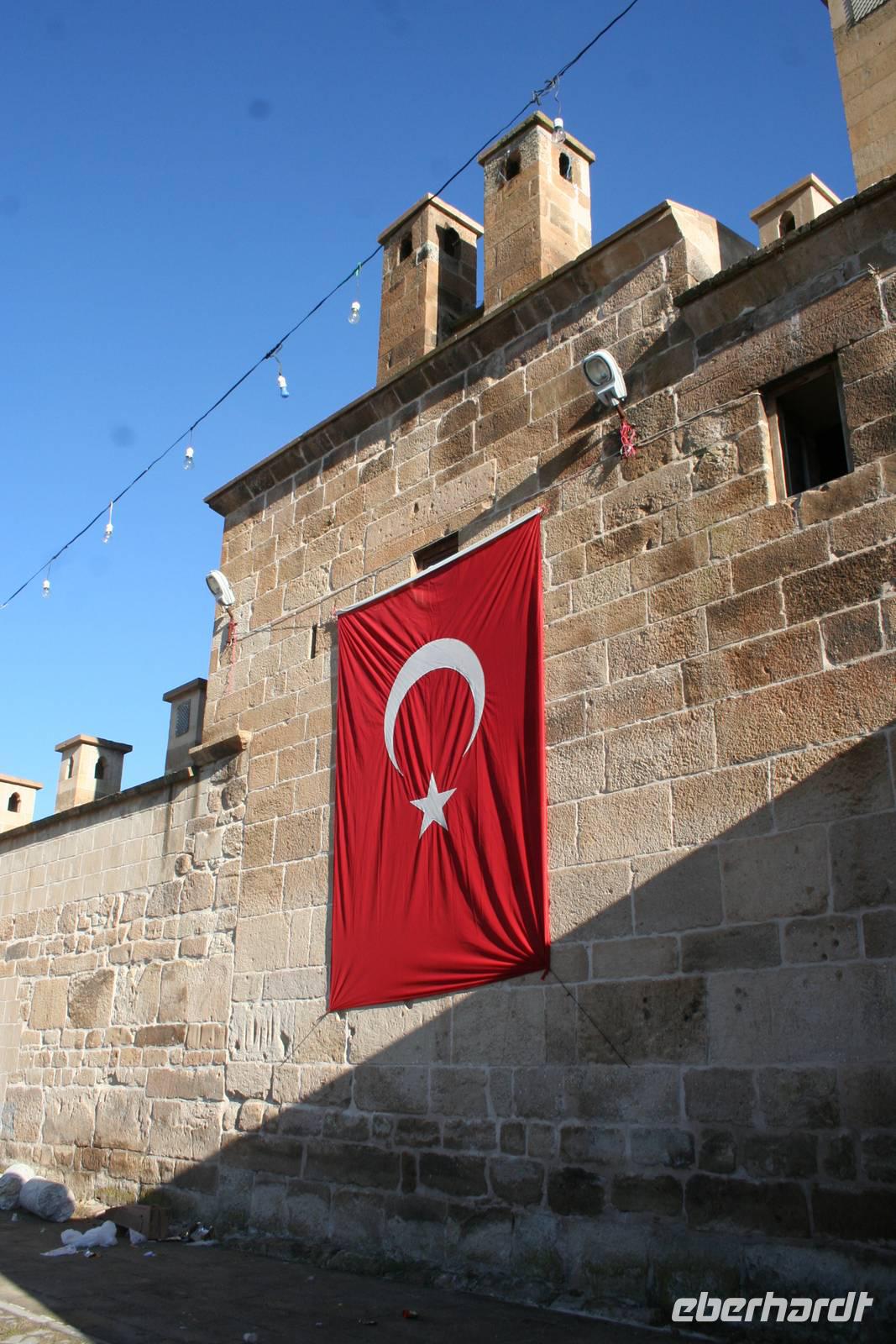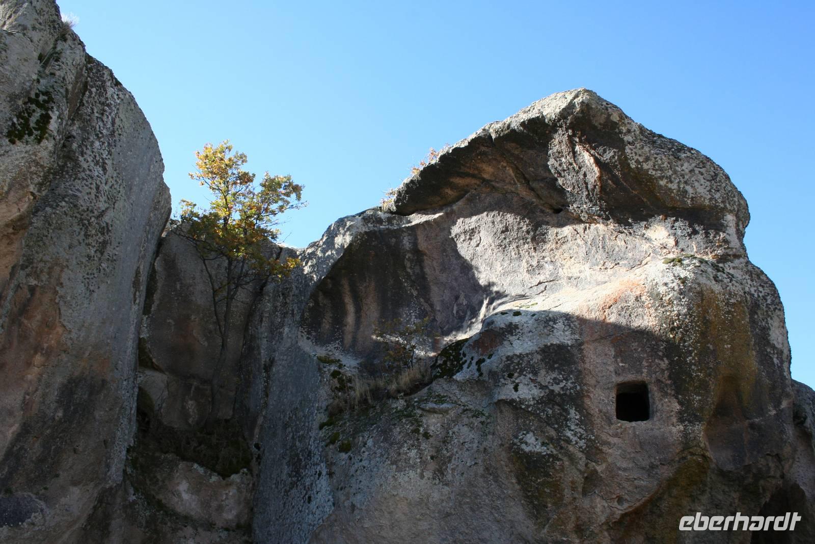 Nach dem Frühstück ging die Reise weiter und mitten durch das Phrygertal. Ein ortskundiger Führer aus einem Nachbarort war eigens für uns vom dortigen Bürgermeister geschickt worden, um uns zu einer ehemaligen Karawanserei zu lotsen, die wir in Ruhe besichtigten. Wir konnten nachvollziehen, wie früher Reisende mit ihren Kamelen Unterkunft fanden und sich von ihrer anstrengenden Arbeit hier erholten. Wir fuhren durch eine imposante Landschaft mit beeindruckenden Tuffsteinformationen, die an Kappadokien erinnerten bis zum Kibele-Felsen, auch Löwenstein genannt, auf dessen Oberfläche immernoch klar die zwei Löwenreliefs erkennbar sind. Diese zwei treuen Tiere begleiteten die Schutzgöttin laut Überlieferung auf ihren Wegen. Wir fuhren weiter durch das Phrygertal und erreichten den Löwenfelsen, der erst nach genauem Hinschauen als solcher erkennbar ist, da er leider auf der Seite liegt. In den umliegenden Felsen konnten wir Löcher erkennen, die Fenster und Eingänge der dort liegenden Höhlenwohnungen und -gräber darstellten. Schließlich erreichten wir Midasstadt und bestaunten das gewaltige Monument und die nahegelegene kleine Zisterne. Wir trugen uns dankend in das Gästebuch des Ortsvorstehers ein, der uns in seine Bibliothek eingeladen hatte und gingen zu Fuß zu einem charmanten Dorfrestaurant, wo wir Börek (Kartoffelfladen) mit Käse und Oliven serviert bekamen. Wie überall begrüßte uns auch hier ein zahmer freilaufender Hund. Diese Tiere gehören entweder zu einem Haushalt oder werden von den Gemeinden mit Futter und medizinischer Betreuung versorgt, so dass wir uns keine Sorgen um die vielen streunenden Vierbeiner machen brauchten. Gestärkt wollten wir den Ort gerade verlassen, als wir auf der Straße eine ausgelassene Hochzeitsgesellschaft beim Feiern und Tanzen sahen. Serdar ließ und kurzentschlossen aussteigen und sofort wurden wir zum Mitfeiern herangewunken und gastfreundlich mit kleinen bestickten Handtüchern beschenkt. Das war eine ganz besondere kleine Reiseüberraschung, die allen sicher in Erinnerung bleiben wird. Später in Seyitgazi besuchten wir die dortige Alevitenmoschee und das danebengelegene Kloster. Danach verkosteten wir hausgemachten türkischen Honig mit Sahnefüllung, den Serdar für uns aus Afyon mitgebracht hatte. Denn Afyon ist berühmt für die beste ahne des Landes.