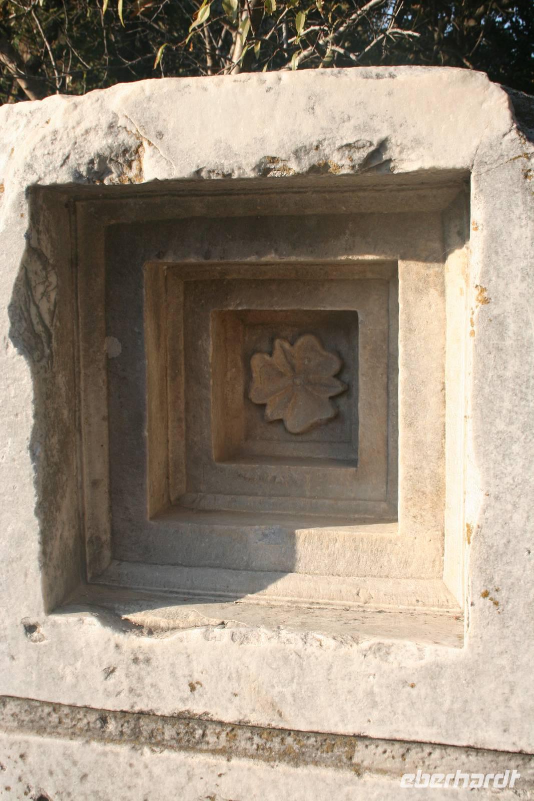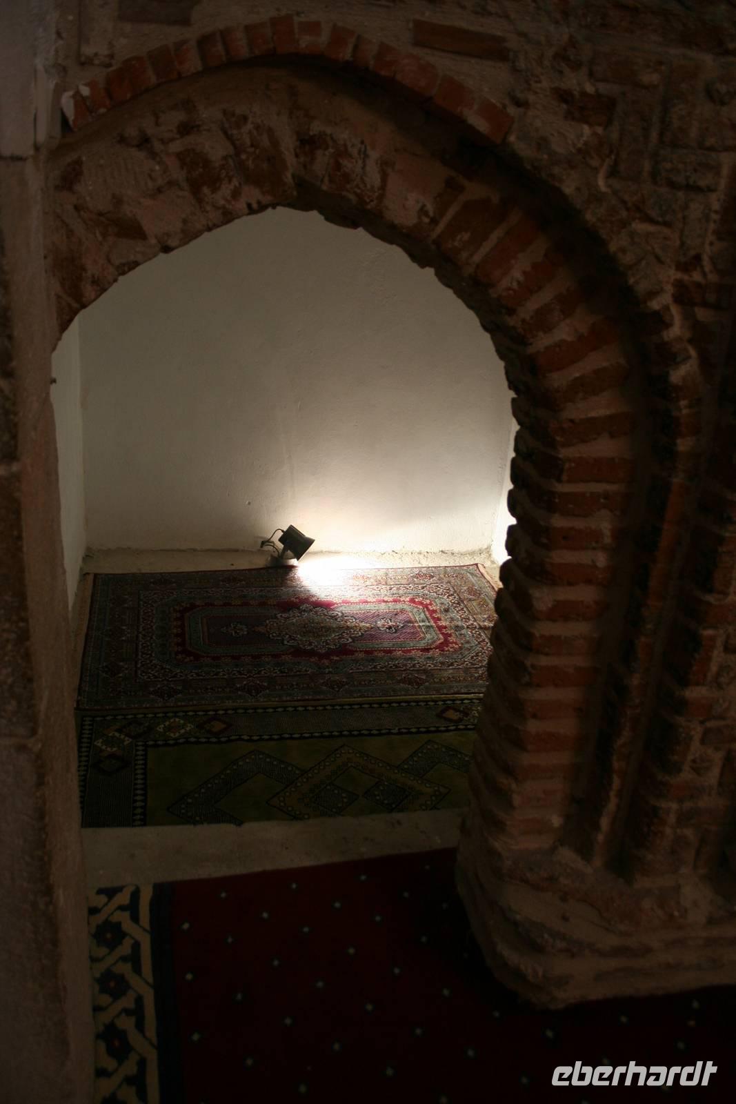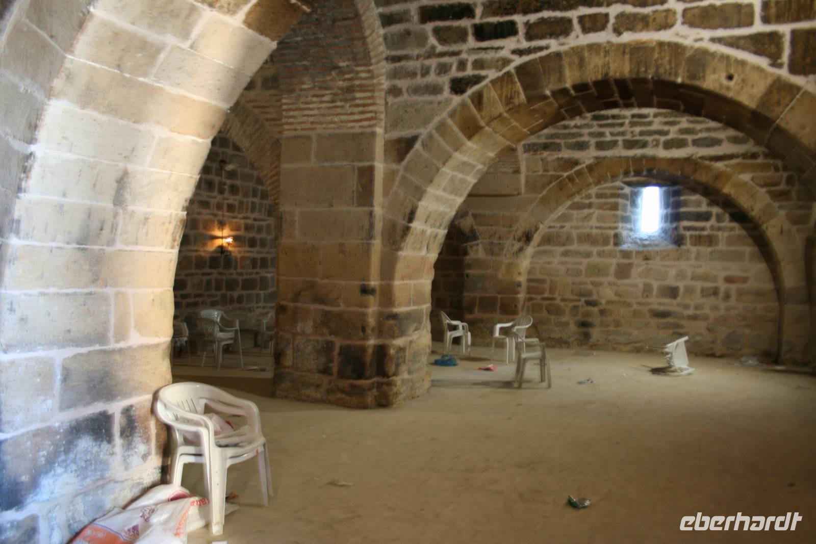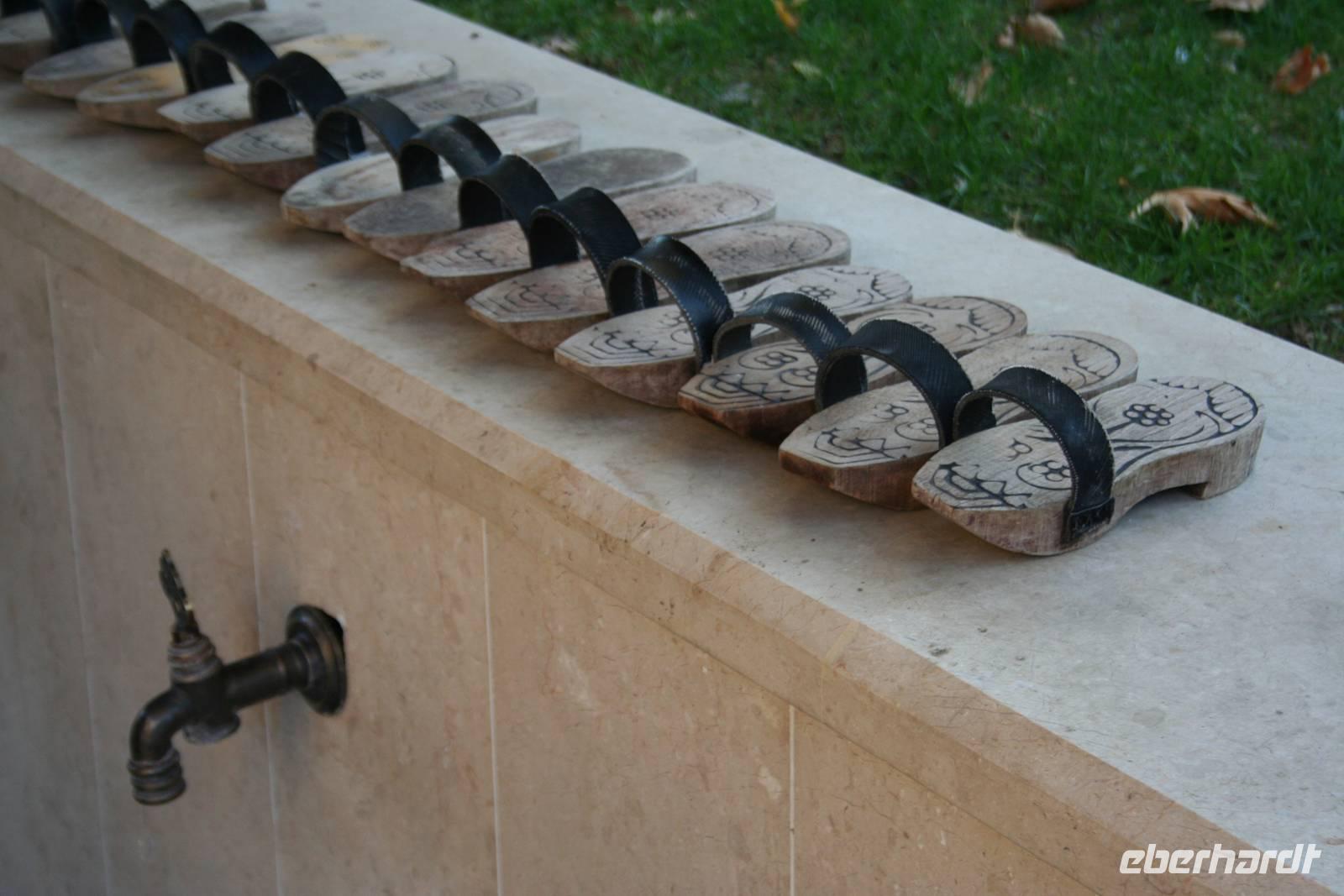 Nach dem Frühstück ging die Reise weiter und mitten durch das Phrygertal. Ein ortskundiger Führer aus einem Nachbarort war eigens für uns vom dortigen Bürgermeister geschickt worden, um uns zu einer ehemaligen Karawanserei zu lotsen, die wir in Ruhe besichtigten. Wir konnten nachvollziehen, wie früher Reisende mit ihren Kamelen Unterkunft fanden und sich von ihrer anstrengenden Arbeit hier erholten. Wir fuhren durch eine imposante Landschaft mit beeindruckenden Tuffsteinformationen, die an Kappadokien erinnerten bis zum Kibele-Felsen, auch Löwenstein genannt, auf dessen Oberfläche immernoch klar die zwei Löwenreliefs erkennbar sind. Diese zwei treuen Tiere begleiteten die Schutzgöttin laut Überlieferung auf ihren Wegen. Wir fuhren weiter durch das Phrygertal und erreichten den Löwenfelsen, der erst nach genauem Hinschauen als solcher erkennbar ist, da er leider auf der Seite liegt. In den umliegenden Felsen konnten wir Löcher erkennen, die Fenster und Eingänge der dort liegenden Höhlenwohnungen und -gräber darstellten. Schließlich erreichten wir Midasstadt und bestaunten das gewaltige Monument und die nahegelegene kleine Zisterne. Wir trugen uns dankend in das Gästebuch des Ortsvorstehers ein, der uns in seine Bibliothek eingeladen hatte und gingen zu Fuß zu einem charmanten Dorfrestaurant, wo wir Börek (Kartoffelfladen) mit Käse und Oliven serviert bekamen. Wie überall begrüßte uns auch hier ein zahmer freilaufender Hund. Diese Tiere gehören entweder zu einem Haushalt oder werden von den Gemeinden mit Futter und medizinischer Betreuung versorgt, so dass wir uns keine Sorgen um die vielen streunenden Vierbeiner machen brauchten. Gestärkt wollten wir den Ort gerade verlassen, als wir auf der Straße eine ausgelassene Hochzeitsgesellschaft beim Feiern und Tanzen sahen. Serdar ließ und kurzentschlossen aussteigen und sofort wurden wir zum Mitfeiern herangewunken und gastfreundlich mit kleinen bestickten Handtüchern beschenkt. Das war eine ganz besondere kleine Reiseüberraschung, die allen sicher in Erinnerung bleiben wird. Später in Seyitgazi besuchten wir die dortige Alevitenmoschee und das danebengelegene Kloster. Danach verkosteten wir hausgemachten türkischen Honig mit Sahnefüllung, den Serdar für uns aus Afyon mitgebracht hatte. Denn Afyon ist berühmt für die beste ahne des Landes.