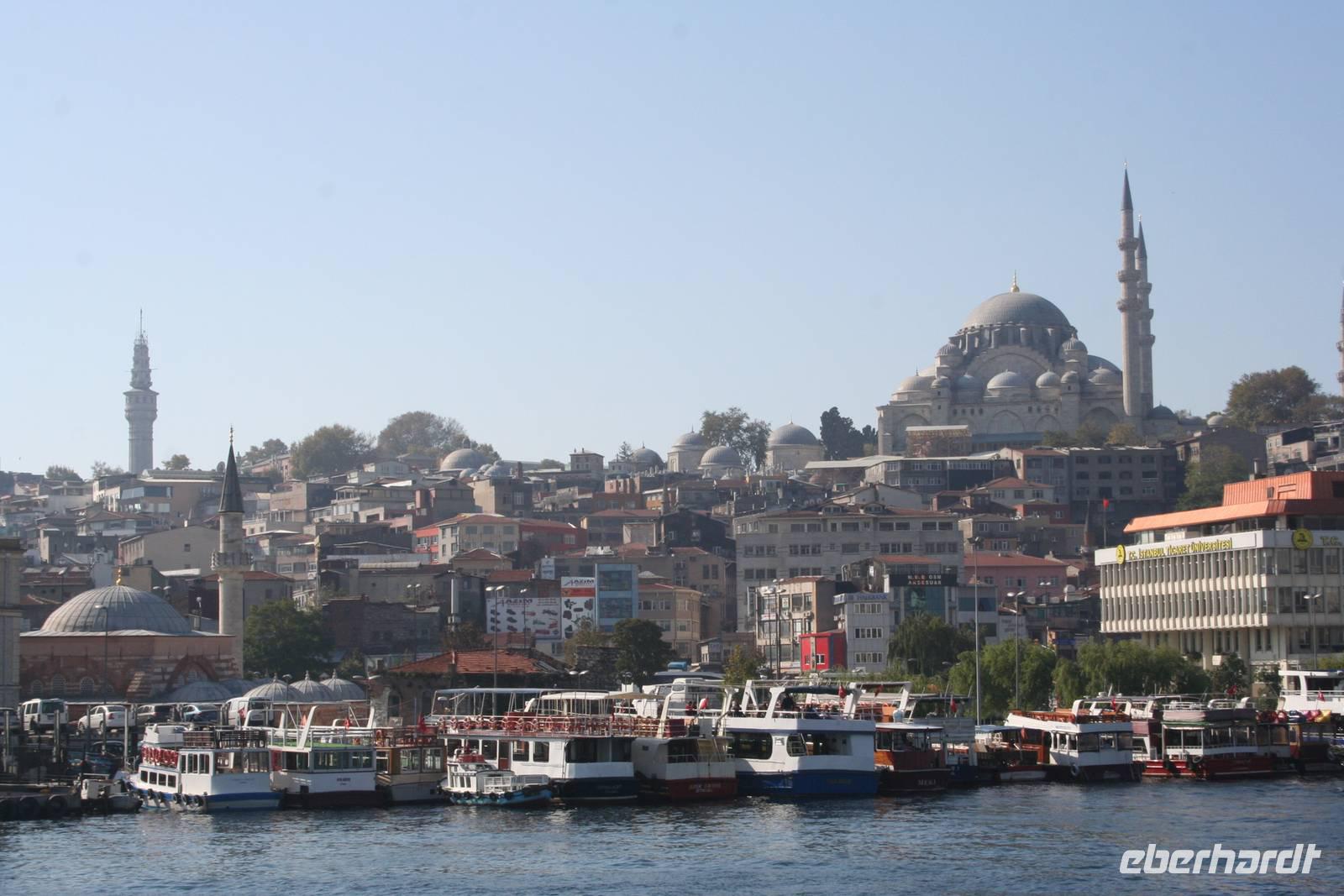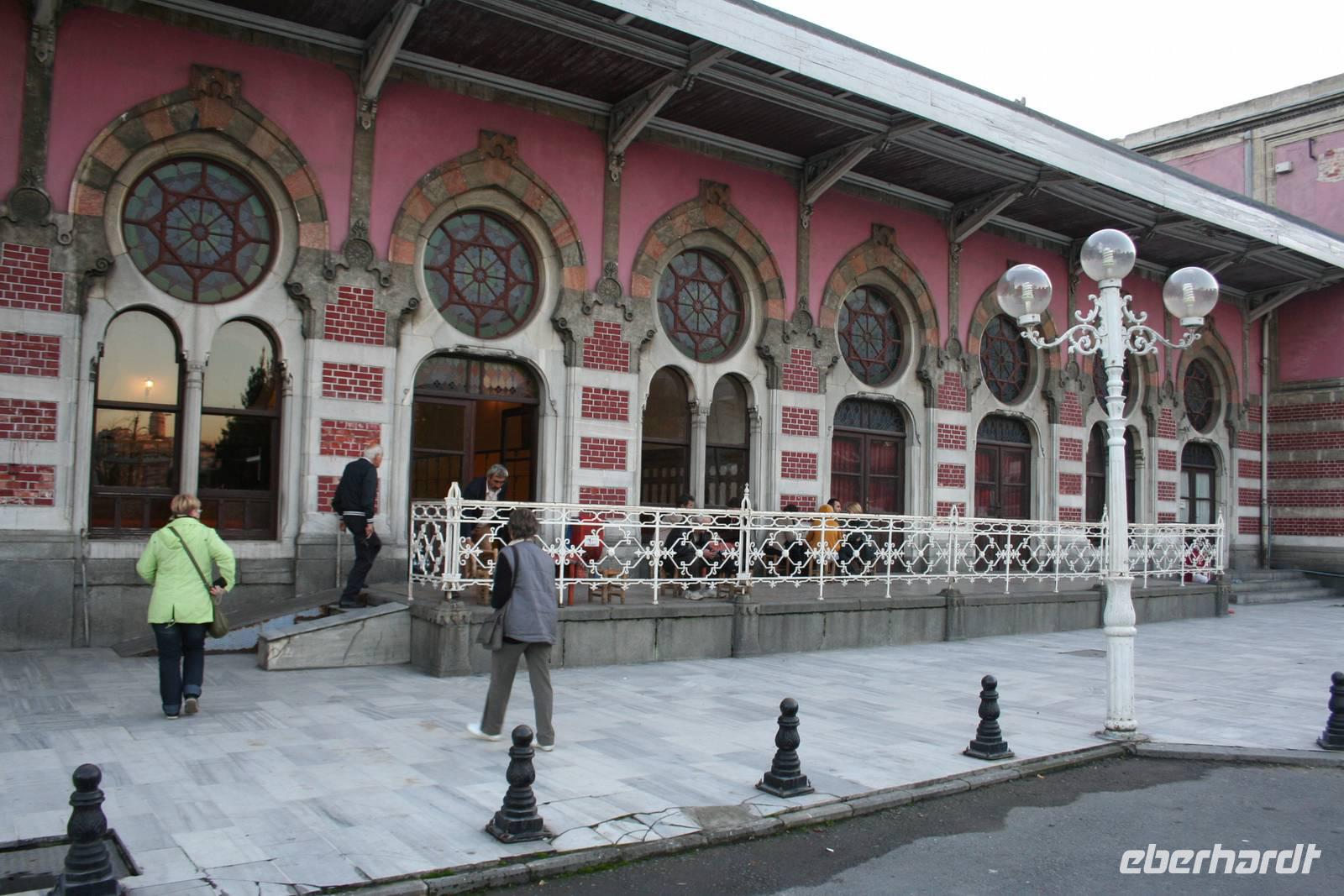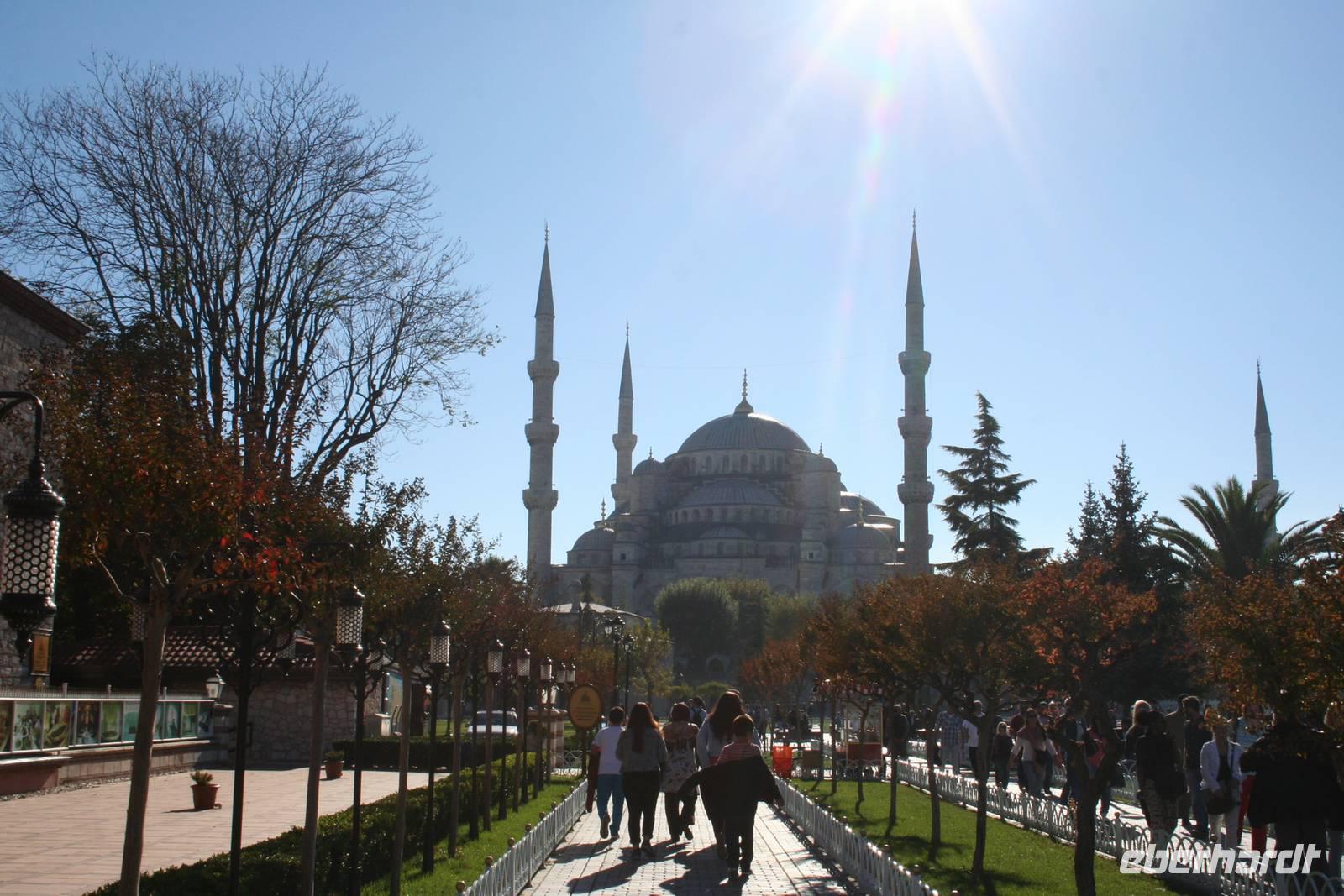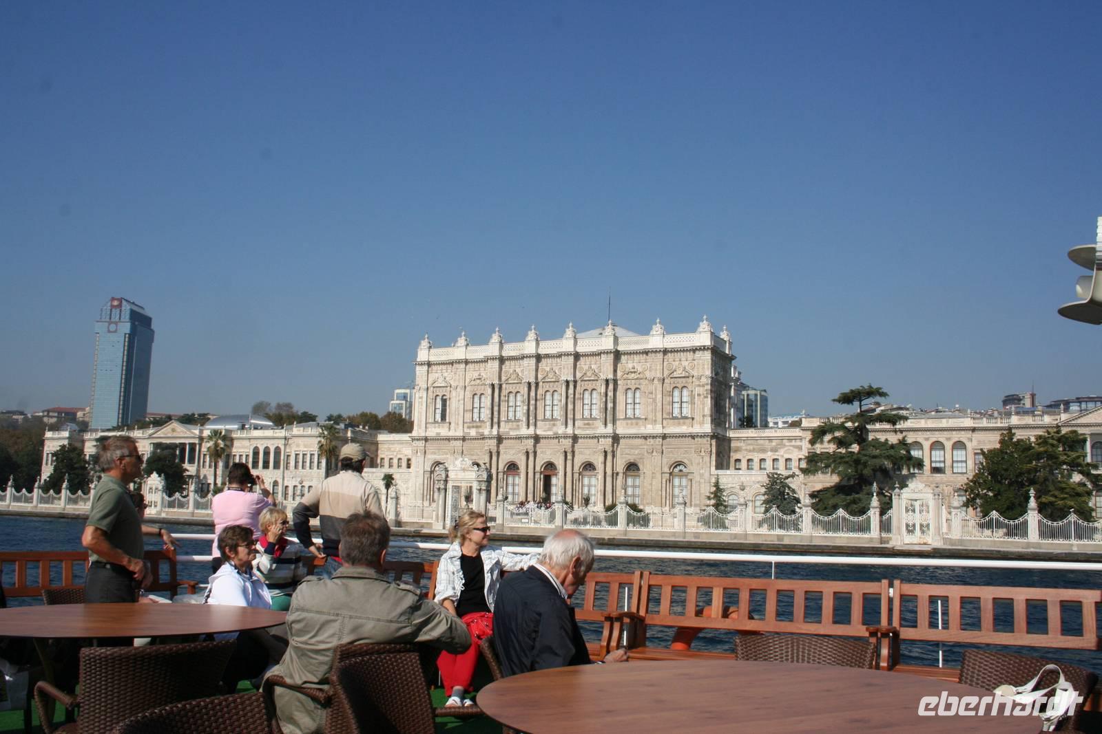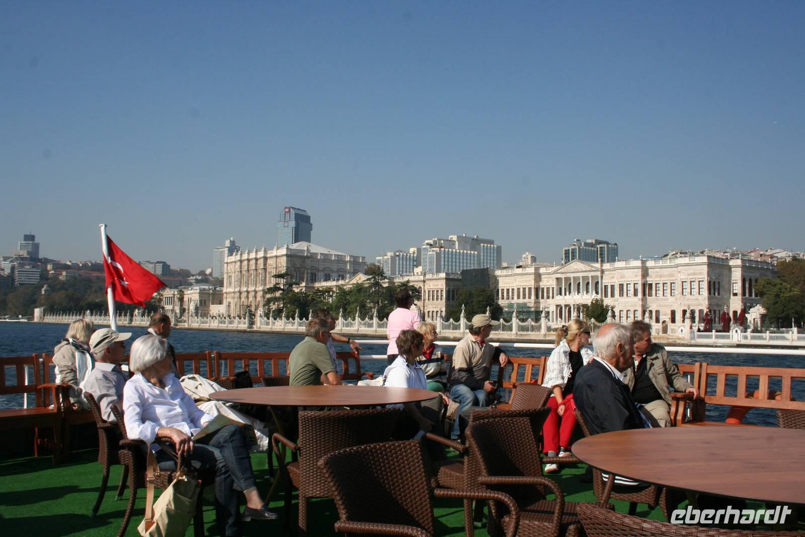 Am Morgen sollte es gleich wieder losgehen zum nächsten ereignisreichen Tag und wir freuten uns auf die Metropole Istanbul. Zuerst statteten wir aber der Großen Moschee in Bursa einen Besuch ab, die Frauen alle stilecht mit Kopftuch. Anschließend besuchten wir den Seidenbasar gleich nebenan, denn in Bursa bekommt man die besten Seidenwaren des Landes. Schließlich brachen wir auf in Richtung Istanbul. Von Yalowa setzten wir mit der Fähre nach Eskihisar über und erreichten schließlich zur Mittagszeit den berühmten Hippodromplatz in Istanbul. Bevor wir unsere große Besichtigung starteten, stärkten wir uns erst einmal mit Köfte, typisch türkischen Frikadellen oder anderen Leckereinen wie kleinen Fleischspießen. Wir begannen unsere Tour am ägyptischen Obelisk und sahen anschließend die Schlangesäule. Dann besuchten wir die imposante und leider sehr volle Blaue Moschee, die ihren Namen von ihrer überwiegend blauen Inneneinrichtung bekam. Im Innenhof sammelten wir uns schließlich wieder und gingen zu Fuß in Richtung Hagia Sophia, deren Besichtigung aber noch einen Tag warten musste, da diese an Montagen stets geschlossen hat. Stattdessen besuchten wir den Topkapi-Palast mit seinen weitläufigen Innenhöfen und genossen die Ruhe in den Palastgärten. Wir sahen uns individuell die verschiedenen ausgestellten Kunstobjekte an und genossen den Blick auf den Bosporus. Schließlich trafen wir uns wieder vor dem großem Eingangstor des Palastes, wo Ahmed uns schon erwartete und uns zu unserem zentral gelegenen Hotel fuhr. Vorher machten wir noch einen kleinen Tankstopp direkt neben dem liebevoll gestaltetem Bahnhofsgebäude, das als Endstation für den weltberühmten Orientexpress dient und konnten einige Fotos schießen. Wir machten uns in unseren Hotelzimmern frisch und fuhren gleich danach in ein stilvolles Restaurant, wo wir ein 3-Gänge-Menü mit nationalen Gerichten serviert bekamen. Anschließend fielen wir müde und voller Eindrücke in unsere Betten und freuten uns auf noch mehr Istanbul am kommenden Tag.