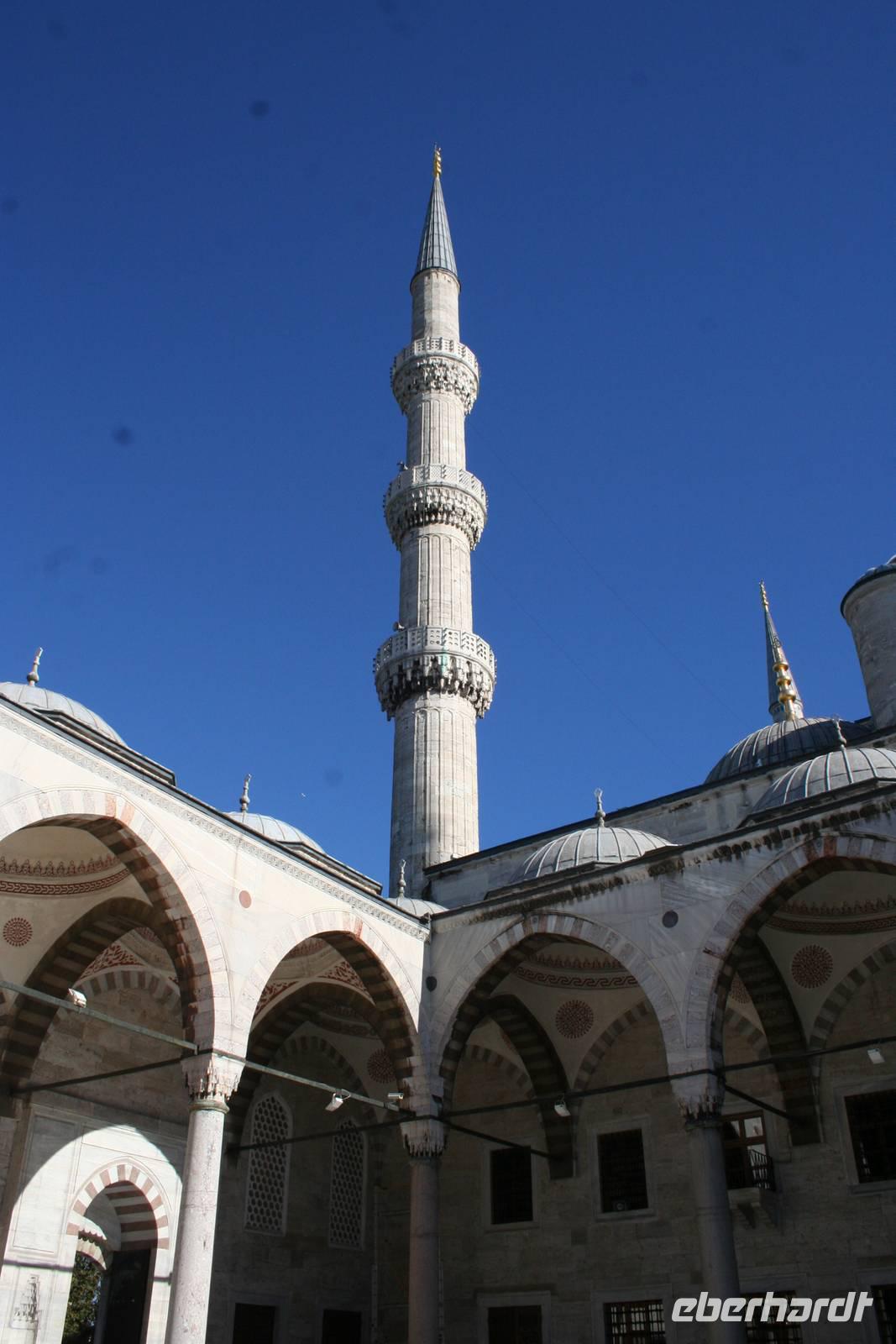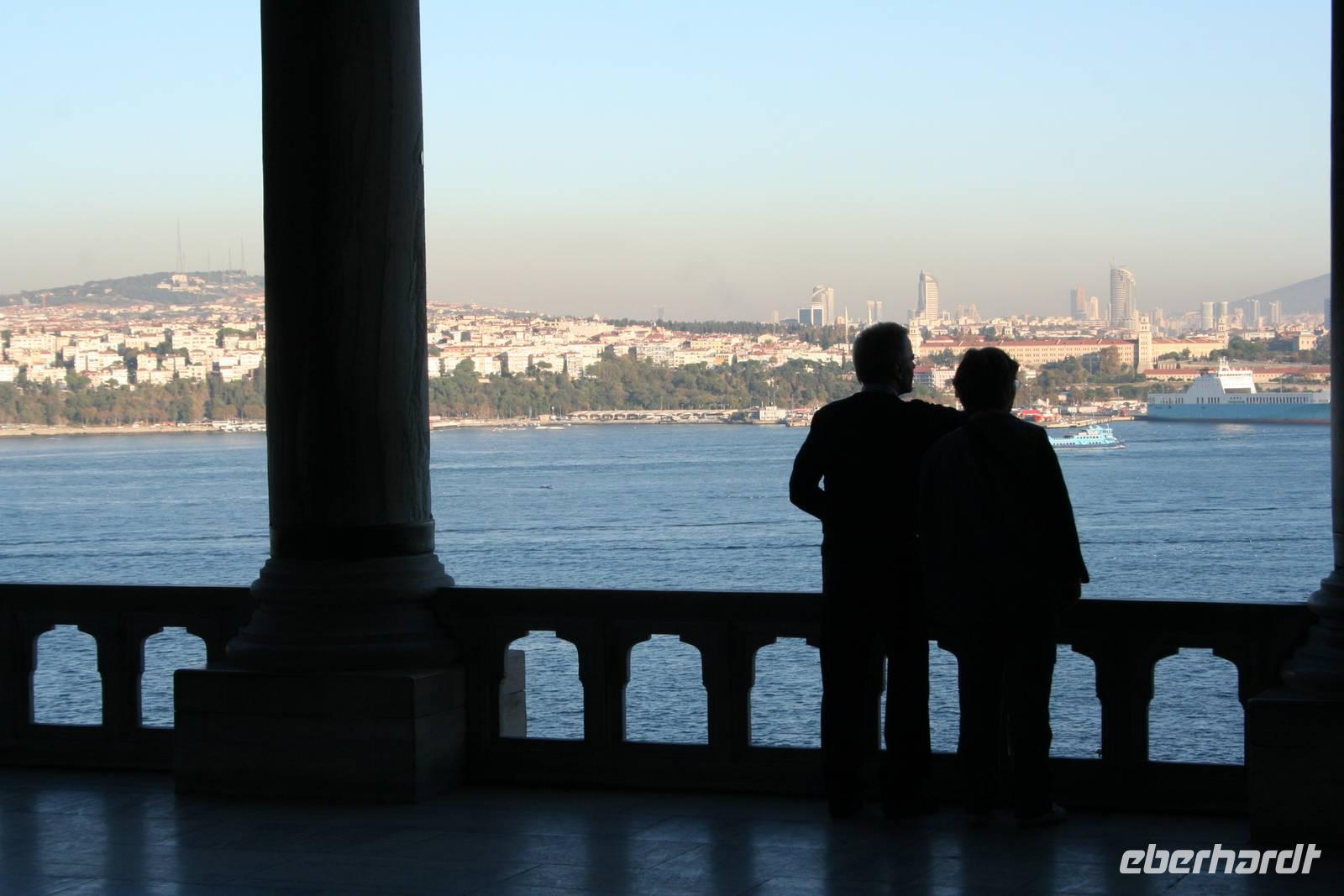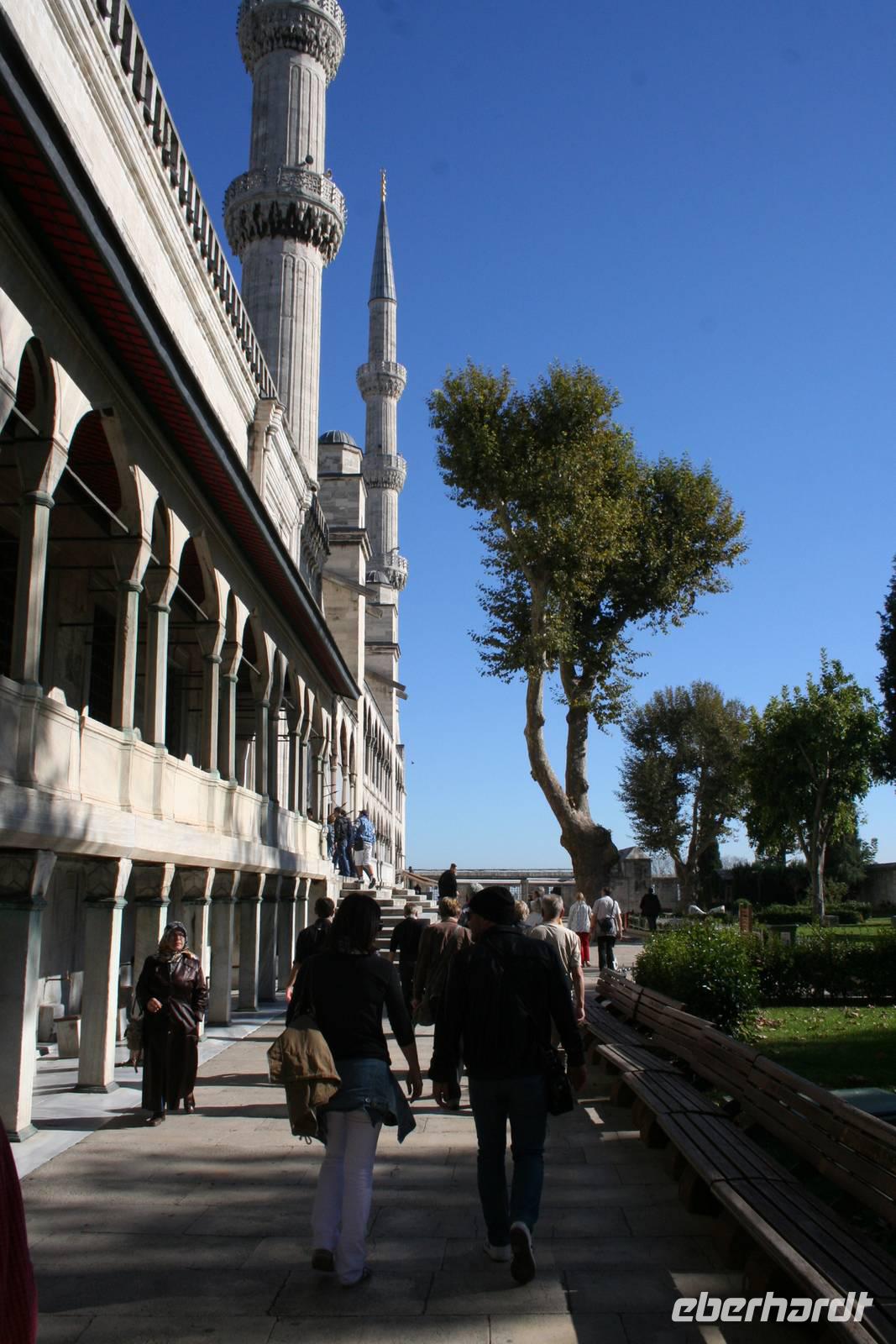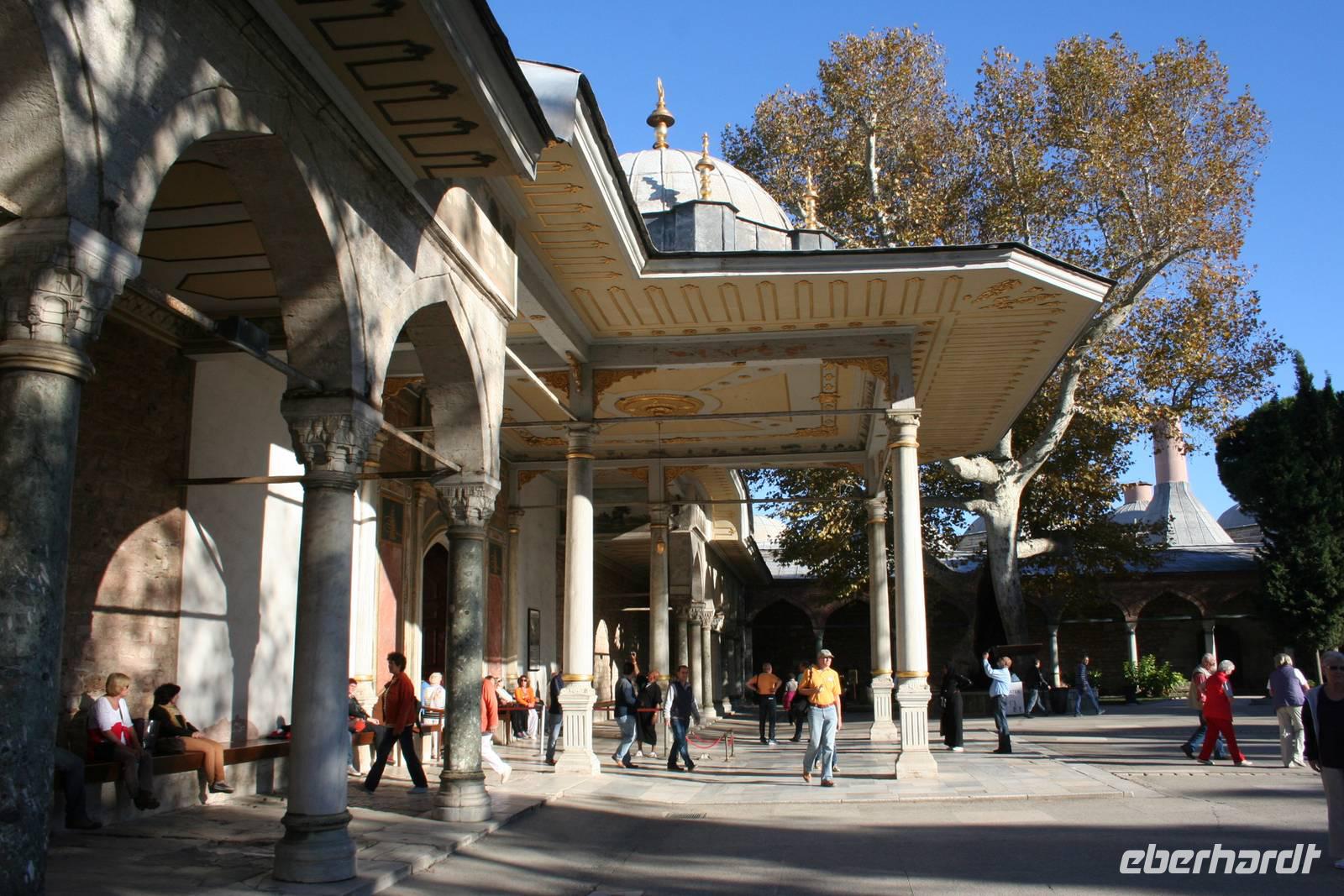 Am Morgen sollte es gleich wieder losgehen zum nächsten ereignisreichen Tag und wir freuten uns auf die Metropole Istanbul. Zuerst statteten wir aber der Großen Moschee in Bursa einen Besuch ab, die Frauen alle stilecht mit Kopftuch. Anschließend besuchten wir den Seidenbasar gleich nebenan, denn in Bursa bekommt man die besten Seidenwaren des Landes. Schließlich brachen wir auf in Richtung Istanbul. Von Yalowa setzten wir mit der Fähre nach Eskihisar über und erreichten schließlich zur Mittagszeit den berühmten Hippodromplatz in Istanbul. Bevor wir unsere große Besichtigung starteten, stärkten wir uns erst einmal mit Köfte, typisch türkischen Frikadellen oder anderen Leckereinen wie kleinen Fleischspießen. Wir begannen unsere Tour am ägyptischen Obelisk und sahen anschließend die Schlangesäule. Dann besuchten wir die imposante und leider sehr volle Blaue Moschee, die ihren Namen von ihrer überwiegend blauen Inneneinrichtung bekam. Im Innenhof sammelten wir uns schließlich wieder und gingen zu Fuß in Richtung Hagia Sophia, deren Besichtigung aber noch einen Tag warten musste, da diese an Montagen stets geschlossen hat. Stattdessen besuchten wir den Topkapi-Palast mit seinen weitläufigen Innenhöfen und genossen die Ruhe in den Palastgärten. Wir sahen uns individuell die verschiedenen ausgestellten Kunstobjekte an und genossen den Blick auf den Bosporus. Schließlich trafen wir uns wieder vor dem großem Eingangstor des Palastes, wo Ahmed uns schon erwartete und uns zu unserem zentral gelegenen Hotel fuhr. Vorher machten wir noch einen kleinen Tankstopp direkt neben dem liebevoll gestaltetem Bahnhofsgebäude, das als Endstation für den weltberühmten Orientexpress dient und konnten einige Fotos schießen. Wir machten uns in unseren Hotelzimmern frisch und fuhren gleich danach in ein stilvolles Restaurant, wo wir ein 3-Gänge-Menü mit nationalen Gerichten serviert bekamen. Anschließend fielen wir müde und voller Eindrücke in unsere Betten und freuten uns auf noch mehr Istanbul am kommenden Tag.