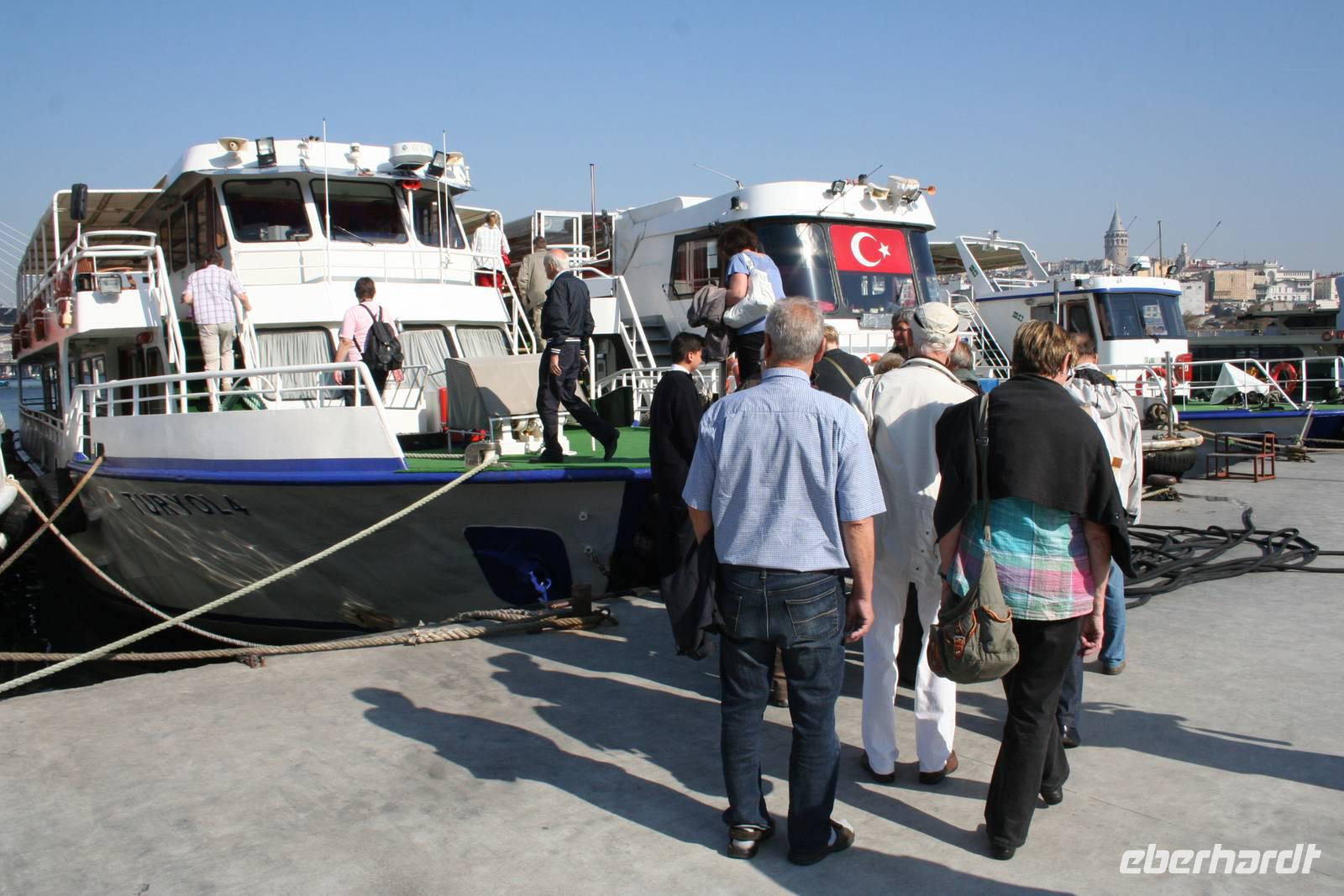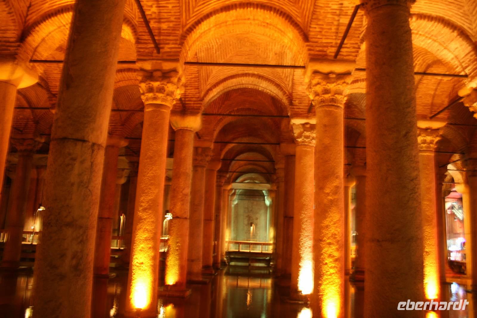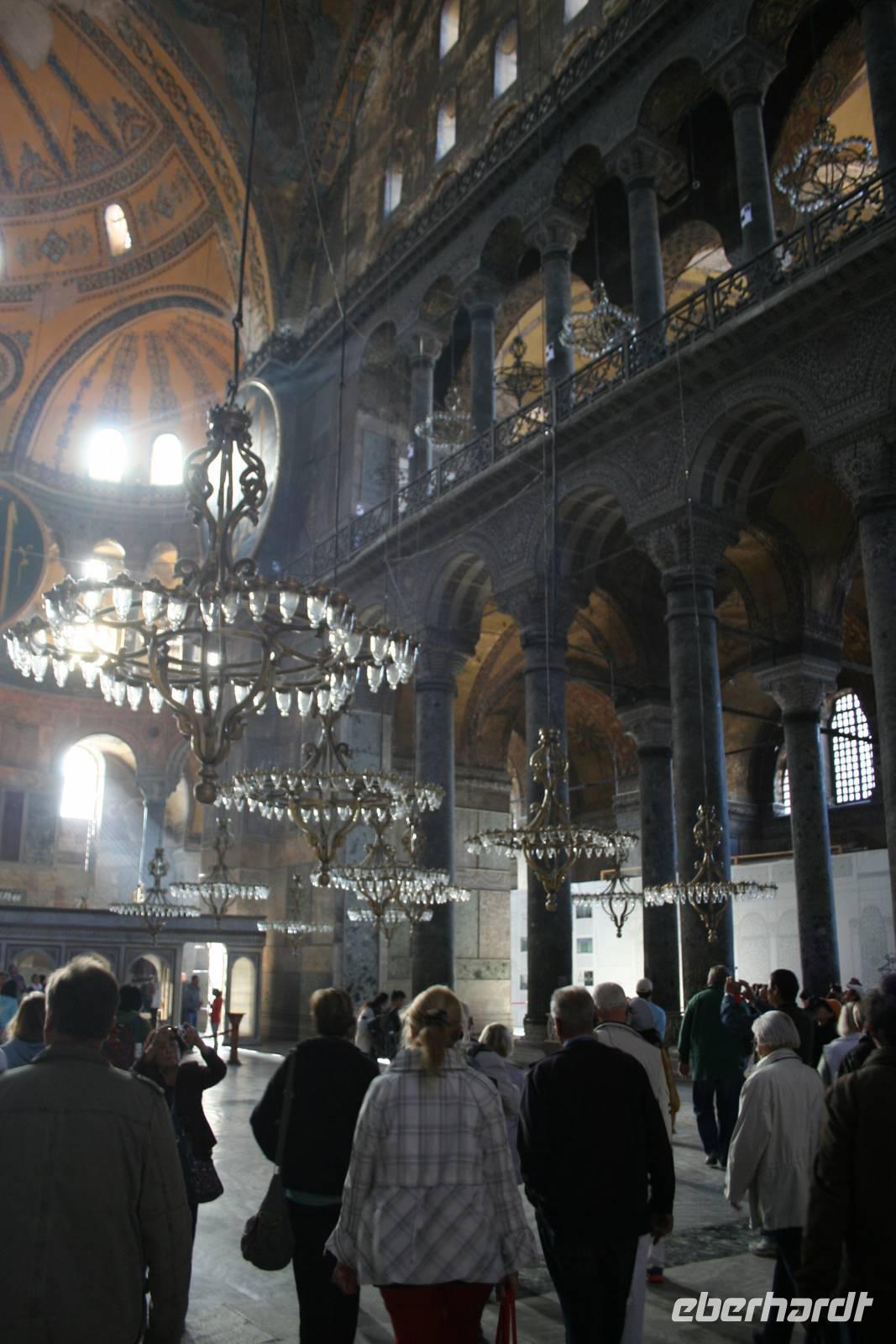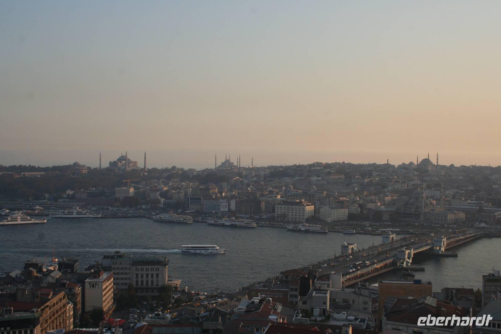 Istabul, die Zweite! Gleich nach dem Frühstück brachen wir auf, um die ersten bei der Hagia Sophia zu sein. Gebannt betrachteten wir die gigantische Kuppel und die zahlreichen massiven Leuchter, die überall von den Decken hingen. Für eindrucksvolle Fotos ein dankbares Objekt! Serdar führte uns durch die Haupthalle und viele Seitenflure und erzählte Wissenswertes zur bewegten Geschichte der Moschee, beziehungsweise Kirche Hagia Sophia. Anschließend gingen wir nur wenige Meter weiter und erreichten die fast schon versteckte unterirdische Zisterne der Stadt, die früher als gewaltiger Trinkwasserspeicher genutzt wurde. Zurück im stahlenden Tageslicht stiegen wir wieder in unseren Bus und fuhren zu Hafen, denn wir wollten die riesige Stadt gern einmal vom Wasser aus erleben. Auf einer Schifffahrt auf dem Bosporus ließen wir die Seele baumeln und bestaunten die modernen Brücken über uns und die zahlreichen historischen Gebäude um uns herum. Zum Mittagessen kehrten wir in ein feines Fischrestaurant direkt an der Promenade ein und konnten beim reichhaltigen Menü den Blick über das Wasser schweifen lassen. Anschließend wurden wir von Ahmed wieder aufgelesen und fuhren zurück in die Innenstadt zum ägyptischen Basar. Natürlich wird hier schon lange nicht mehr so gefeilscht und gehandelt, wie es immernoch bei uns vermutet wird, aber die vielen kleinen Läden und Stände inmitten der engen Gassen versprühen trotzdem ihr orientalisches Flair. Durch den chaotischen Verkehr schlängelten wir uns wieder zurück zu unserem Hotel und spazierten von dort direkt zum Galata-Turm, der sich gleich in nächster Nähe befand. Wir fuhren bis hinauf zur Spitze und betrachteten den wundervollen Sonnenuntergang über den tausenden Dächern der Stadt. Danach konnte jeder nach Lust und Laune allein ins Hotel zurückfinden oder sich in den umliegenden Straßen ein wenig umschauen. Zum Abendessen fuhren wir in das exklusive Restaurant „Keravanserey" und wurden verwöhnt mit köstlichem Essen und der unterhaltsamen „Istabul bei Nacht"-Show, die uns zahlreiche Tanz- und Akrobatikeinlagen bot, nicht zu vergessen einem talentierten mehrsprachigen Sänger und der besten Bauchtänzerin Istanbuls. Müde, aber satt und glücklich sagten wir der Stadt auf Wiedersehen und kehrten zu letzten Übernachtung in der Metropole Istanbul zurück ins Hotel.