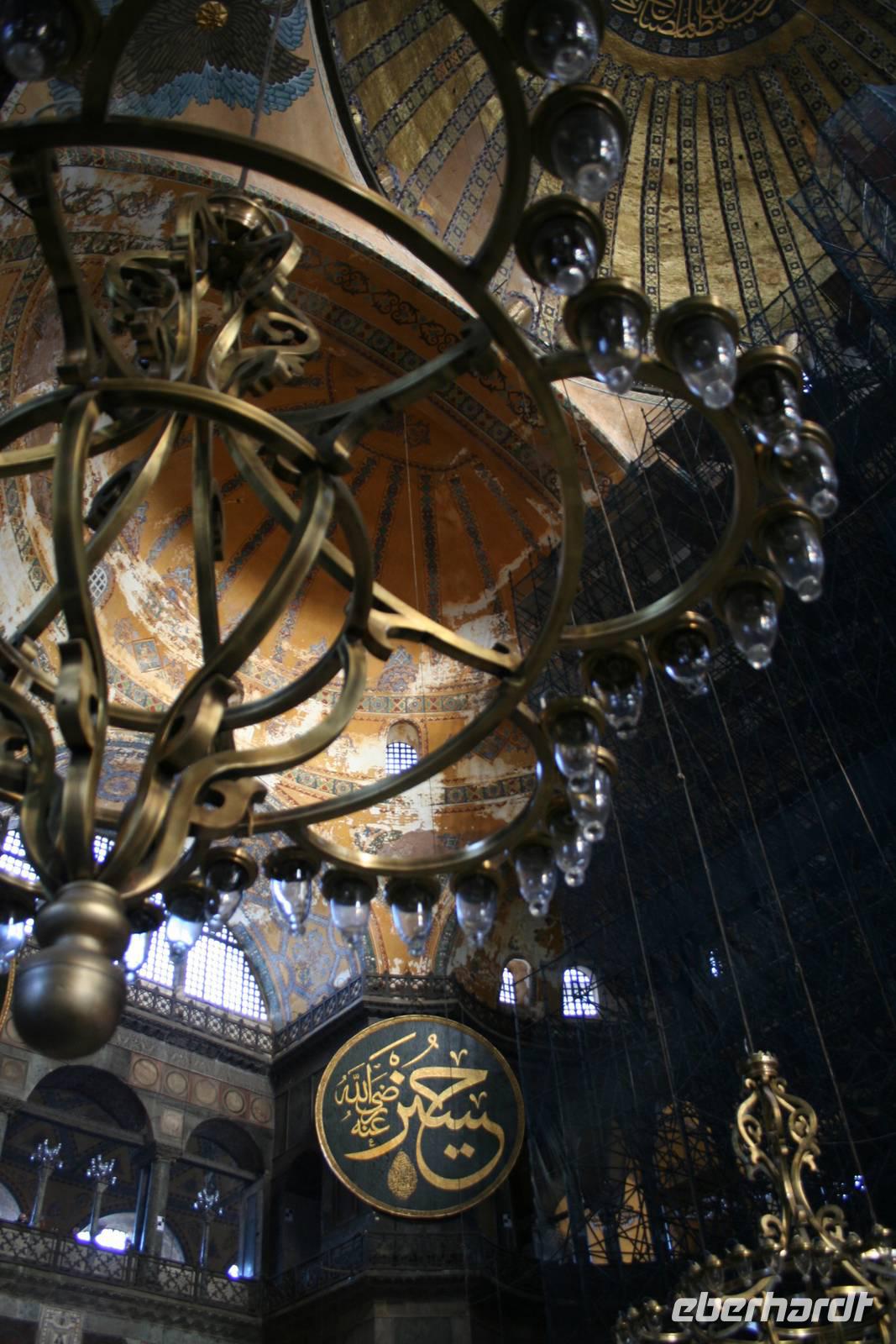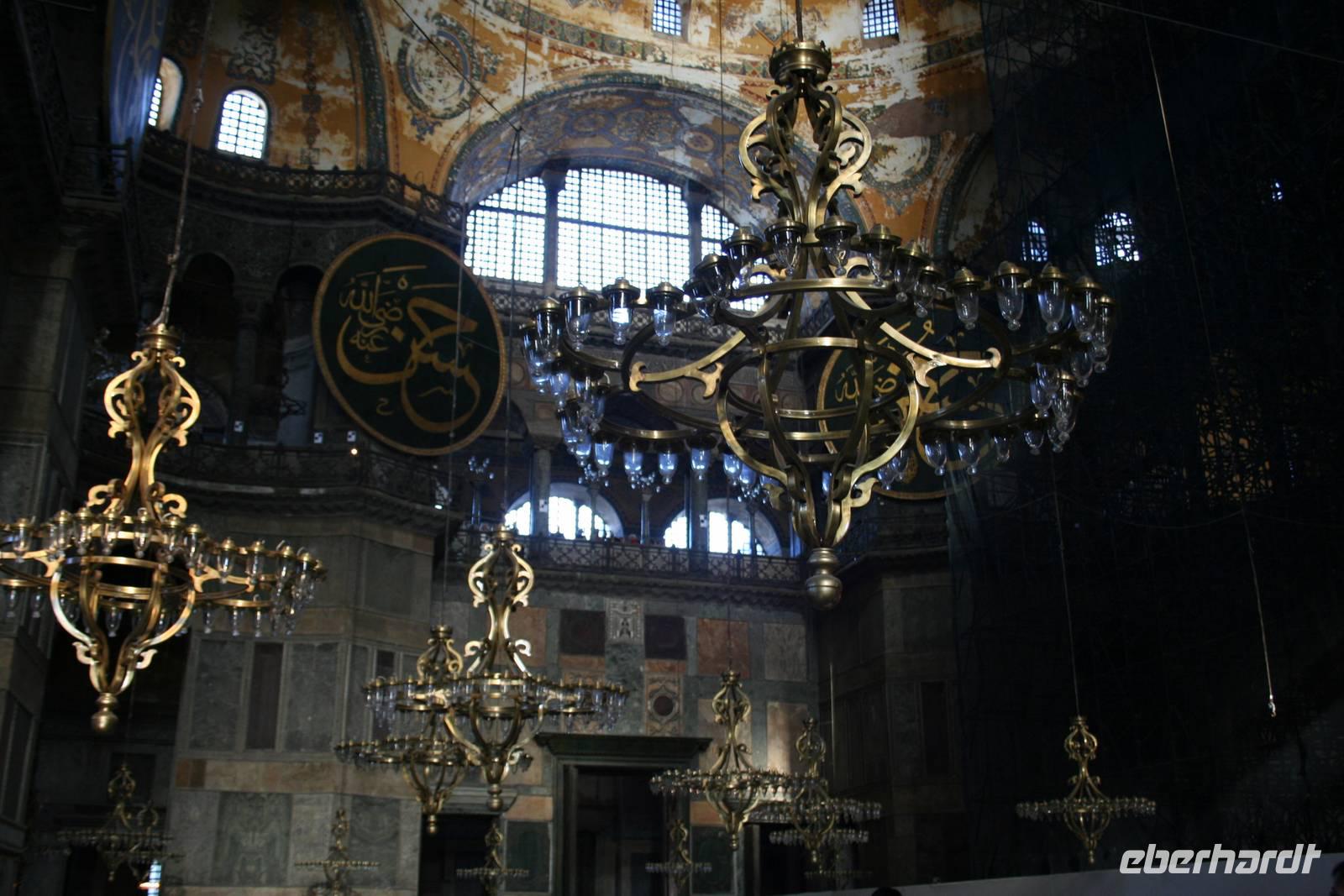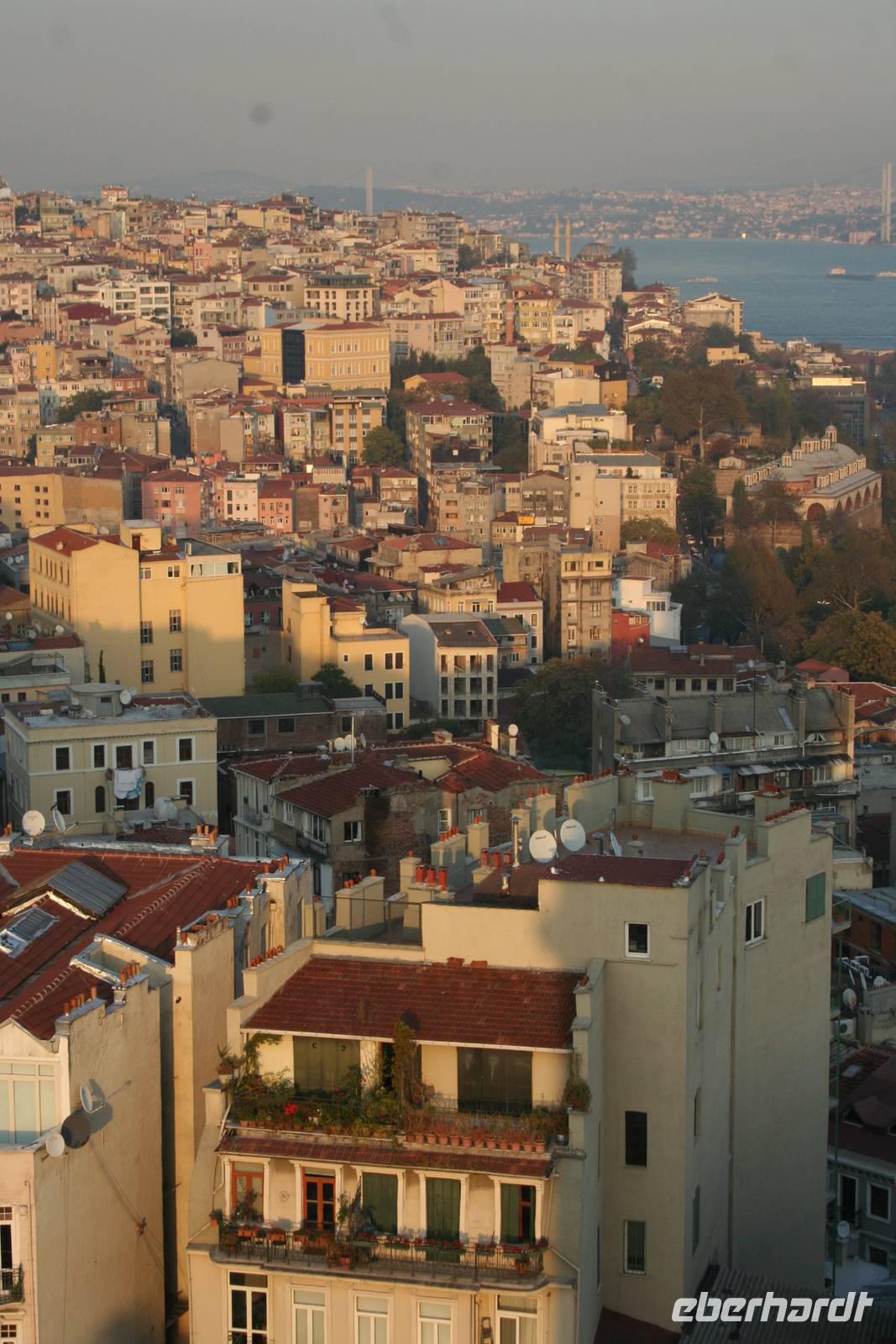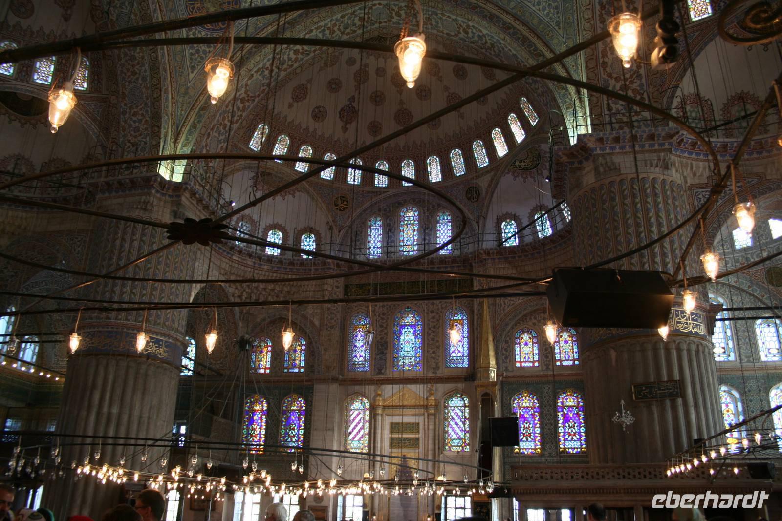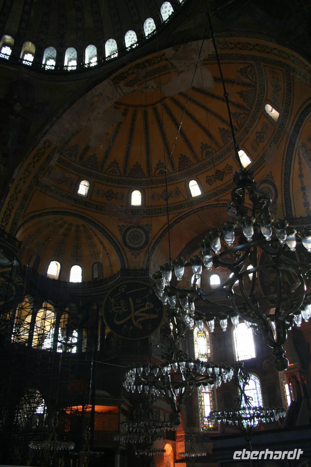 Istabul, die Zweite! Gleich nach dem Frühstück brachen wir auf, um die ersten bei der Hagia Sophia zu sein. Gebannt betrachteten wir die gigantische Kuppel und die zahlreichen massiven Leuchter, die überall von den Decken hingen. Für eindrucksvolle Fotos ein dankbares Objekt! Serdar führte uns durch die Haupthalle und viele Seitenflure und erzählte Wissenswertes zur bewegten Geschichte der Moschee, beziehungsweise Kirche Hagia Sophia. Anschließend gingen wir nur wenige Meter weiter und erreichten die fast schon versteckte unterirdische Zisterne der Stadt, die früher als gewaltiger Trinkwasserspeicher genutzt wurde. Zurück im stahlenden Tageslicht stiegen wir wieder in unseren Bus und fuhren zu Hafen, denn wir wollten die riesige Stadt gern einmal vom Wasser aus erleben. Auf einer Schifffahrt auf dem Bosporus ließen wir die Seele baumeln und bestaunten die modernen Brücken über uns und die zahlreichen historischen Gebäude um uns herum. Zum Mittagessen kehrten wir in ein feines Fischrestaurant direkt an der Promenade ein und konnten beim reichhaltigen Menü den Blick über das Wasser schweifen lassen. Anschließend wurden wir von Ahmed wieder aufgelesen und fuhren zurück in die Innenstadt zum ägyptischen Basar. Natürlich wird hier schon lange nicht mehr so gefeilscht und gehandelt, wie es immernoch bei uns vermutet wird, aber die vielen kleinen Läden und Stände inmitten der engen Gassen versprühen trotzdem ihr orientalisches Flair. Durch den chaotischen Verkehr schlängelten wir uns wieder zurück zu unserem Hotel und spazierten von dort direkt zum Galata-Turm, der sich gleich in nächster Nähe befand. Wir fuhren bis hinauf zur Spitze und betrachteten den wundervollen Sonnenuntergang über den tausenden Dächern der Stadt. Danach konnte jeder nach Lust und Laune allein ins Hotel zurückfinden oder sich in den umliegenden Straßen ein wenig umschauen. Zum Abendessen fuhren wir in das exklusive Restaurant „Keravanserey" und wurden verwöhnt mit köstlichem Essen und der unterhaltsamen „Istabul bei Nacht"-Show, die uns zahlreiche Tanz- und Akrobatikeinlagen bot, nicht zu vergessen einem talentierten mehrsprachigen Sänger und der besten Bauchtänzerin Istanbuls. Müde, aber satt und glücklich sagten wir der Stadt auf Wiedersehen und kehrten zu letzten Übernachtung in der Metropole Istanbul zurück ins Hotel.