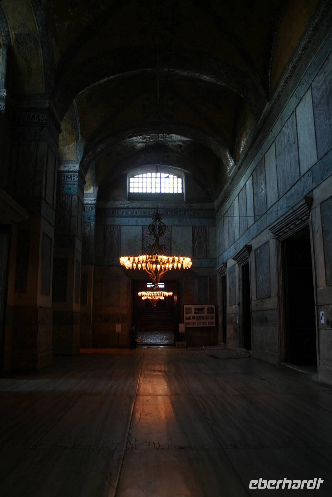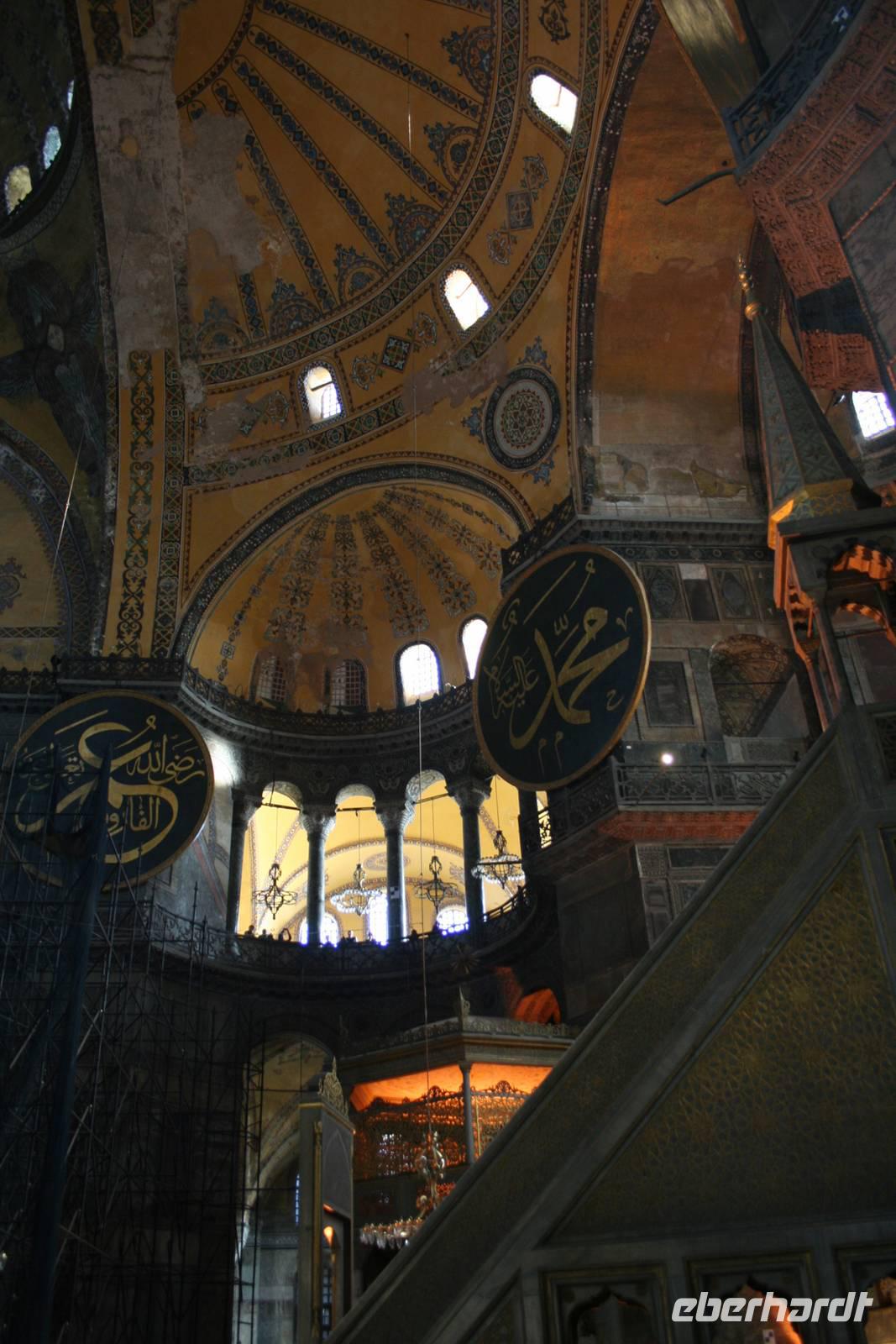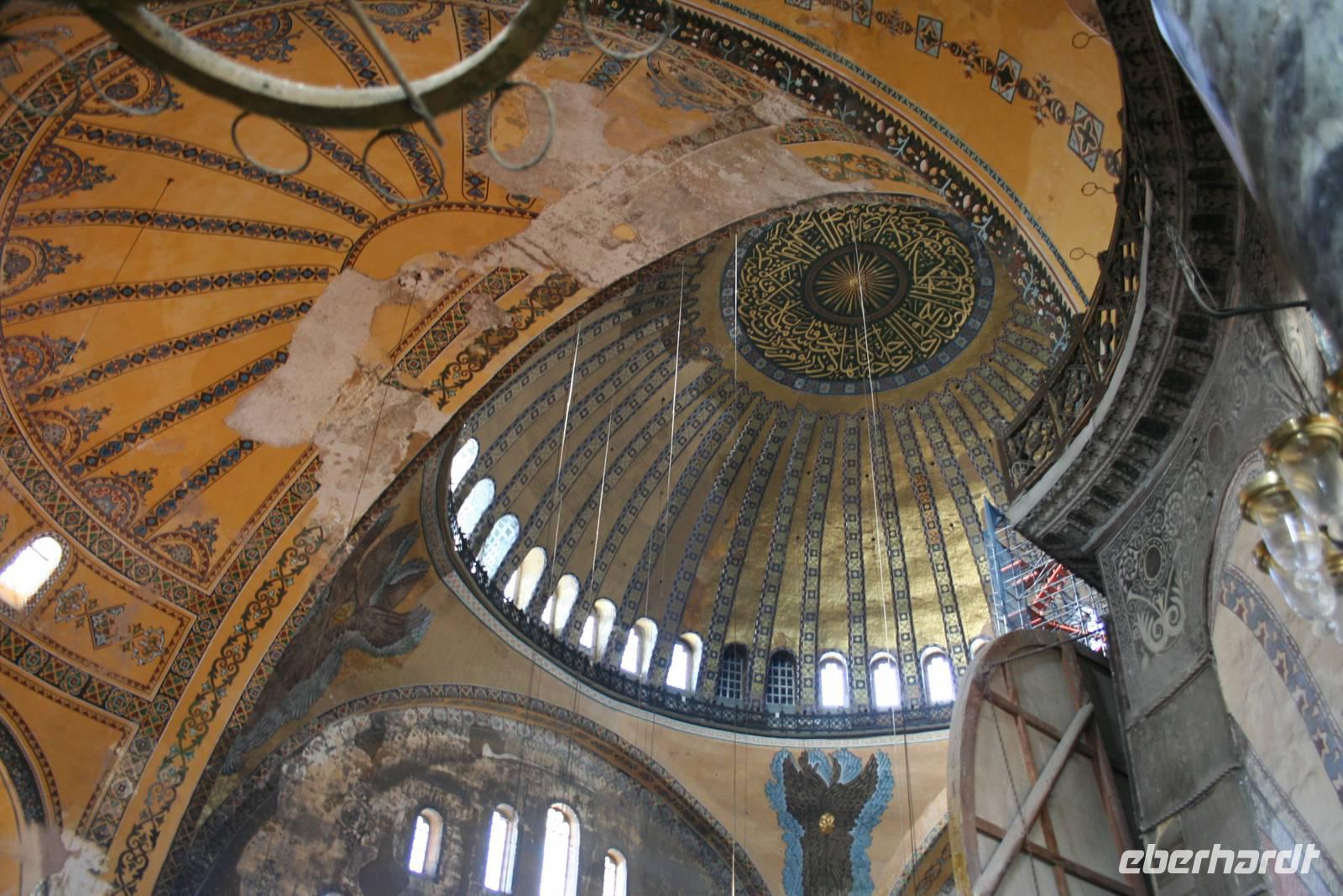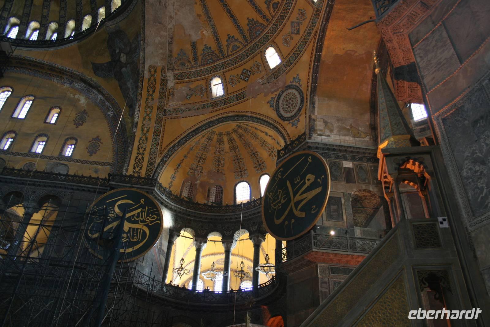 Istabul, die Zweite! Gleich nach dem Frühstück brachen wir auf, um die ersten bei der Hagia Sophia zu sein. Gebannt betrachteten wir die gigantische Kuppel und die zahlreichen massiven Leuchter, die überall von den Decken hingen. Für eindrucksvolle Fotos ein dankbares Objekt! Serdar führte uns durch die Haupthalle und viele Seitenflure und erzählte Wissenswertes zur bewegten Geschichte der Moschee, beziehungsweise Kirche Hagia Sophia. Anschließend gingen wir nur wenige Meter weiter und erreichten die fast schon versteckte unterirdische Zisterne der Stadt, die früher als gewaltiger Trinkwasserspeicher genutzt wurde. Zurück im stahlenden Tageslicht stiegen wir wieder in unseren Bus und fuhren zu Hafen, denn wir wollten die riesige Stadt gern einmal vom Wasser aus erleben. Auf einer Schifffahrt auf dem Bosporus ließen wir die Seele baumeln und bestaunten die modernen Brücken über uns und die zahlreichen historischen Gebäude um uns herum. Zum Mittagessen kehrten wir in ein feines Fischrestaurant direkt an der Promenade ein und konnten beim reichhaltigen Menü den Blick über das Wasser schweifen lassen. Anschließend wurden wir von Ahmed wieder aufgelesen und fuhren zurück in die Innenstadt zum ägyptischen Basar. Natürlich wird hier schon lange nicht mehr so gefeilscht und gehandelt, wie es immernoch bei uns vermutet wird, aber die vielen kleinen Läden und Stände inmitten der engen Gassen versprühen trotzdem ihr orientalisches Flair. Durch den chaotischen Verkehr schlängelten wir uns wieder zurück zu unserem Hotel und spazierten von dort direkt zum Galata-Turm, der sich gleich in nächster Nähe befand. Wir fuhren bis hinauf zur Spitze und betrachteten den wundervollen Sonnenuntergang über den tausenden Dächern der Stadt. Danach konnte jeder nach Lust und Laune allein ins Hotel zurückfinden oder sich in den umliegenden Straßen ein wenig umschauen. Zum Abendessen fuhren wir in das exklusive Restaurant „Keravanserey" und wurden verwöhnt mit köstlichem Essen und der unterhaltsamen „Istabul bei Nacht"-Show, die uns zahlreiche Tanz- und Akrobatikeinlagen bot, nicht zu vergessen einem talentierten mehrsprachigen Sänger und der besten Bauchtänzerin Istanbuls. Müde, aber satt und glücklich sagten wir der Stadt auf Wiedersehen und kehrten zu letzten Übernachtung in der Metropole Istanbul zurück ins Hotel.