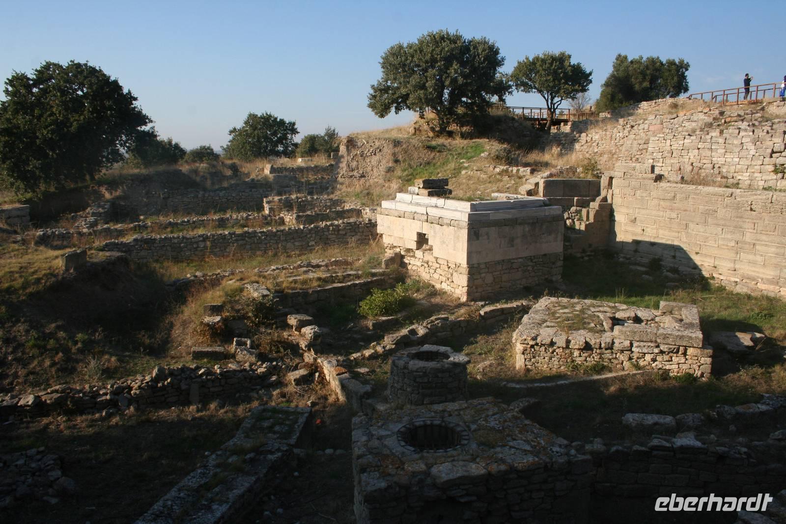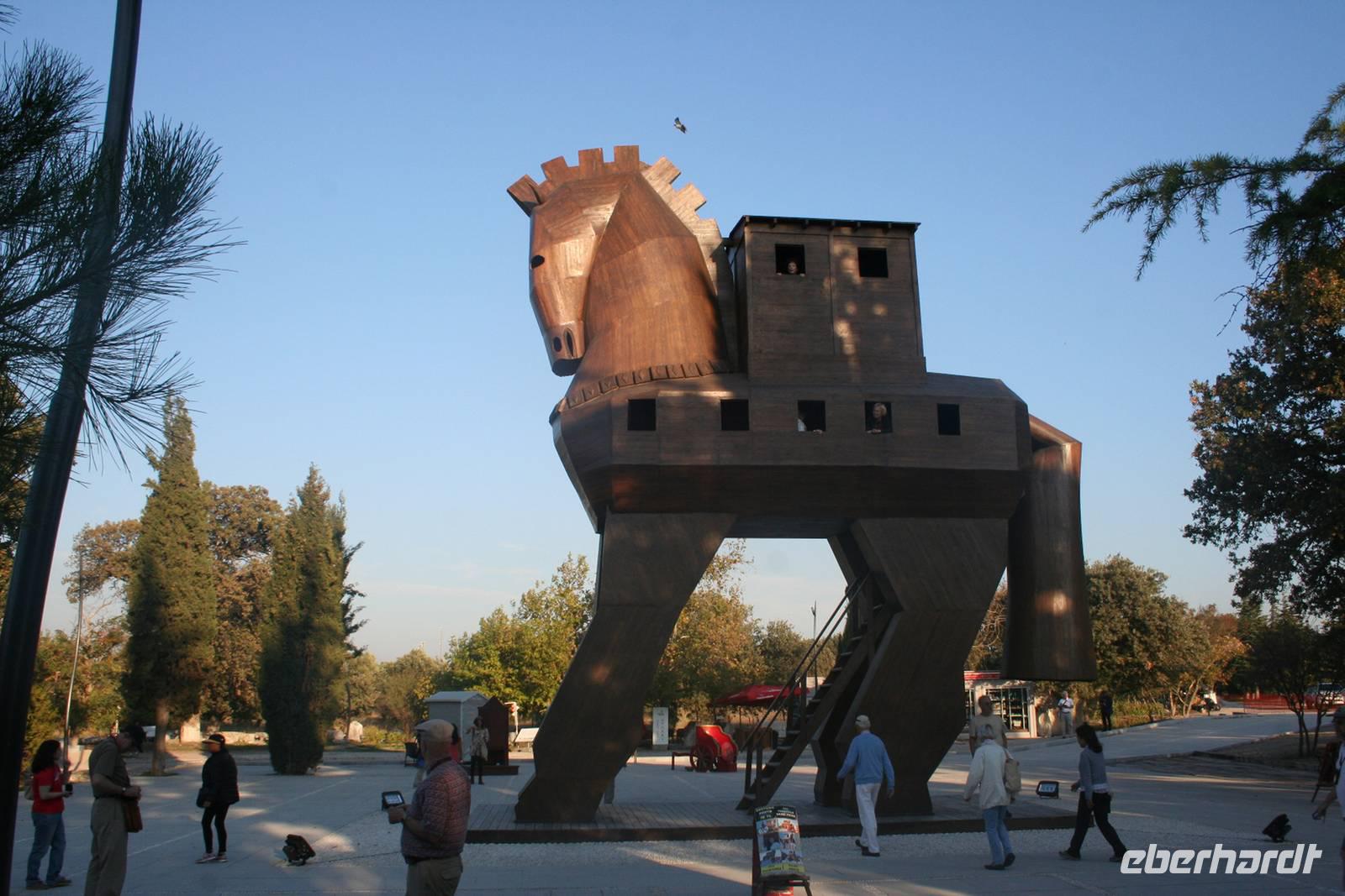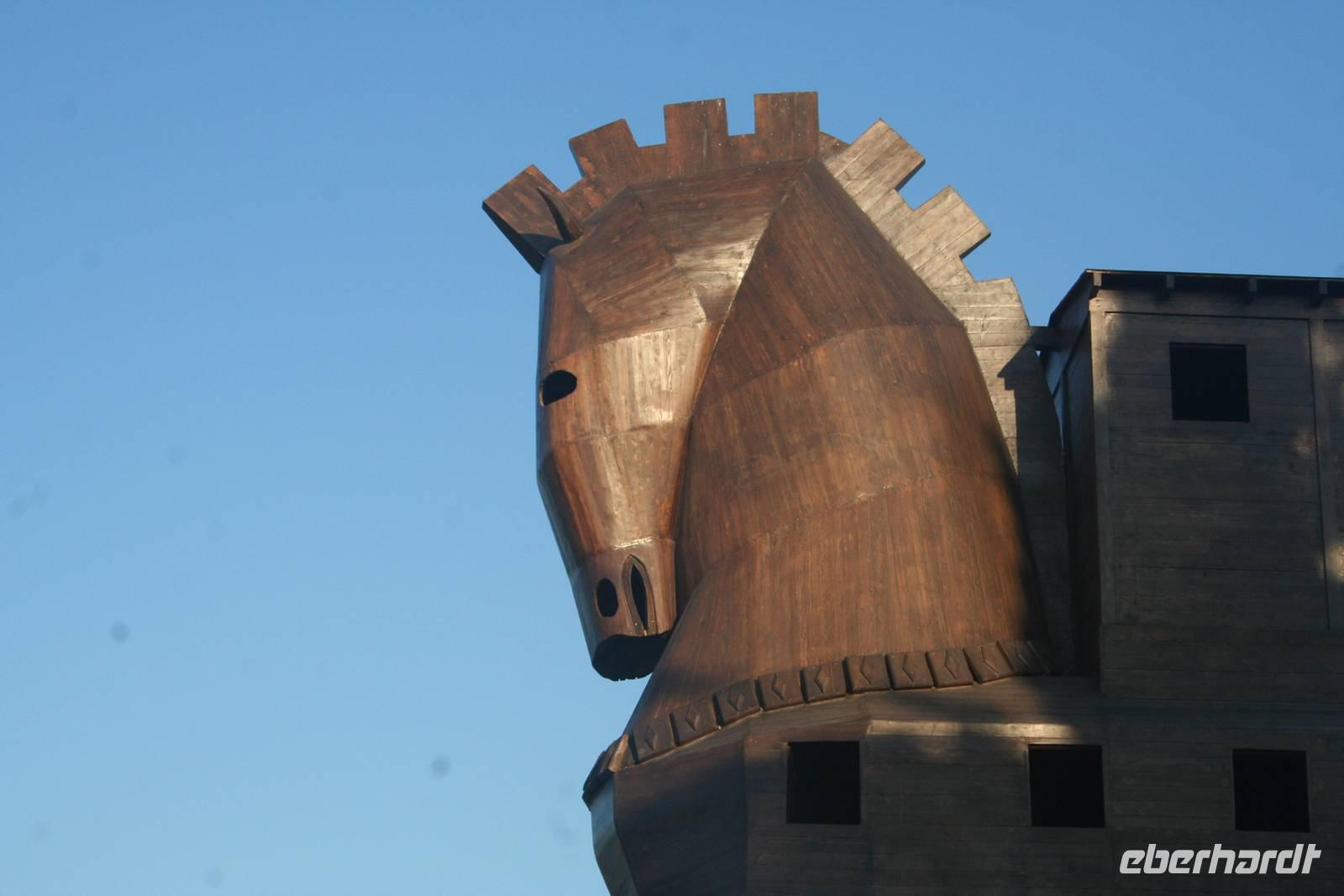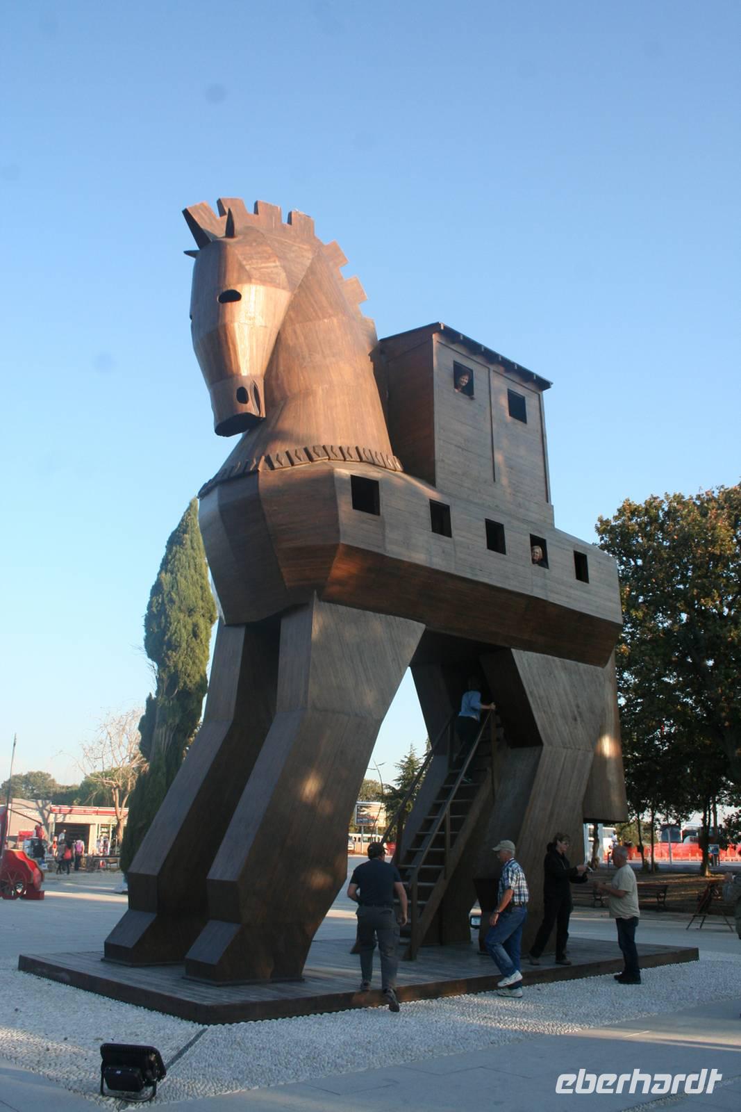 Sehr zeitig, um den Berufverkehr in der Innenstadt zu vermeiden, brachen wir aus Istanbul auf, allerdings gerieten wir leider doch in einen, für die Stadt typischen, Stau. Vor dem Fährhafen in Galiboli konnte jeder nach Wunsch selbst hergestellte Fischkonserven direkt in einem kleinen Laden einer regionalen Fischfabrik erwerben. Wir setzten mit der Fähre über nach Lapsek und ruhten uns auf der langen Fahrt nach Troja etwas vom Großstadtgetümmel aus. Natürlich hatte Serdar wieder viel Wissenswertes über Land und Leute zu erzählen, so dass niemandem langweilig wurde. Zum Mittagessen gab es für uns auf Holzkohle gegrillte Dorade in einem Restaurant bei Troja. Dieses erreichten wir dann am frühen Nachmittag und besichtigten in aller Ruhe die historische Ausgrabungsstätte, die Heinrich Schliemann zu Weltruhm verhalf. Wir konnten nach Lust und Laune das große (leider nur nachgebaute) trojanische Pferd erklimmen und uns davor fotografieren lassen, bis wir schließlich die Weiterreise zum heutigen Hotel in Canakkale antraten. Trotz fortgeschrittener Uhrzeit hielten einige noch die Füße ins Meer, das sich direkt vorm Hotel befand. Morgen sollte es schließlich wieder zu auf neuen Abenteuern gehen.