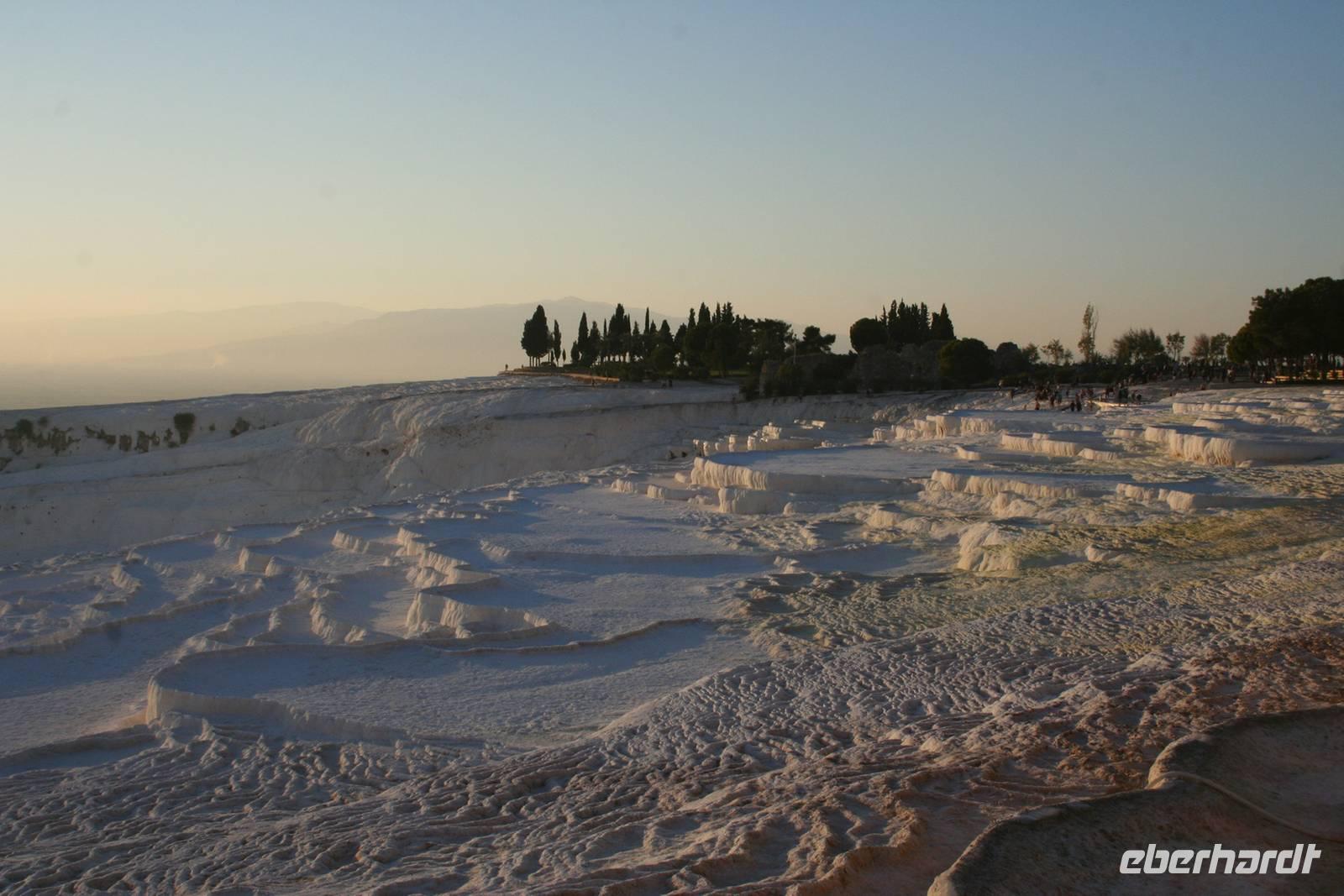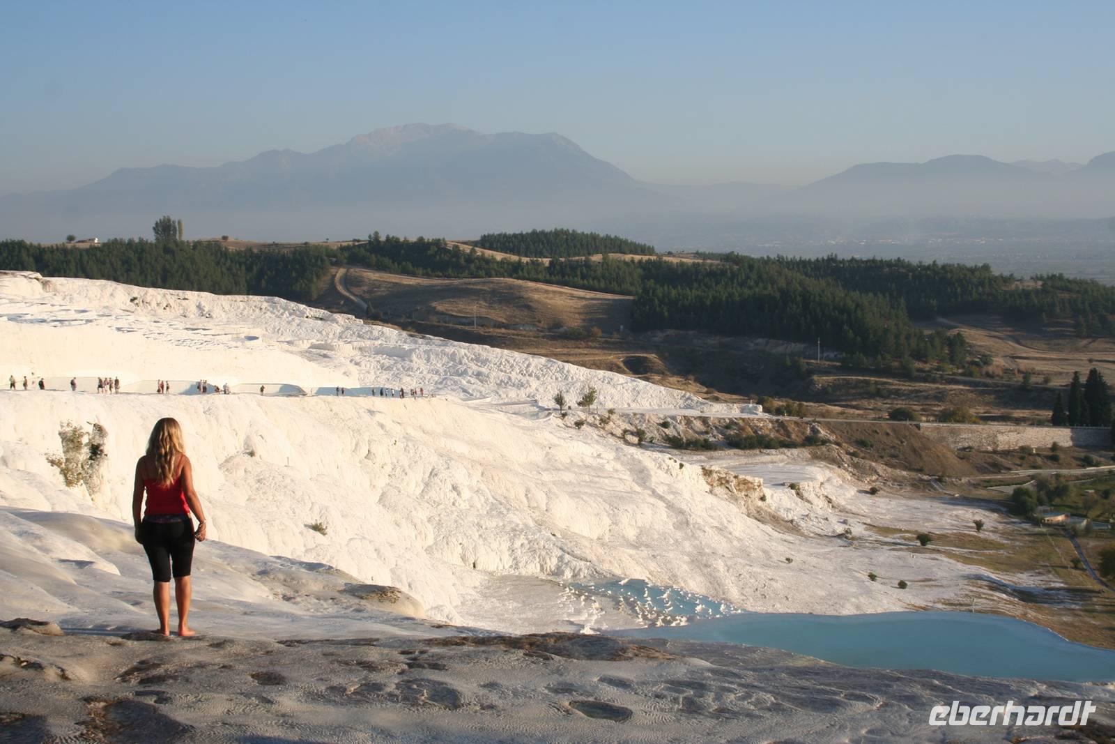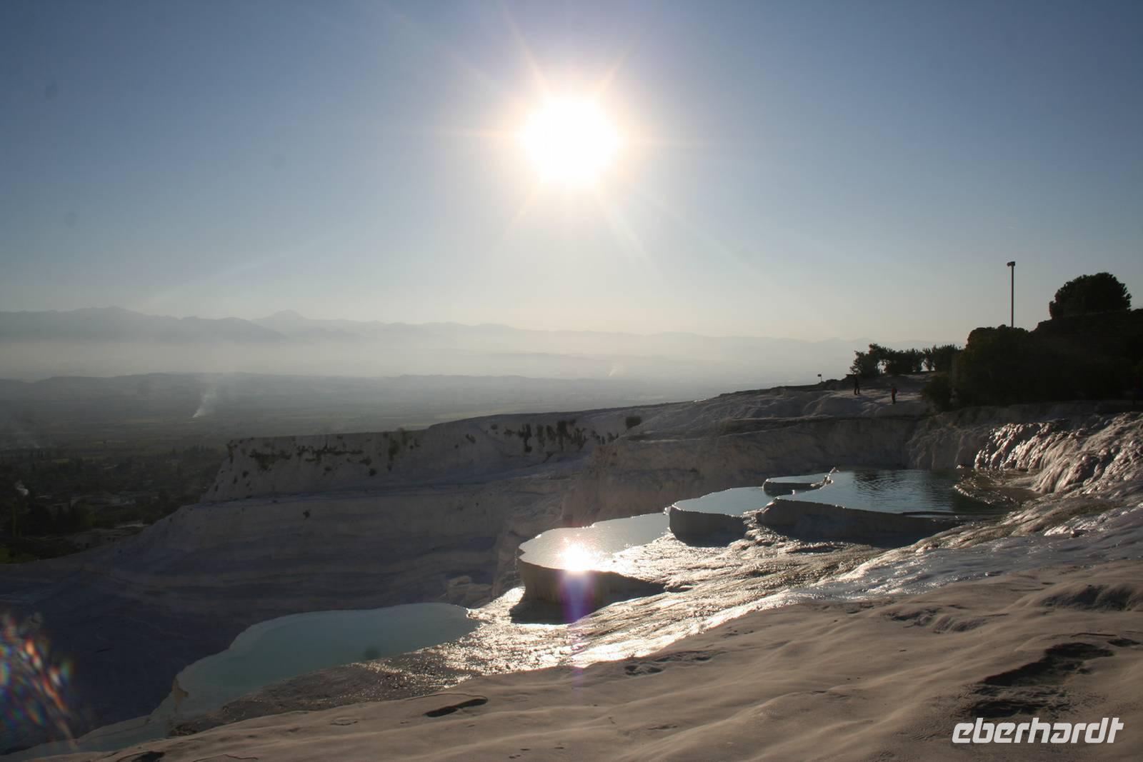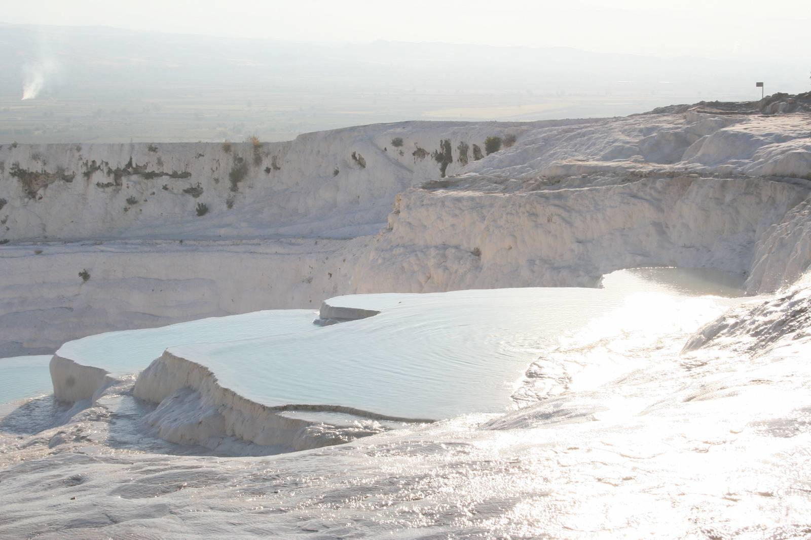 Bereits routiniert luden wir nach dem Frühstück wieder unser Gepäck und fuhren weiter in Richtung Süden, um die nächste antike Stadt zu erobern: Ephesus! Die gewältige Ausgrabungsstätte bot sehr viel zu sehen und ließ uns erahnen, welche Pracht hier früher geherrscht haben musste und mit wie viel architektonischem Wissen vor so langer Zeit bereits gearbeitet wurde. Zwischen zahlreichen anderen Reisenden schlängelten wir uns die abfallende Straße entlang bis zur überraschend großen Ruine der Bibliothek von Celsius, bis wir schließlich das Theater erreichten. Serdars laute Stimme garantierte, dass wir garantiert niemanden im Getümmel verlieren konnten und wir erreichten wohlbehalten den ebenso belebten Busparkplatz, auf dem Ahmed uns erwartete. Weiter ging die Fahrt zu einem ganz besonderen Naturerbe: den Kalksinterterrassen von Pamukkale. Bereits von unten konnten wir die Schönheit dieser Gesteinsformation erahnen und oben angelangt spazierten wir im Spätnachmittagslicht durch die antiken Ruinen bis in die gepflegten Thermalanlagen. Mit reichlich Freizeiz im Gepäck konnten wir die tolle Aussicht und den Anblick der strahlendweißen Steine genießen und barfuß auf den, mit warmen Quellwasser überdeckten, Terrassen spazieren gehen. Sogar baden war erlaubt. Hocherfreut über dieses einzigartige Erlebnis schlenderten wir den Weg durch die Anlage zurück und erreichten am frühen Abend unser Hotel in Pamukkale, wo wir nach Wunsch im hoteleigenen Thermalbecken entspannen konnten.