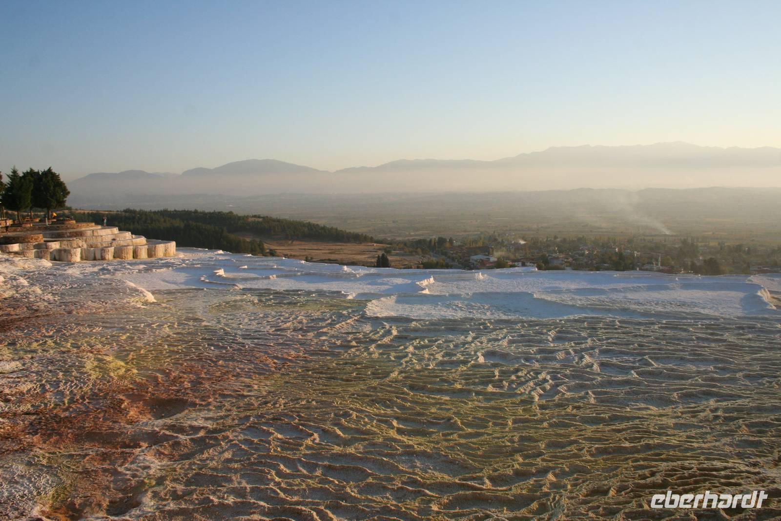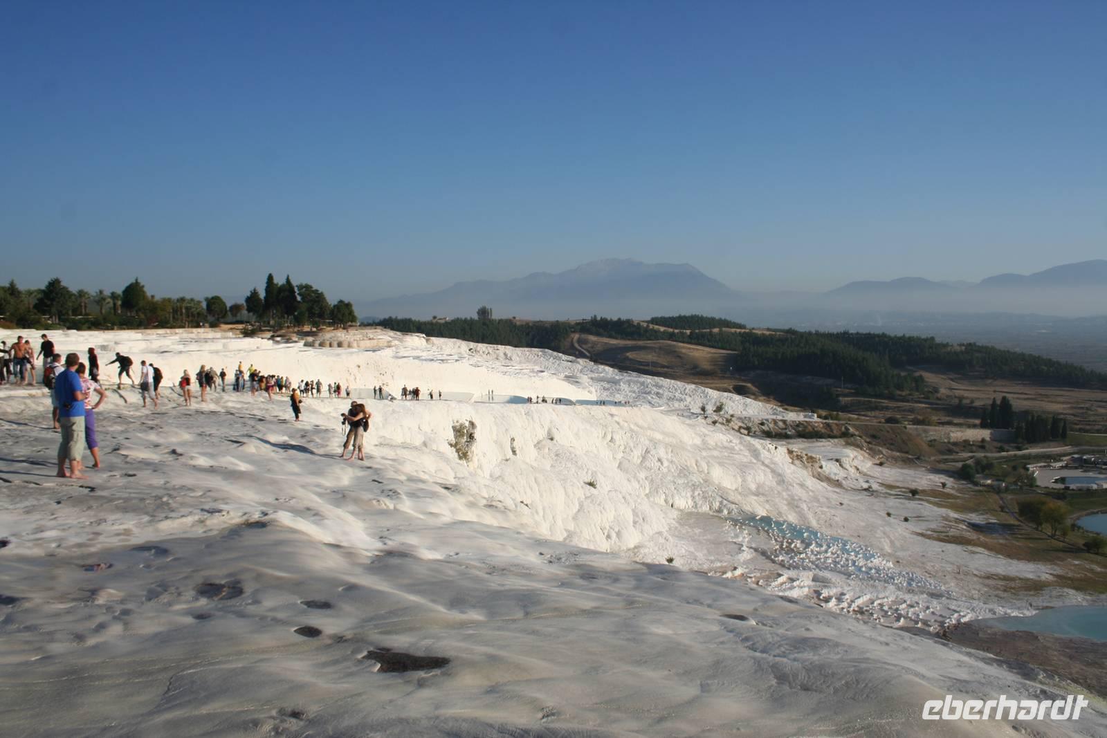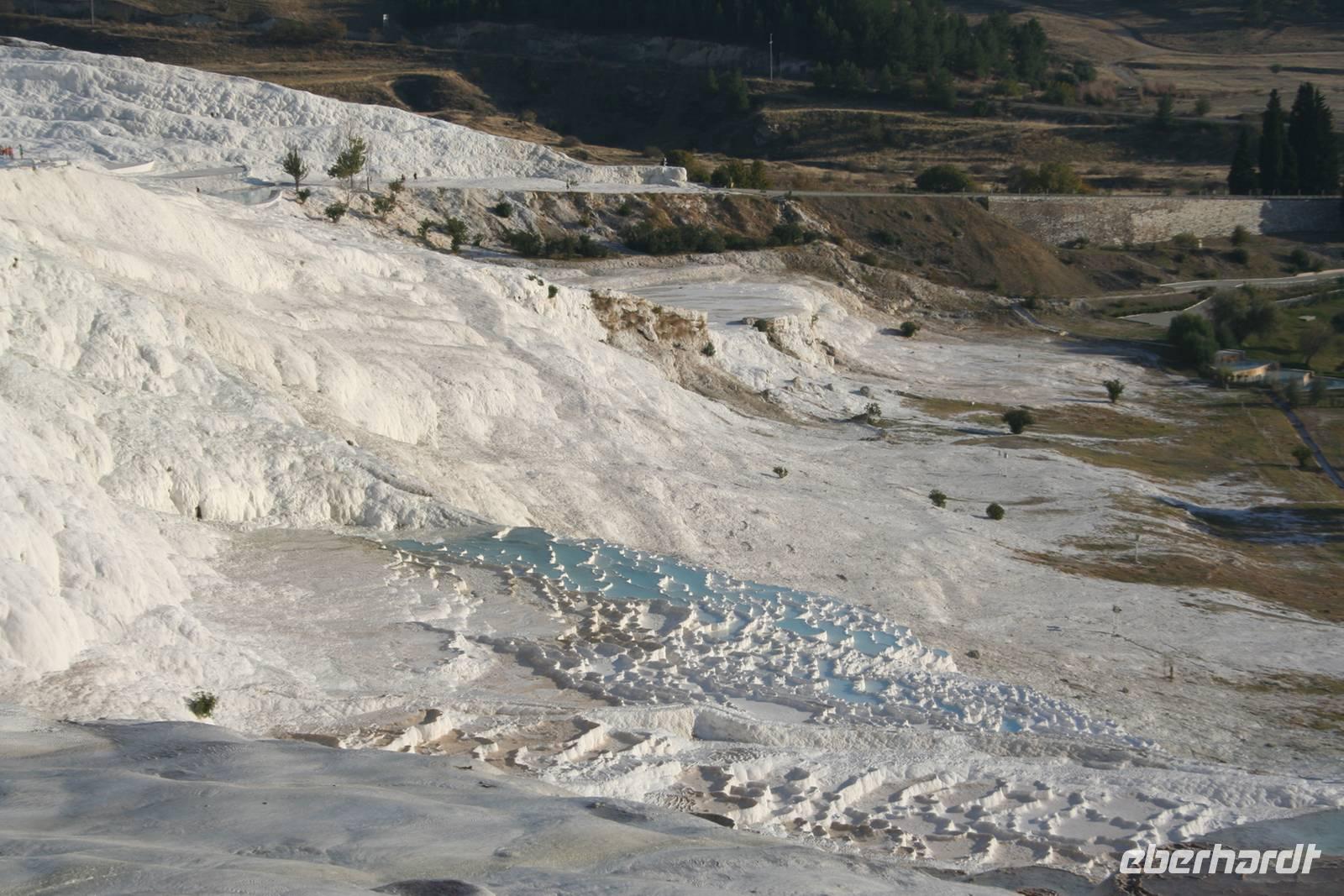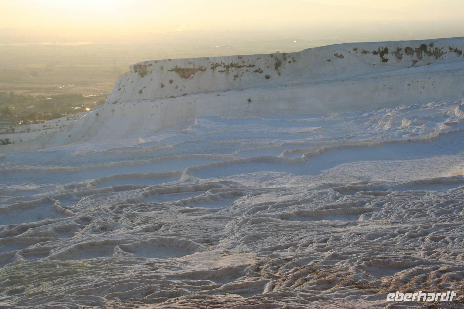 Bereits routiniert luden wir nach dem Frühstück wieder unser Gepäck und fuhren weiter in Richtung Süden, um die nächste antike Stadt zu erobern: Ephesus! Die gewältige Ausgrabungsstätte bot sehr viel zu sehen und ließ uns erahnen, welche Pracht hier früher geherrscht haben musste und mit wie viel architektonischem Wissen vor so langer Zeit bereits gearbeitet wurde. Zwischen zahlreichen anderen Reisenden schlängelten wir uns die abfallende Straße entlang bis zur überraschend großen Ruine der Bibliothek von Celsius, bis wir schließlich das Theater erreichten. Serdars laute Stimme garantierte, dass wir garantiert niemanden im Getümmel verlieren konnten und wir erreichten wohlbehalten den ebenso belebten Busparkplatz, auf dem Ahmed uns erwartete. Weiter ging die Fahrt zu einem ganz besonderen Naturerbe: den Kalksinterterrassen von Pamukkale. Bereits von unten konnten wir die Schönheit dieser Gesteinsformation erahnen und oben angelangt spazierten wir im Spätnachmittagslicht durch die antiken Ruinen bis in die gepflegten Thermalanlagen. Mit reichlich Freizeiz im Gepäck konnten wir die tolle Aussicht und den Anblick der strahlendweißen Steine genießen und barfuß auf den, mit warmen Quellwasser überdeckten, Terrassen spazieren gehen. Sogar baden war erlaubt. Hocherfreut über dieses einzigartige Erlebnis schlenderten wir den Weg durch die Anlage zurück und erreichten am frühen Abend unser Hotel in Pamukkale, wo wir nach Wunsch im hoteleigenen Thermalbecken entspannen konnten.