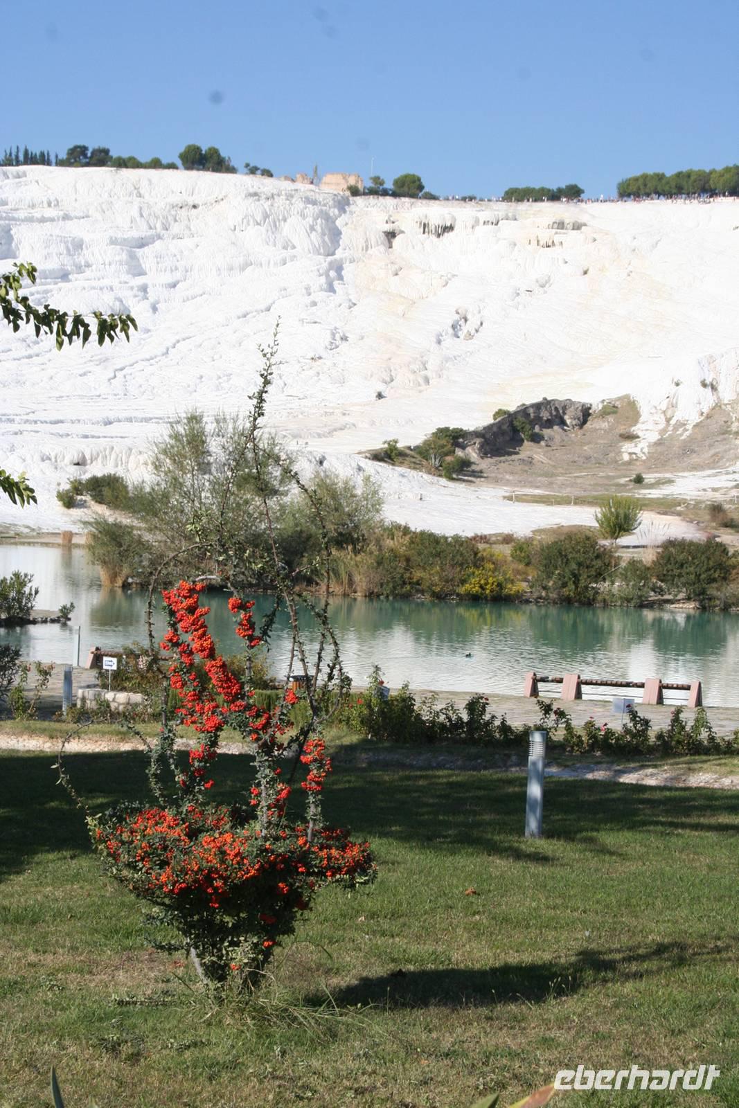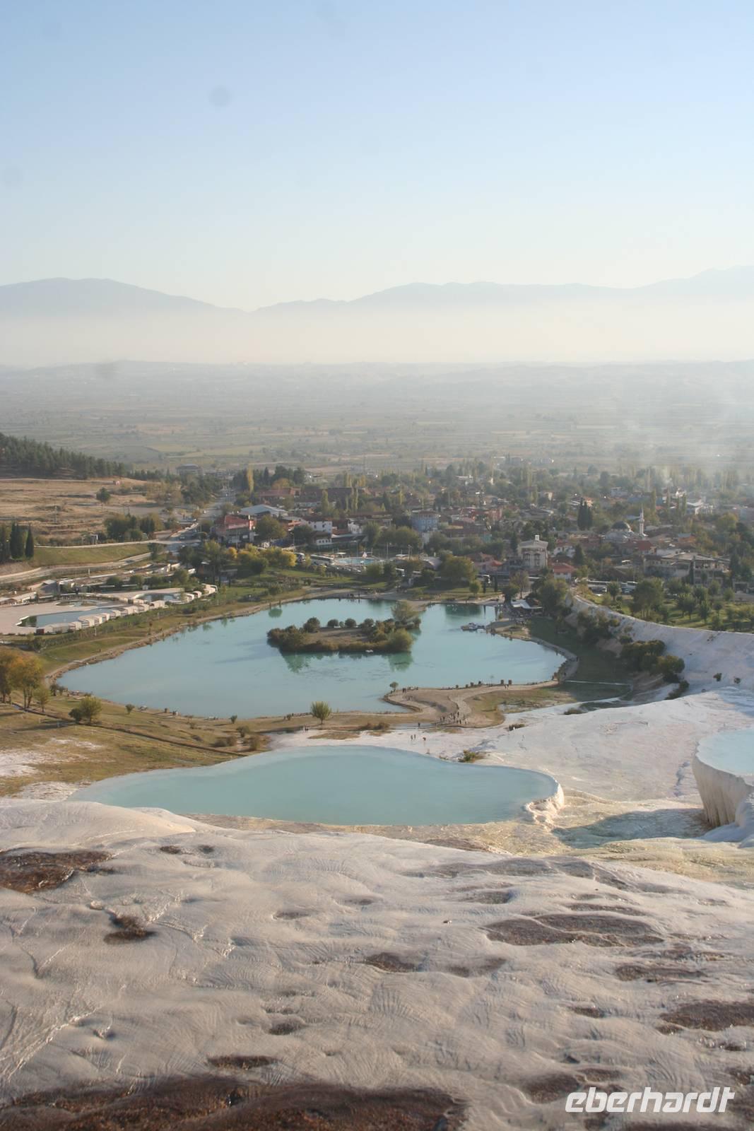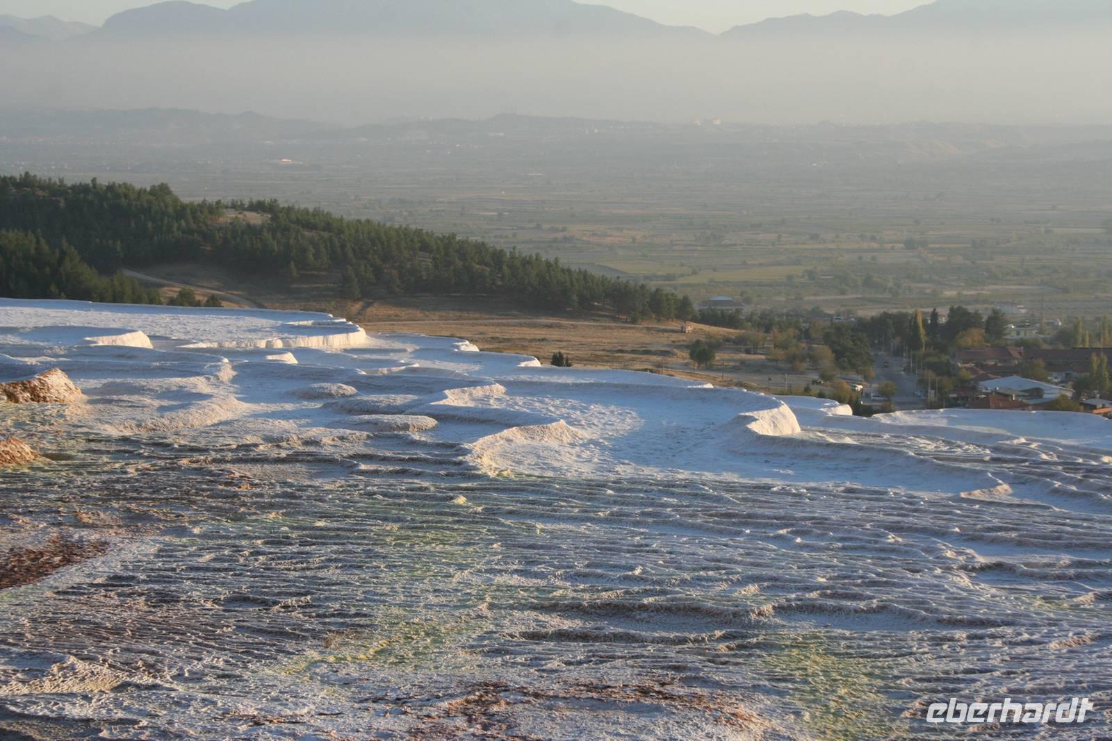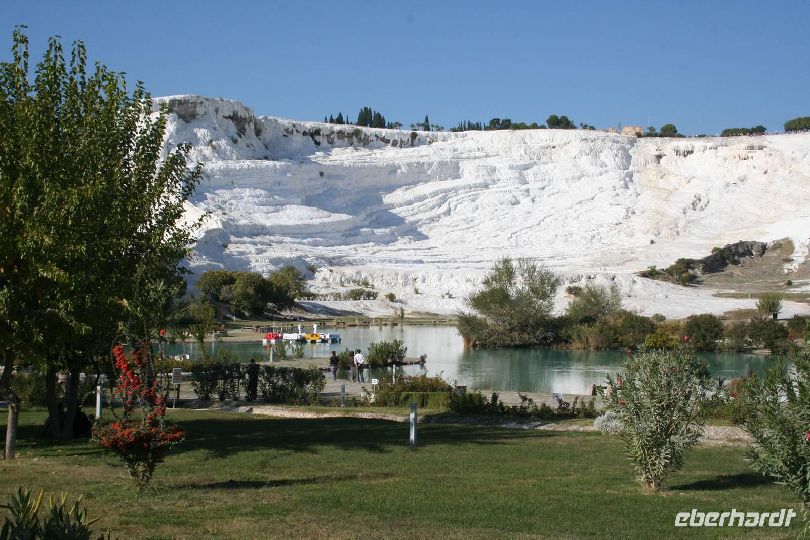 Bereits routiniert luden wir nach dem Frühstück wieder unser Gepäck und fuhren weiter in Richtung Süden, um die nächste antike Stadt zu erobern: Ephesus! Die gewältige Ausgrabungsstätte bot sehr viel zu sehen und ließ uns erahnen, welche Pracht hier früher geherrscht haben musste und mit wie viel architektonischem Wissen vor so langer Zeit bereits gearbeitet wurde. Zwischen zahlreichen anderen Reisenden schlängelten wir uns die abfallende Straße entlang bis zur überraschend großen Ruine der Bibliothek von Celsius, bis wir schließlich das Theater erreichten. Serdars laute Stimme garantierte, dass wir garantiert niemanden im Getümmel verlieren konnten und wir erreichten wohlbehalten den ebenso belebten Busparkplatz, auf dem Ahmed uns erwartete. Weiter ging die Fahrt zu einem ganz besonderen Naturerbe: den Kalksinterterrassen von Pamukkale. Bereits von unten konnten wir die Schönheit dieser Gesteinsformation erahnen und oben angelangt spazierten wir im Spätnachmittagslicht durch die antiken Ruinen bis in die gepflegten Thermalanlagen. Mit reichlich Freizeiz im Gepäck konnten wir die tolle Aussicht und den Anblick der strahlendweißen Steine genießen und barfuß auf den, mit warmen Quellwasser überdeckten, Terrassen spazieren gehen. Sogar baden war erlaubt. Hocherfreut über dieses einzigartige Erlebnis schlenderten wir den Weg durch die Anlage zurück und erreichten am frühen Abend unser Hotel in Pamukkale, wo wir nach Wunsch im hoteleigenen Thermalbecken entspannen konnten.