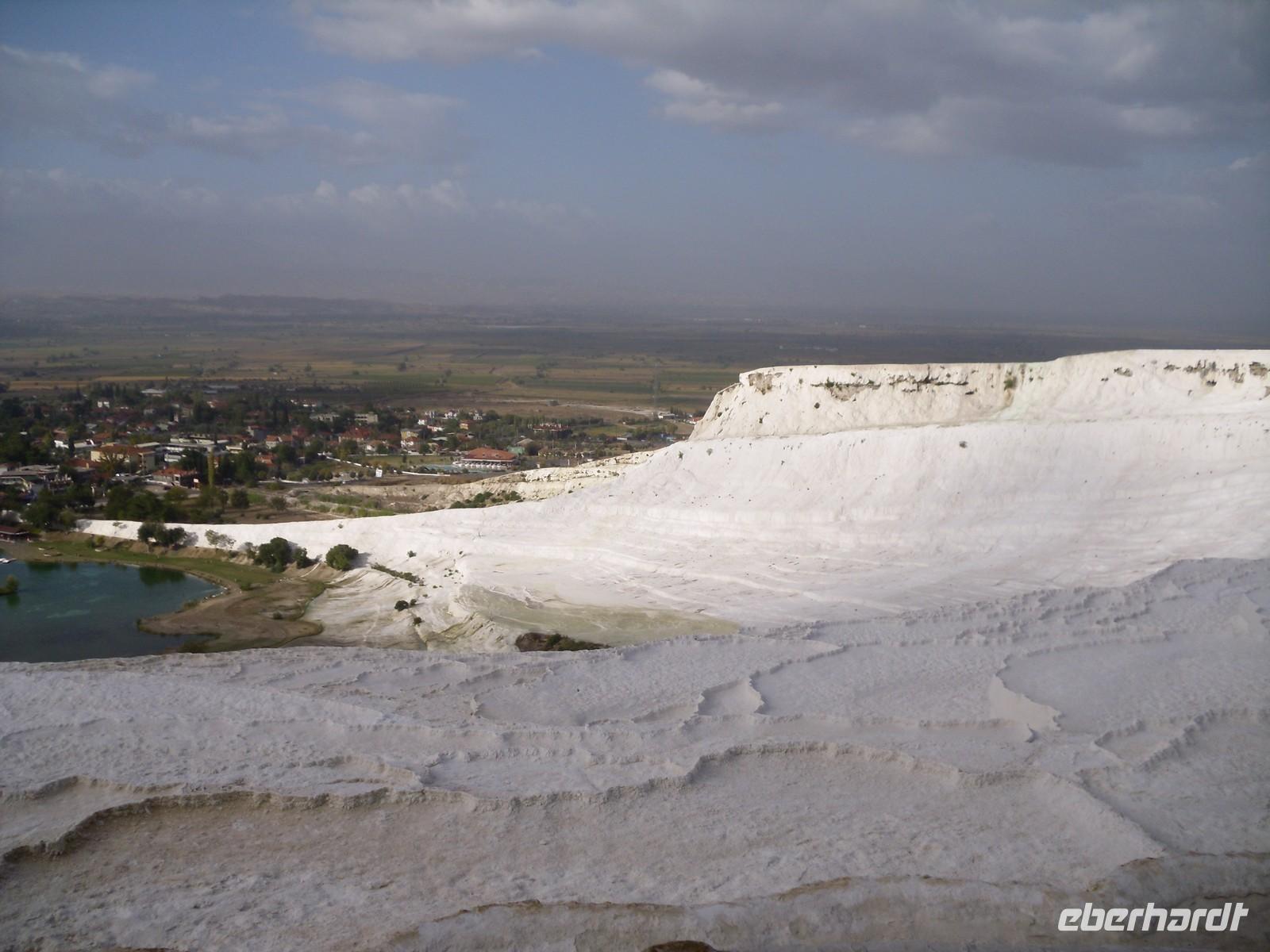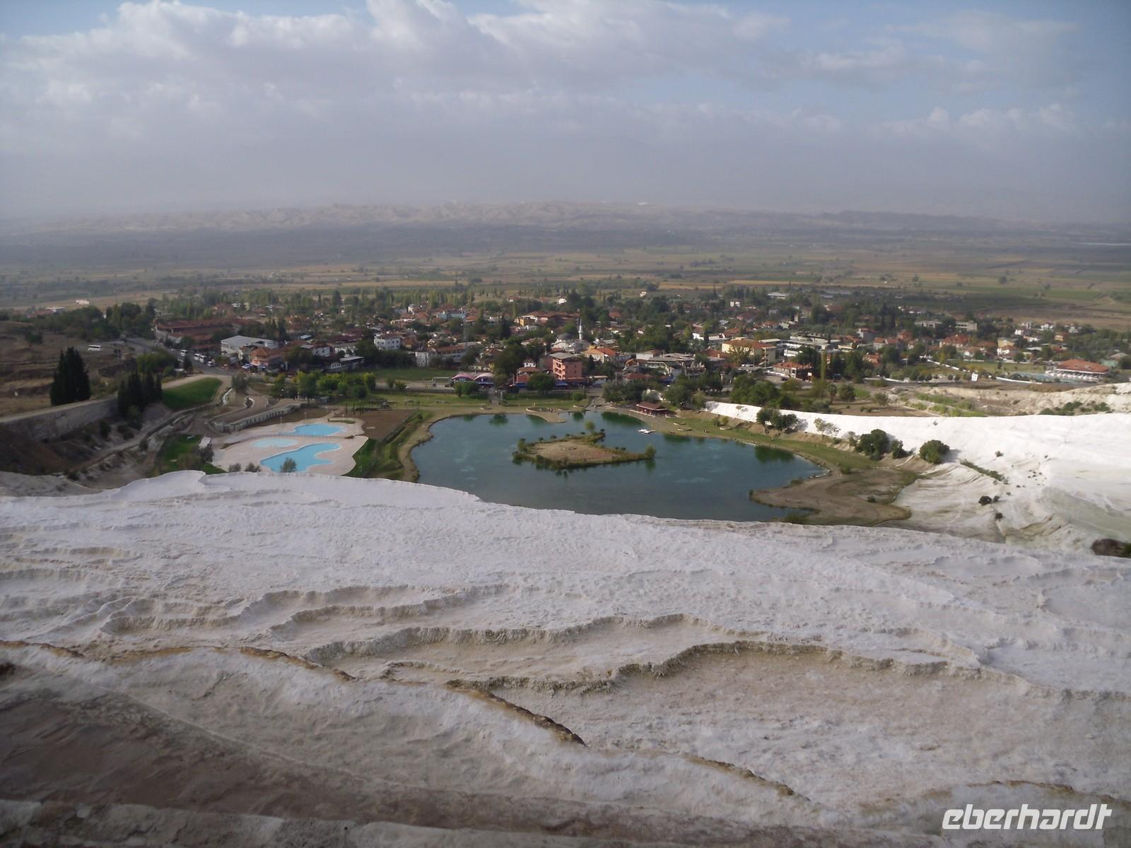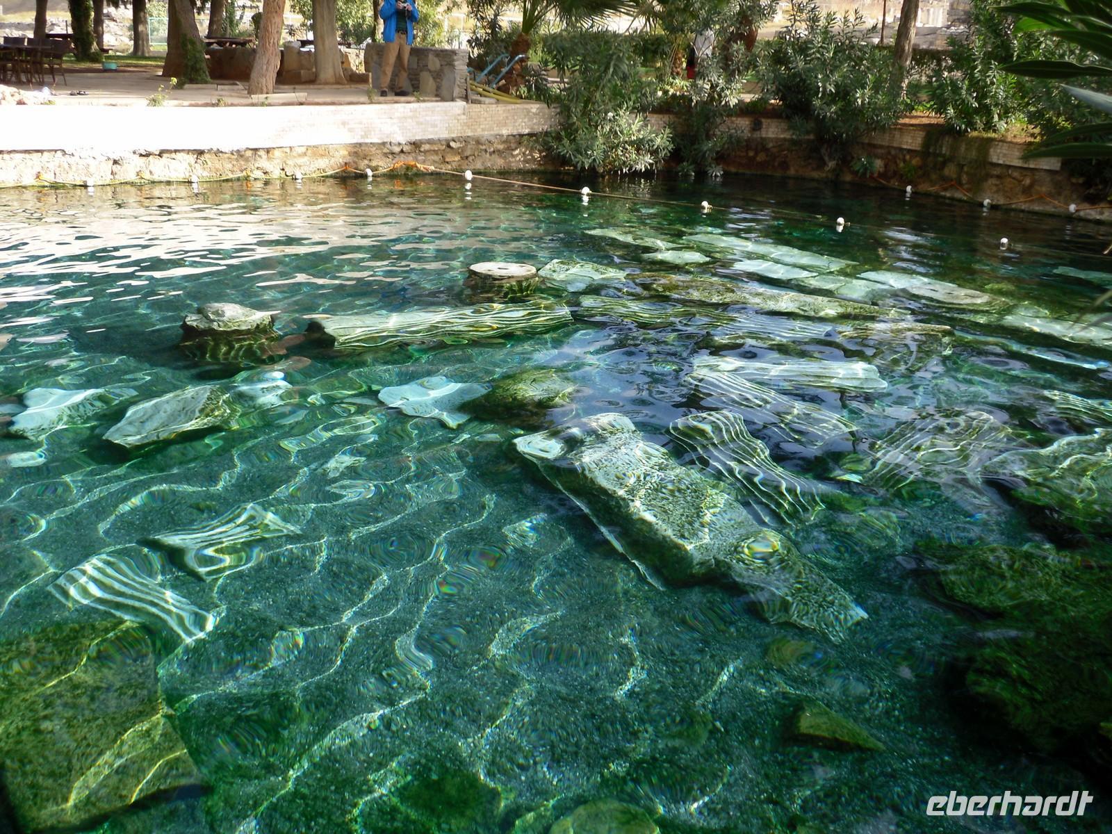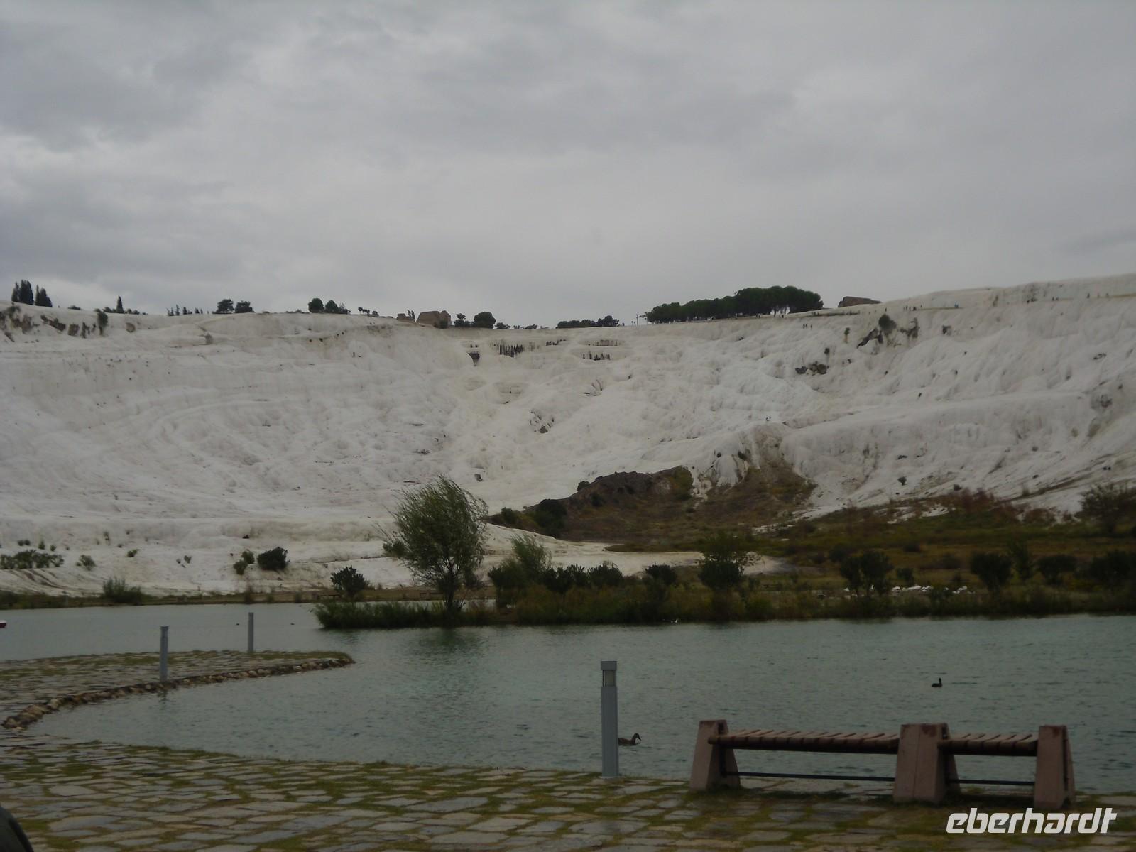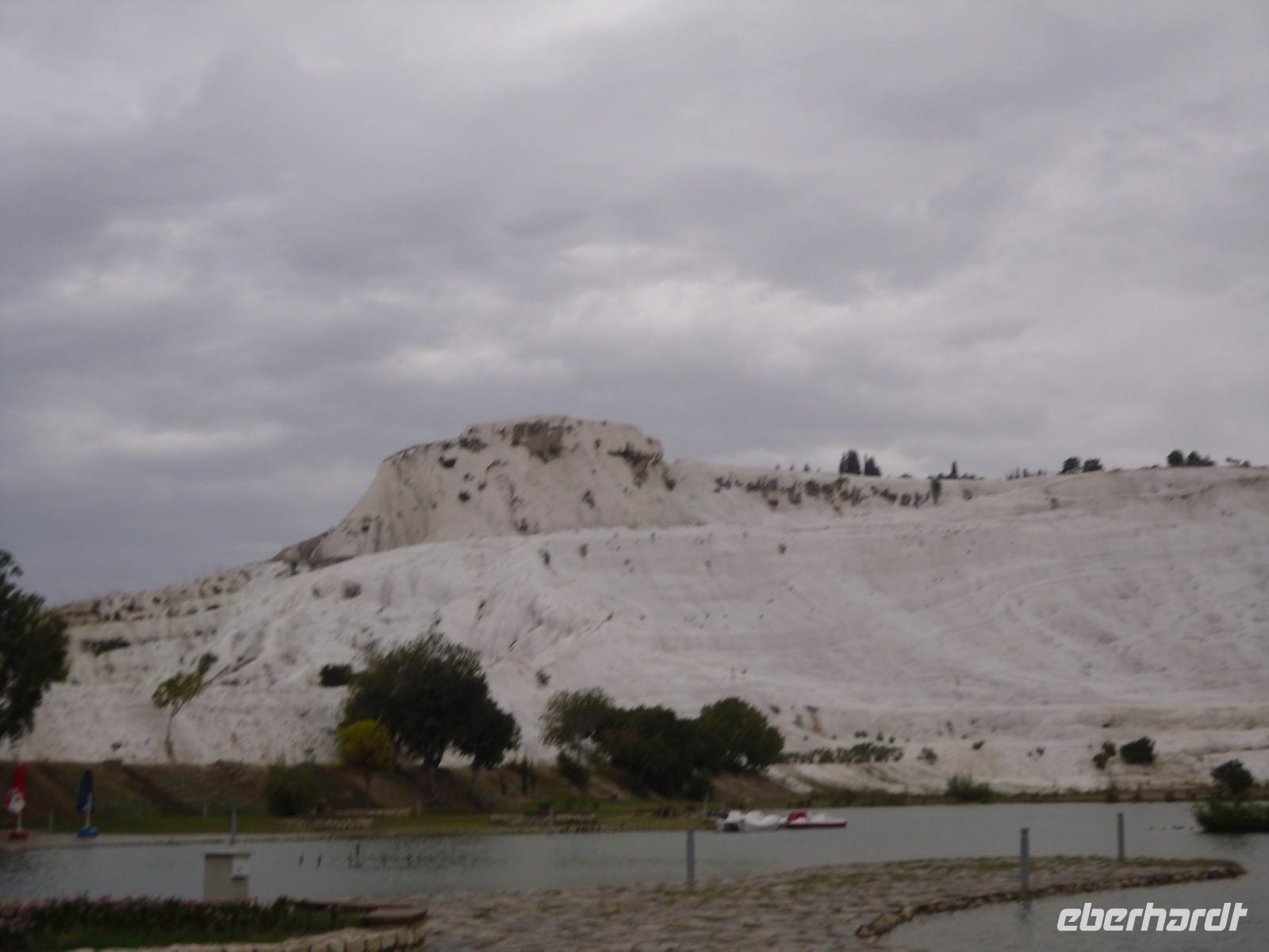 ununterbrochen. Doch unserer guten Laune schadete das nicht und kurz entschlossen zückten alle ihre Regenschirme und warfen sich ihre Regenjacken über. Mit rund 200.000 Einwohnern ist Ephesus die Metropole des Römischen Reiches. Dies lässt sich auch noch heute erahnen, denn die weit ausgebauten Wege und das riesige Amphitheater lassen darauf schließen, dass hier das Stadtgewimmel tobte. Bevor wir am Hotel ankamen, machten wir einen kurzen Fotostopp in Pamukkale. Inzwischen hatte es sogar fast aufgehört zu regnen. Im Hotel angekommen wartete ein Höhepunkt, von dem wir die letzten Tage immer wieder geträumt hatten auf uns. Kenan hatte uns die letzten Tage immer wieder von dem Thermalwasser erzählt, sodass sich jeder darauf freute, so genossen wir vor dem Abendessen ein herrlich aufwärmendes Bad im hoteleigenen Thermalbad.