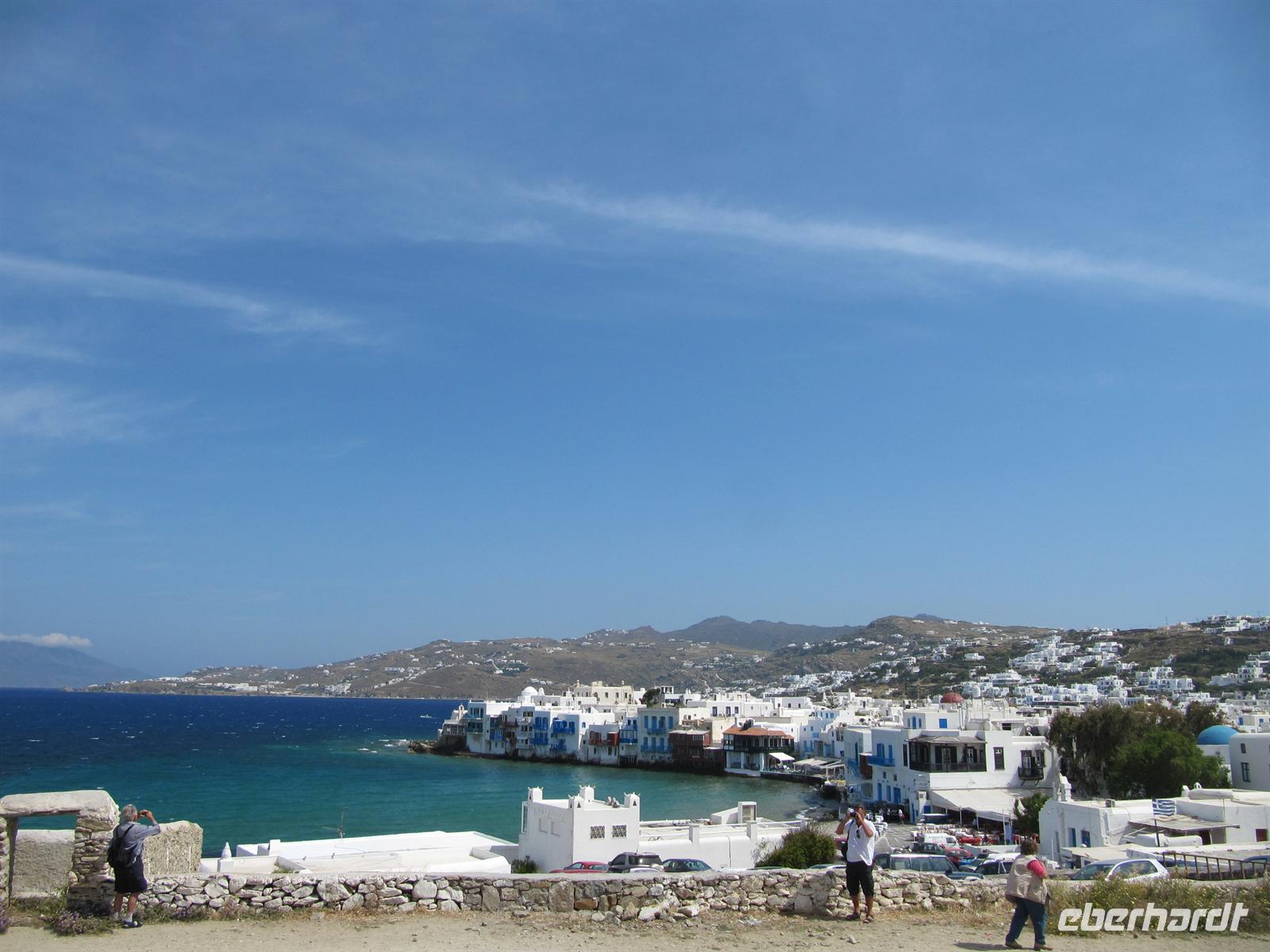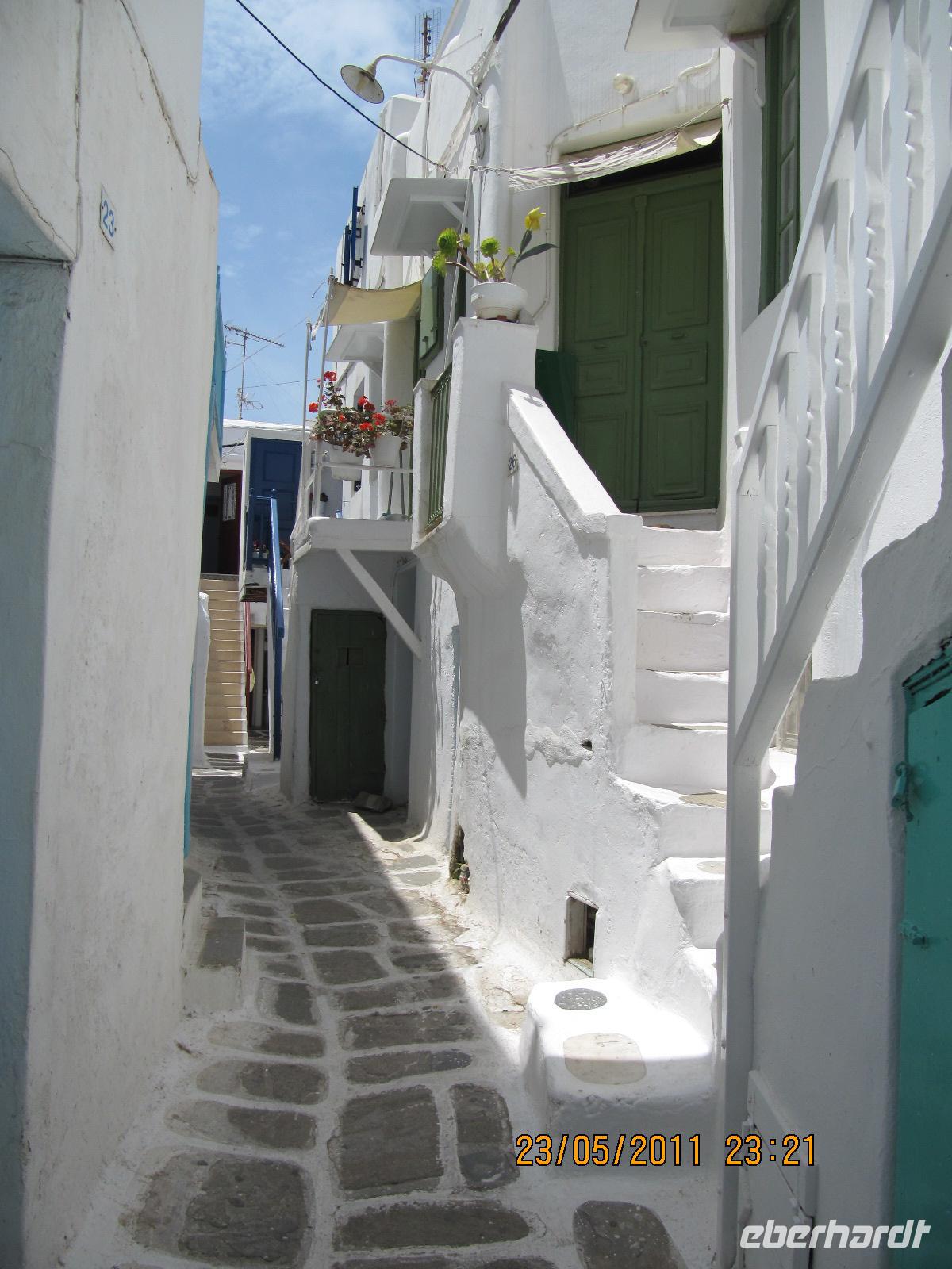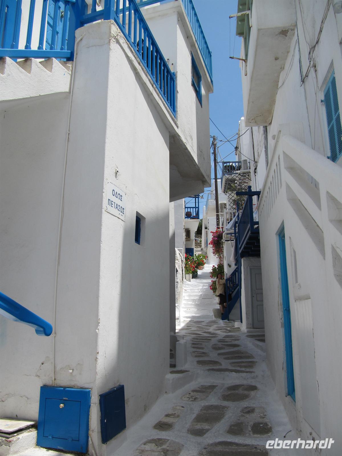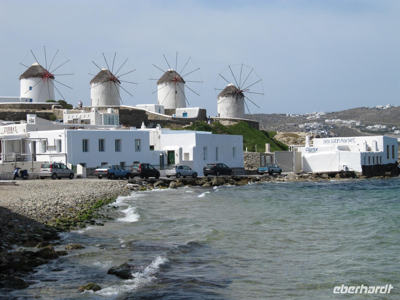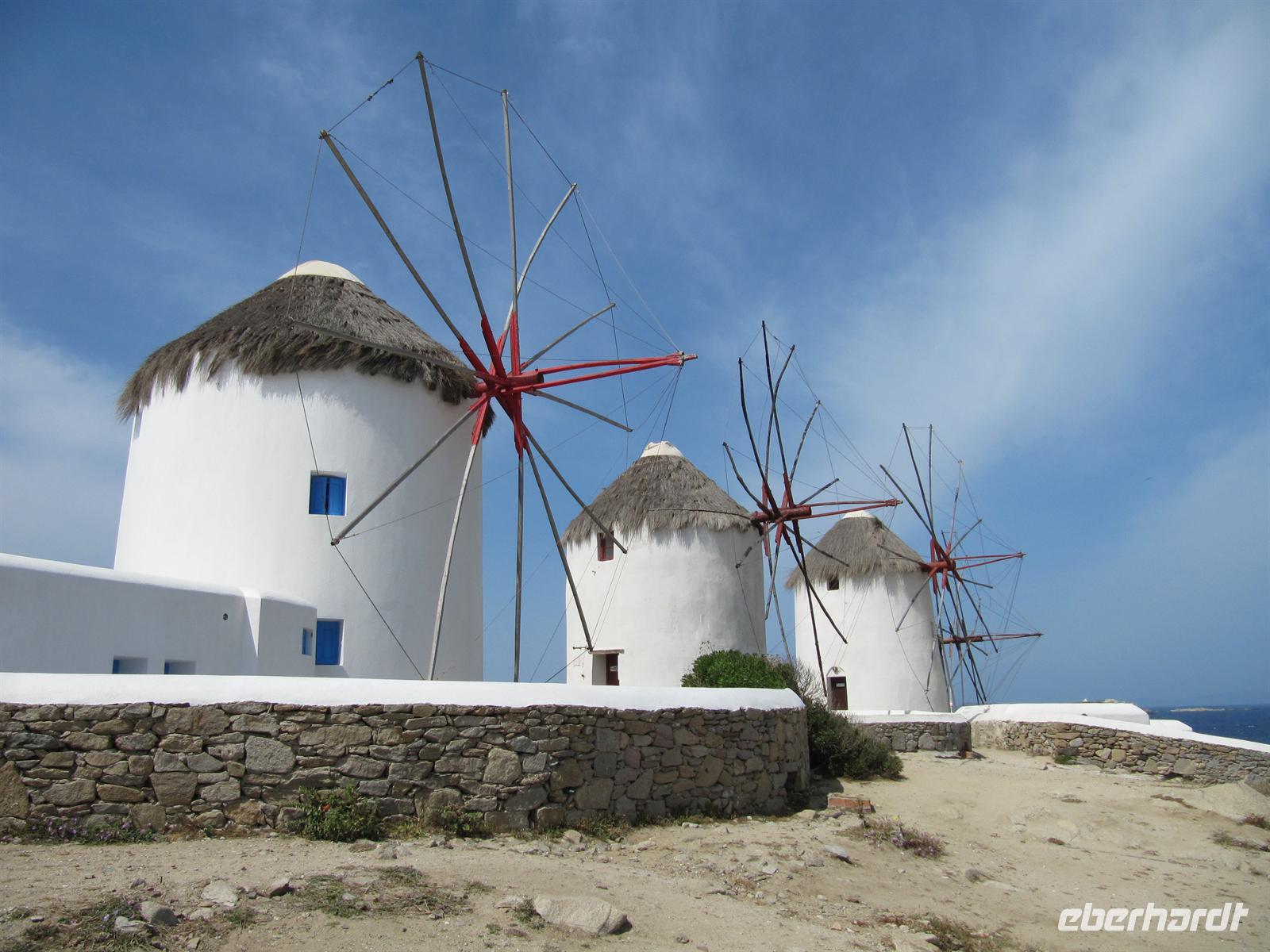 Häuser hier sind ganz besonders. Nicht nur, dass sie alle strahlend weiß verputzt sind, sie folgen auch alle dergleichen Architektur. Dieser Stil wird Taubenhausarchitektur genannt. Auf den abgerundeten Dächern, denn die Häuser haben keine rechten Winkel, sitzen kleine Türmchen, die den alten griechischen Taubenhäusern nachempfunden sind. Die wunderschönen Häuser haben bunte hölzerne Außentreppen und Fensterläden in türkis, meerblau oder rot. Wir schlendern durch die Straßen und erreichen die Káto Mýli, die vier steinernen Windmühlen von Mýkonos. Hier über der wohl schönsten Stadt der Kykladen bietet sich uns ein eindrucksvoller Blick auf das Meer und die Stadt. Vor den Windmühlen nehmen wir