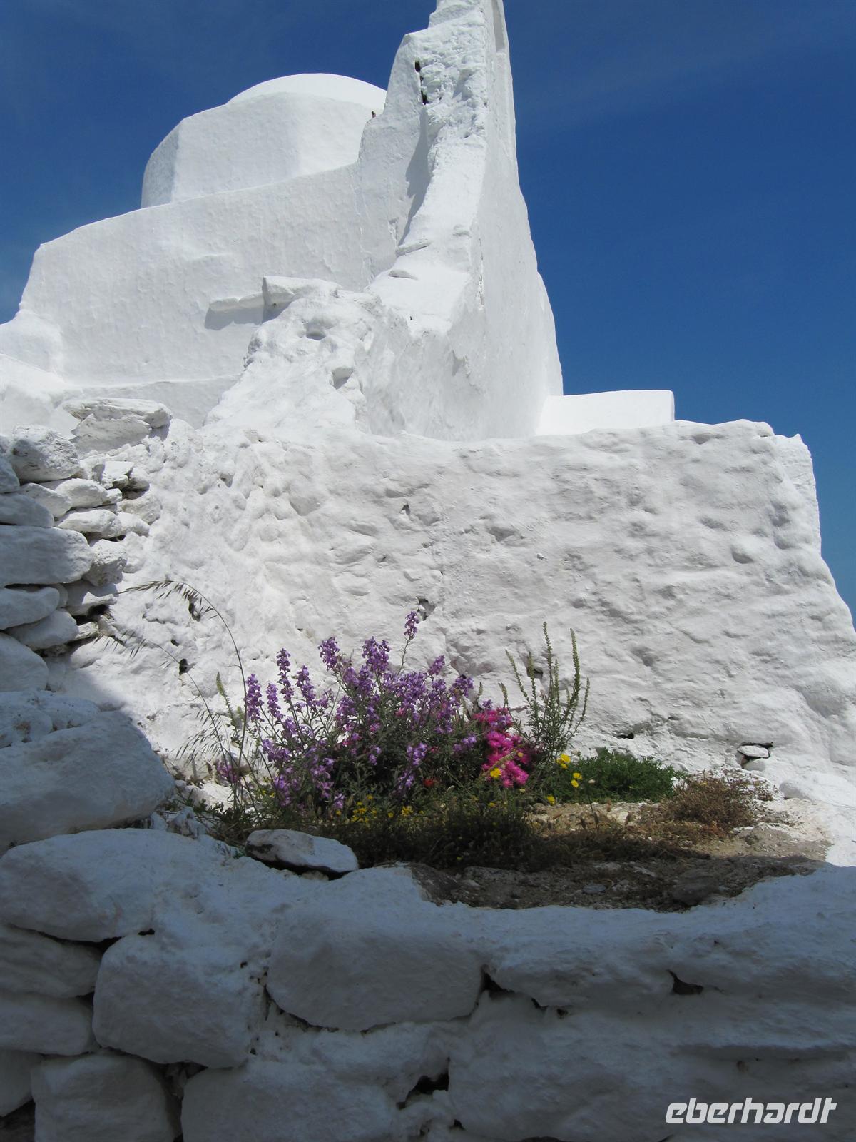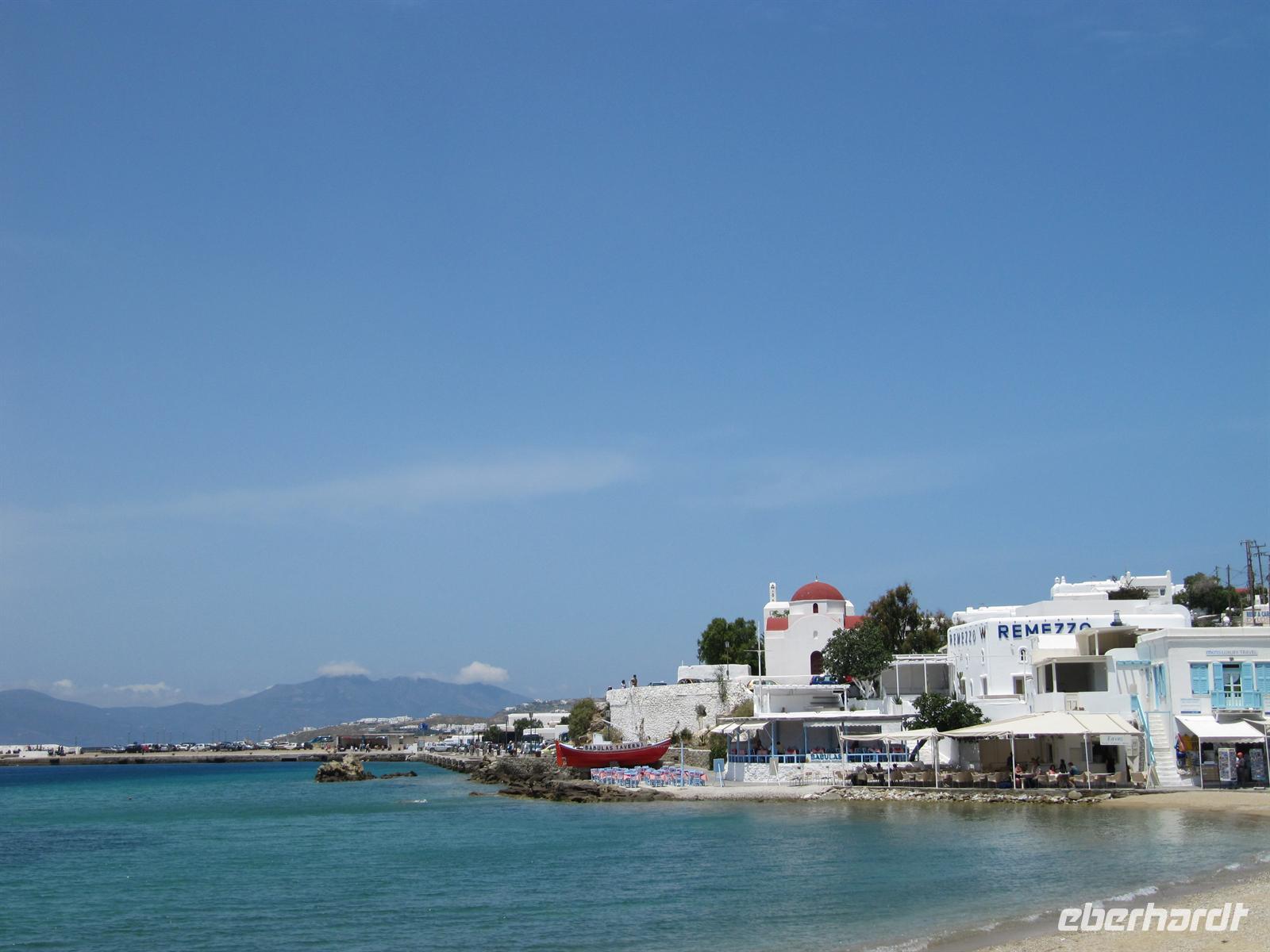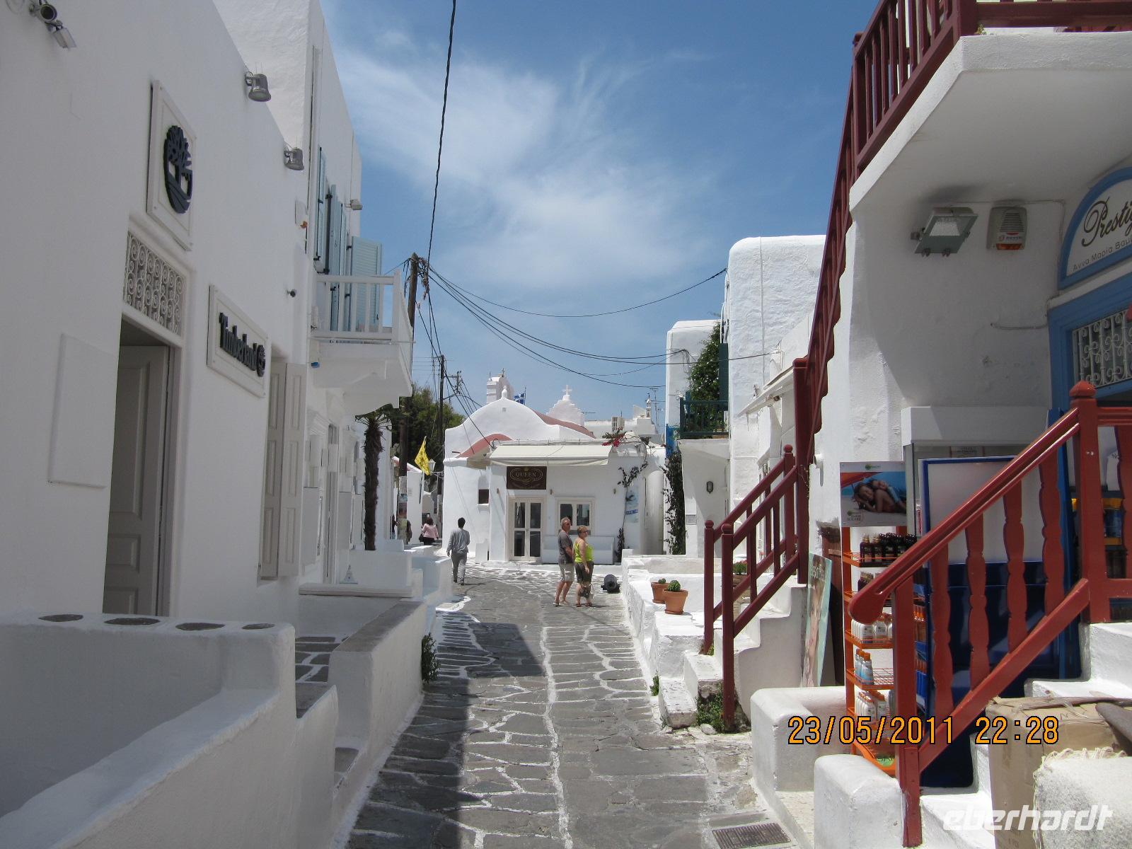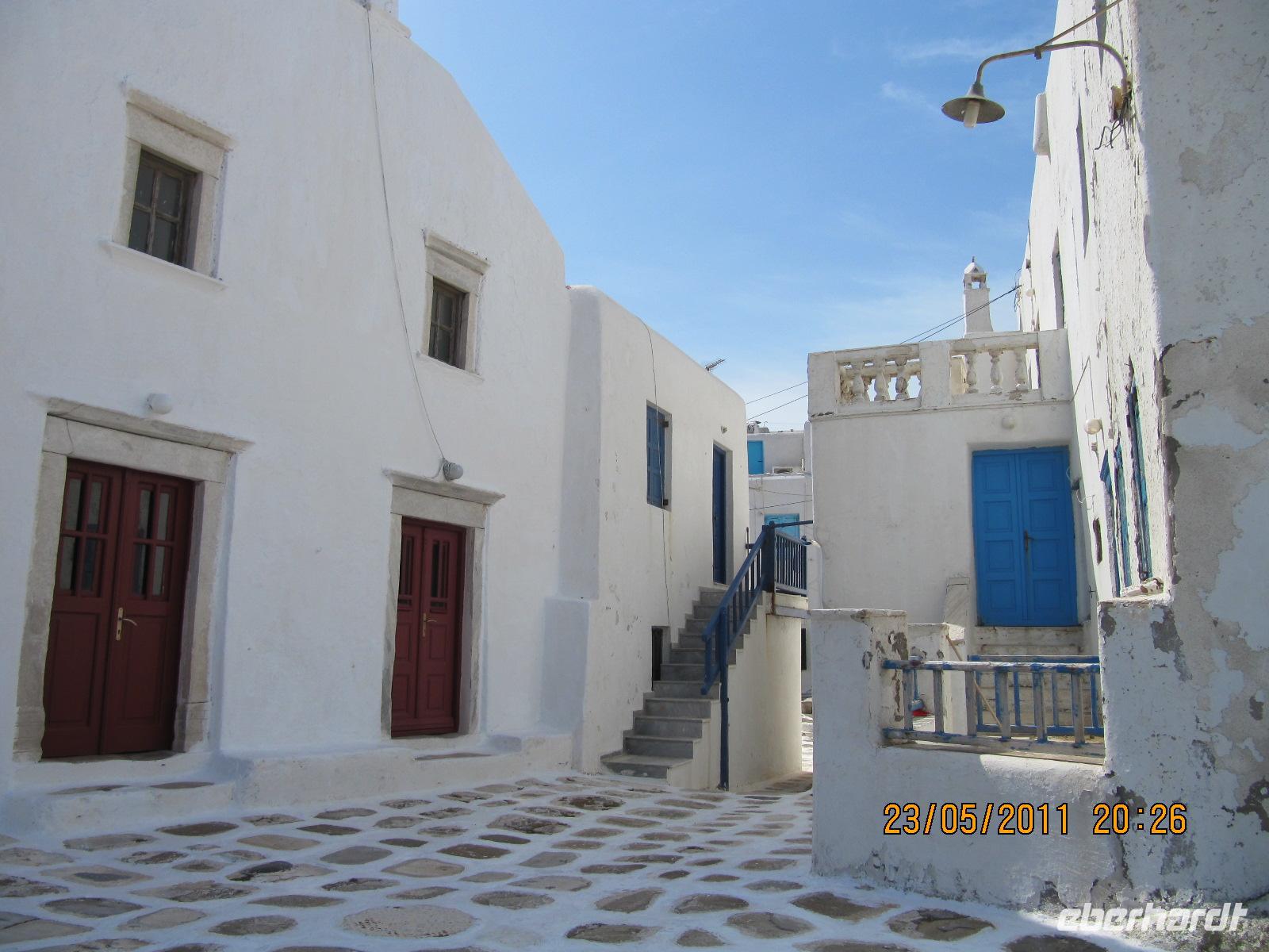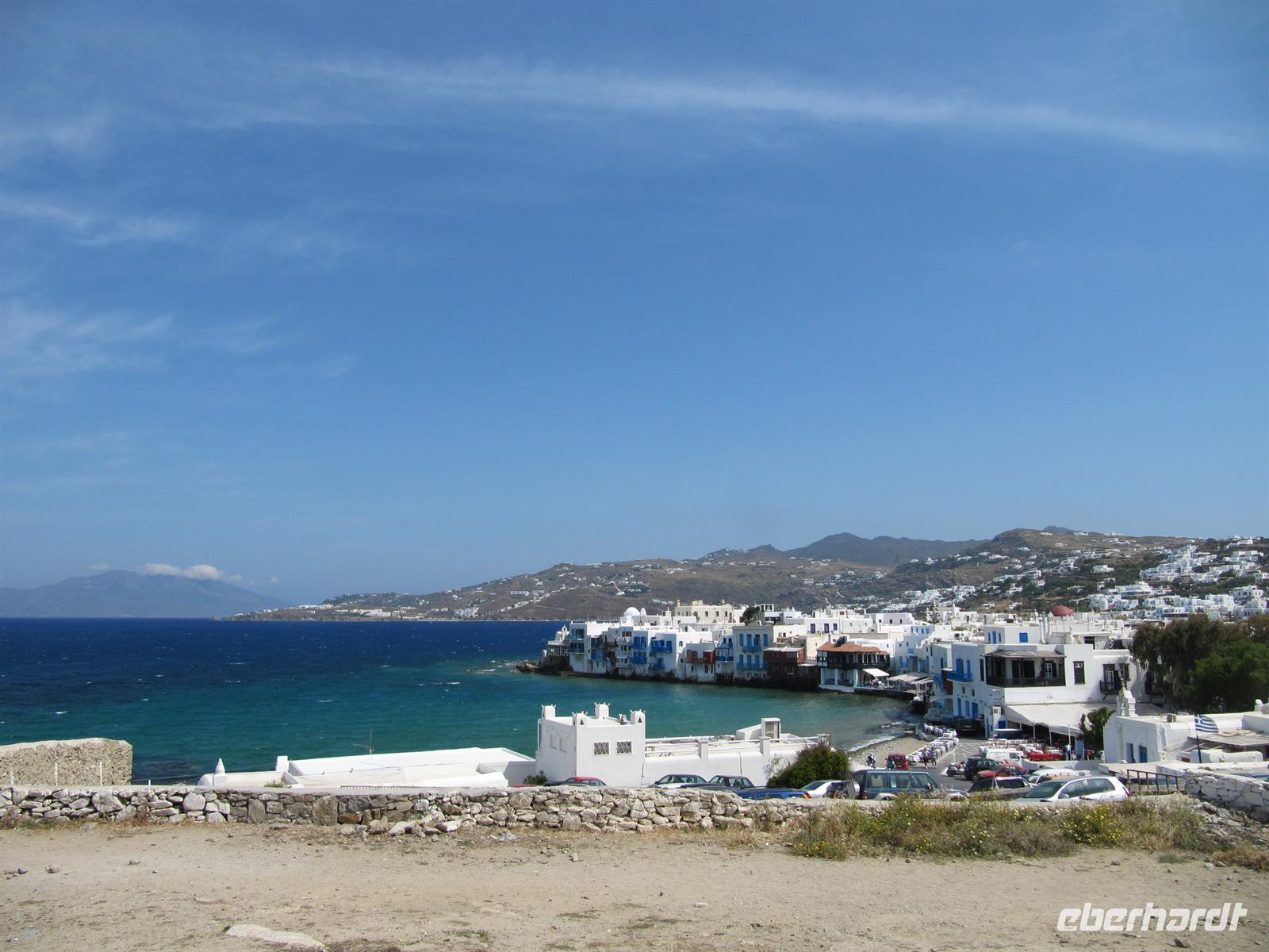Häuser hier sind ganz besonders. Nicht nur, dass sie alle strahlend weiß verputzt sind, sie folgen auch alle dergleichen Architektur. Dieser Stil wird Taubenhausarchitektur genannt. Auf den abgerundeten Dächern, denn die Häuser haben keine rechten Winkel, sitzen kleine Türmchen, die den alten griechischen Taubenhäusern nachempfunden sind. Die wunderschönen Häuser haben bunte hölzerne Außentreppen und Fensterläden in türkis, meerblau oder rot. Wir schlendern durch die Straßen und erreichen die Káto Mýli, die vier steinernen Windmühlen von Mýkonos. Hier über der wohl schönsten Stadt der Kykladen bietet sich uns ein eindrucksvoller Blick auf das Meer und die Stadt. Vor den Windmühlen nehmen wir