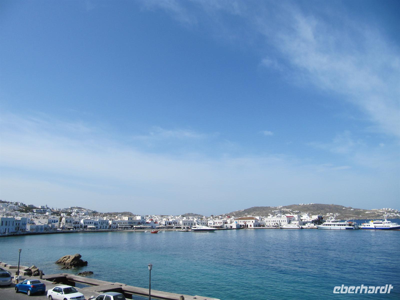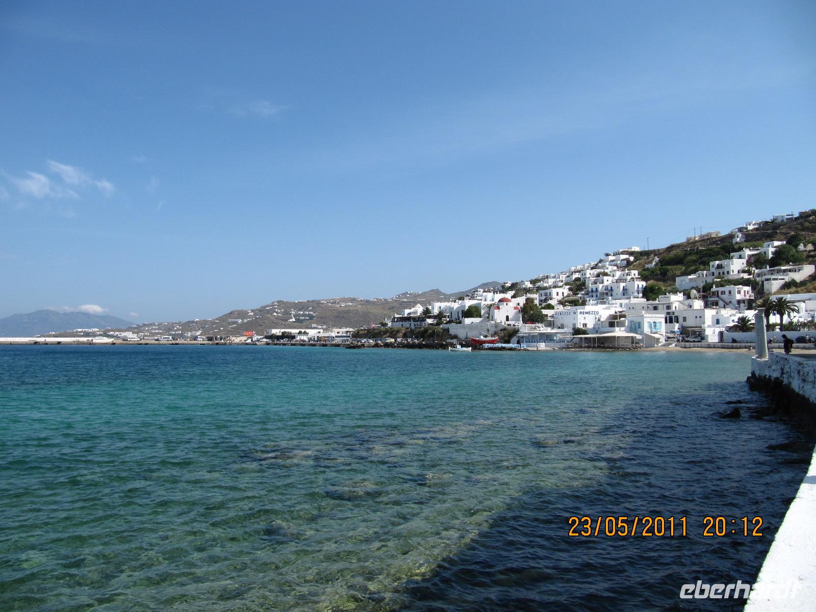 mediterrane Stadt ist vergleichsweise groß für die griechische Inselwelt. Am Hang gelegen bieten sich uns sehr pittoreske Ausblicke auf schmale, schön bepflanzte Gassen, Kirchen und den Hauptplatz mit der steinernen Löwenstaue, die Platia Pythágoras. Hier findet eine Gedenkfeier statt, es werden Kränze niedergelegt. Wir sehen Militär, Marine und auch einen orthodoxen Priester, die der Gefallenen des Zweiten Weltkrieges gedenken. Zu Mittag treffen wir uns am Hafen. Mit der majestätische Fähre, der Nissos Mykonos, verlassen wir die Dodekanes und steuern die Kykladen an. Die Kykladen befinden sich zwischen Athen und Kreta im offenen tiefblauen ägäischen Meer. Der Name Kykladen stammt von den Ionern, die 1100 v. Chr. vor den Dorern auf diese Inseln geflohen sind. Das Siedlungszentrum war Delos, das in der Mitte der Kykladen liegt. Kykladen kommt von , was Kreis heißt; die Kreisinseln um Delos. Die Fährüberfahrt dauert sechs Stunden, doch da das Schiff sehr groß ist, mit begehbarem, bestuhltem Außendeck über mehrere Etagen, wissen wir hervorragend unsere Zeit zu vertreiben. Ich persönlich muss sagen, dass die Fährüberfahrten ein besonderes Erlebnis auf dieser Reise sind. Es gibt kaum etwas Schöneres und Meditativeres als auf das endlose, türkisfarbene Meer zu blicken. Hier und da eine Möwe, einige Gäste haben sogar zwischendurch Delphine am Bug der Fähre sichten können, die in den Wellen spielten. Das Licht in der Ägäis ist einmalig. Besonders vom Wasser aus lässt sich dieses klare, strahlende Licht erkennen. In Mýkonos angekommen werden wir von unserem Transfer zum Yiannaki Hotel in Ornos gebracht. Das 4-Sterne-Hotel strahlt mit seiner Eleganz und Schlichtheit einen großen Reiz auf uns aus. Mit den Zimmern sind wir alle hoch zufrieden und das 3-Gänge-Abendessen rundet unseren Reisetag ab. Der Strand befindet sich in wenigen Gehminuten Entfernung. An der Promenade der herrlichen Bucht mit feinem Sandstrand laden Cafés und Tavernen ein, einen kühlen Drink zu nehmen.