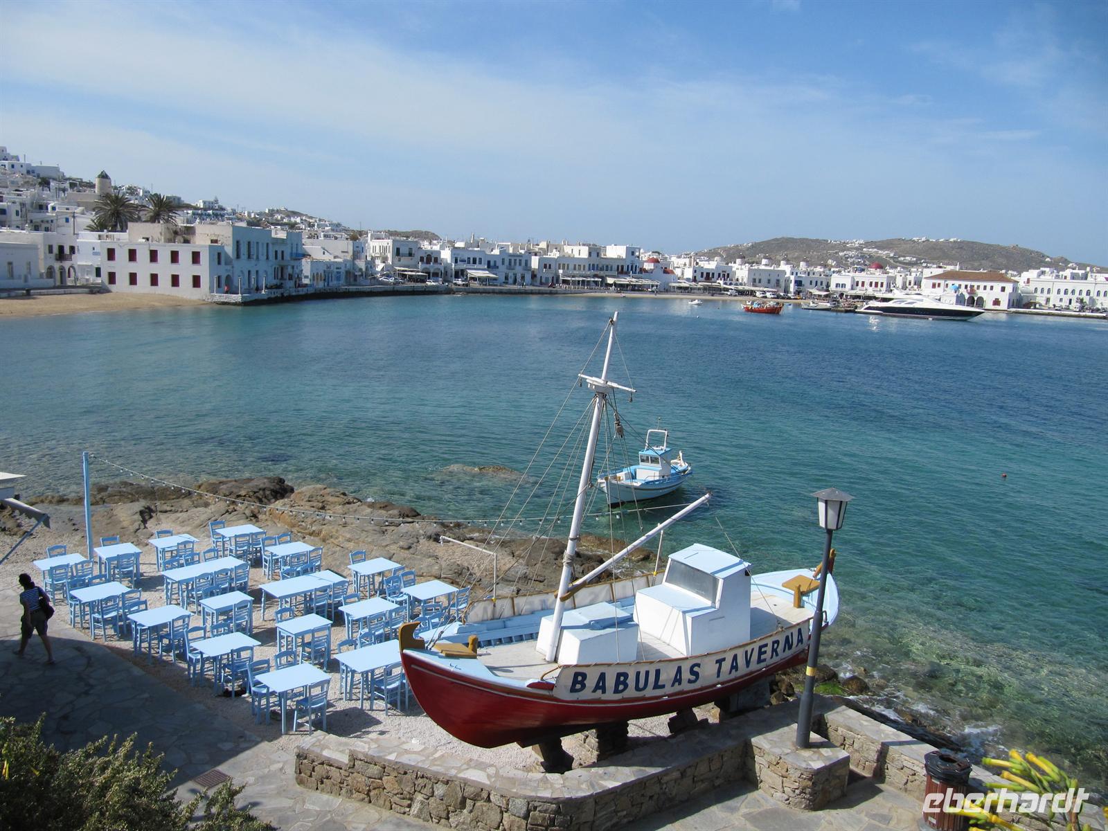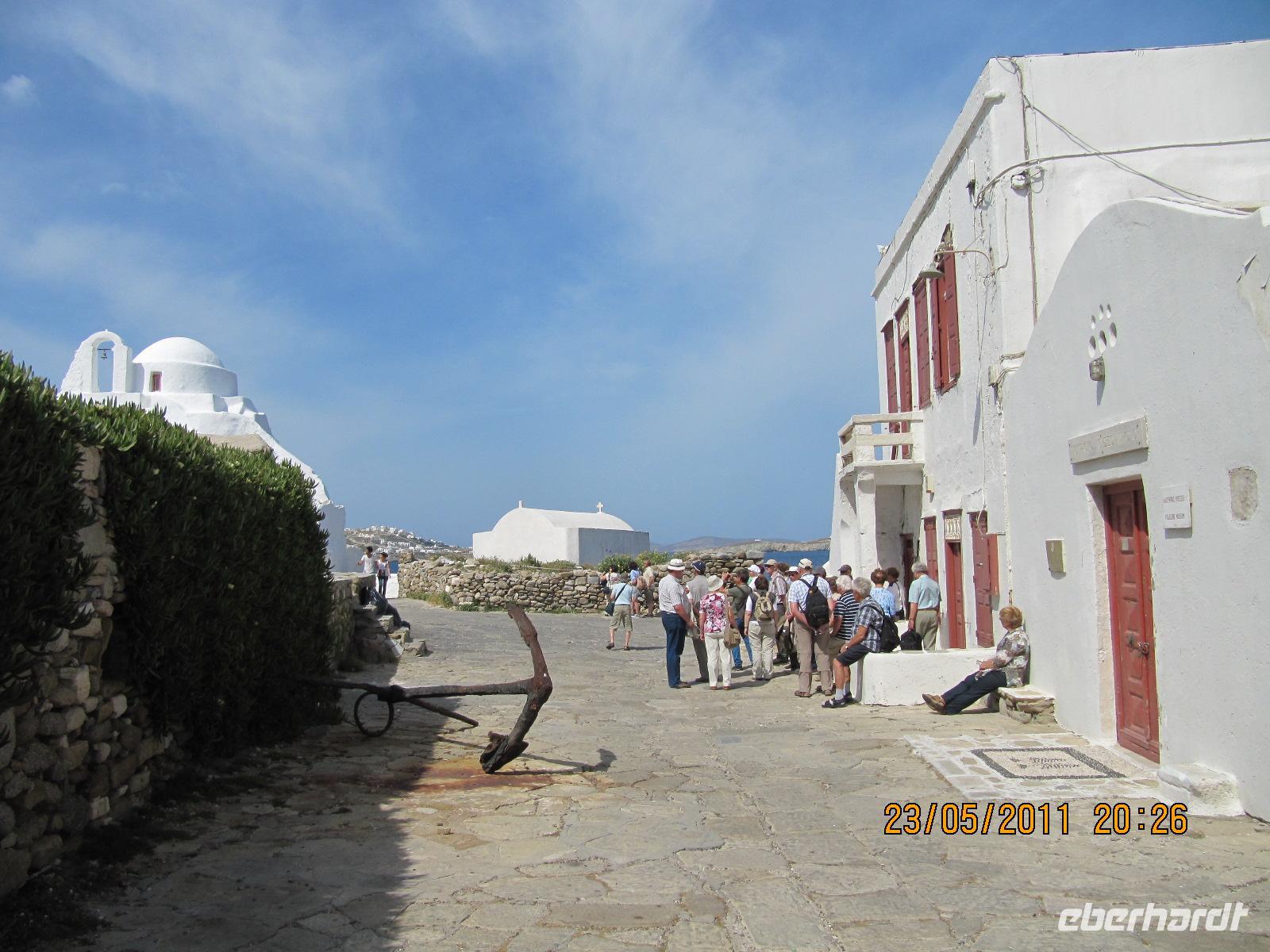Heute setzen wir unsere Reise nach Mykonos fort. Die Fähre legt erst nach Mittag ab und so haben wir Zeit auszuschlafen. Erholt und munter treffen wir uns zum Frühstück. Das Gepäck wird vom Hotelpersonal zu unserem Bus gebracht, der uns in griechischer Gelassenheit nach Vathí fährt. In der Insel-Hauptstadt angekommen, verstauen wir zunächst unser Gepäck am Hafen, um darauf die Stadt besichtigen zu gehen. Die