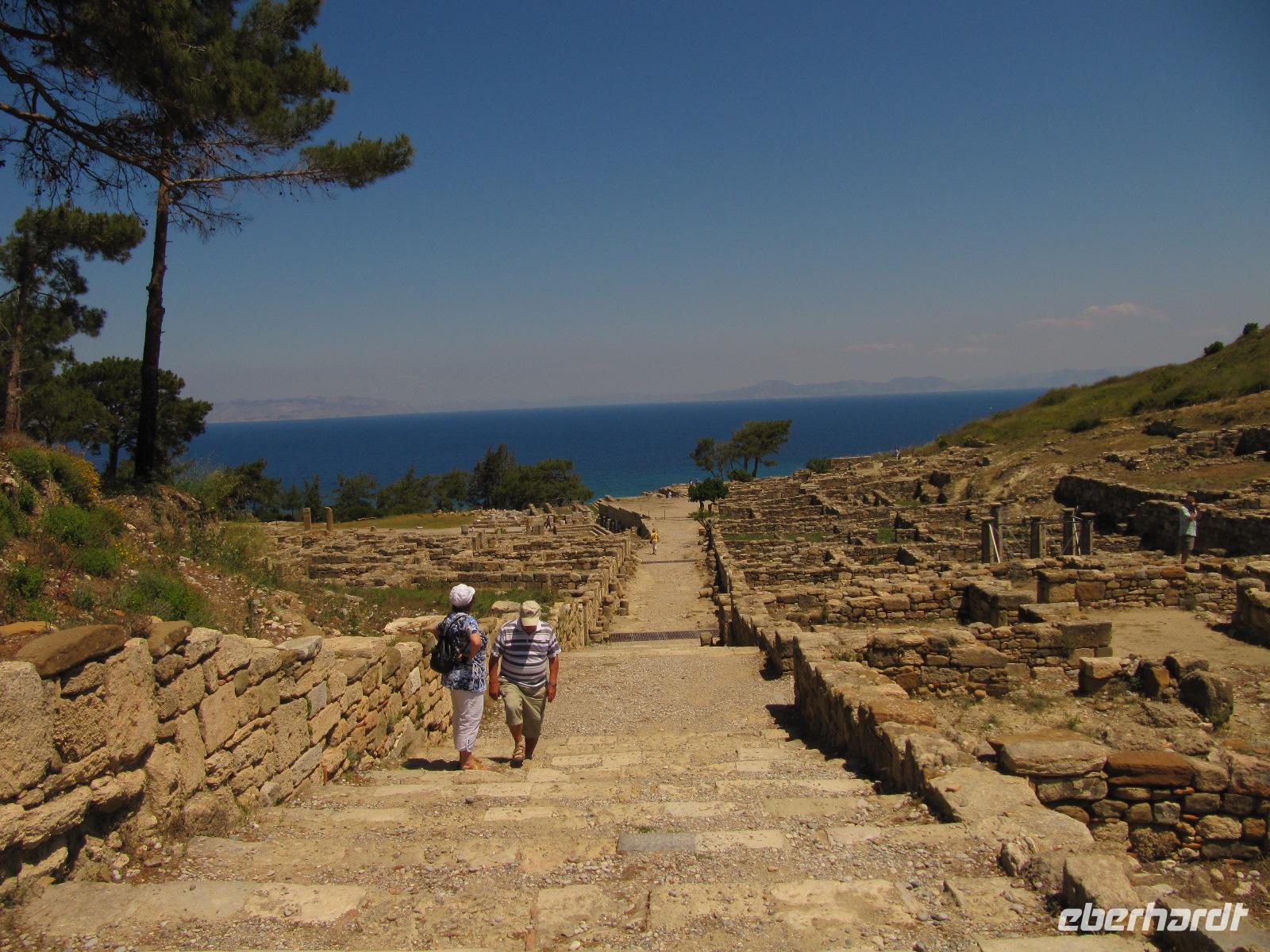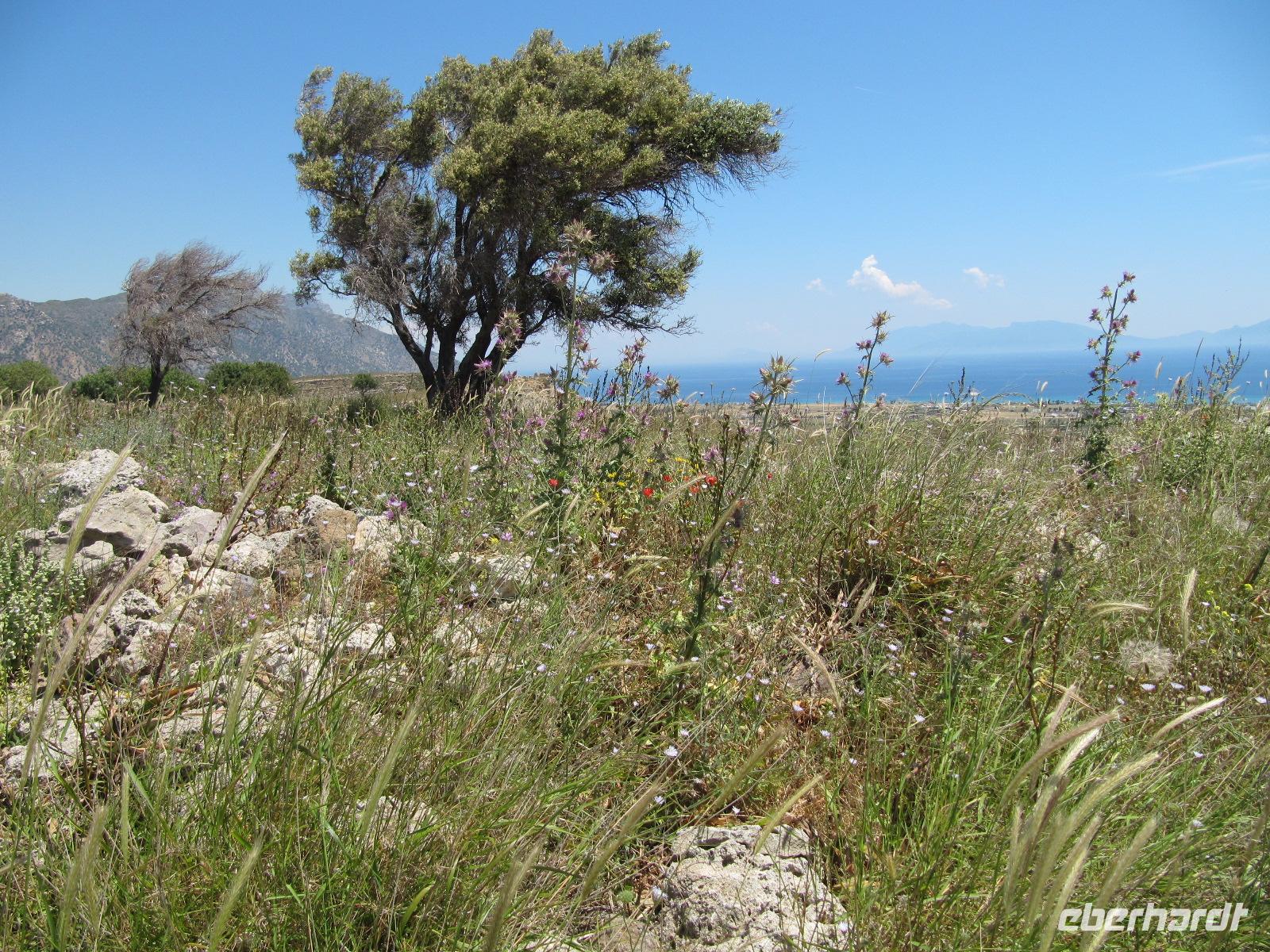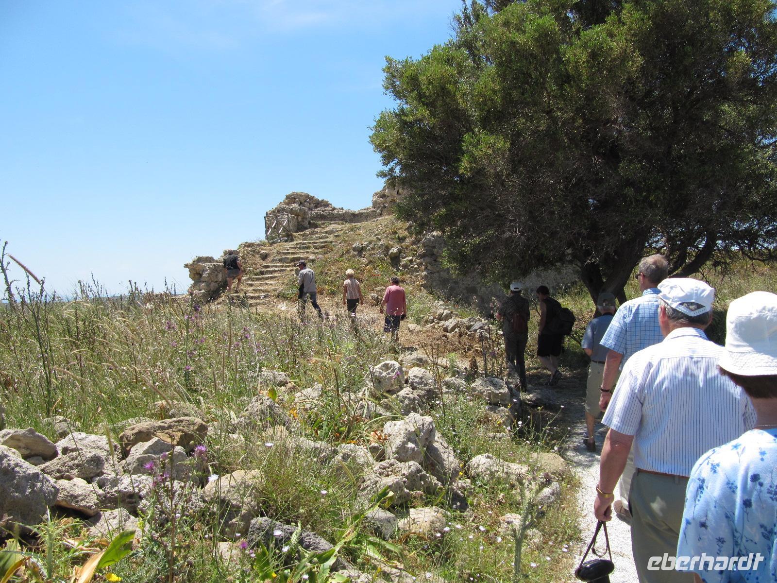 Rhodos. Wir begeben uns auf historische Spurensuche. Durch Pinienwälder fahren wir auf Serpentinen den Berg hinauf nach Filérimos, dem höchsten Punkt des antiken Staates Ialyssos. Dieser Bergrücken ist seit etwa 2500 Jahren besiedelt. Zur Aussichtsplattform gelangen wir über eine schattige Allee. Die Flora und Fauna ist überwältigend. Wir haben sehr großes Glück mit unserer Reisezeit. Am Wegrand steht hier und da feuerroter Klatschmohn oder gelb blühender Wildfenchel. Das gute Klima im Ägäischen Raum führt dazu, dass die Flora satter blüht. Es bietet sich uns ein atemberaubender Ausblick über den Westteil der Insel bis hin zur gebirgigen türkischen Küste. Begeistert nehmen wir die Ruhe dieses Ortes in uns auf. Darauf besichtigen wir den Tempel des Zeus und der Athene, der in Ruinen daliegt. Später erkunden wir das italienische Kloster und die wiederaufgebaute frühchristliche Basilika. Am späten Vormittag begeben wir uns nach Emeros ins Landesinnere. Hier erwartet uns eine Weinverkostung auf dem bekannten Weingut Emeri. Zu Mittag essen wir in einer typisch griechischen Taverne im Dorf Emeros und haben darauf Zeit dieses zu entdecken. Gestärkt starten wir in den Nachmittag und fahren nach