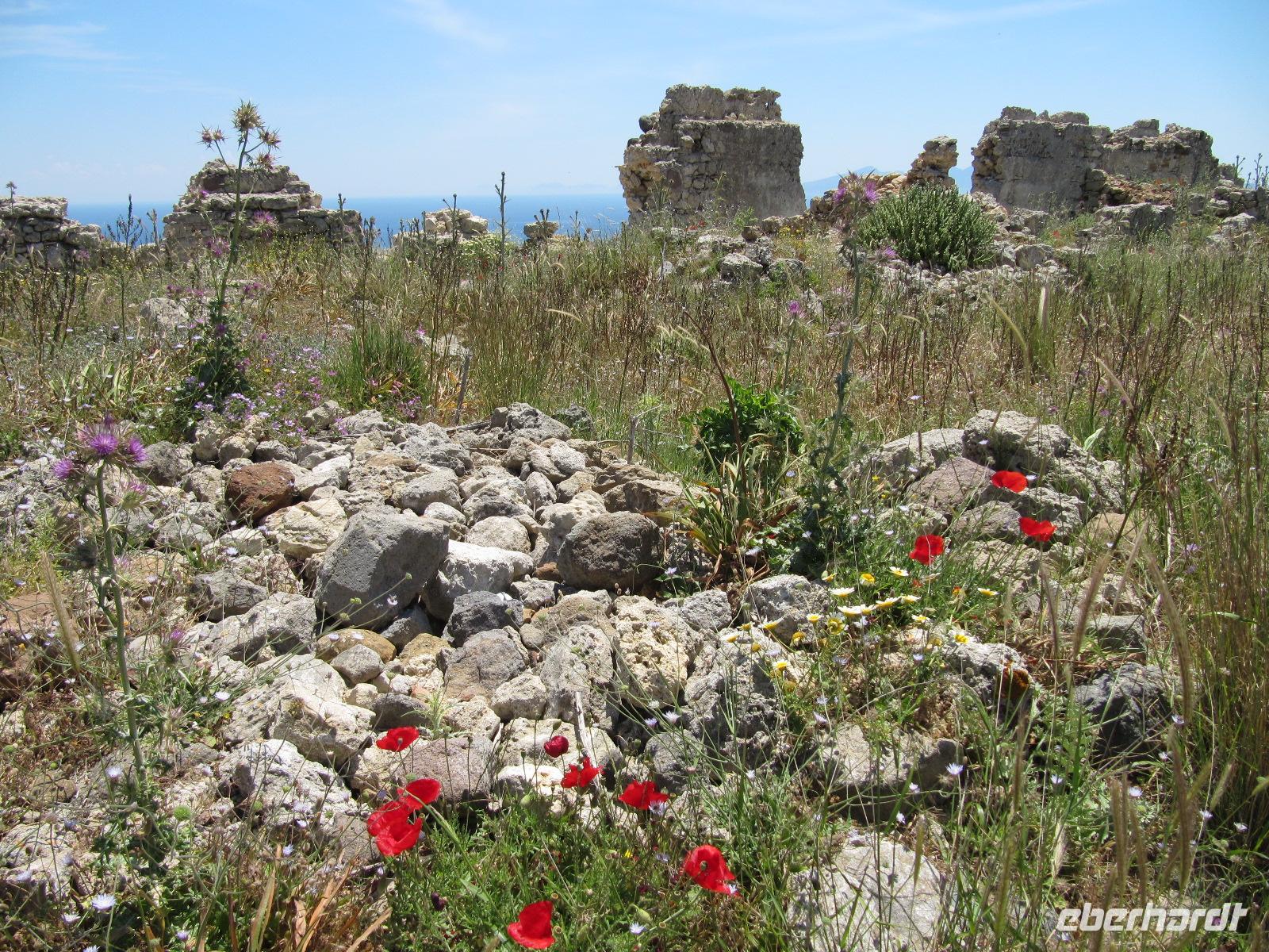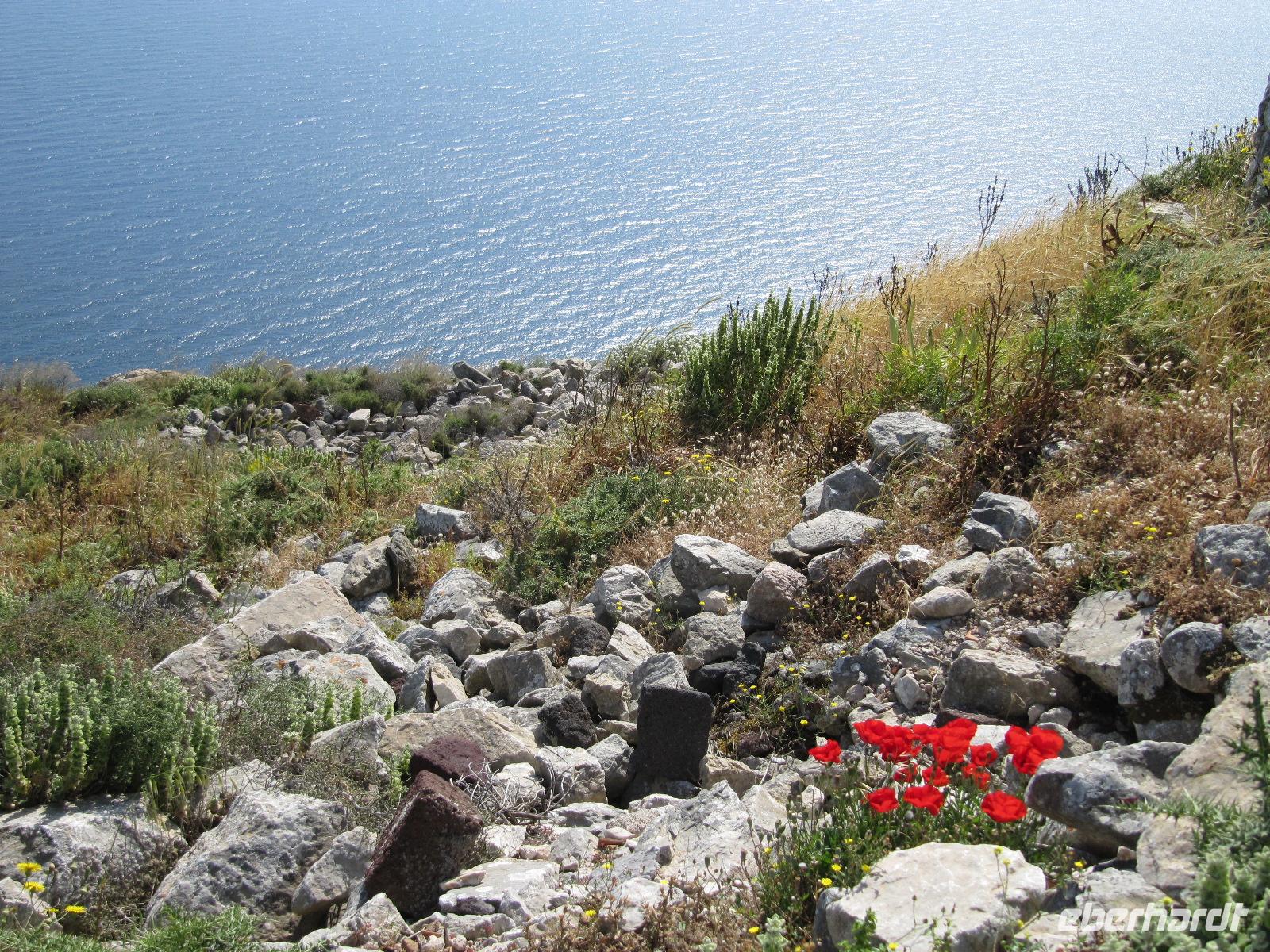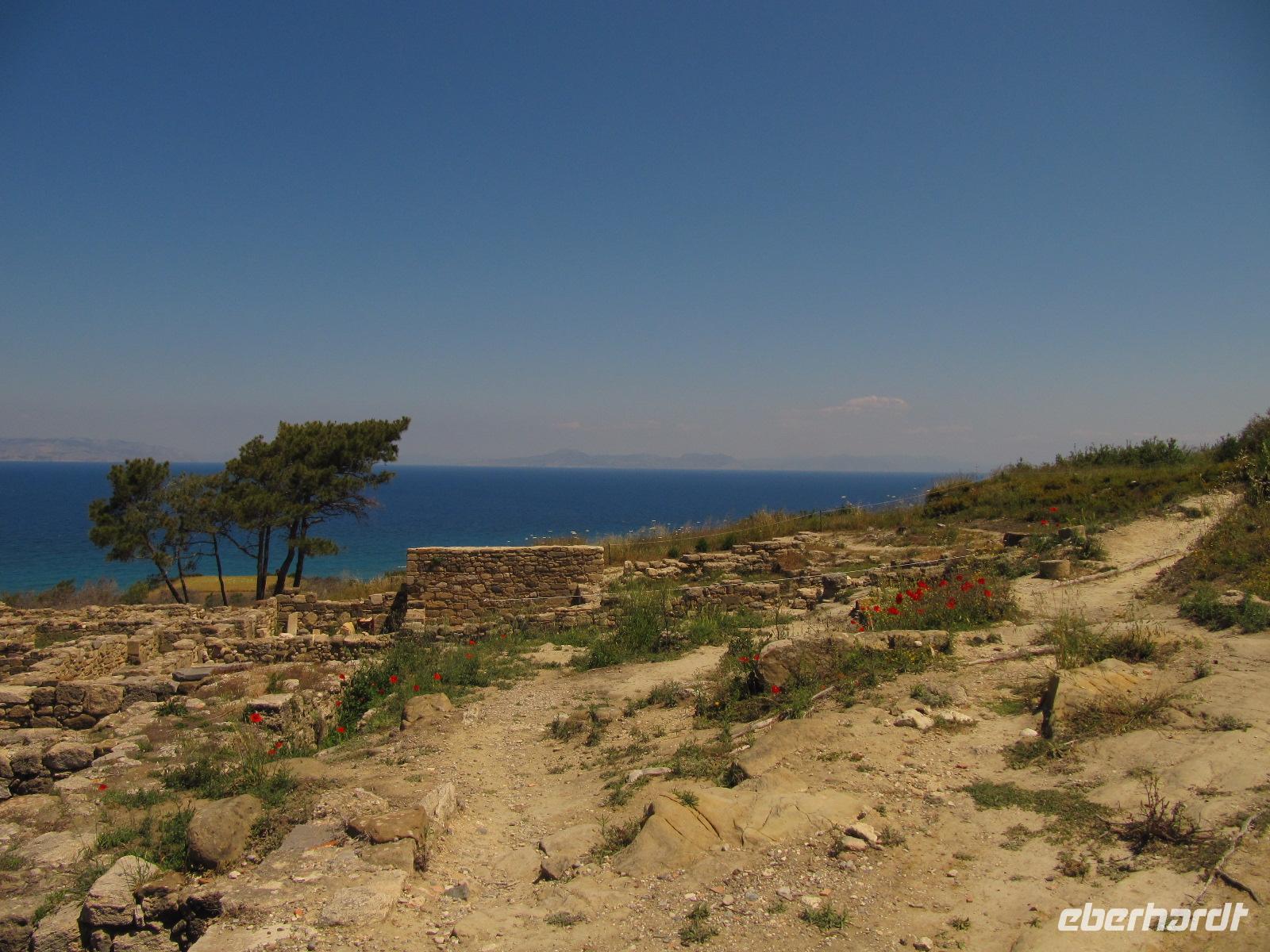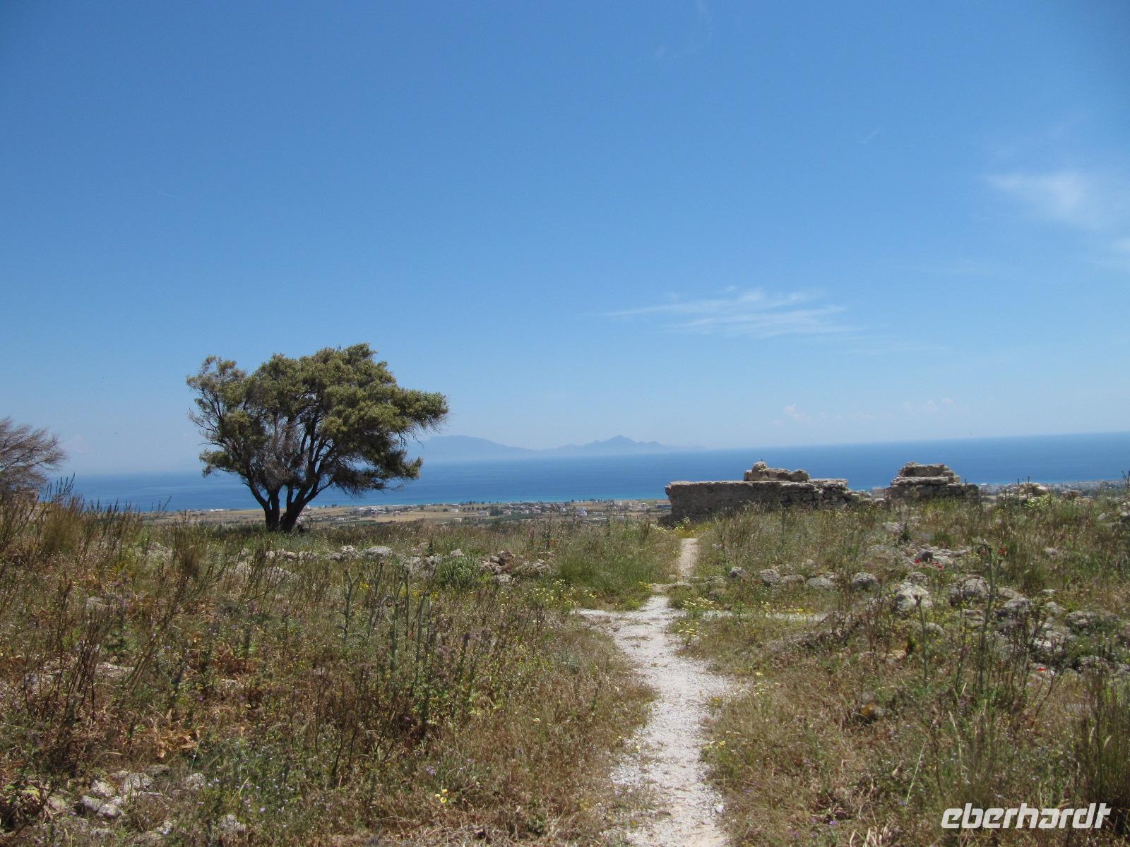 Rhodos. Wir begeben uns auf historische Spurensuche. Durch Pinienwälder fahren wir auf Serpentinen den Berg hinauf nach Filérimos, dem höchsten Punkt des antiken Staates Ialyssos. Dieser Bergrücken ist seit etwa 2500 Jahren besiedelt. Zur Aussichtsplattform gelangen wir über eine schattige Allee. Die Flora und Fauna ist überwältigend. Wir haben sehr großes Glück mit unserer Reisezeit. Am Wegrand steht hier und da feuerroter Klatschmohn oder gelb blühender Wildfenchel. Das gute Klima im Ägäischen Raum führt dazu, dass die Flora satter blüht. Es bietet sich uns ein atemberaubender Ausblick über den Westteil der Insel bis hin zur gebirgigen türkischen Küste. Begeistert nehmen wir die Ruhe dieses Ortes in uns auf. Darauf besichtigen wir den Tempel des Zeus und der Athene, der in Ruinen daliegt. Später erkunden wir das italienische Kloster und die wiederaufgebaute frühchristliche Basilika. Am späten Vormittag begeben wir uns nach Emeros ins Landesinnere. Hier erwartet uns eine Weinverkostung auf dem bekannten Weingut Emeri. Zu Mittag essen wir in einer typisch griechischen Taverne im Dorf Emeros und haben darauf Zeit dieses zu entdecken. Gestärkt starten wir in den Nachmittag und fahren nach