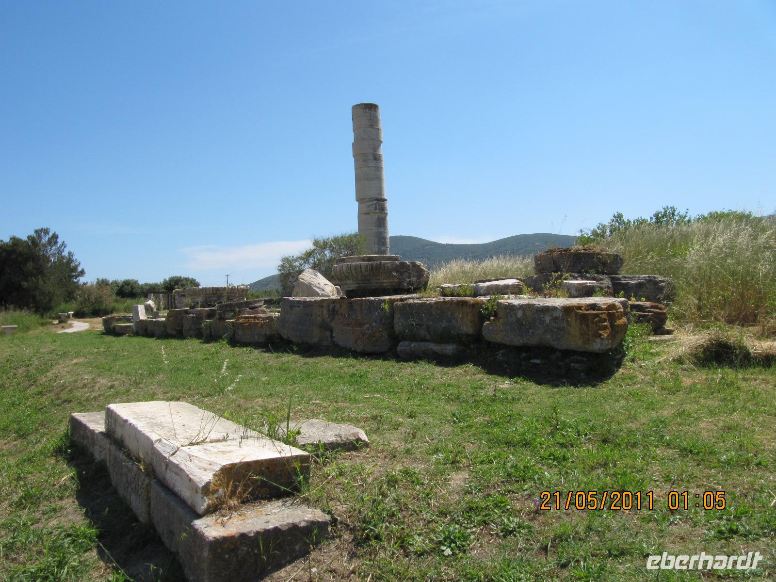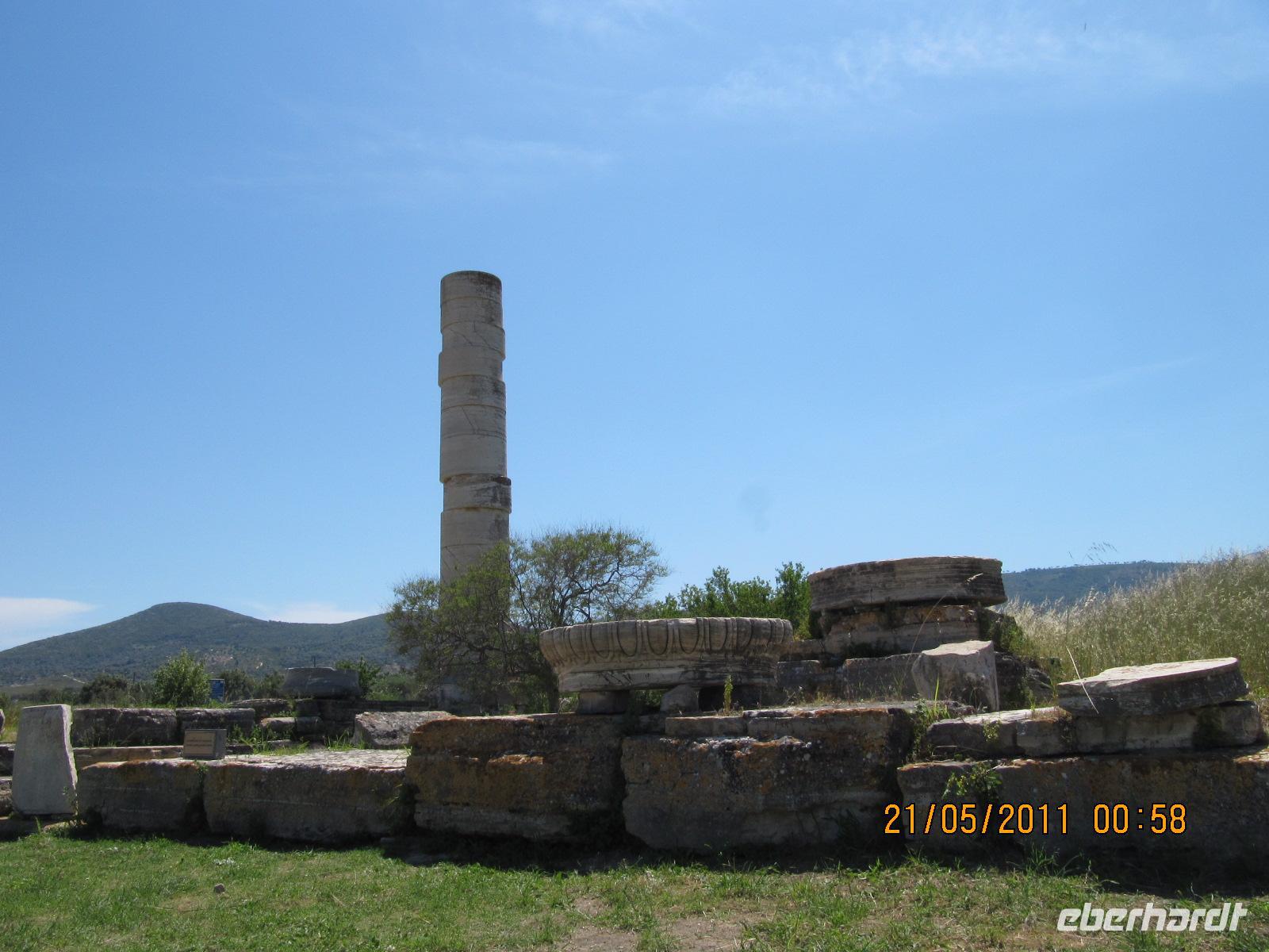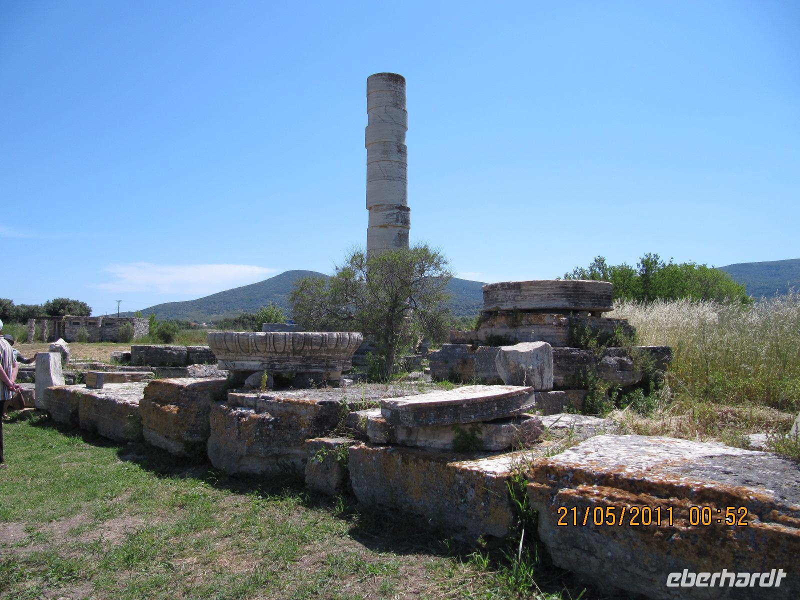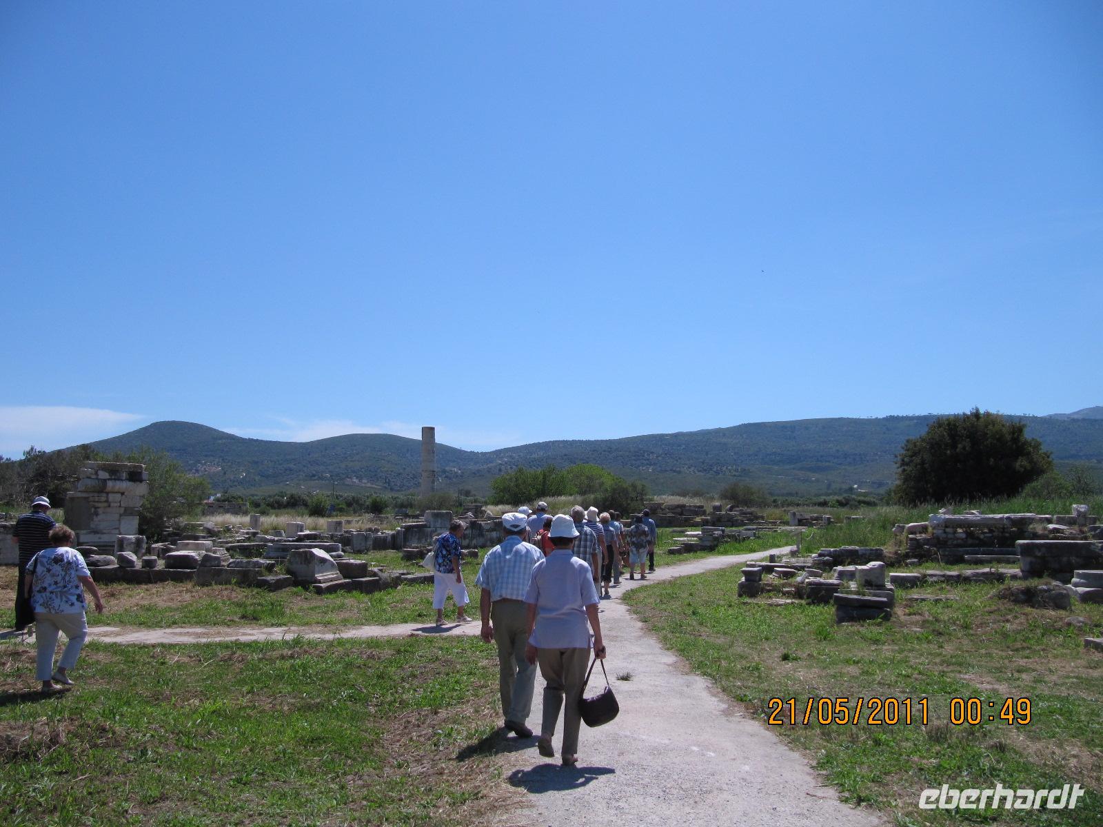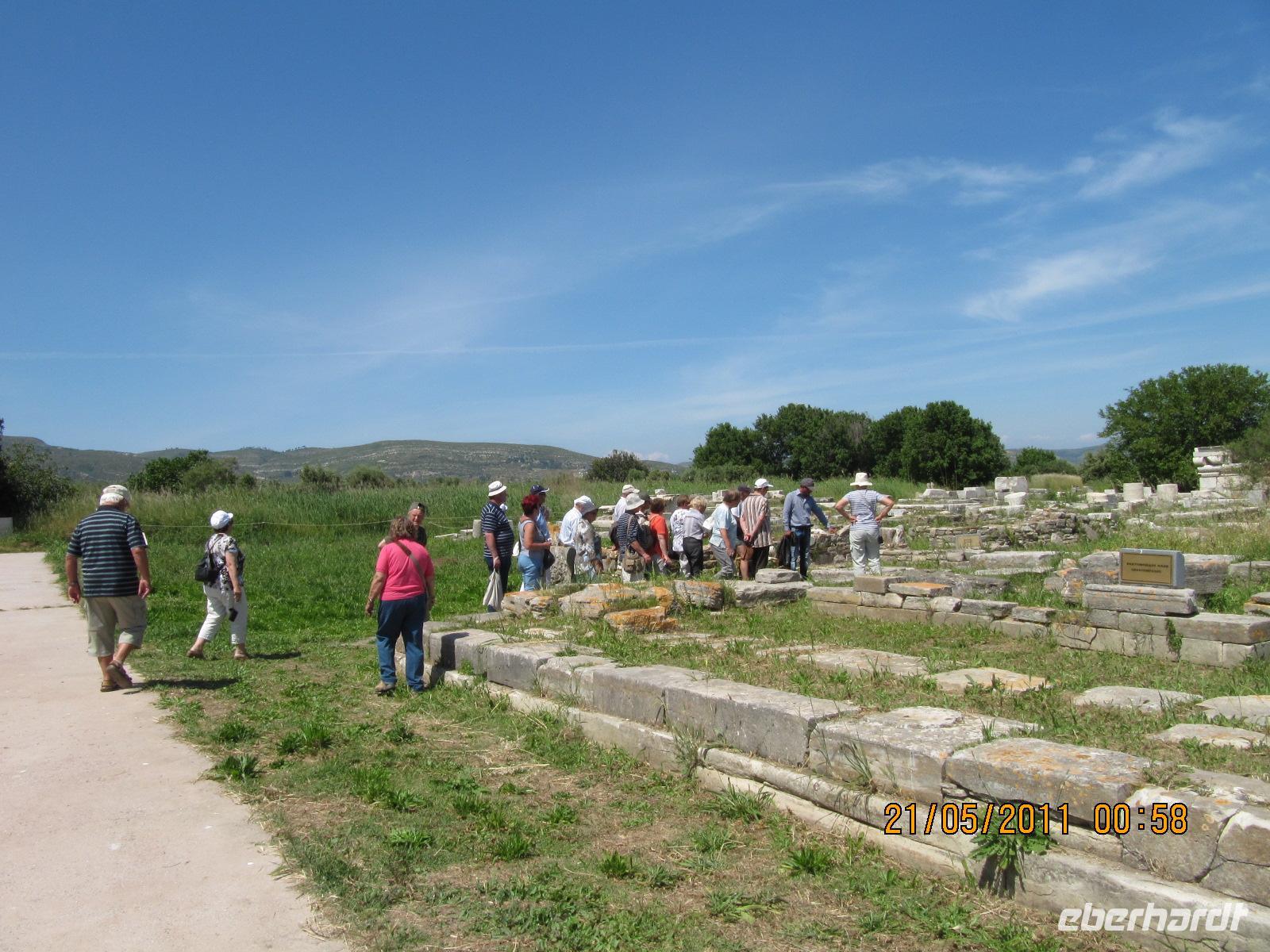 Platz nehmen. Auf der Fahrt sehen wir stets zu unserer Rechten die türkische Küste, aber wir fahren auch mit flotten 50 km/h an vielen kleinen griechischen Inseln vorbei. Immer wieder sehen wir einzelne griechische Dörfer, die sich mit ihren weißen Häusern und Kirchen strahlend von der Küste abheben. Am Hafen von Samos werden wir erwartet. Während unser Gepäck zu dem Hotel gebracht wird, werden wir das Heraíon - die Ruinen der Hera - besichtigen. Entlang der fruchtbaren Ebene am südwestlichen Ende der Tigániou-Bucht erstreckt sich diese vorarchaische Kultstätte. Nach mythologischer Überlieferung wurde die Göttin Hera hier unter dem Lygosbaum geboren. Eine 6 kilometerlange heilige Straße verlief hier in der Blütezeit von Samos. Der Kult der Hera erreichte seinen kulturellen Höhepunkt im 6. Jh. v. Chr. Simeon versteht es sehr gut, durch präzise Erläuterung und Führung unsere Phantasie an diesem monumentalen Ort zu wecken. Uns werden allmählich die Ausmaße dieser Akropolis bewusst. Die Kólona, die letzte heute noch stehende Säule vom großen Hera-Tempel, lassen uns die Maße des Tempels erkennen. Der Tempel hatte einen Grundriss von 112 x 55 Metern, was der Fläche des Kölner Doms entspricht. Überwältigt von den Ausmaßen dieses antiken Heiligtums fahren wir zu unserem 3-Sterne-Hotel Zefiros Beach in Mykáli. Das schnuckelige Hotel wurde noch in diesem Jahr frisch renoviert. Wir gehören zu den ersten Gruppen, die Leben in die wunderschöne Anlage bringen. Es ist hier sehr ruhig und der Strand ist wunderschön. In nur 1,2 km Entfernung sehen wir die türkische bergige Küste. Am Strand oder wahlweise bei einem gemütlichen Spaziergang können wir unsere Seele baumeln lassen. Zum Abendessen treffen wir uns um 19 Uhr im Restaurant des Hotels. Der Wirt hat uns eine schöne lange Tafel zusammengestellt. So können wir unseren Abend bei einem köstlichen Samoswein und wunderbarem Buffet verbringen.