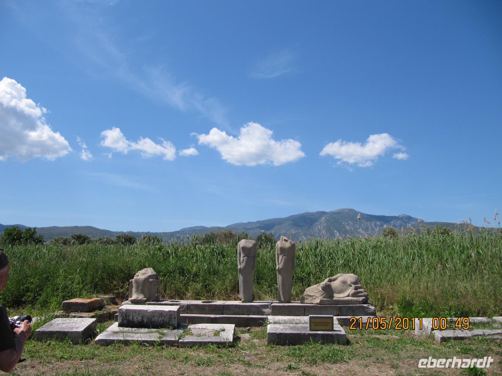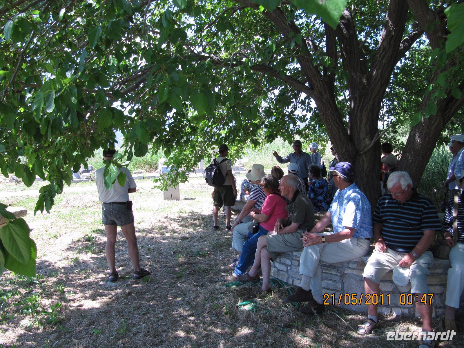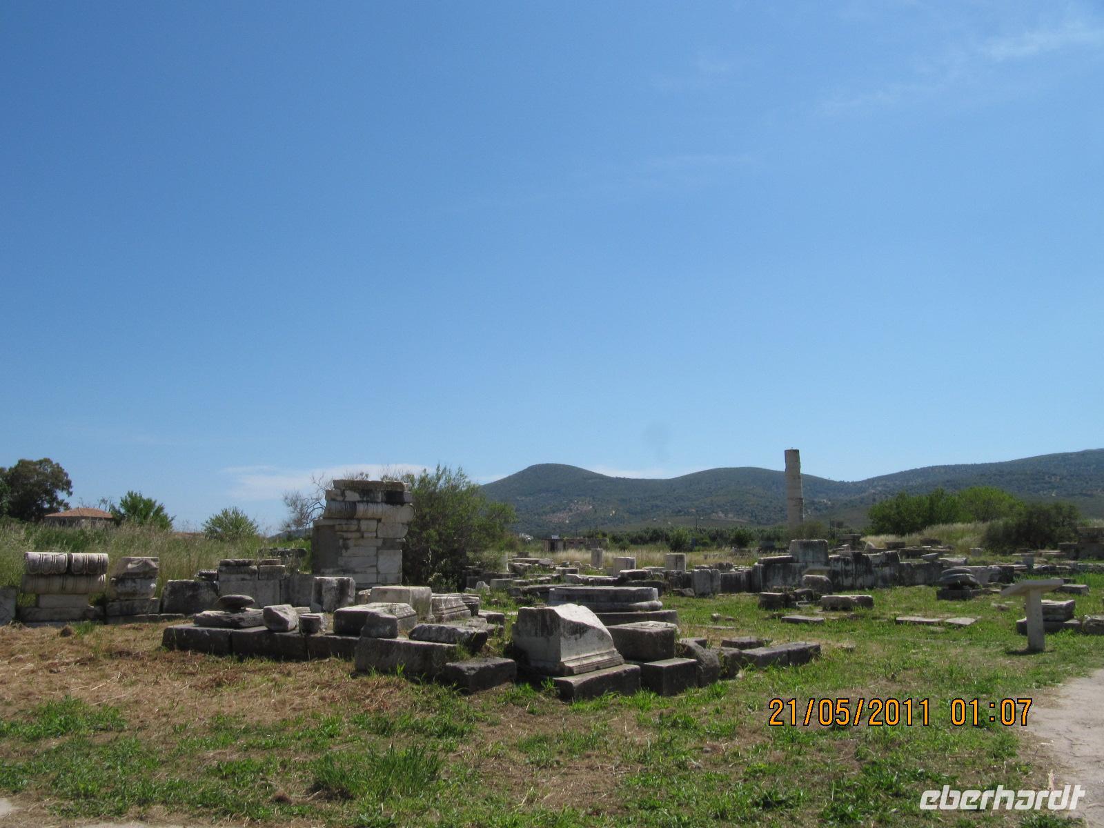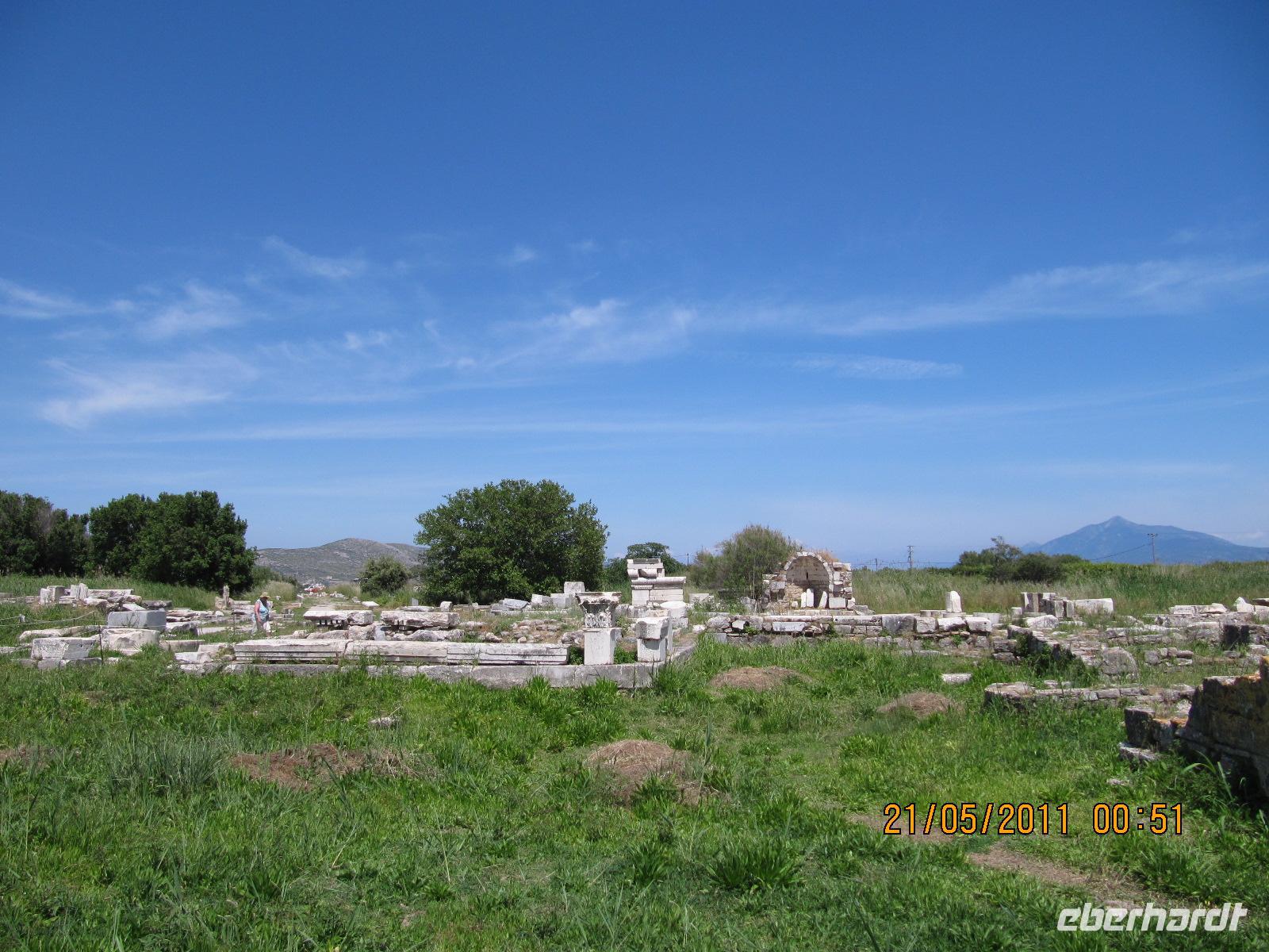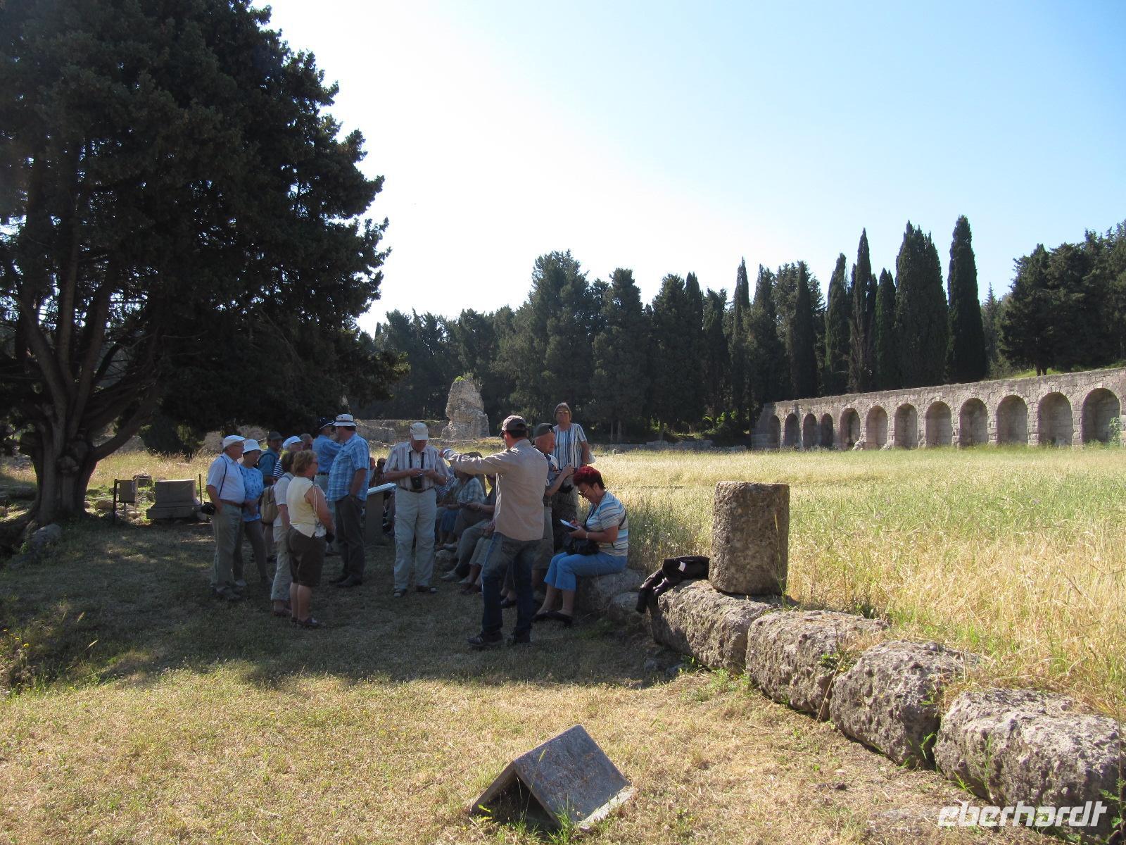 Platz nehmen. Auf der Fahrt sehen wir stets zu unserer Rechten die türkische Küste, aber wir fahren auch mit flotten 50 km/h an vielen kleinen griechischen Inseln vorbei. Immer wieder sehen wir einzelne griechische Dörfer, die sich mit ihren weißen Häusern und Kirchen strahlend von der Küste abheben. Am Hafen von Samos werden wir erwartet. Während unser Gepäck zu dem Hotel gebracht wird, werden wir das Heraíon - die Ruinen der Hera - besichtigen. Entlang der fruchtbaren Ebene am südwestlichen Ende der Tigániou-Bucht erstreckt sich diese vorarchaische Kultstätte. Nach mythologischer Überlieferung wurde die Göttin Hera hier unter dem Lygosbaum geboren. Eine 6 kilometerlange heilige Straße verlief hier in der Blütezeit von Samos. Der Kult der Hera erreichte seinen kulturellen Höhepunkt im 6. Jh. v. Chr. Simeon versteht es sehr gut, durch präzise Erläuterung und Führung unsere Phantasie an diesem monumentalen Ort zu wecken. Uns werden allmählich die Ausmaße dieser Akropolis bewusst. Die Kólona, die letzte heute noch stehende Säule vom großen Hera-Tempel, lassen uns die Maße des Tempels erkennen. Der Tempel hatte einen Grundriss von 112 x 55 Metern, was der Fläche des Kölner Doms entspricht. Überwältigt von den Ausmaßen dieses antiken Heiligtums fahren wir zu unserem 3-Sterne-Hotel Zefiros Beach in Mykáli. Das schnuckelige Hotel wurde noch in diesem Jahr frisch renoviert. Wir gehören zu den ersten Gruppen, die Leben in die wunderschöne Anlage bringen. Es ist hier sehr ruhig und der Strand ist wunderschön. In nur 1,2 km Entfernung sehen wir die türkische bergige Küste. Am Strand oder wahlweise bei einem gemütlichen Spaziergang können wir unsere Seele baumeln lassen. Zum Abendessen treffen wir uns um 19 Uhr im Restaurant des Hotels. Der Wirt hat uns eine schöne lange Tafel zusammengestellt. So können wir unseren Abend bei einem köstlichen Samoswein und wunderbarem Buffet verbringen.